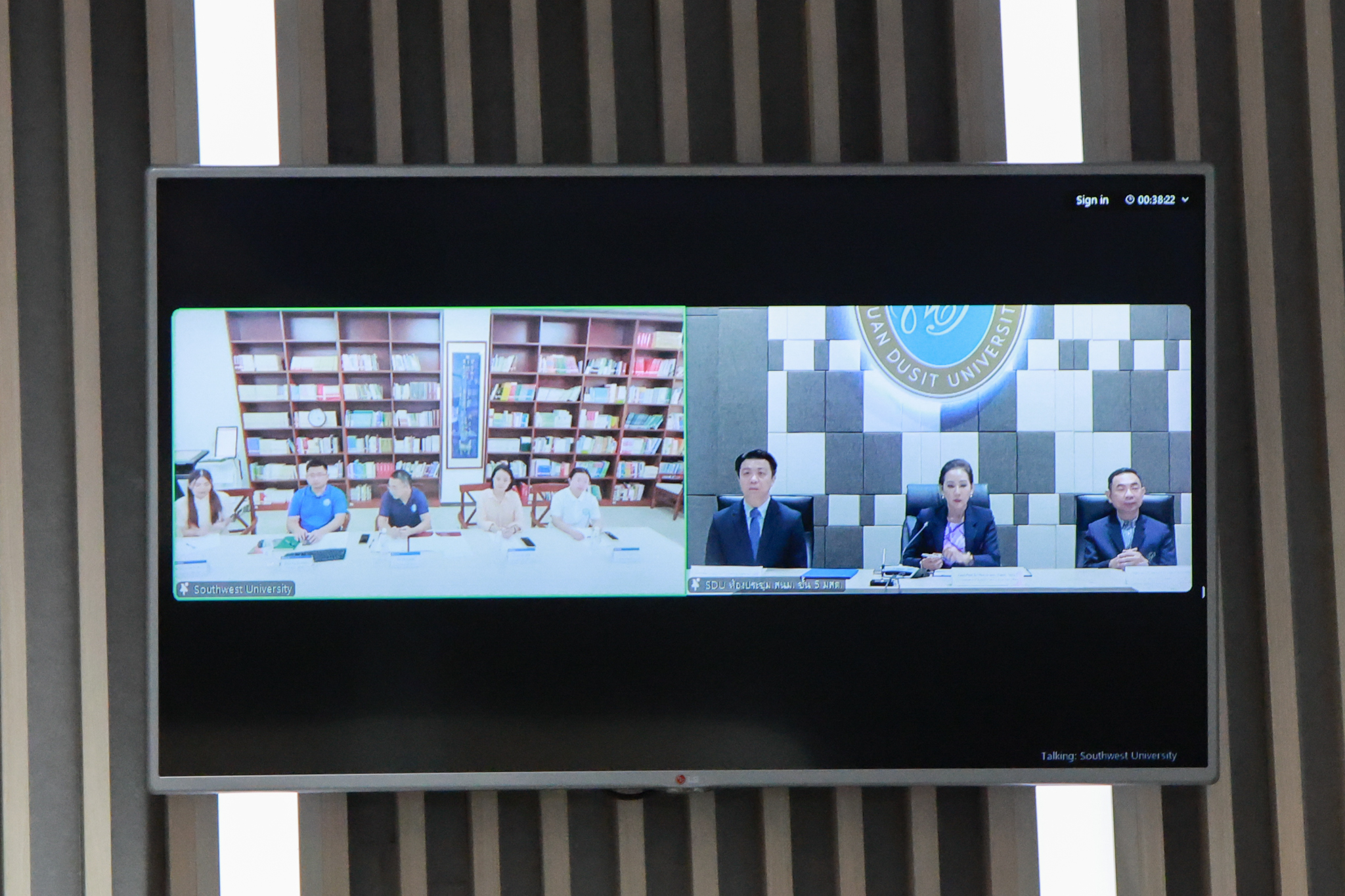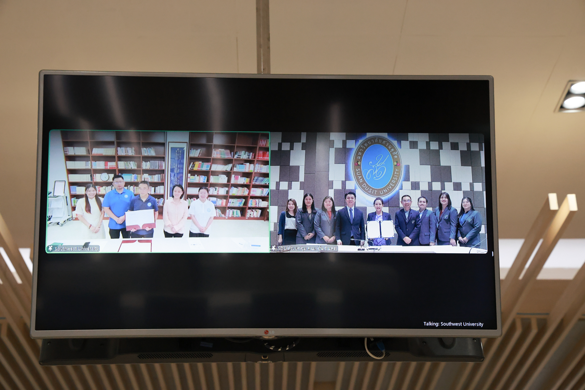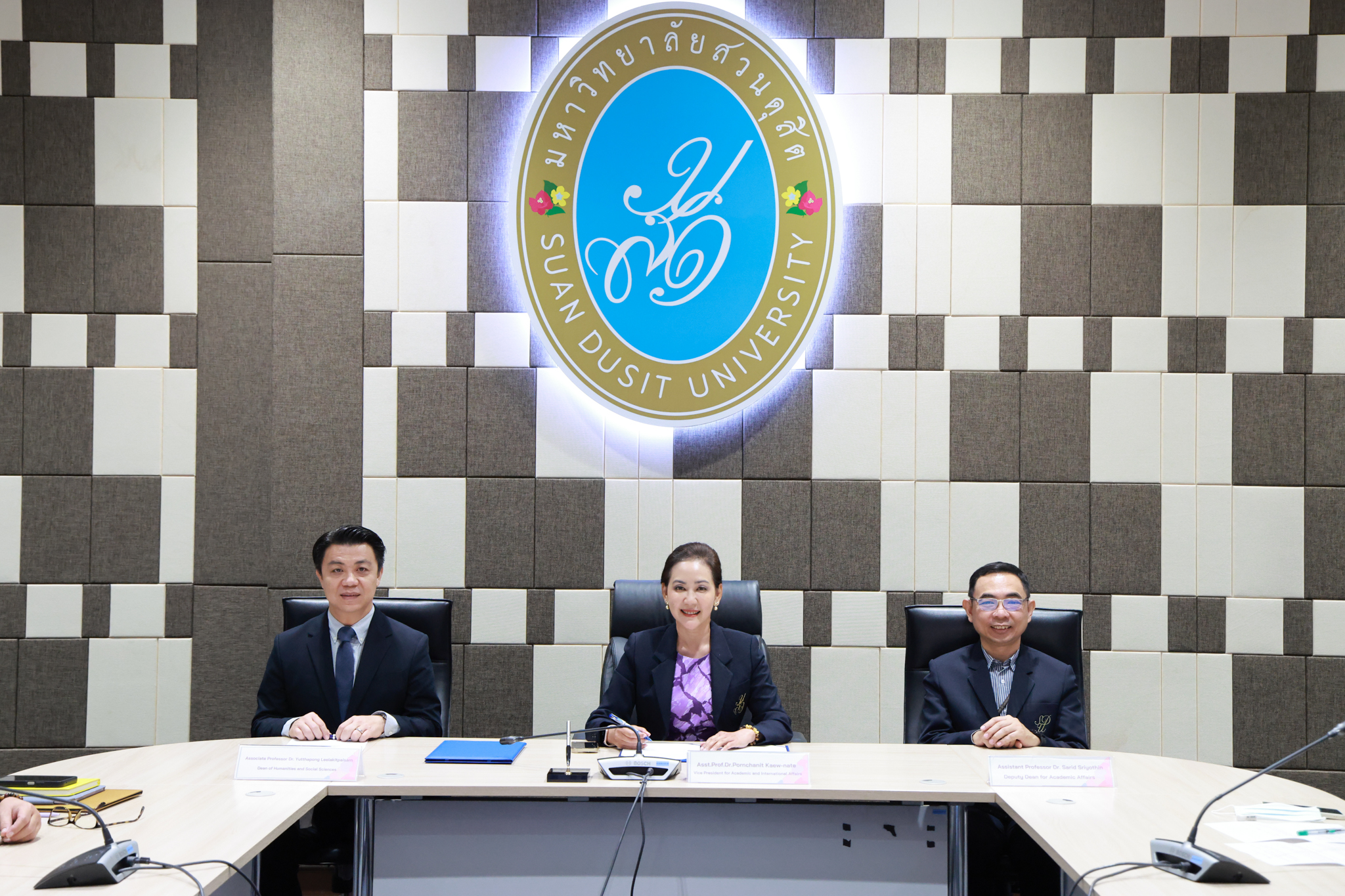 ผู้ช่วยศาสตราจารย์ ดร.พรชณิตว์ แก้วเนตร รองอธิการบดีฝ่ายวิชาการและกิจการต่างประเทศ เป็นผู้แทนมหาวิทยาลัยสวนดุสิต ประเทศไทย ได้มีพิธีลงนามบันทึกความร่วมมือกับมหาวิทยาลัยซีหนาน (Southwest University) เมืองฉงชิ่ง สาธารณรัฐประชาชนจีน พร้อมด้วย รศ.ดร.ยุทธพงศ์ ลีลากิจไพศาล คณบดีคณะมนุษยศาสตร์และสังคมศาสตร์ รองคณบดี และคณาจารย์หลักสูตรภาษาจีนเพื่องานบริการ โดยฝ่ายมหาวิทยาลัยซีหนาน (Southwest University) มี Mr. Yu Zheyuan คณบดี คณะนานาชาติ เป็นผู้แทนมหาวิทยาลัยร่วมด้วย Mr. Huang Wuwei ผู้อำนวยการฝ่ายสรรหานักศึกษาต่างชาติ ร่วมเป็นสักขีพยาน ทั้งนี้ การลงนามระหว่างสองมหาวิทยาลัยครั้งนี้ดำเนินการ ผ่านระบบการประชุมออนไลน์ ZOOM  ณ ห้องประชุมชั้น 5 อาคารสำนักงานมหาวิทยาลัย สวนดุสิต ในวันอังคารที่ 13 พฤษภาคม 2568 เวลา 15.00-16.00 น. (เวลาประเทศไทย)