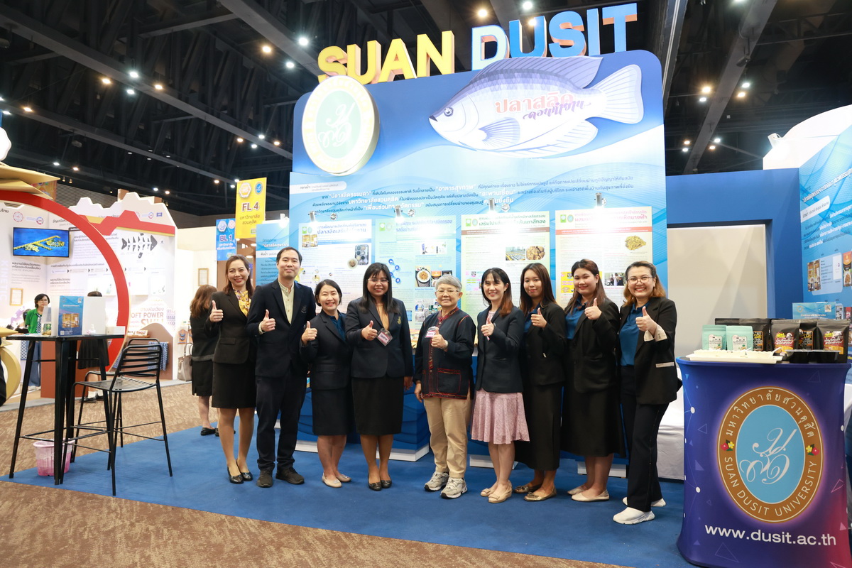 บูธแสดงผลงานวิจัยและนวัตกรรมของมหาวิทยาลัยสวนดุสิต จำนวน 4 ผลงาน ภายใต้Themes “งานวิจัยและนวัตกรรมเพื่อส่งเสริมศักยภาพวิสาหกิจชุมชน วิสาหกิจขนาดกลางและขนาดย่อม (SME) ซึ่งมหาวิทยาลัยสวนดุสิตนำเสนอนิทรรศการภายใต้ชื่อ “ปลาสลิดสุพรรณฯ จากท้องนา สู่นวัตกรรมสุขภาพ”