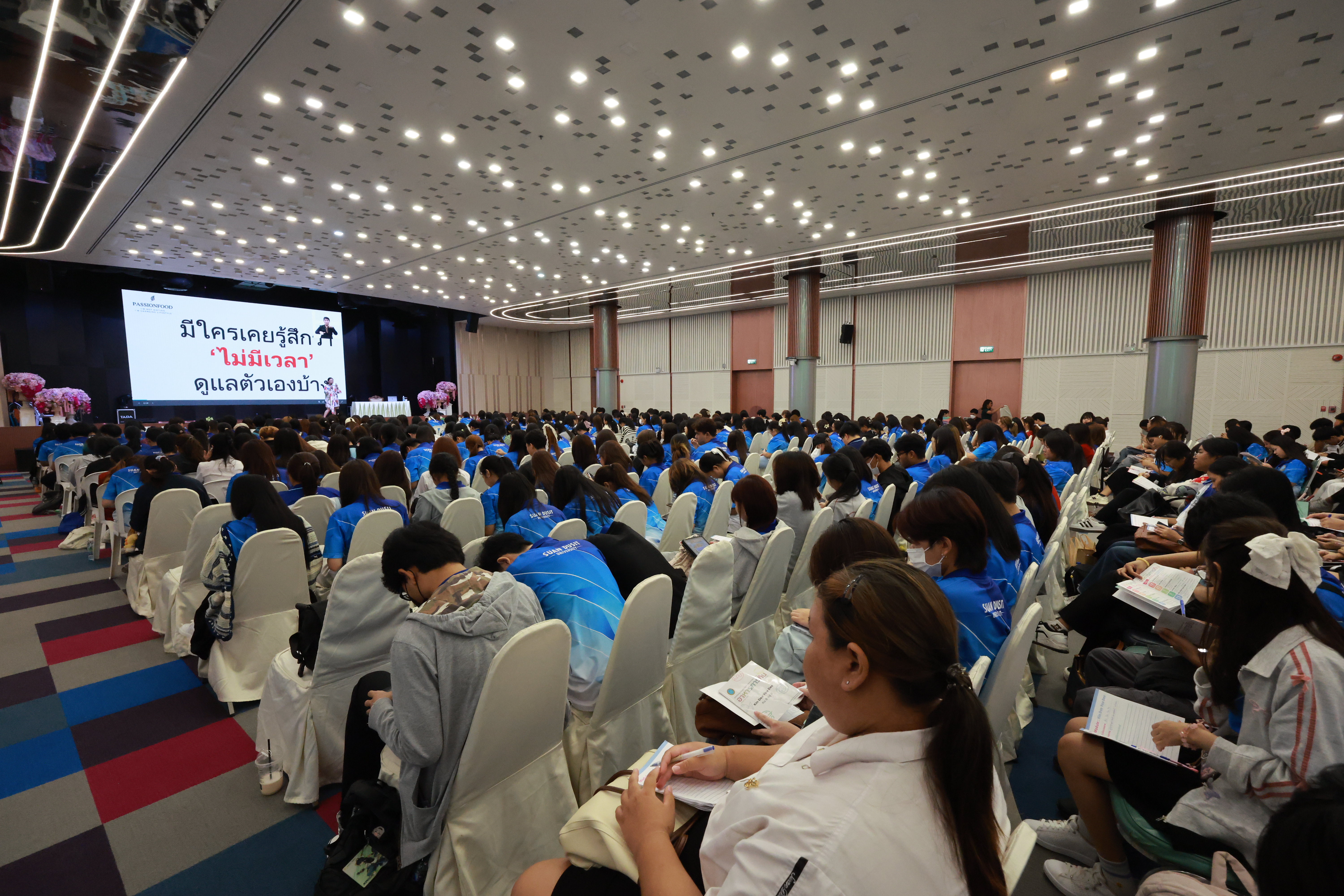 โครงการปฏิบัติการอาหารแปรรูป มหาวิทยาลัยสวนดุสิต จัดกิจกรรมการเรียนการสอนเชิงประสบการณ์รายวิชา อาหารการกิน (Module: Kin Dee You Dee) ประจำภาคเรียนที่ 1/2568 โดยได้รับเกียรติจาก ผศ.ดร.พิทักษ์ จันทร์เจริญ อธิการบดีมหาวิทยาลัยสวนดุสิต กล่าวเปิดกิจกรรม กินดี อยู่ดี แฟร์ และบรรยายพิเศษหัวข้อ Well-living Life “Kin Dee You Dee” คุณสุวิภา จารุทิกร เจ้าของร้าน Passion Food บรรยายหัวข้อ ดูแลตัวเองแบบคน Gen Zep และปฏิบัติการสร้างสุขภาพ หัวข้อ ปรับเปลี่ยนการบริโภค ห่างไกลโรคร้าย โดย เครือข่ายคนไทยไร้พุง ราชวิทยาลัยอายุรแพทย์แห่งประเทศไทย เมื่อวันที่ 15 สิงหาคม 2568 ณ อาคารรักตะกนิษฐ ชั้น 1 มหาวิทยาลัยสวนดุสิต