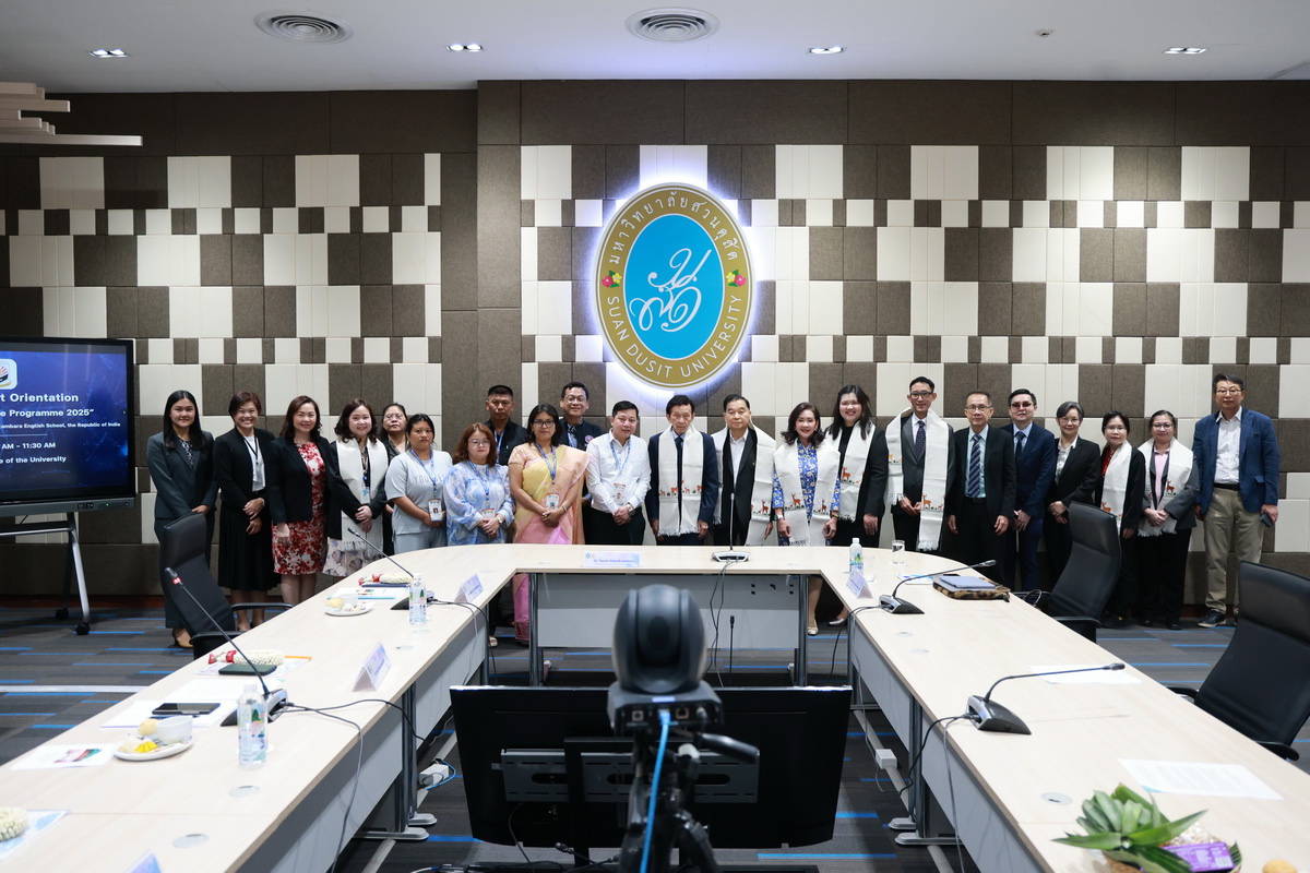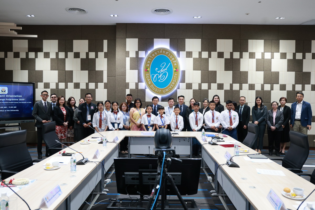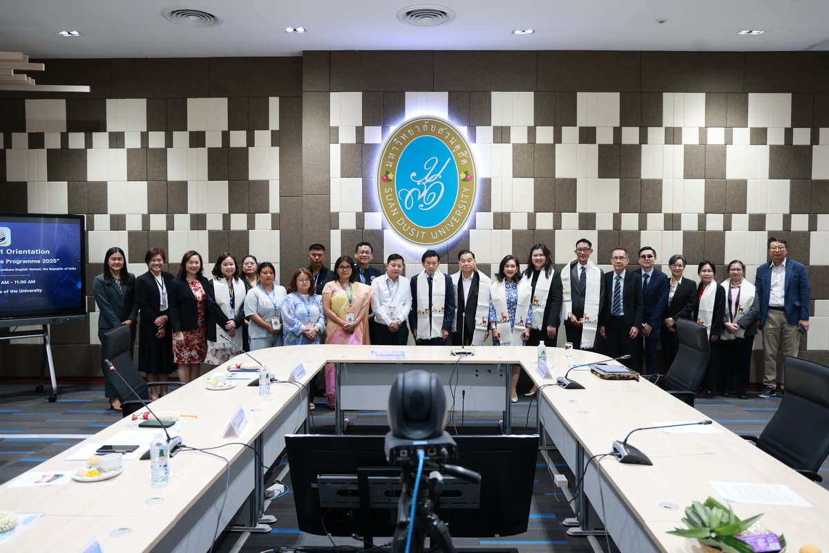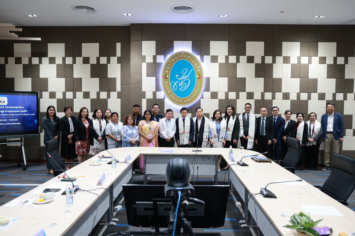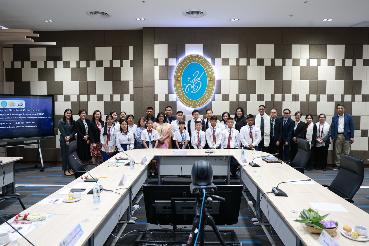 ศูนย์ประสานงานนักศึกษานานาชาติ คณะมนุษยศาสตร์และสังคมศาสตร์ จัดกิจกรรมปฐมนิเทศให้แก่คณะผู้บริหาร ครู และนักเรียนจาก Pitambara English School รัฐมณีปุระ สาธารณรัฐอินเดีย ในวันที่ 28 สิงหาคม 2568 ณ ห้องประชุมชั้น 5 สำนักงานมหาวิทยาลัย ซึ่งเป็นกิจกรรมหนึ่งของโครงการมหาวิทยาลัยสวนดุสิต โครงการ “Language and Cultural Exchange Programme 2025” โดยคณะครุศาสตร์ คณะมนุษยศาสตร์และสังคมศาสตร์ และโรงเรียนสาธิตละอออุทิศ กิจกรรมปฐมนิเทศนี้ได้รับเกียรติจาก ดร. ถนอม อินทรกำเนิด นายกสภามหาวิทยาลัยสวนดุสิตเป็นประธานกล่าวเปิดงาน และรองศาสตราจารย์ ดร. สุขุม เฉลยทรัพย์ ประธานที่ปรึกษาอธิการบดี มหาวิทยาลัยสวนดุสิต ผู้ช่วยศาสตราจารย์ ดร. พรชณิตว์ แก้วเนตร รองอธิการบดีฝ่ายวิชาการและกิจการต่างประเทศ ดร. พันธรักษ์ ผูกพันธุ์ ผู้ช่วยอธิการบดี พร้อมด้วยรองศาสตราจารย์ ดร. ยุทธพงษ์ ลีลากิจไพศาล คณบดีคณะมนุษยศาสตร์และสังคมศาสตร์ ผู้ช่วยศาสตราจารย์ ดร.วีณัฐ สกุลหอม คณบดีคณะครุศาสตร์ รวมทั้งคณาจารย์และนักศึกษาให้การต้อนรับ