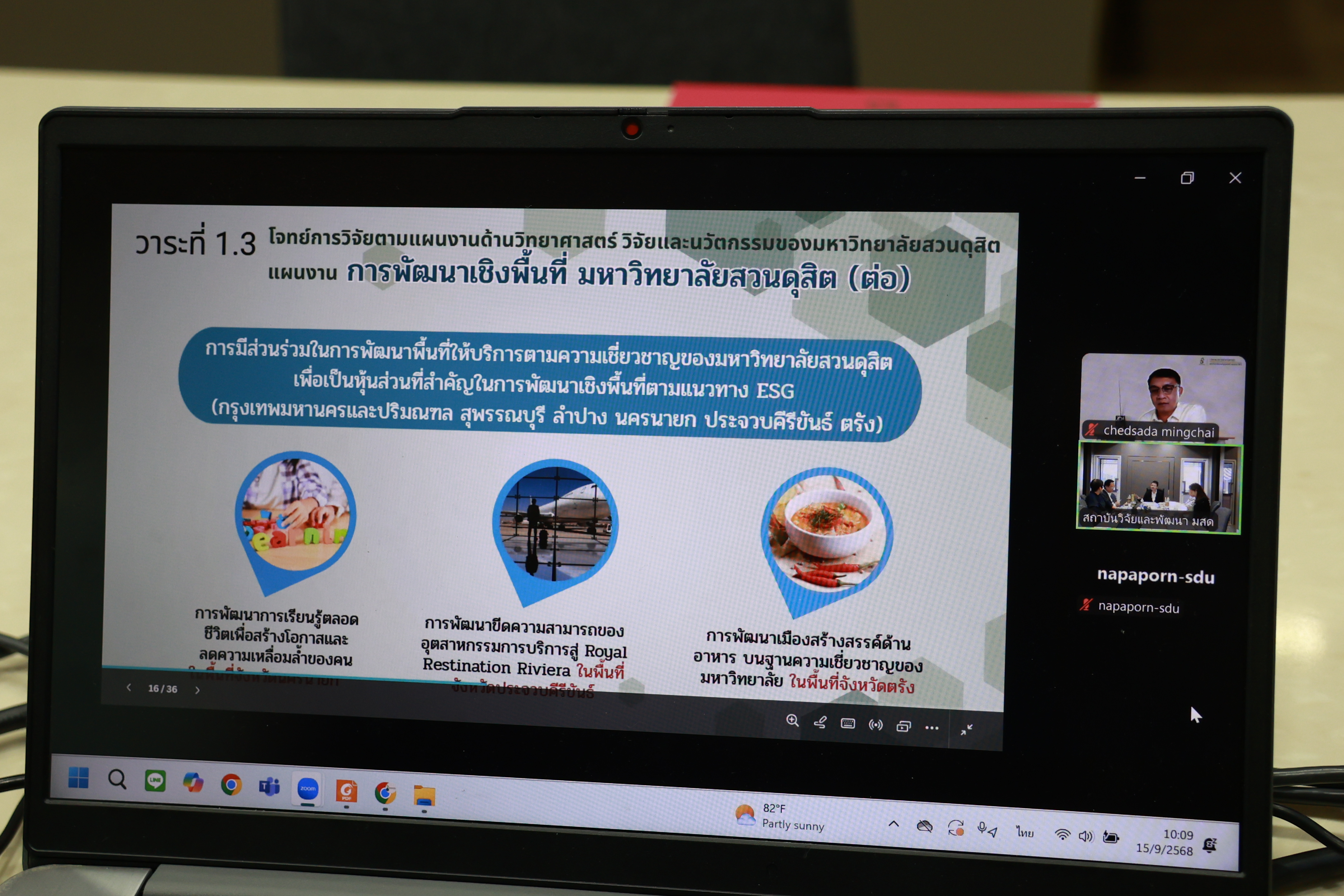 สถาบันวิจัยและพัฒนา มหาวิทยาลัยสวนดุสิต จัดประชุมคณะอนุกรรมการพิจารณาการจัดทำงบประมาณ กำกับติดตาม และประเมินผลโครงการทุนสนับสนุนงานมูลฐาน (Fundamental Fund : FF) ประจำปีงบประมาณ พ.ศ. 2570 แผนงานการพัฒนาเชิงพื้นที่ มหาวิทยาลัยสวนดุสิต โดยมี รองศาสตราจารย์ ดร.ชนะศึก นิชานนท์ รองอธิการบดีฝ่ายบริหาร วิจัย และนวัตกรรม เป็นประธานการประชุม ณ ห้องประชุมหอมขจร อาคาร 2 ชั้น 2 มหาวิทยาลัยสวนดุสิต และผ่านระบบออนไลน์ Zoom เมื่อวันที่ 15-16 กันยายน 2568
