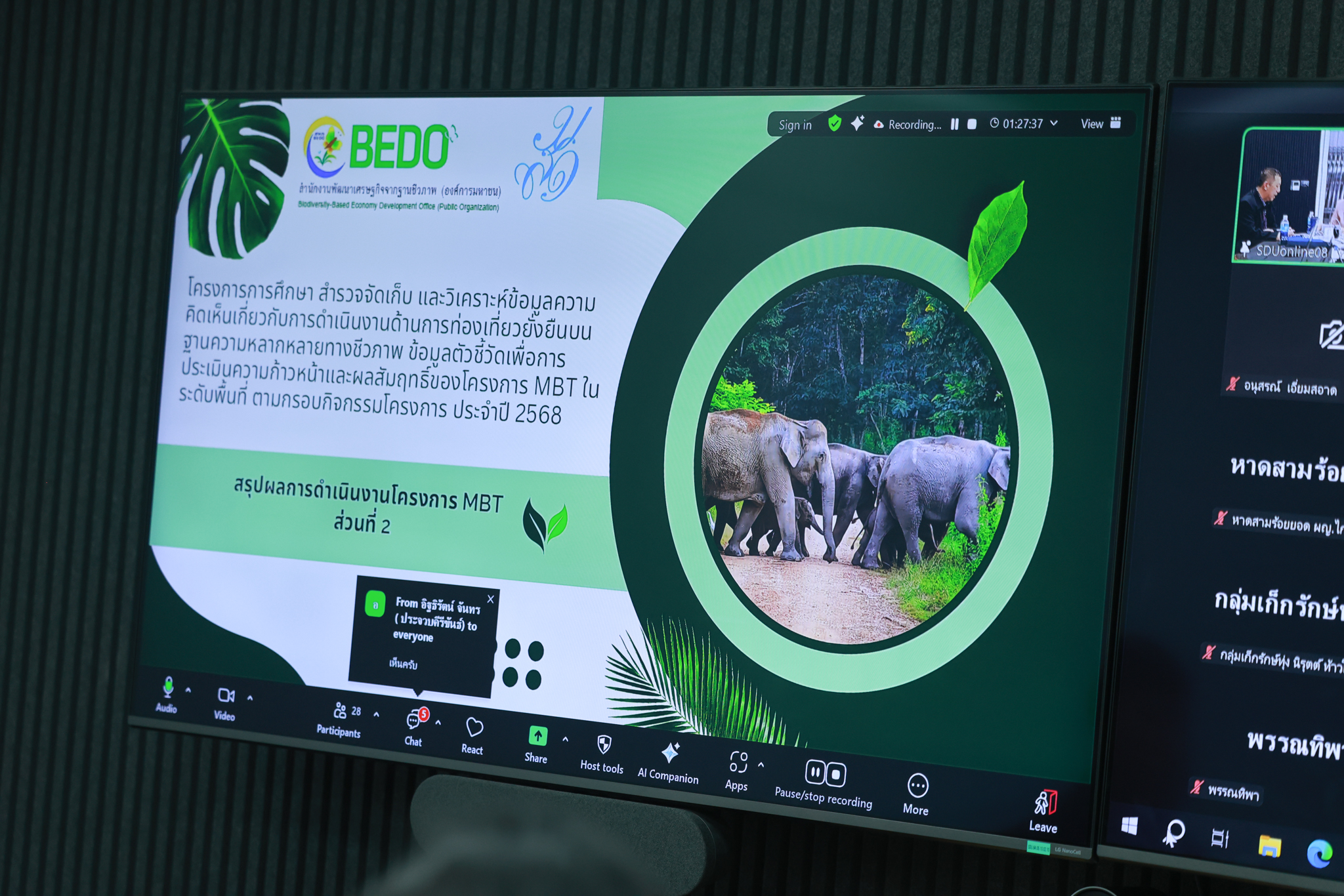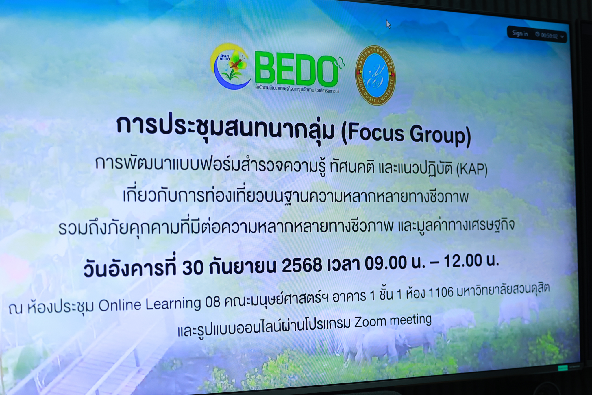 นำเสนอแบบฟอร์มสำรวจความรู้ ทัศนคติ และแนวปฏิบัติ (KAP) เกี่ยวกับการท่องเที่ยวบนฐานความหลากหลายทางชีวภาพ รวมถึงภัยคุกคามที่มีต่อความหลากหลายทางชีวภาพ และมูลค่าทางเศรษฐกิจ โดย คณะทำงานโครงการ และดำเนินรายการประชุมสนทนากลุ่มแนวทางการพัฒนาแบบฟอร์มสำรวจความรู้ ทัศนคติ และแนวปฏิบัติ (KAP) เกี่ยวกับการท่องเที่ยวบนฐานความหลากหลายทางชีวภาพ รวมถึงภัยคุกคามที่มีต่อความหลากหลายทางชีวภาพ และมูลค่าทางเศรษฐกิจ โดย นางสาวพรพรรณ บัวทอง ประธานสวนดุสิตโพล มหาวิทยาลัยสวนดุสิต เมื่อวันอังคารที่ 30 กันยายน 2568 ณ ห้อง Online Learning 08 คณะมนุษยศาสตร์และสังคมศาสตร์ (ห้อง 1106) อาคาร 1และรูปแบบออนไลน์ผ่านโปรแกรม Zoom meeting