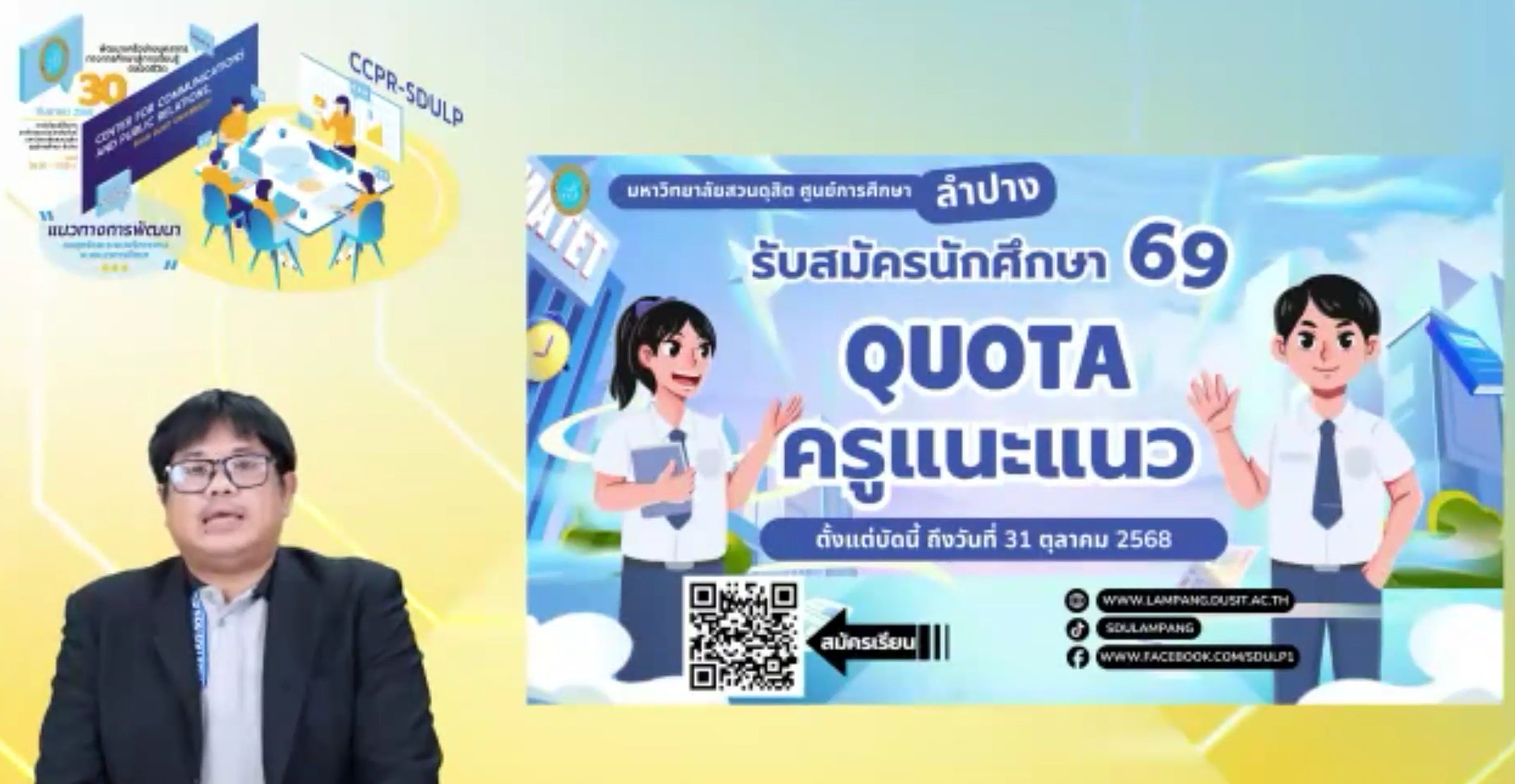 เมื่อวันอังคารที่ 30 กันยายน 2568 มหาวิทยาลัยสวนดุสิต ศูนย์การศึกษาลำปาง จัดโครงการพัฒนาเครือข่ายบุคลากรทางการศึกษา สู่การเรียนรู้ตลอดชีวิต ในรูปแบบออนไลน์ ZOOM สำหรับครูและบุคลากรทางการศึกษา กิจกรรมเริ่มต้นด้วยพิธีเปิดและบรรยายพิเศษหัวข้อ “การพัฒนาพื้นที่เพื่อการเรียนรู้กับการแนะแนวอาชีพสำหรับนักเรียน” โดย ดร.ขวัญนภา สุขคร ผู้อำนวยการศูนย์การศึกษา ลำปาง มหาวิทยาลัยสวนดุสิต จากนั้นมีการบรรยายพิเศษหัวข้อ “แนวทางการพัฒนากลยุทธ์และระบบบริหารงานแนะแนวในสถานศึกษา” โดย ผู้ช่วยศาสตราจารย์ นพวรรณ คนึงชัยสกุล และอาจารย์ประภาวดี ปลอดมณี จากโรงเรียนสาธิตแห่งมหาวิทยาลัยเกษตรศาสตร์ โครงการครั้งนี้จัดขึ้นเพื่อเสริมสร้างเครือข่ายบุคลากรทางการศึกษา พัฒนาทักษะการเรียนรู้ ตลอดชีวิต และยกระดับการแนะแนวการศึกษาให้ตอบโจทย์ความต้องการของผู้เรียนในยุคปัจจุบัน