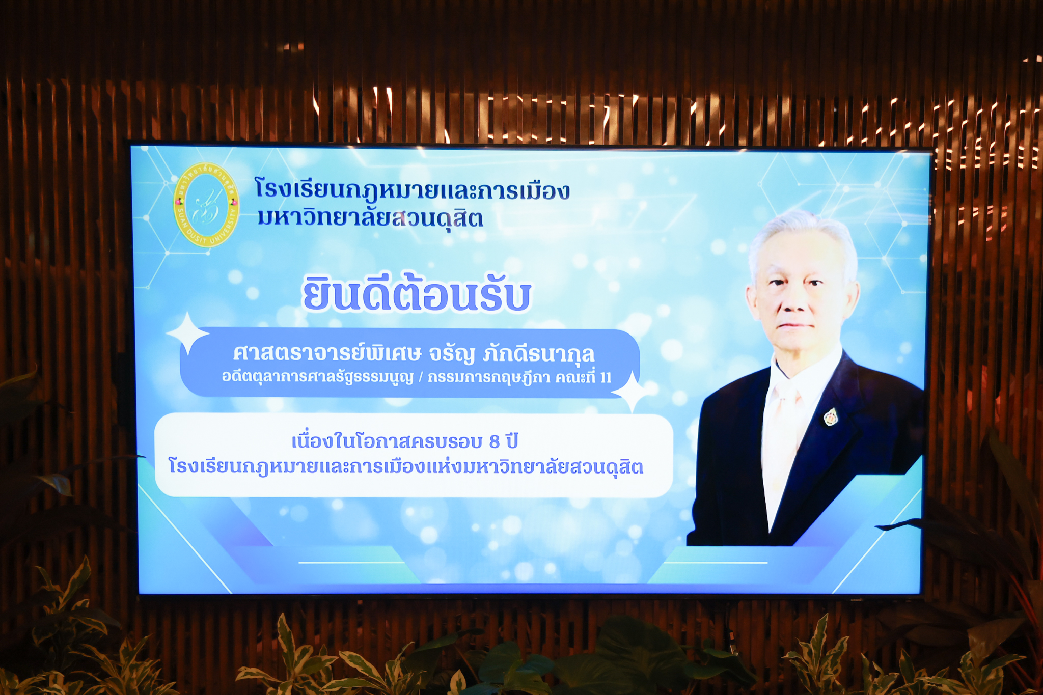 โรงเรียนกฎหมายและการเมือง จัดปาฐกถาพิเศษและเสวนาวิชาการ ในโอกาส ครบรอบ 8 ปี โรงเรียนกฎหมายและการเมือง : อัตลักษณ์ใหม่แห่งมหาวิทยาลัยสวนดุสิต โดย รศ.ดร.ธนภัทร ปัจฉิมม์ ประธานกรรมการดำเนินงาน กล่าวต้อนรับและวัตถุประสงค์การดำเนินงาน กิจกรรมในช่วงแรก ปาฐกถาพิเศษ ได้รับเกียรติจาก ศาสตราจารย์พิเศษ จรัญ ภักดีธนากุล อดีตตุลาการศาลรัฐธรรมนูญ/กรรมการกฤษฎีกา คณะที่ 11 ในหัวข้อ ภาวะผู้นำกับหลักนิติธธรม : เส้นทางยุติธรรมในสังคมไทย โดยความร่วมมือของ โรงเรียนกฎหมายและการเมือง ร่วมกับ สถาบันศิโรจน์ ผลพันธิน