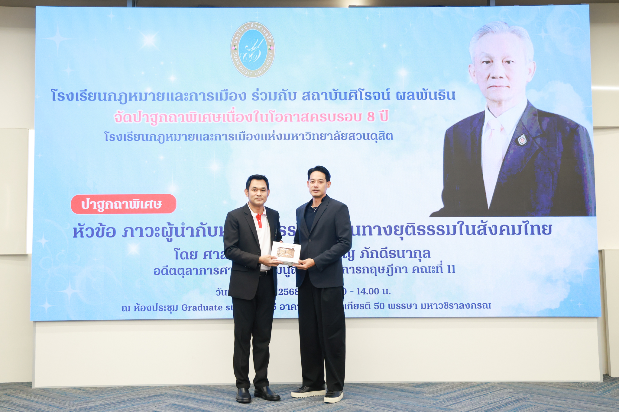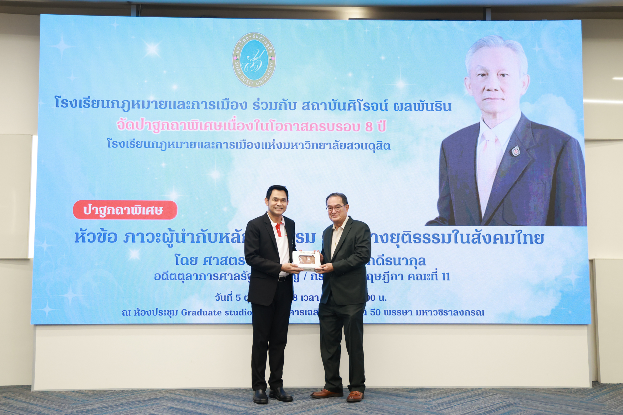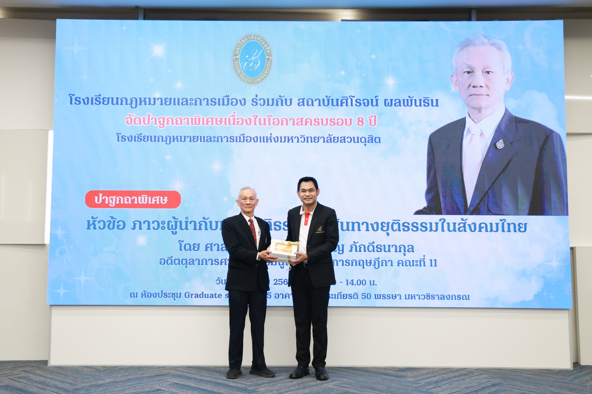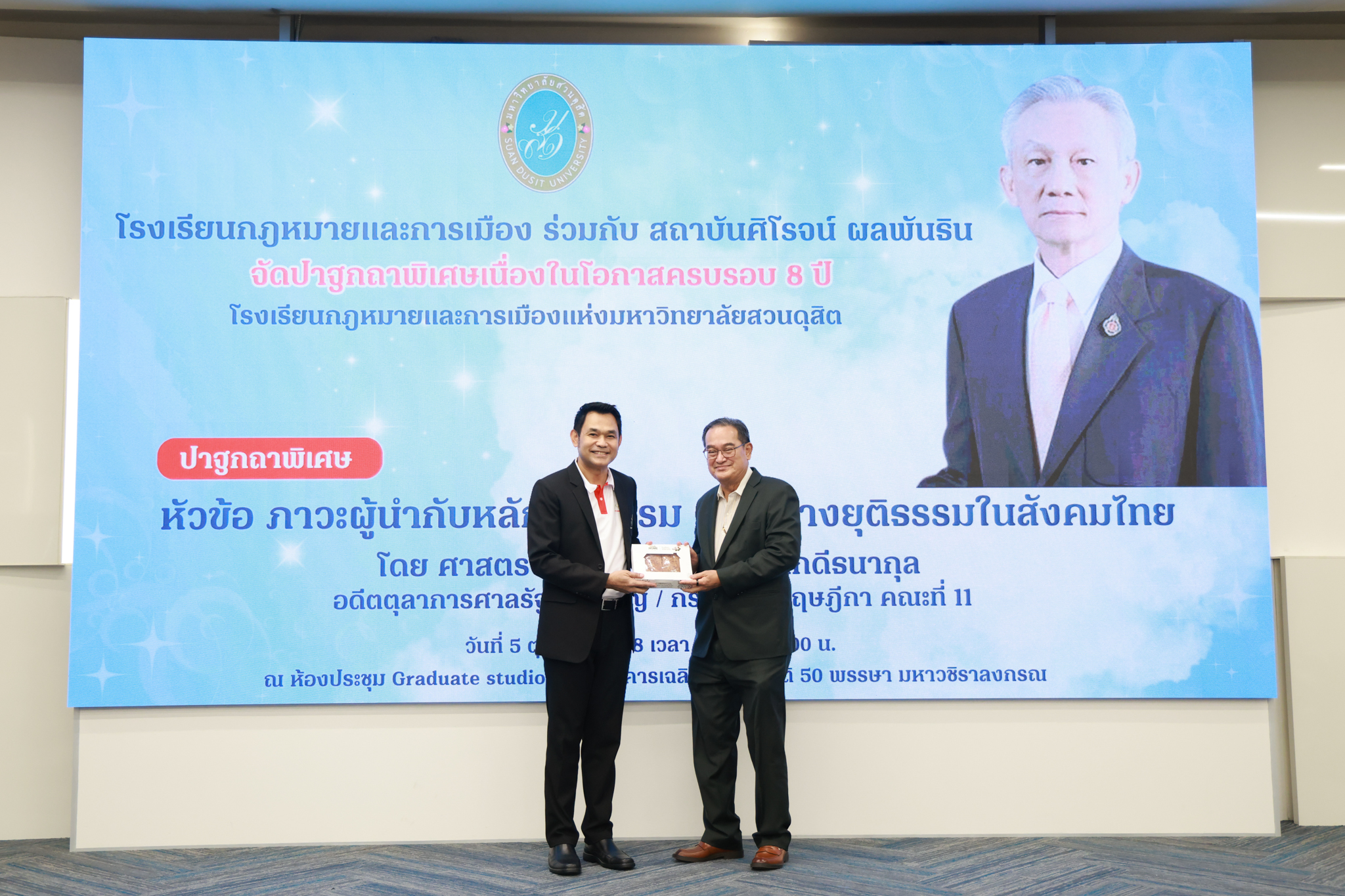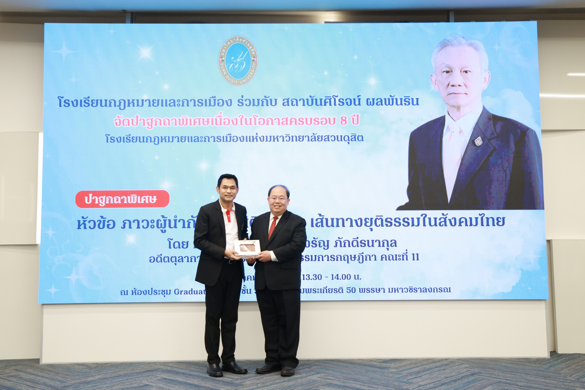 โรงเรียนกฎหมายและการเมือง จัดปาฐกถาพิเศษและเสวนาวิชาการ ในโอกาส ครบรอบ 8 ปี โรงเรียนกฎหมายและการเมือง : อัตลักษณ์ใหม่แห่งมหาวิทยาลัยสวนดุสิต โดย รศ.ดร.ธนภัทร ปัจฉิมม์ ประธานกรรมการดำเนินงาน กล่าวต้อนรับและวัตถุประสงค์การดำเนินงาน กิจกรรมในช่วงแรก ปาฐกถาพิเศษ ได้รับเกียรติจาก ศาสตราจารย์พิเศษ จรัญ ภักดีธนากุล อดีตตุลาการศาลรัฐธรรมนูญ/กรรมการกฤษฎีกา คณะที่ 11 ในหัวข้อ ภาวะผู้นำกับหลักนิติธธรม : เส้นทางยุติธรรมในสังคมไทย โดยความร่วมมือของ โรงเรียนกฎหมายและการเมือง ร่วมกับ สถาบันศิโรจน์ ผลพันธิน
