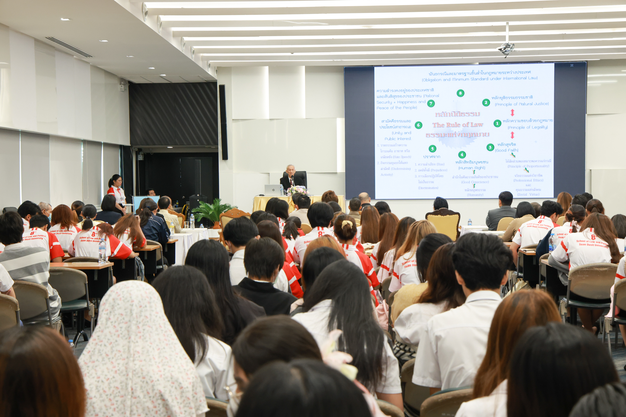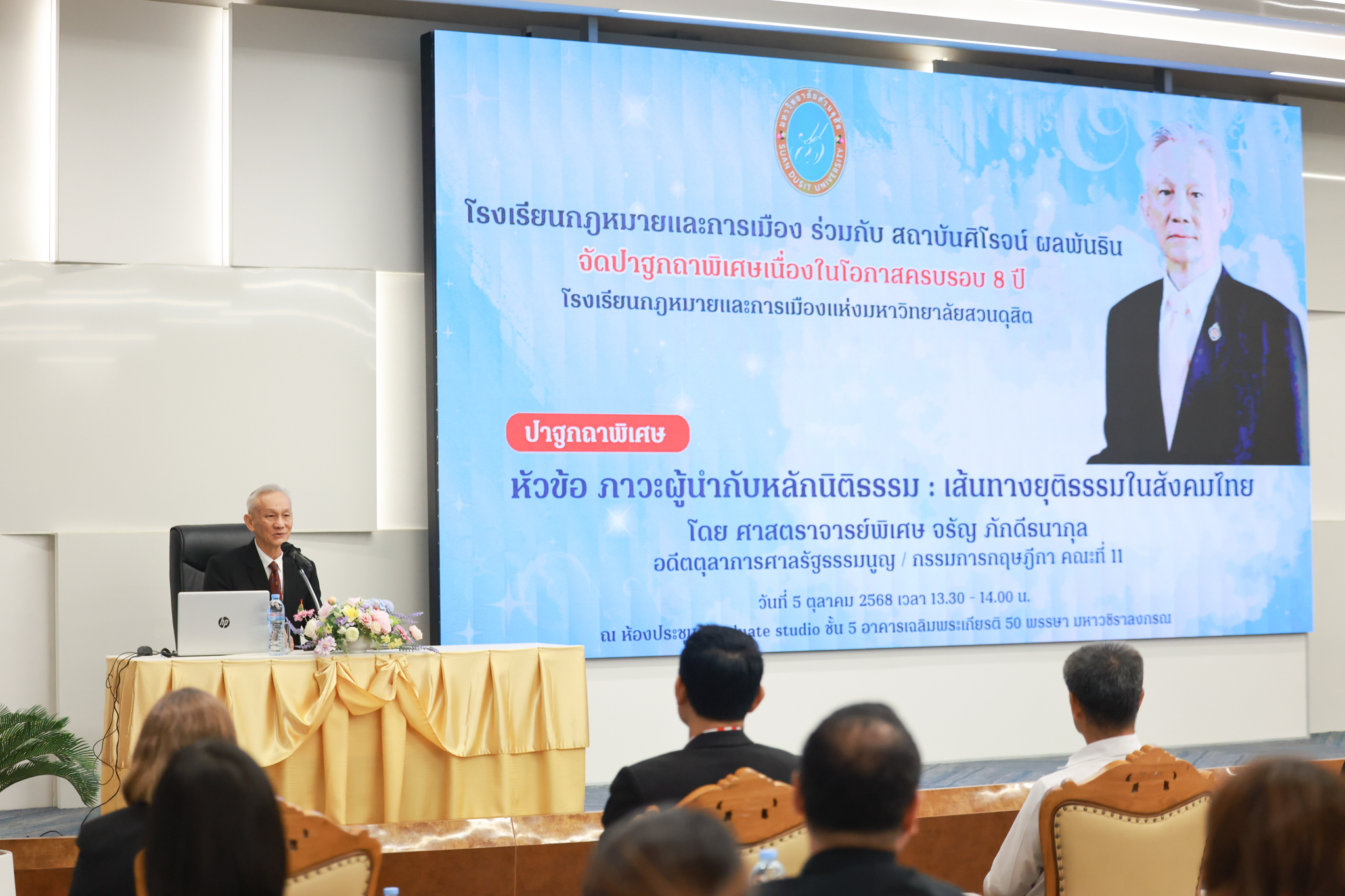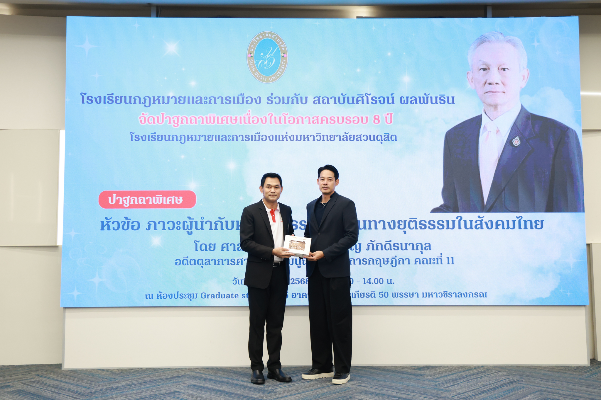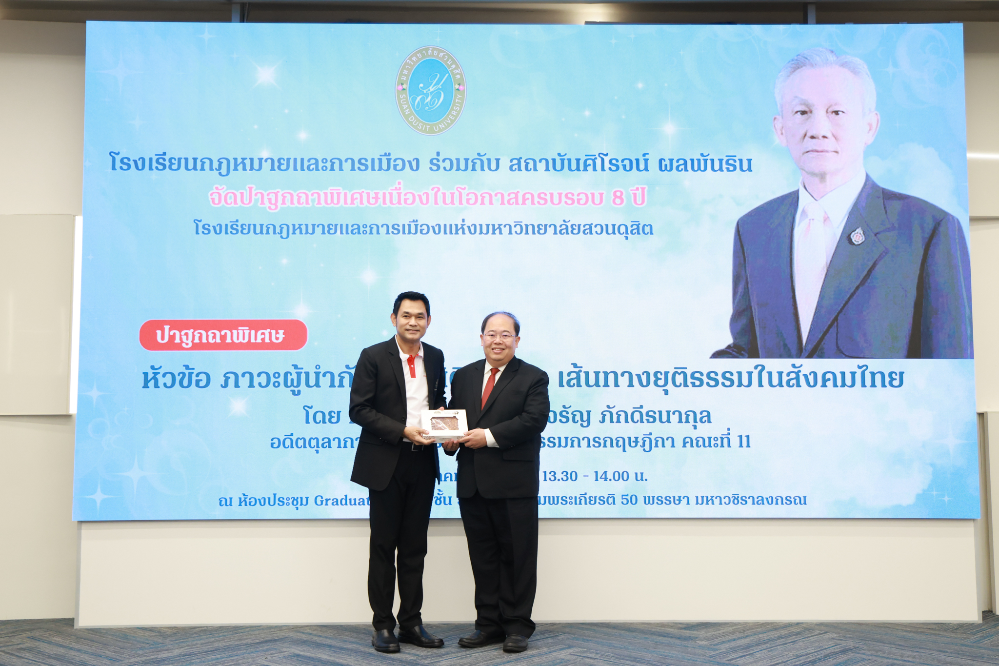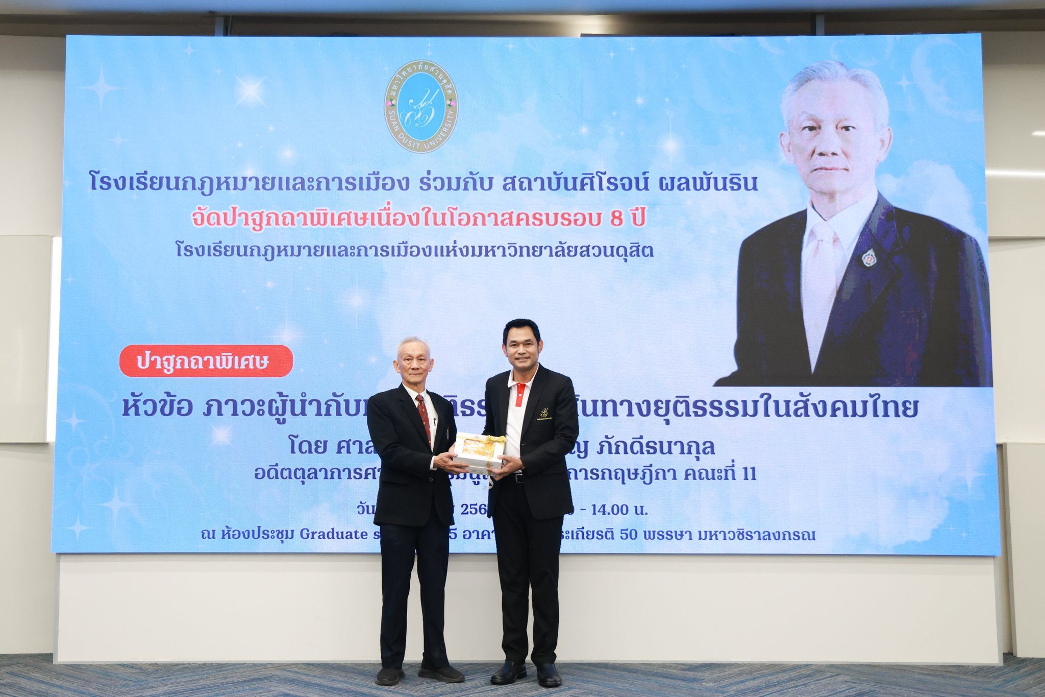 โรงเรียนกฎหมายและการเมือง จัดปาฐกถาพิเศษและเสวนาวิชาการ ในโอกาส ครบรอบ 8 ปี โรงเรียนกฎหมายและการเมือง : อัตลักษณ์ใหม่แห่งมหาวิทยาลัยสวนดุสิต โดย รศ.ดร.ธนภัทร ปัจฉิมม์ ประธานกรรมการดำเนินงาน กล่าวต้อนรับและวัตถุประสงค์การดำเนินงาน กิจกรรมในช่วงแรก ปาฐกถาพิเศษ ได้รับเกียรติจาก ศาสตราจารย์พิเศษ จรัญ ภักดีธนากุล อดีตตุลาการศาลรัฐธรรมนูญ/กรรมการกฤษฎีกา คณะที่ 11 ในหัวข้อ ภาวะผู้นำกับหลักนิติธธรม : เส้นทางยุติธรรมในสังคมไทย โดยความร่วมมือของ โรงเรียนกฎหมายและการเมือง ร่วมกับ สถาบันศิโรจน์ ผลพันธิน