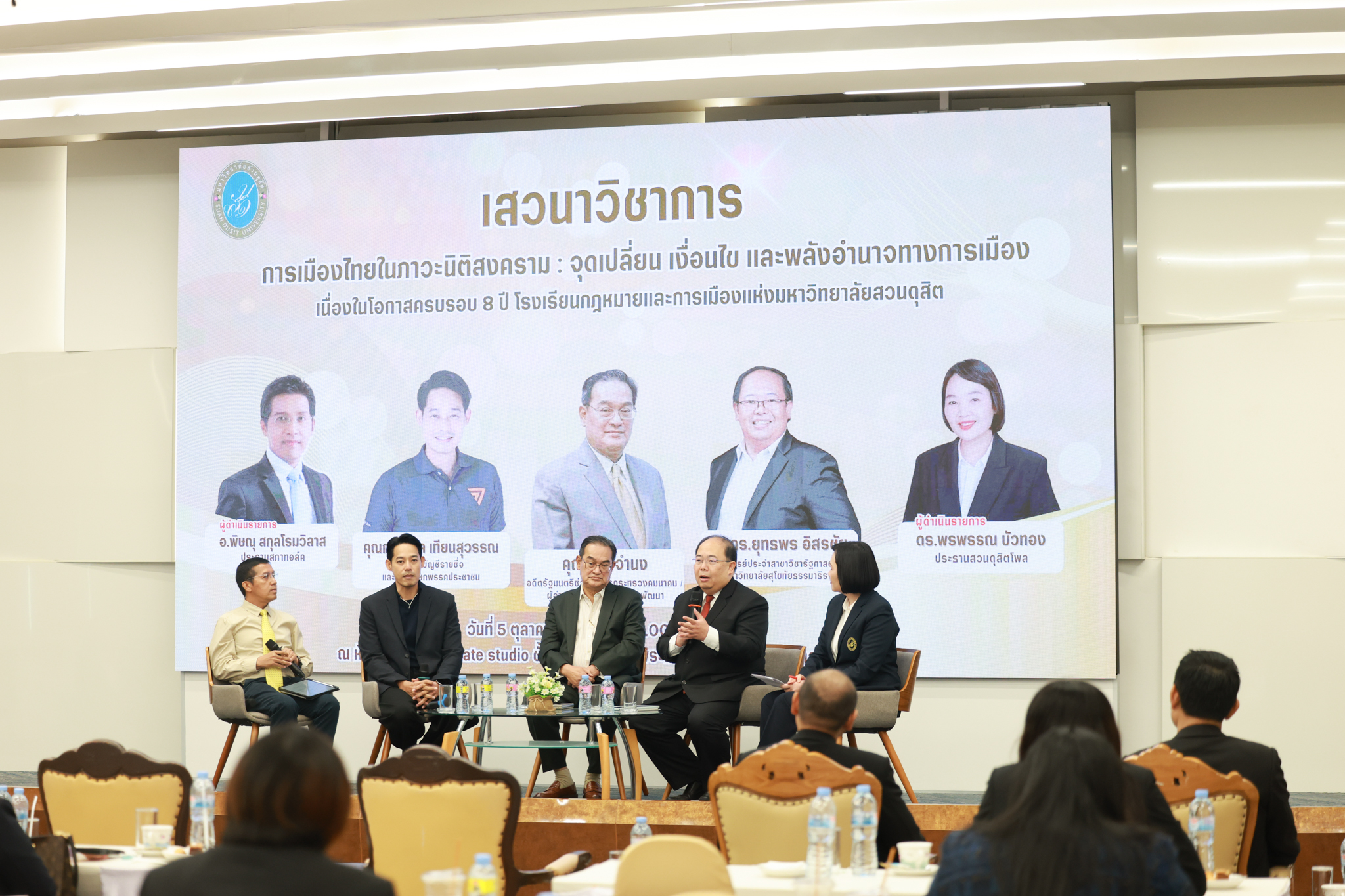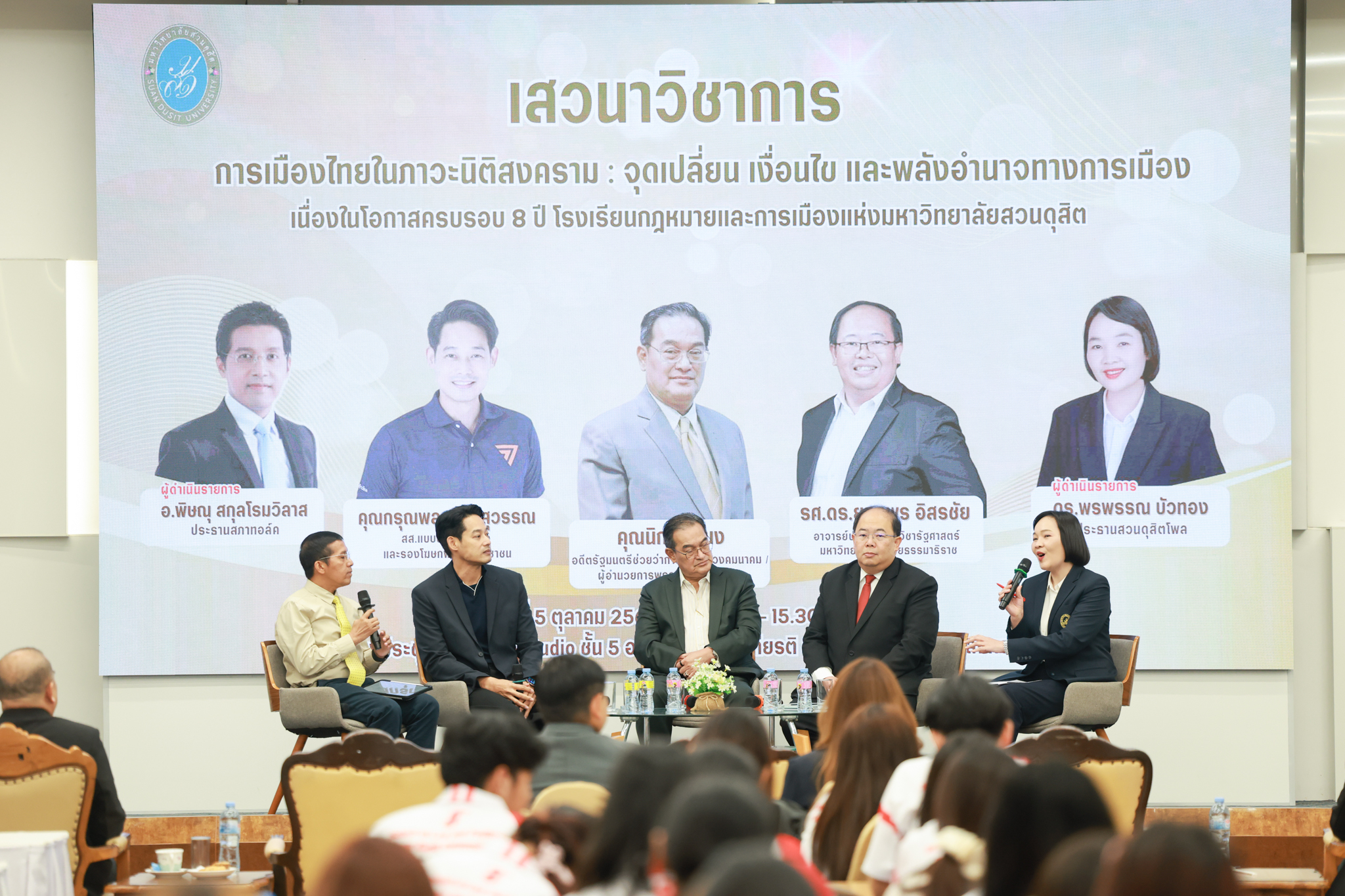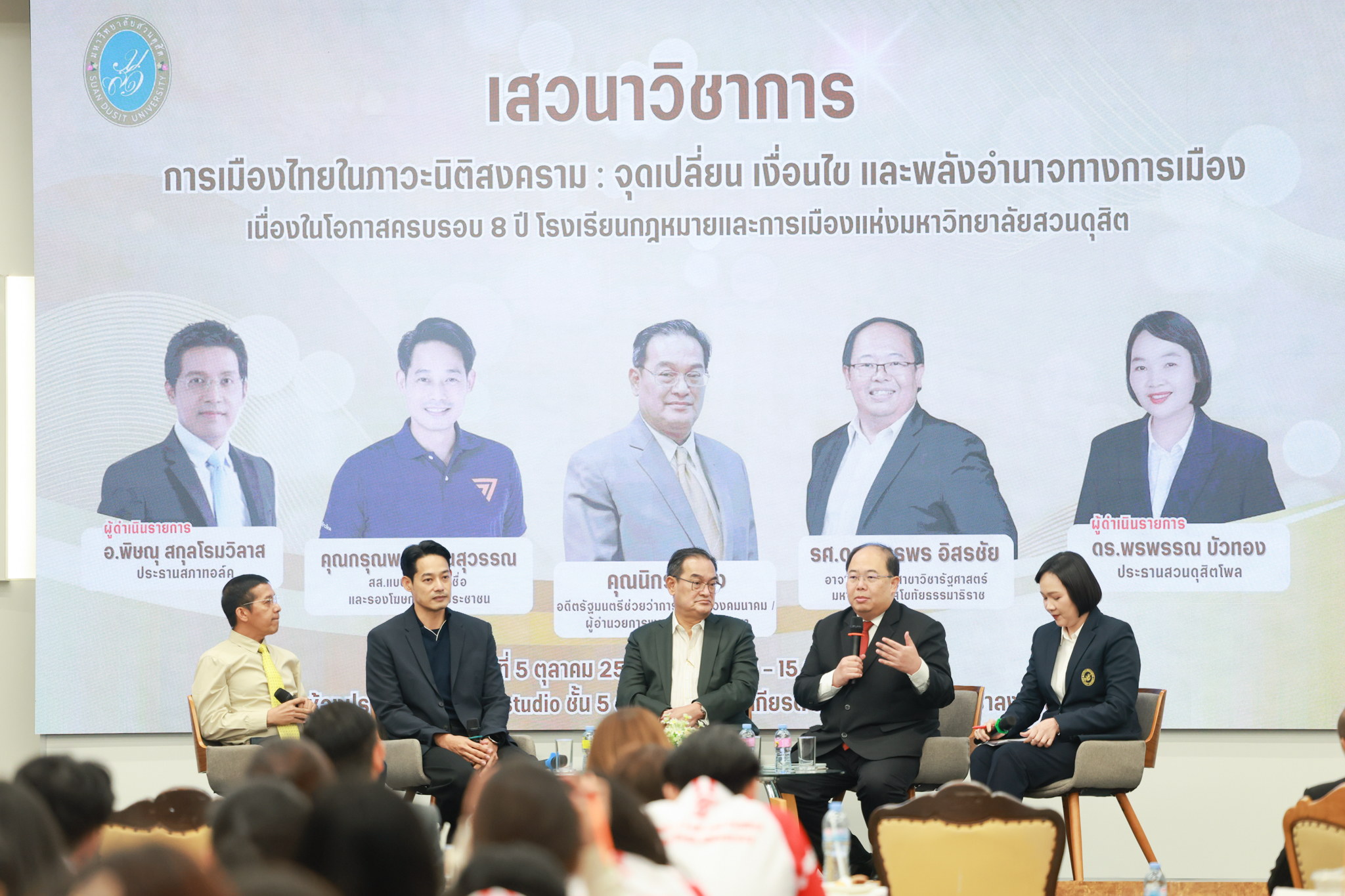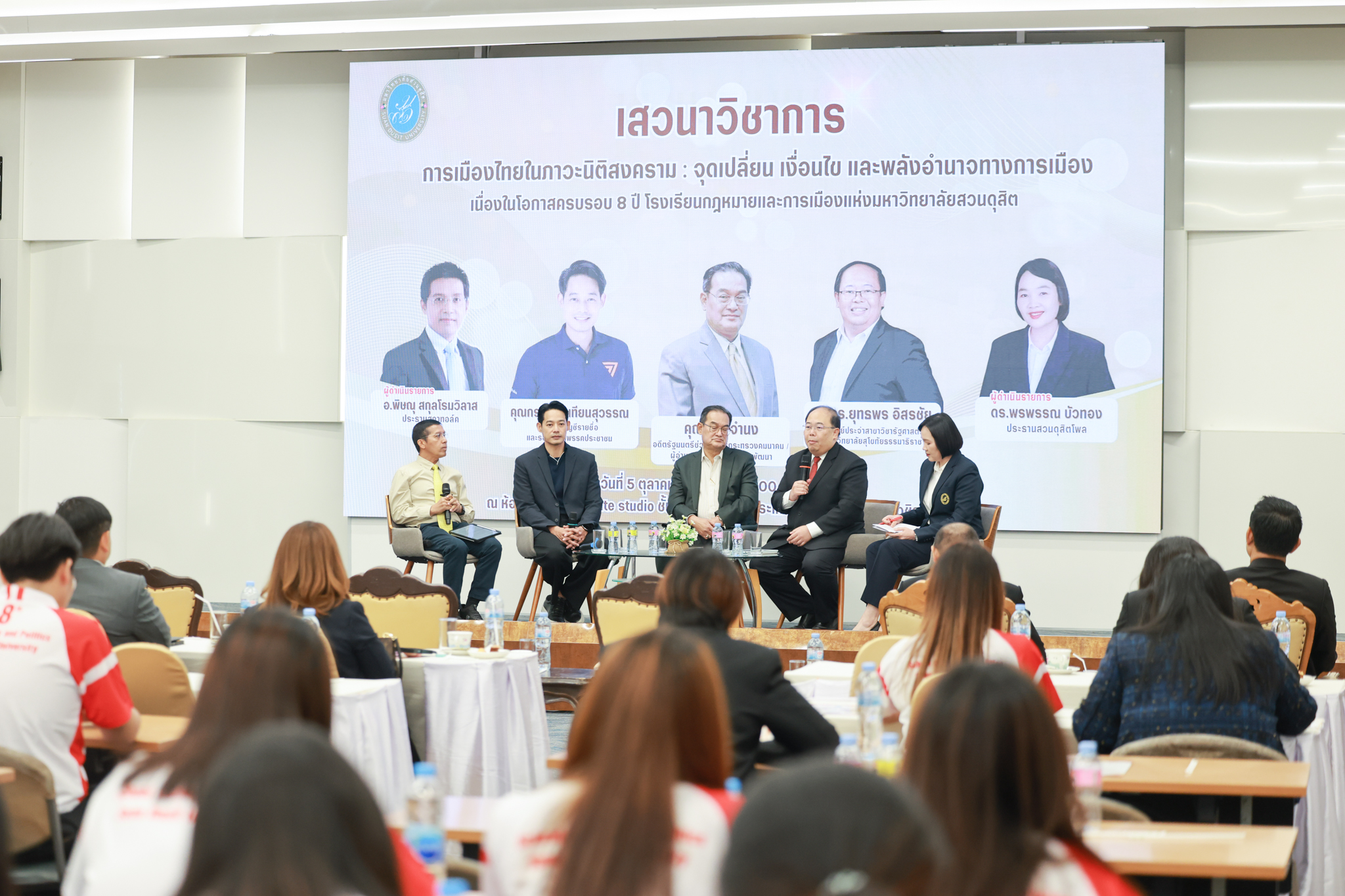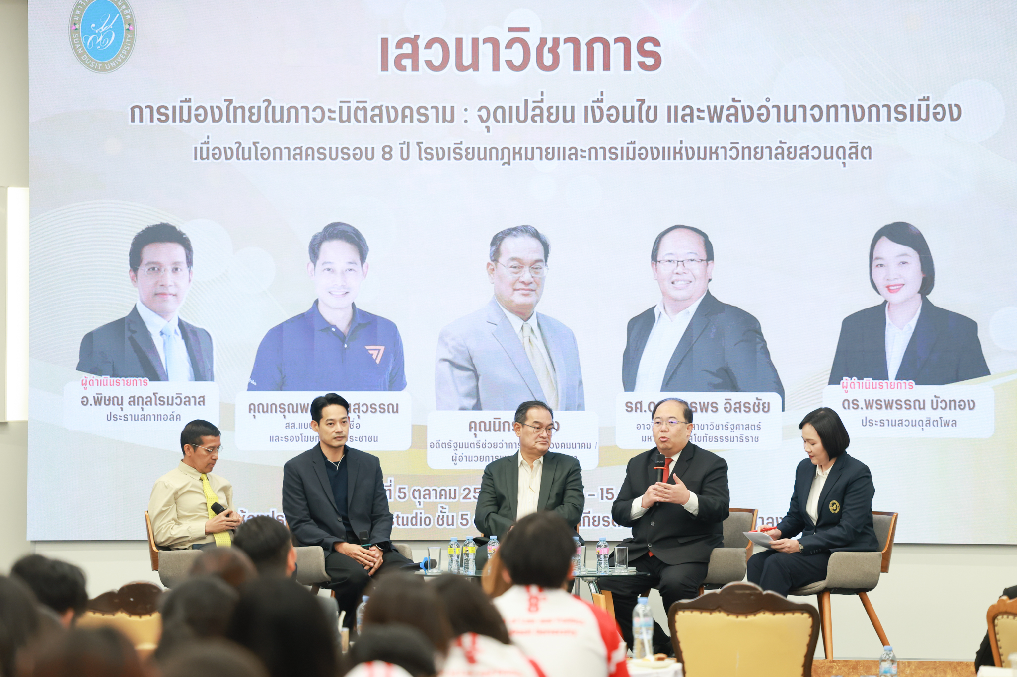 โรงเรียนกฎหมายและการเมือง จัดปาฐกถาพิเศษและเสวนาวิชาการ ในโอกาส ครบรอบ 8 ปี โรงเรียนกฎหมายและการเมือง : อัตลักษณ์ใหม่แห่งมหาวิทยาลัยสวนดุสิต โดย รศ.ดร.ธนภัทร ปัจฉิมม์ ประธานกรรมการดำเนินงาน กล่าวต้อนรับและวัตถุประสงค์การดำเนินงาน กิจกรรมในช่วงแรก ปาฐกถาพิเศษ ได้รับเกียรติจาก ศาสตราจารย์พิเศษ จรัญ ภักดีธนากุล อดีตตุลาการศาลรัฐธรรมนูญ/กรรมการกฤษฎีกา คณะที่ 11 ในหัวข้อ ภาวะผู้นำกับหลักนิติธธรม : เส้นทางยุติธรรมในสังคมไทย โดยความร่วมมือของ โรงเรียนกฎหมายและการเมือง ร่วมกับ สถาบันศิโรจน์ ผลพันธิน