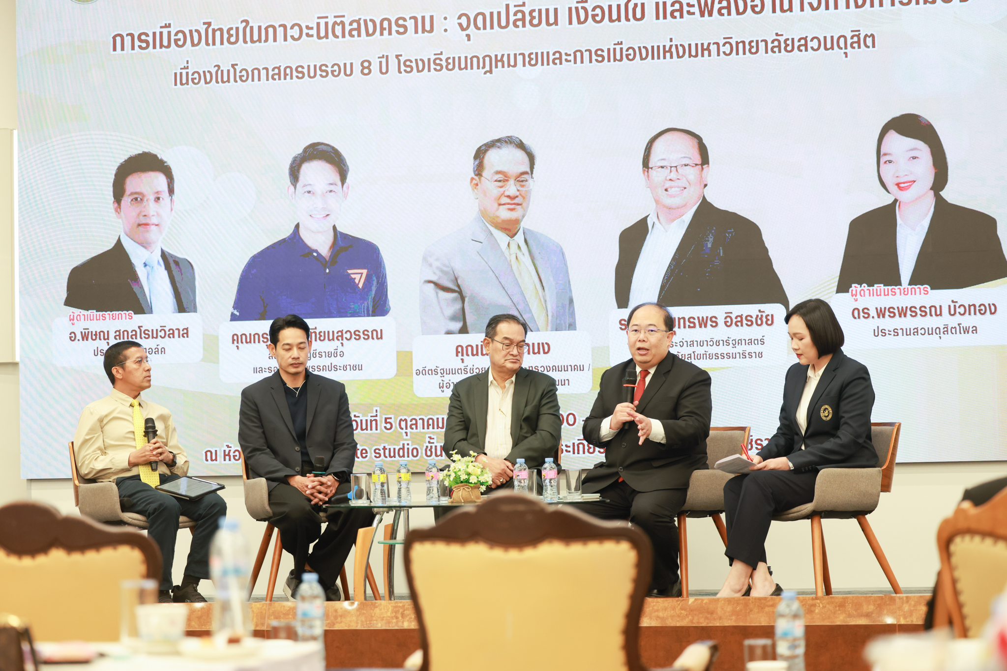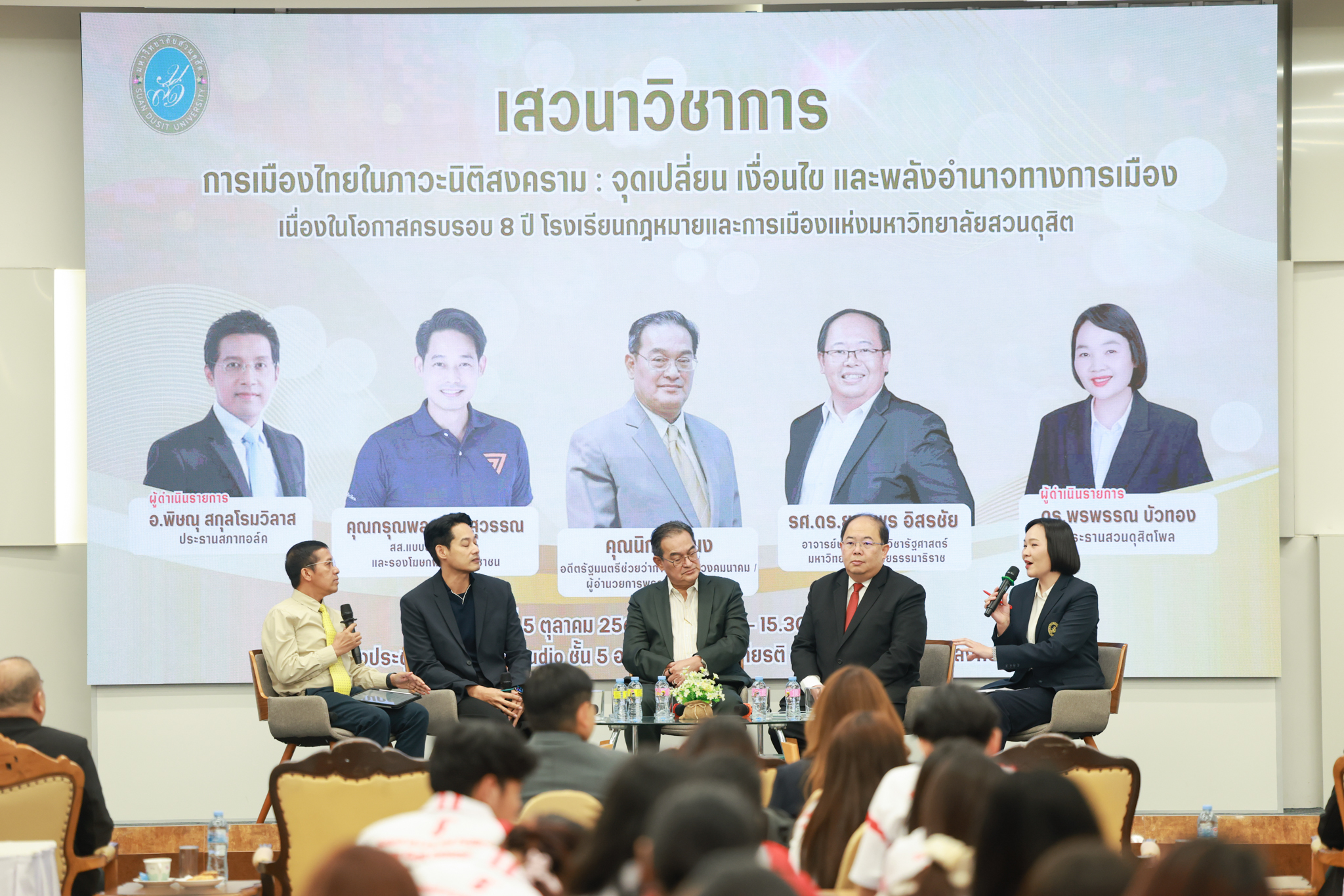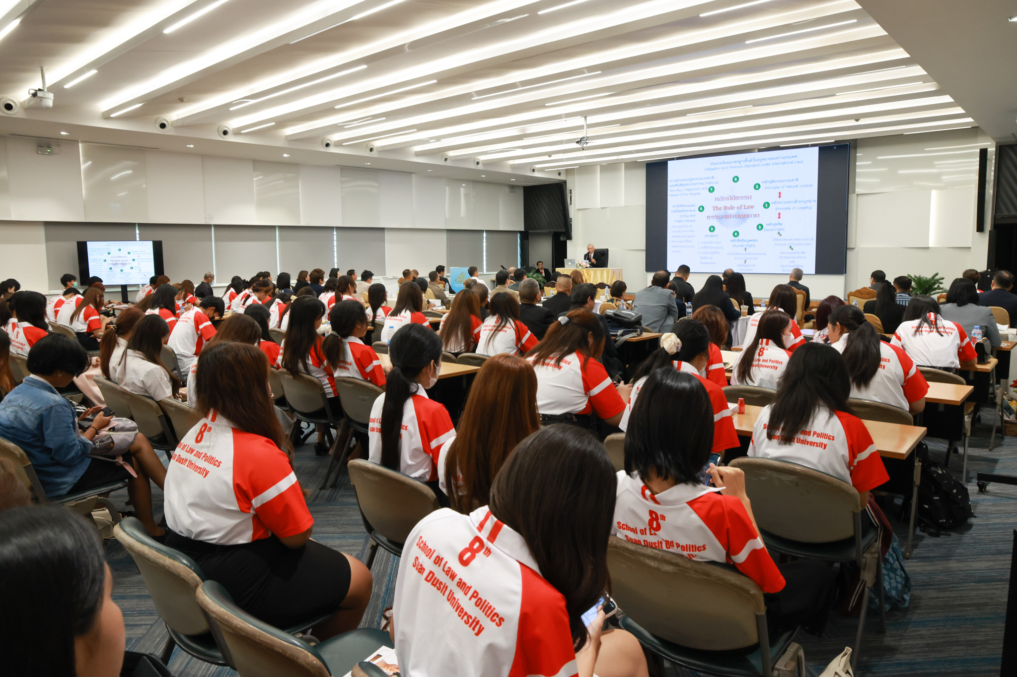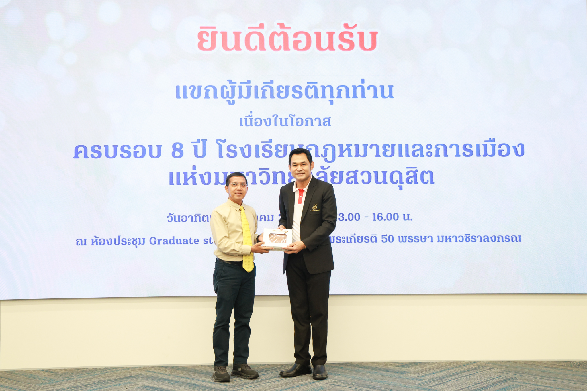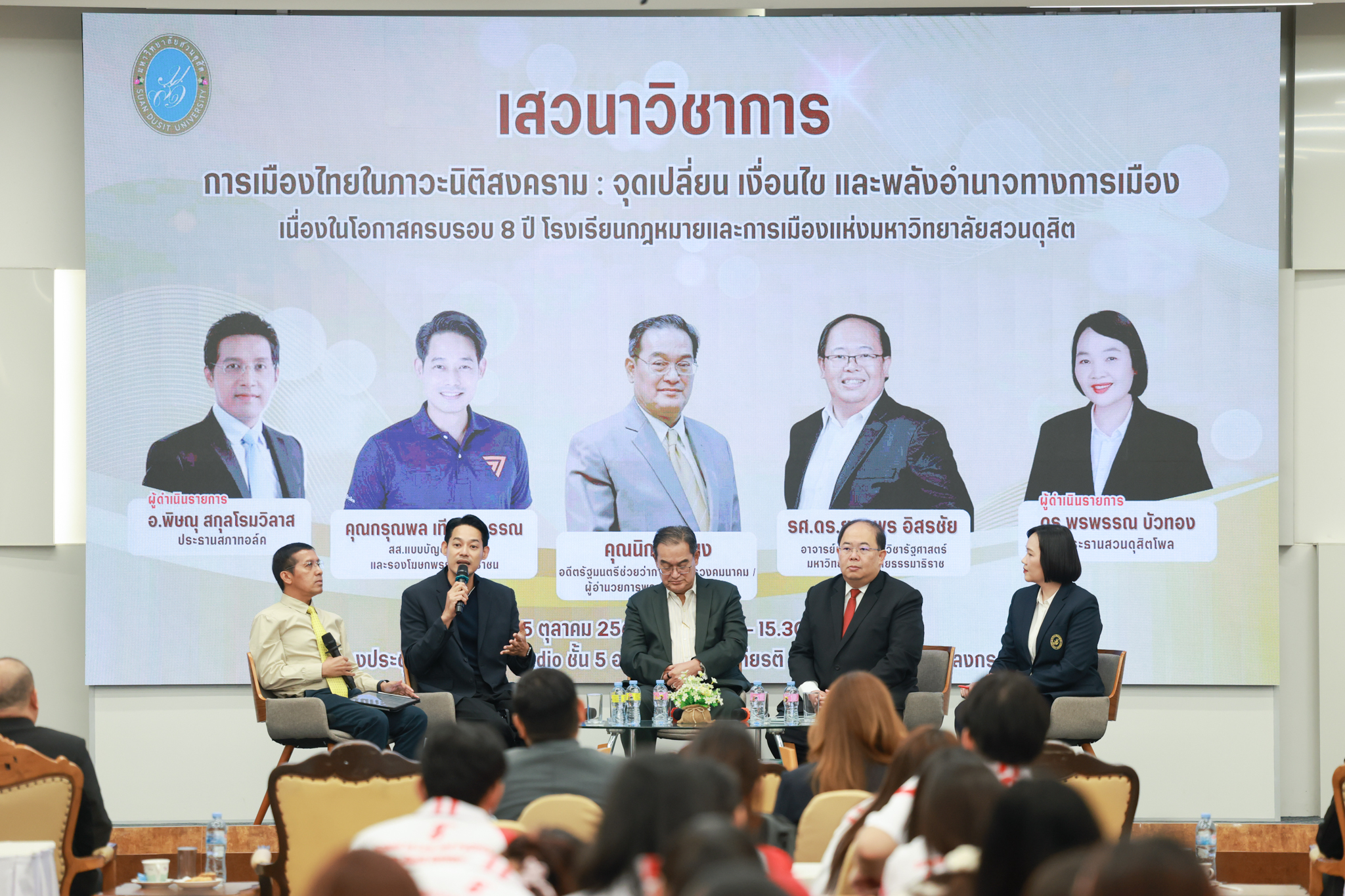 โรงเรียนกฎหมายและการเมือง จัดปาฐกถาพิเศษและเสวนาวิชาการ ในโอกาส ครบรอบ 8 ปี โรงเรียนกฎหมายและการเมือง : อัตลักษณ์ใหม่แห่งมหาวิทยาลัยสวนดุสิต โดย รศ.ดร.ธนภัทร ปัจฉิมม์ ประธานกรรมการดำเนินงาน กล่าวต้อนรับและวัตถุประสงค์การดำเนินงาน กิจกรรมในช่วงแรก ปาฐกถาพิเศษ ได้รับเกียรติจาก ศาสตราจารย์พิเศษ จรัญ ภักดีธนากุล อดีตตุลาการศาลรัฐธรรมนูญ/กรรมการกฤษฎีกา คณะที่ 11 ในหัวข้อ ภาวะผู้นำกับหลักนิติธธรม : เส้นทางยุติธรรมในสังคมไทย โดยความร่วมมือของ โรงเรียนกฎหมายและการเมือง ร่วมกับ สถาบันศิโรจน์ ผลพันธิน