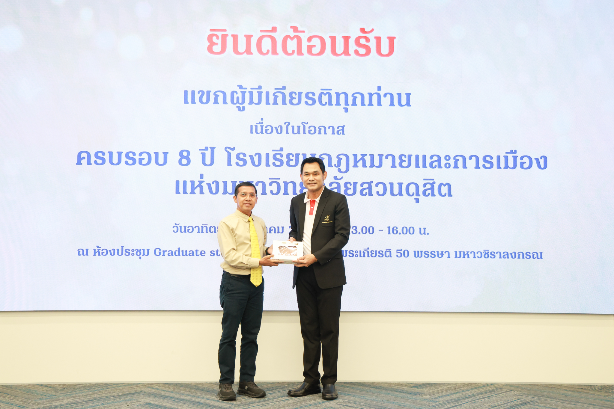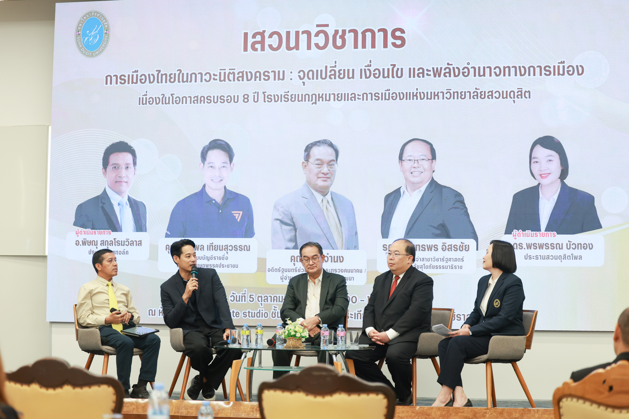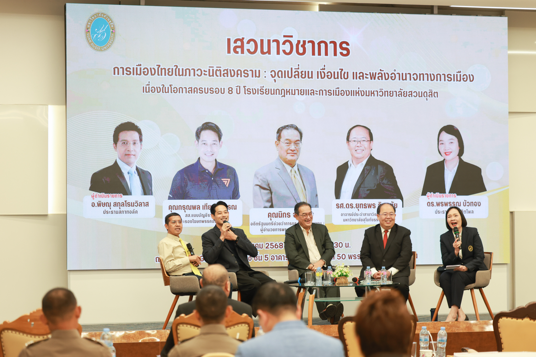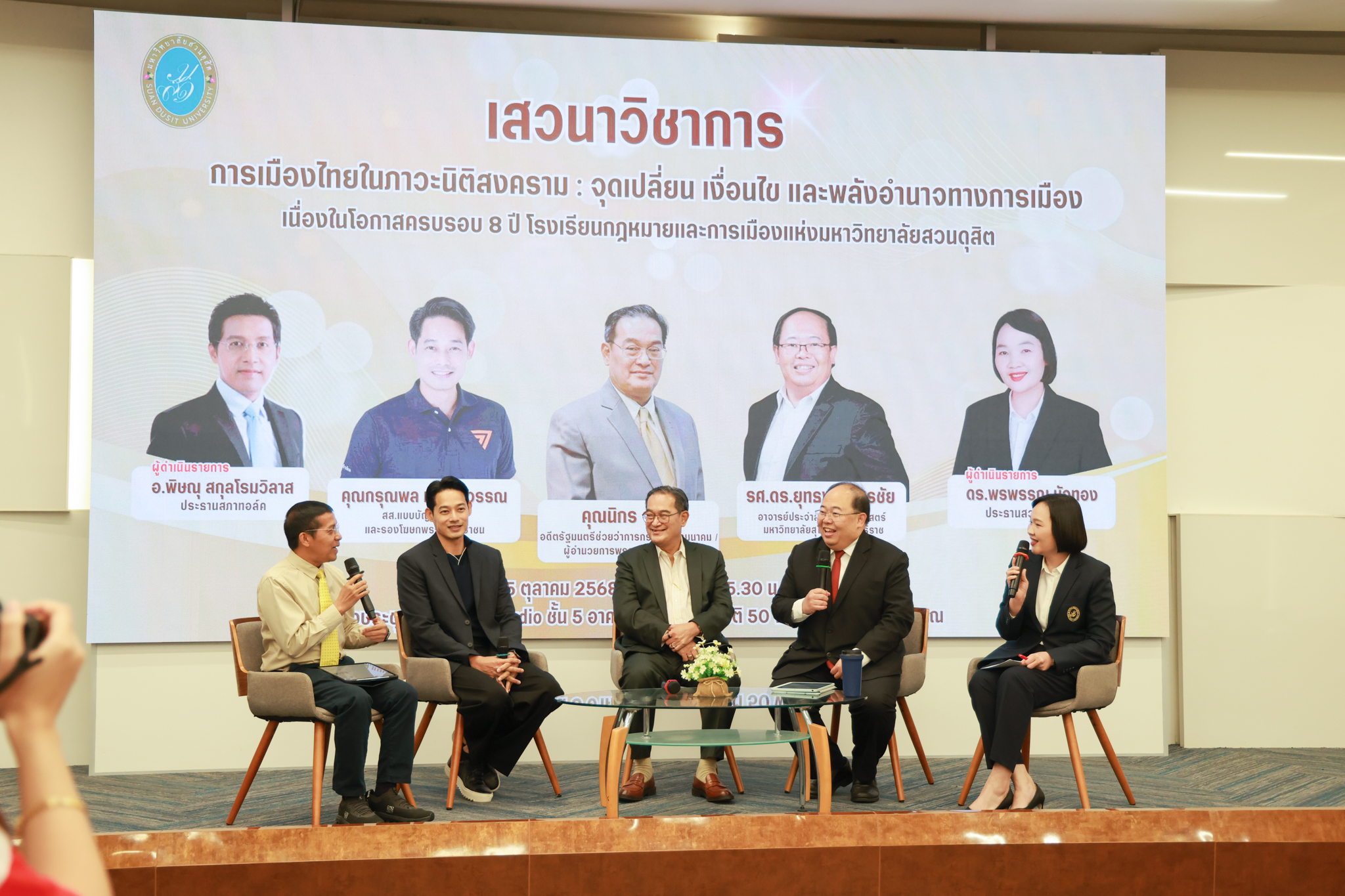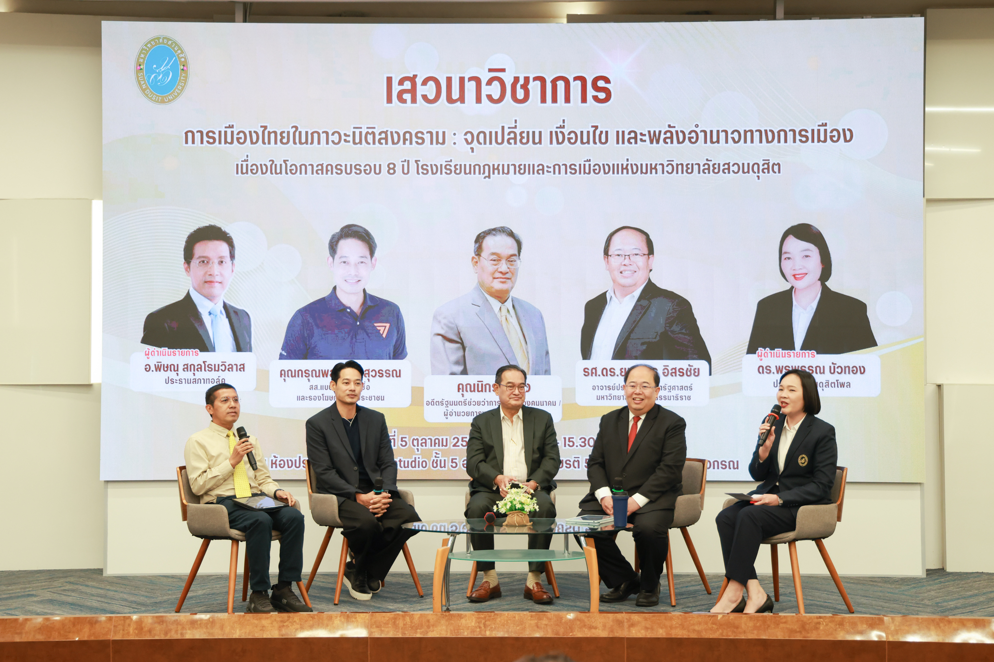 โรงเรียนกฎหมายและการเมือง จัดปาฐกถาพิเศษและเสวนาวิชาการ ในโอกาส ครบรอบ 8 ปี โรงเรียนกฎหมายและการเมือง : อัตลักษณ์ใหม่แห่งมหาวิทยาลัยสวนดุสิต โดย รศ.ดร.ธนภัทร ปัจฉิมม์ ประธานกรรมการดำเนินงาน กล่าวต้อนรับและวัตถุประสงค์การดำเนินงาน กิจกรรมในช่วงแรก ปาฐกถาพิเศษ ได้รับเกียรติจาก ศาสตราจารย์พิเศษ จรัญ ภักดีธนากุล อดีตตุลาการศาลรัฐธรรมนูญ/กรรมการกฤษฎีกา คณะที่ 11 ในหัวข้อ ภาวะผู้นำกับหลักนิติธธรม : เส้นทางยุติธรรมในสังคมไทย โดยความร่วมมือของ โรงเรียนกฎหมายและการเมือง ร่วมกับ สถาบันศิโรจน์ ผลพันธิน