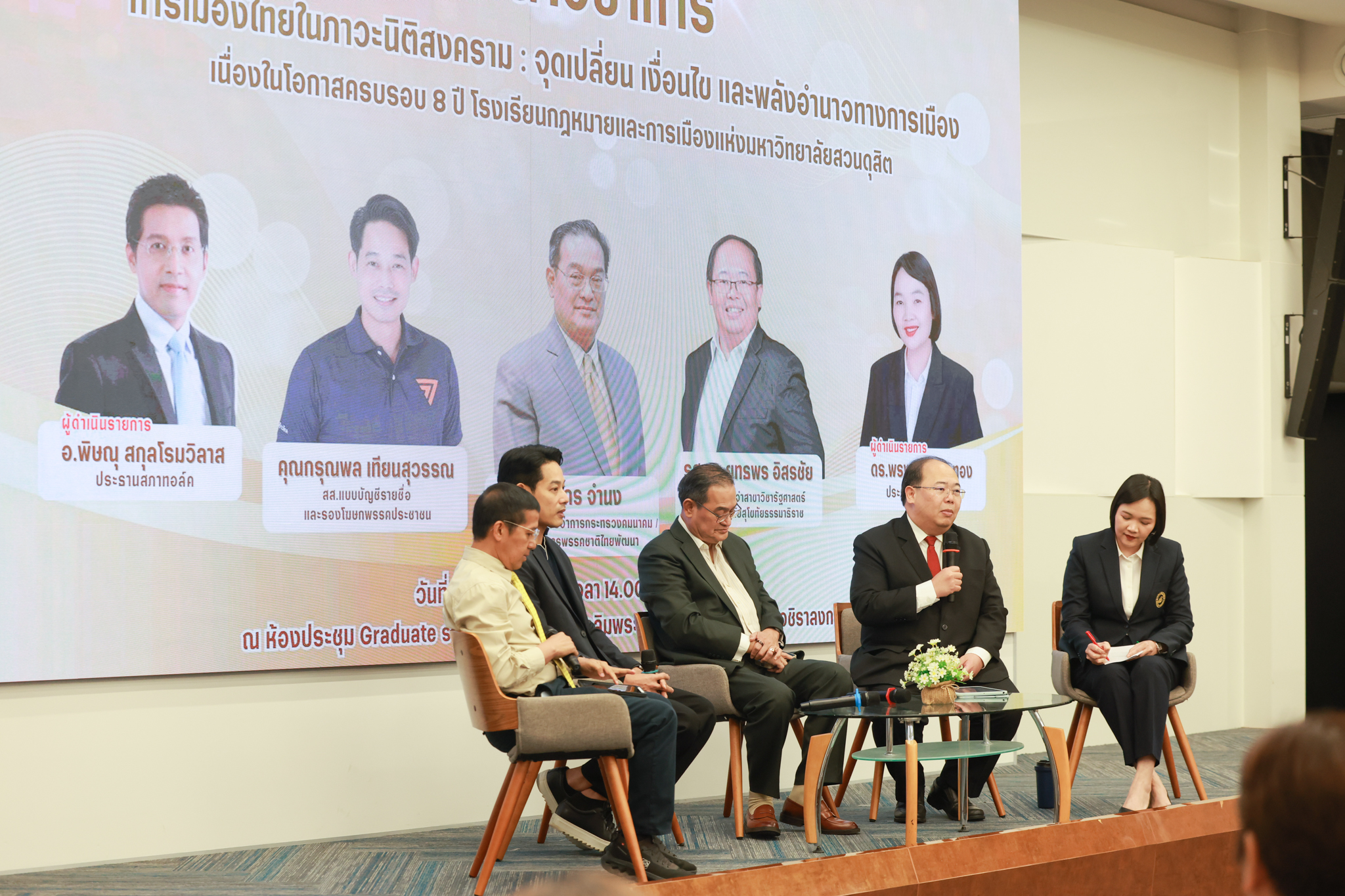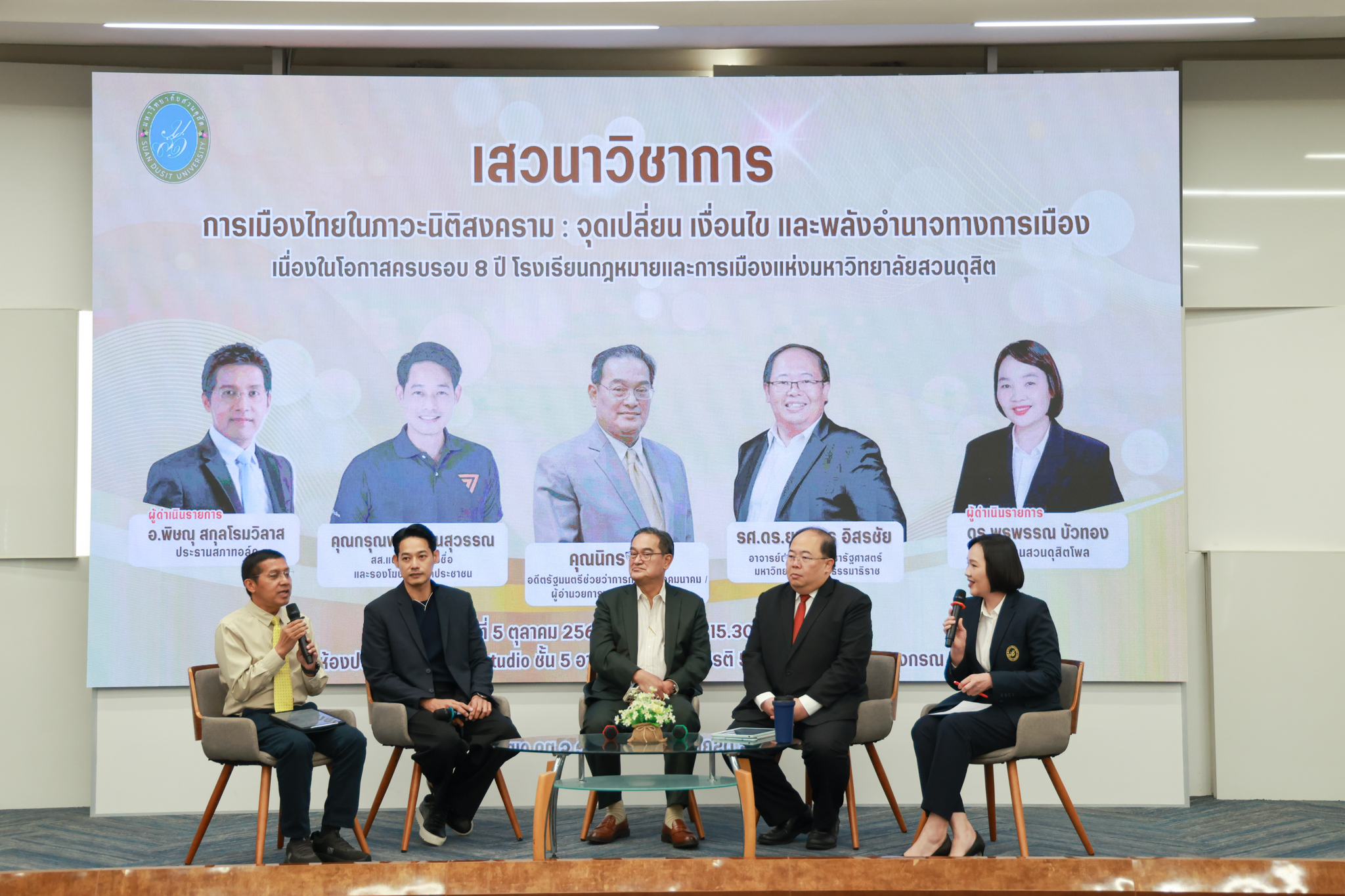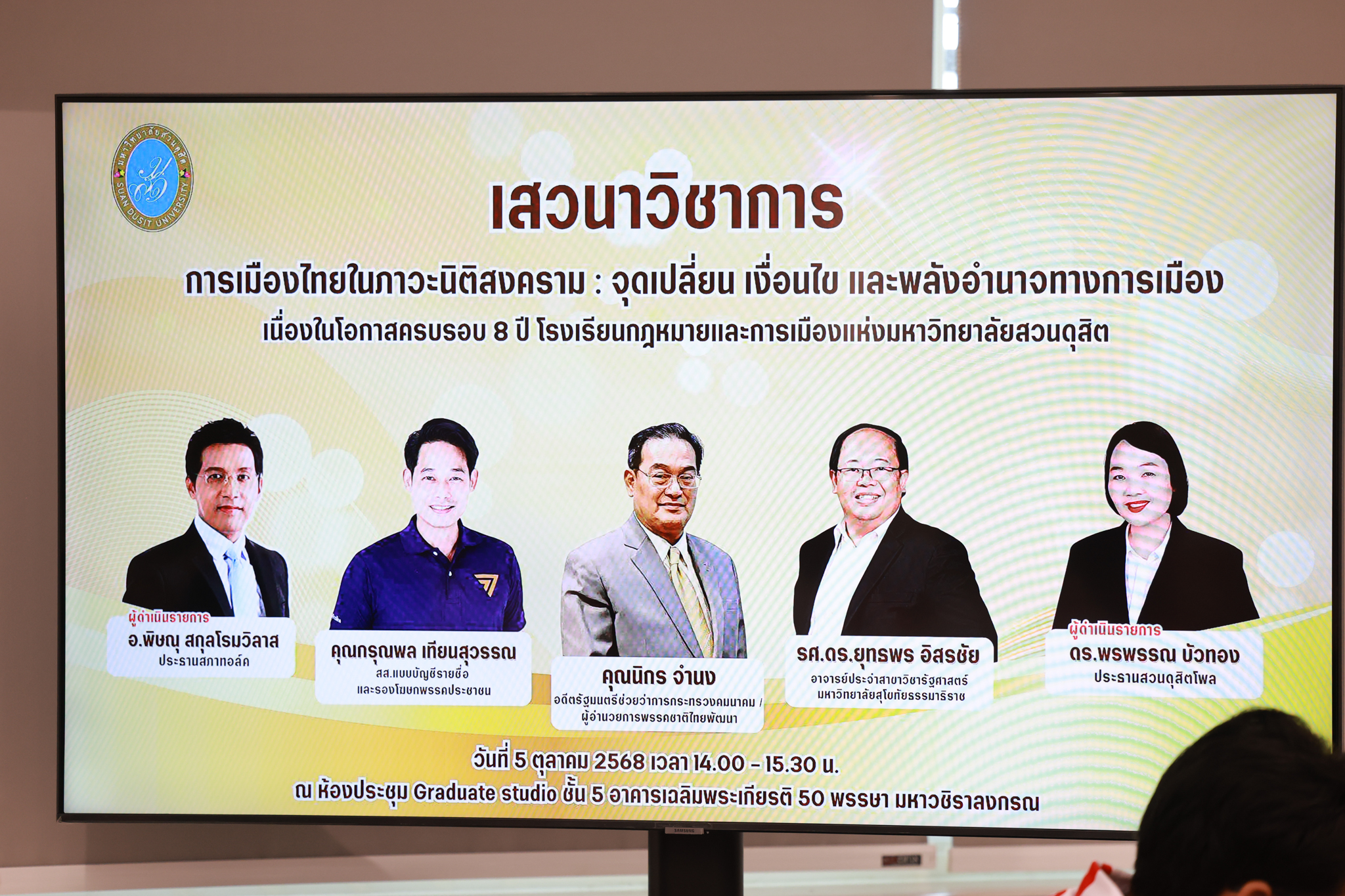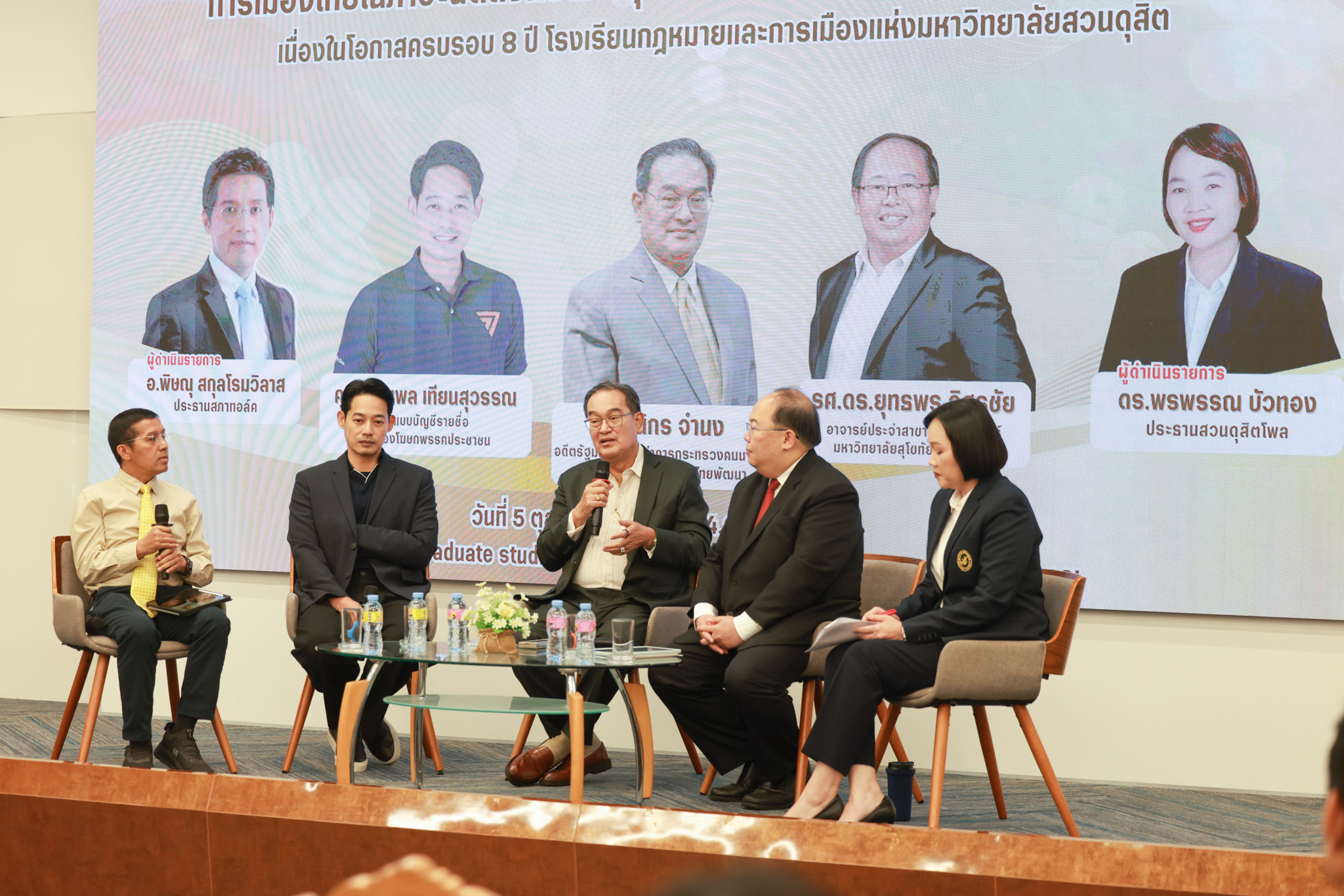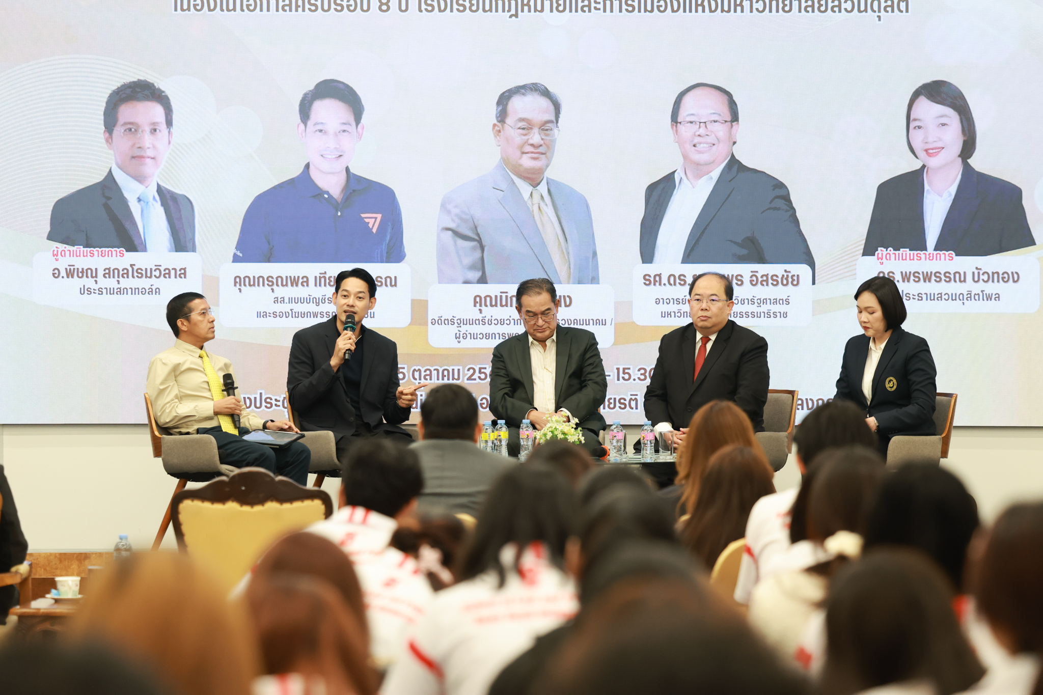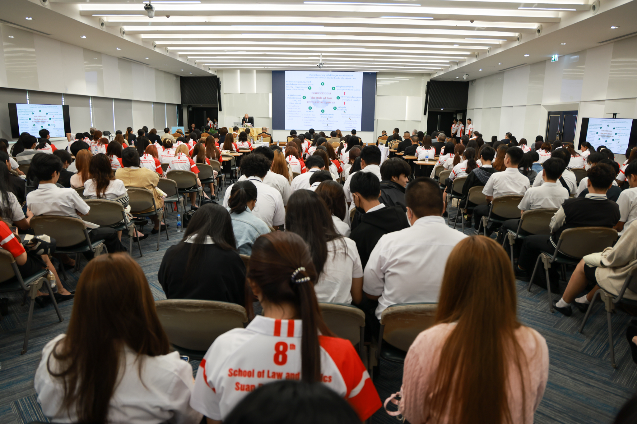 โรงเรียนกฎหมายและการเมือง จัดปาฐกถาพิเศษและเสวนาวิชาการ ในโอกาส ครบรอบ 8 ปี โรงเรียนกฎหมายและการเมือง : อัตลักษณ์ใหม่แห่งมหาวิทยาลัยสวนดุสิต โดย รศ.ดร.ธนภัทร ปัจฉิมม์ ประธานกรรมการดำเนินงาน กล่าวต้อนรับและวัตถุประสงค์การดำเนินงาน กิจกรรมในช่วงแรก ปาฐกถาพิเศษ ได้รับเกียรติจาก ศาสตราจารย์พิเศษ จรัญ ภักดีธนากุล อดีตตุลาการศาลรัฐธรรมนูญ/กรรมการกฤษฎีกา คณะที่ 11 ในหัวข้อ ภาวะผู้นำกับหลักนิติธธรม : เส้นทางยุติธรรมในสังคมไทย โดยความร่วมมือของ โรงเรียนกฎหมายและการเมือง ร่วมกับ สถาบันศิโรจน์ ผลพันธิน