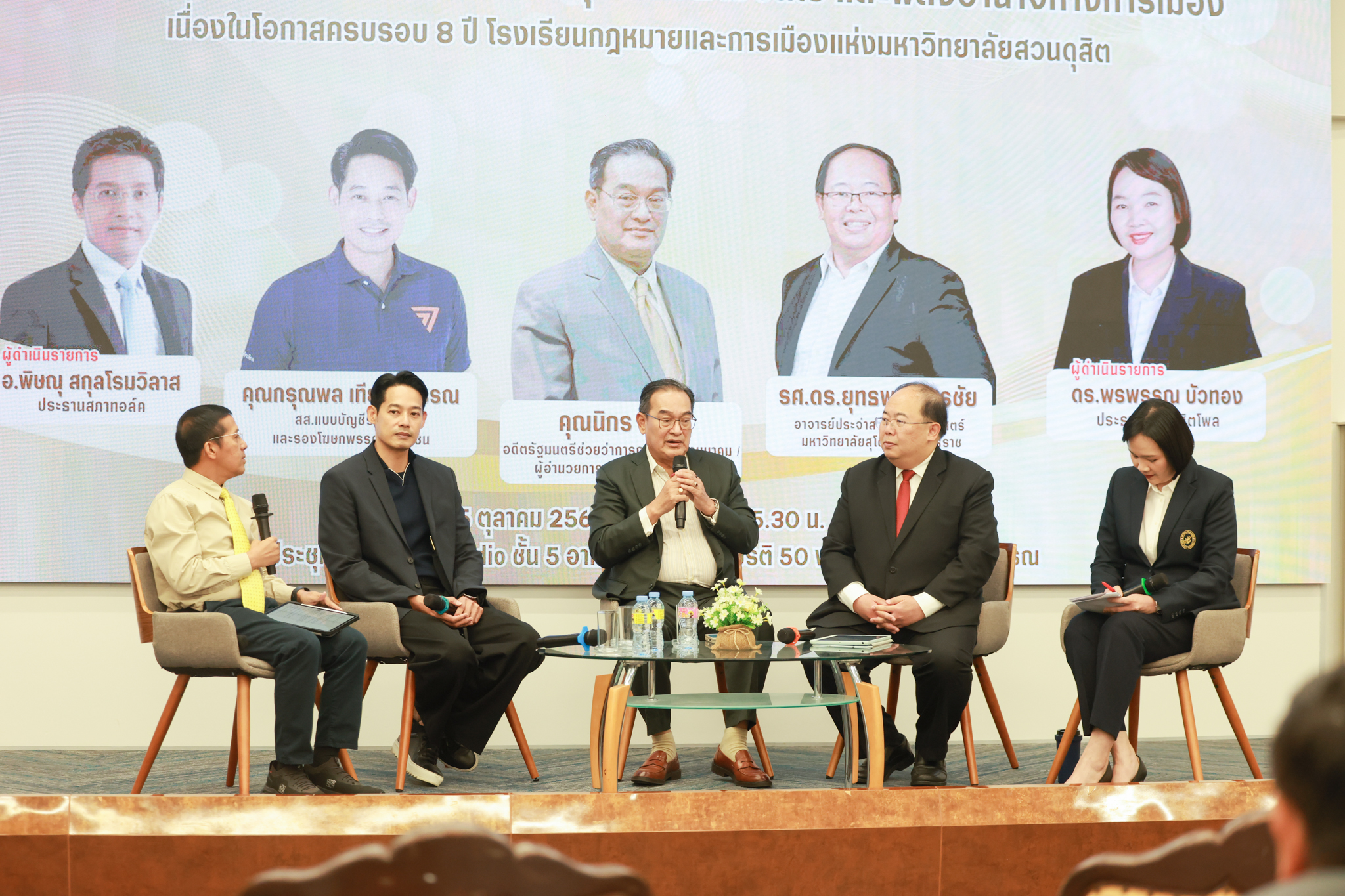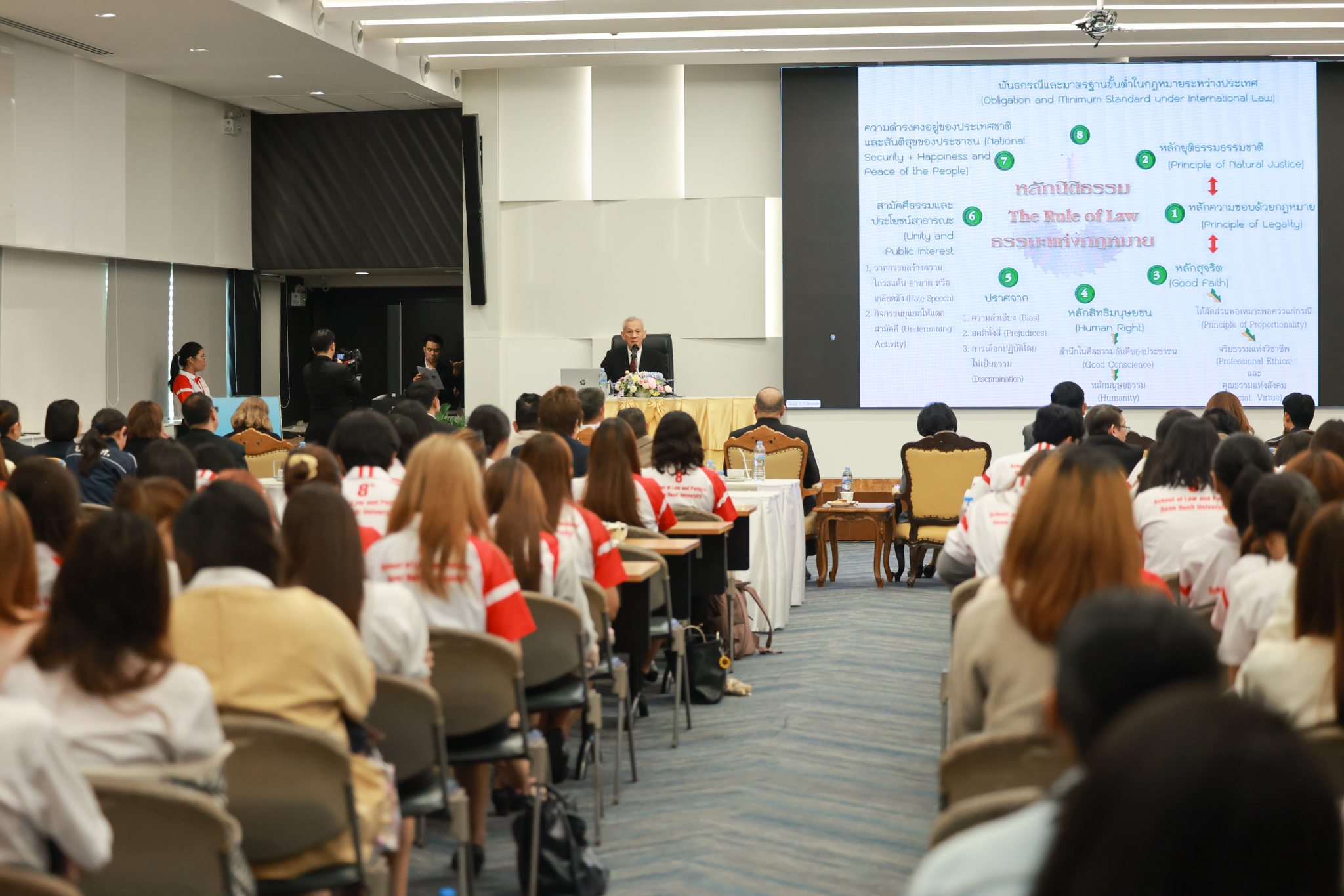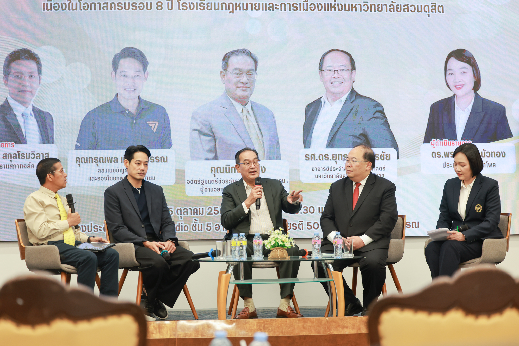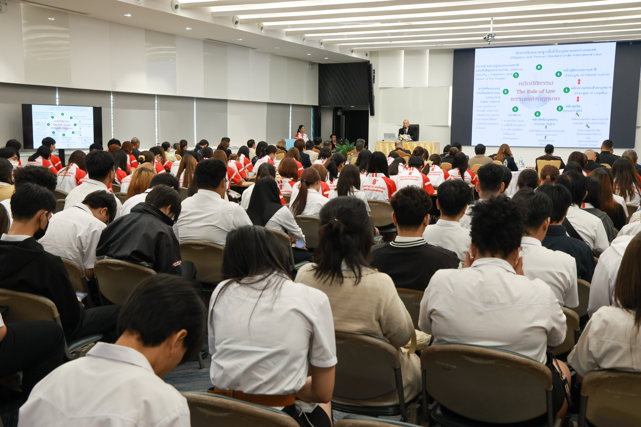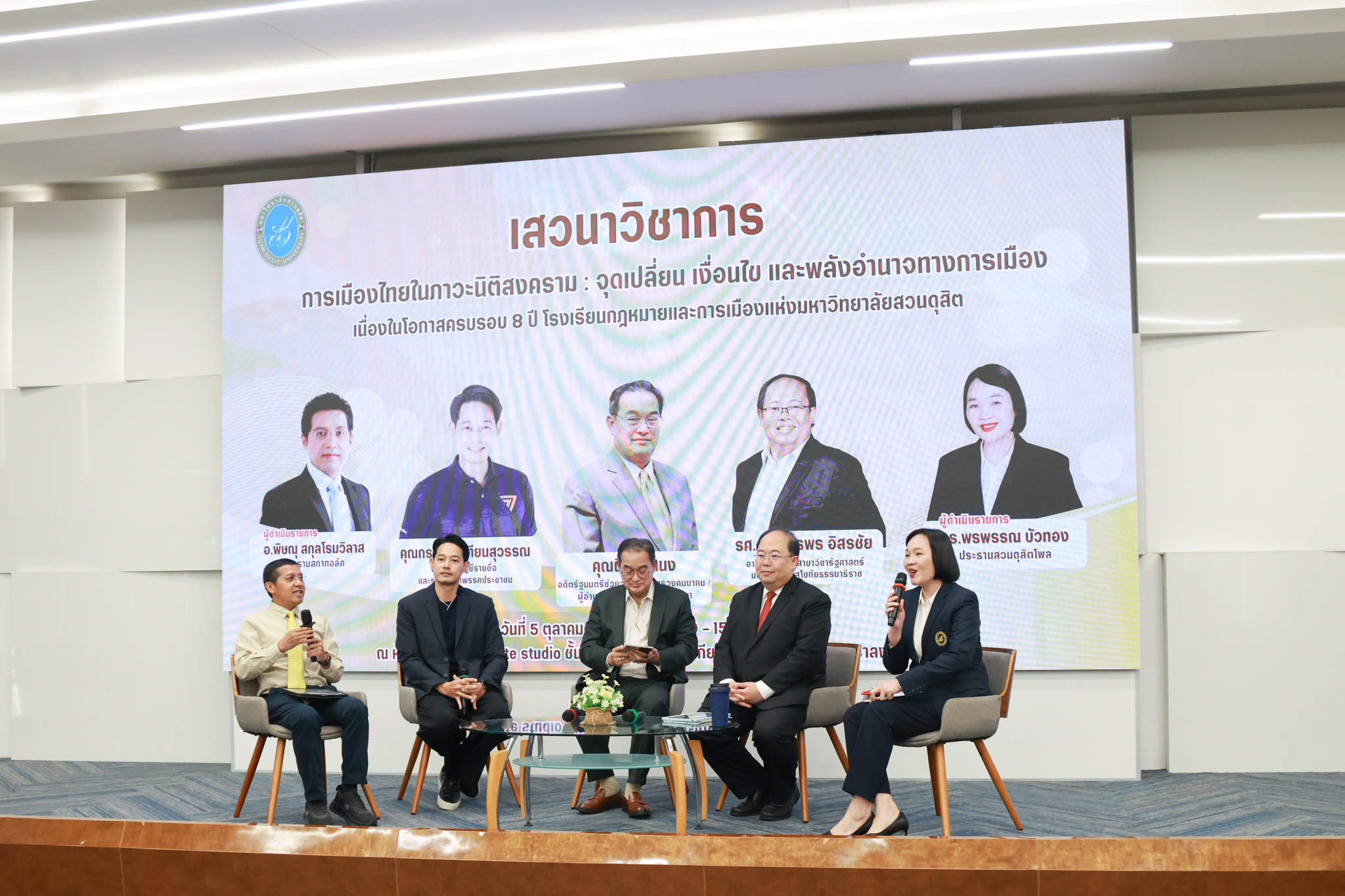 โรงเรียนกฎหมายและการเมือง จัดปาฐกถาพิเศษและเสวนาวิชาการ ในโอกาส ครบรอบ 8 ปี โรงเรียนกฎหมายและการเมือง : อัตลักษณ์ใหม่แห่งมหาวิทยาลัยสวนดุสิต โดย รศ.ดร.ธนภัทร ปัจฉิมม์ ประธานกรรมการดำเนินงาน กล่าวต้อนรับและวัตถุประสงค์การดำเนินงาน กิจกรรมในช่วงแรก ปาฐกถาพิเศษ ได้รับเกียรติจาก ศาสตราจารย์พิเศษ จรัญ ภักดีธนากุล อดีตตุลาการศาลรัฐธรรมนูญ/กรรมการกฤษฎีกา คณะที่ 11 ในหัวข้อ ภาวะผู้นำกับหลักนิติธธรม : เส้นทางยุติธรรมในสังคมไทย โดยความร่วมมือของ โรงเรียนกฎหมายและการเมือง ร่วมกับ สถาบันศิโรจน์ ผลพันธิน