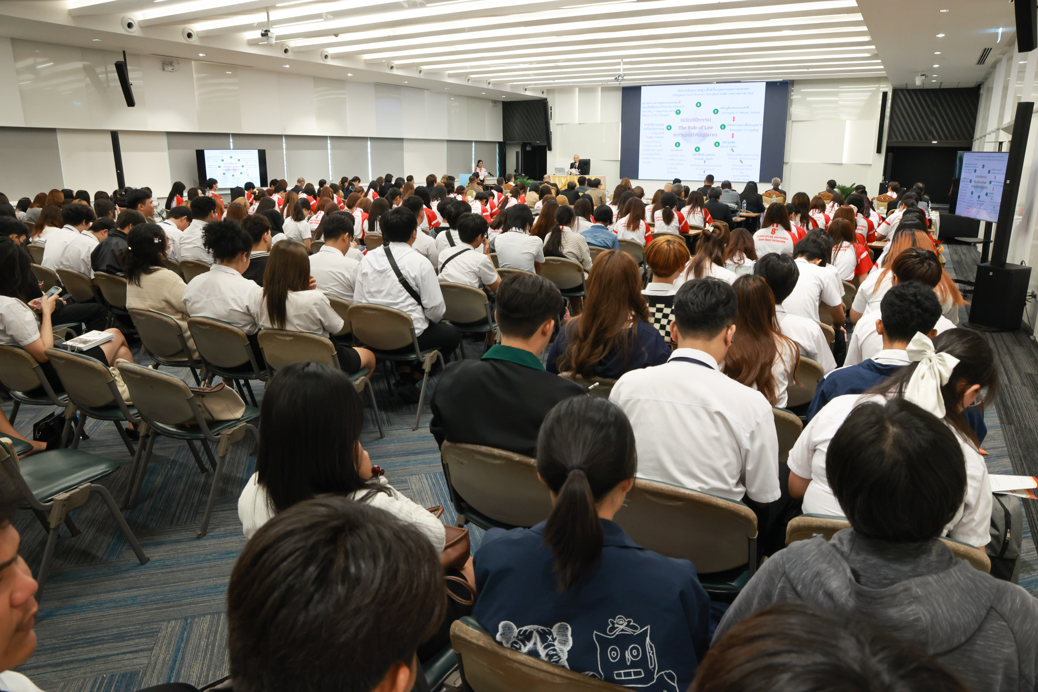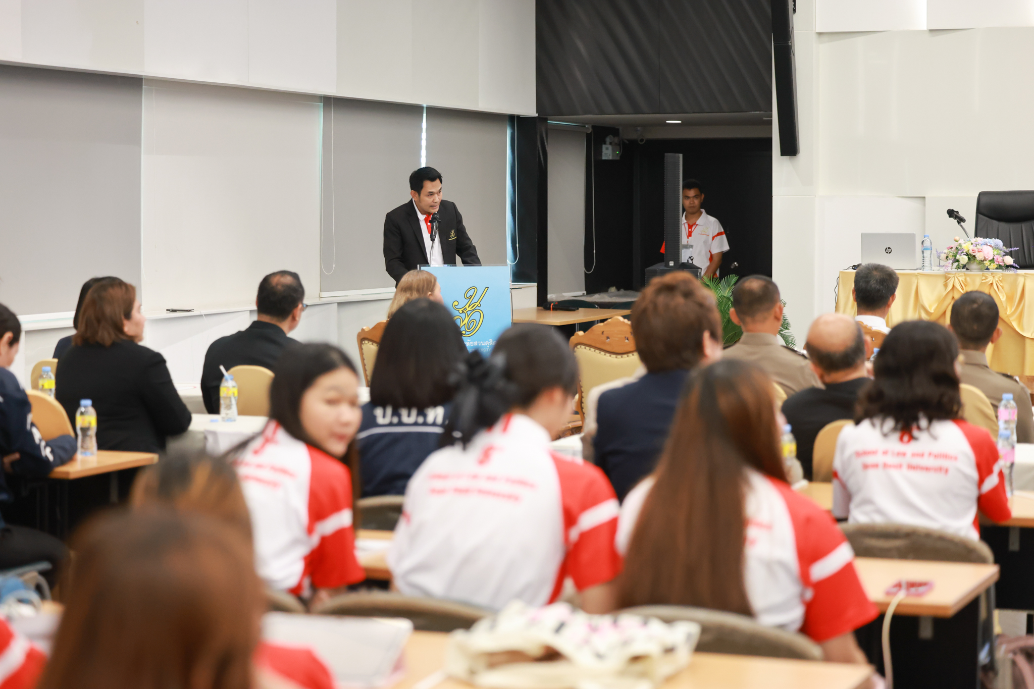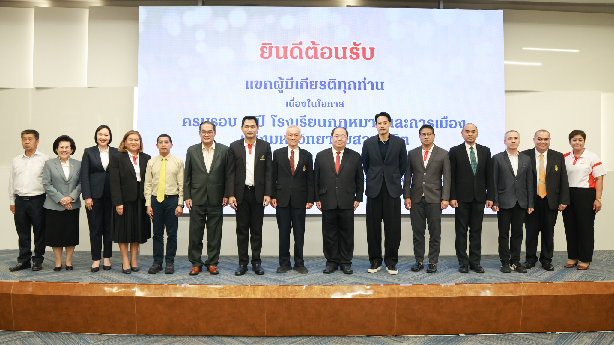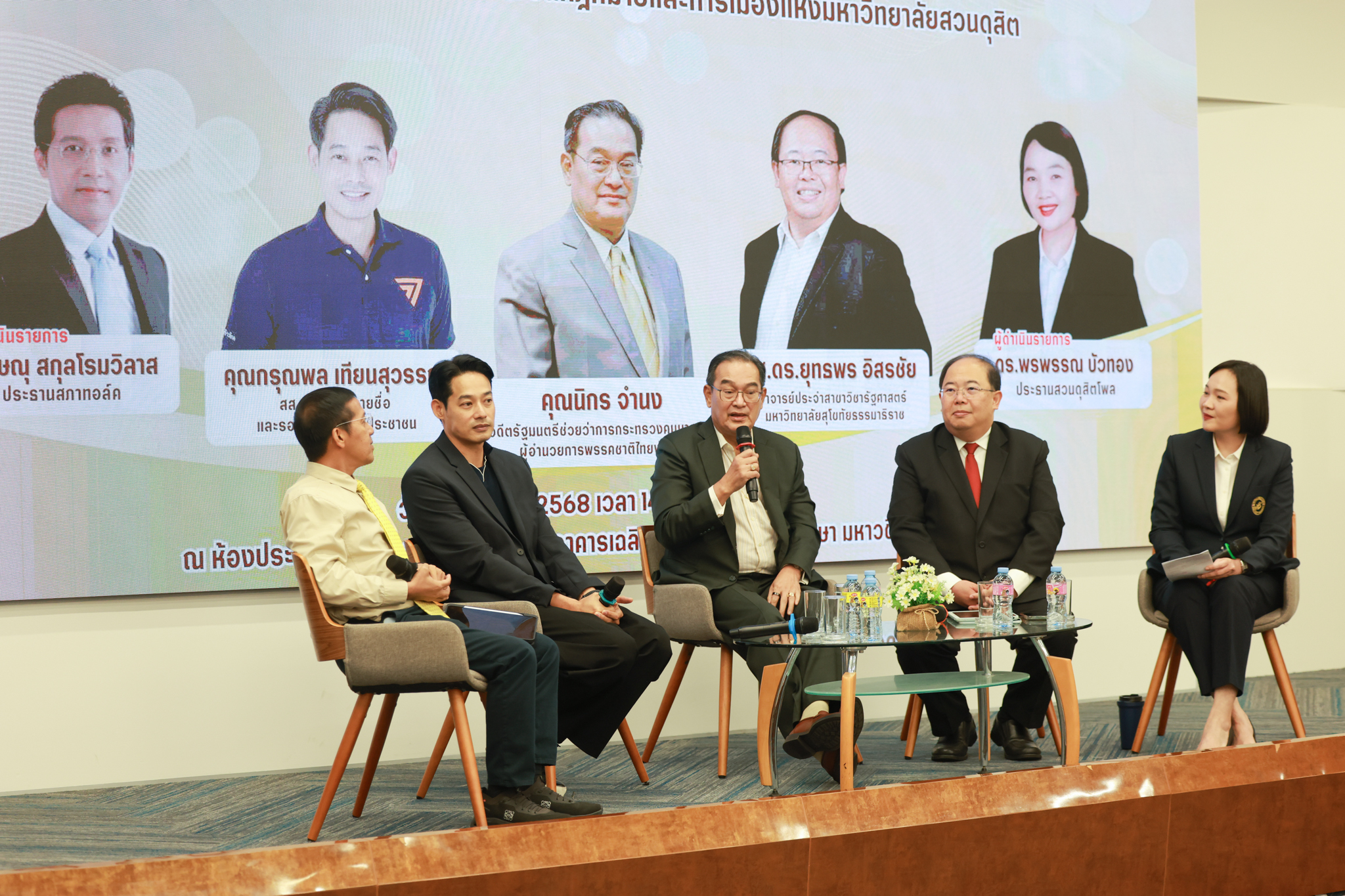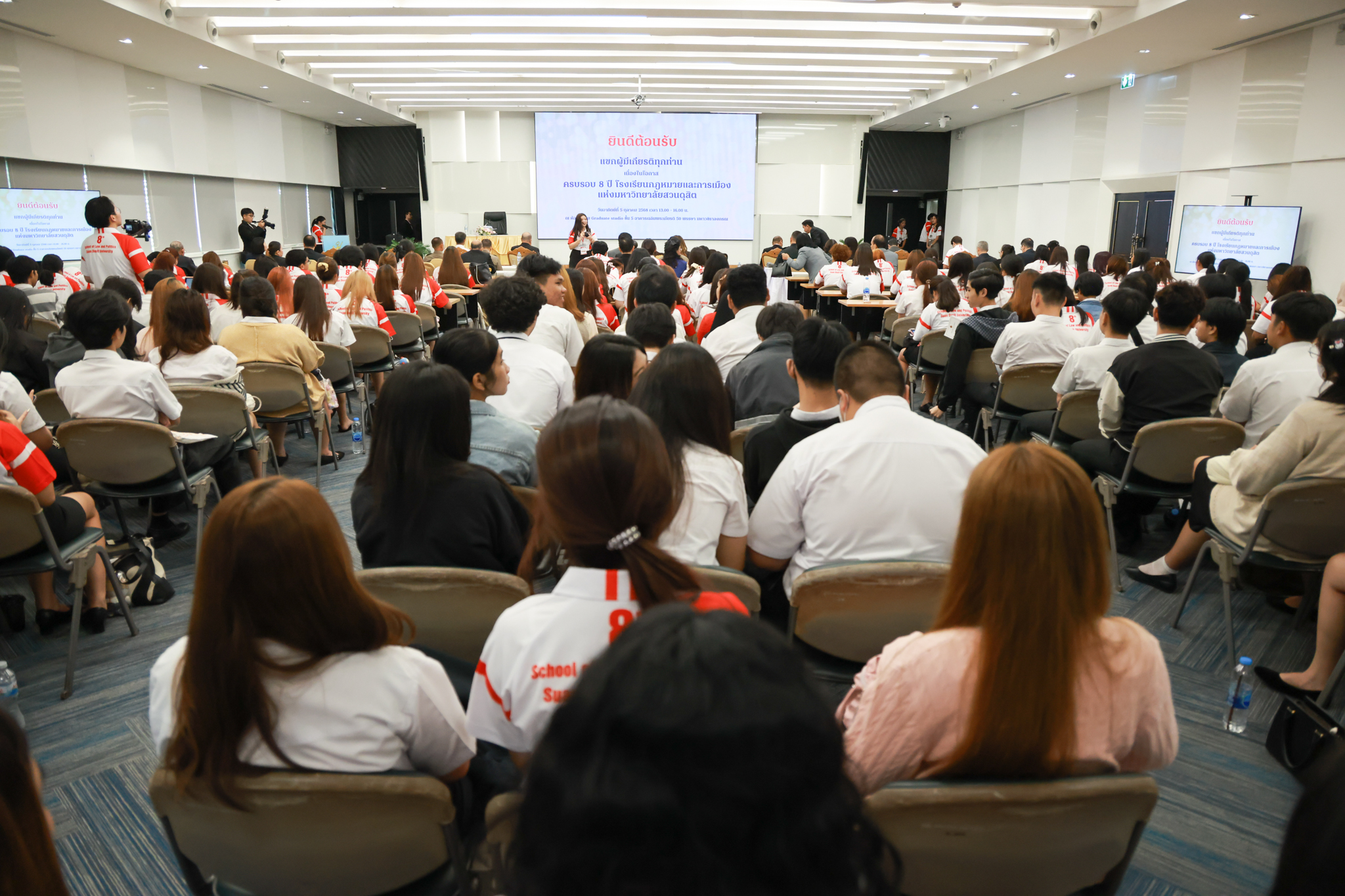 โรงเรียนกฎหมายและการเมือง จัดปาฐกถาพิเศษและเสวนาวิชาการ ในโอกาส ครบรอบ 8 ปี โรงเรียนกฎหมายและการเมือง : อัตลักษณ์ใหม่แห่งมหาวิทยาลัยสวนดุสิต โดย รศ.ดร.ธนภัทร ปัจฉิมม์ ประธานกรรมการดำเนินงาน กล่าวต้อนรับและวัตถุประสงค์การดำเนินงาน กิจกรรมในช่วงแรก ปาฐกถาพิเศษ ได้รับเกียรติจาก ศาสตราจารย์พิเศษ จรัญ ภักดีธนากุล อดีตตุลาการศาลรัฐธรรมนูญ/กรรมการกฤษฎีกา คณะที่ 11 ในหัวข้อ ภาวะผู้นำกับหลักนิติธธรม : เส้นทางยุติธรรมในสังคมไทย โดยความร่วมมือของ โรงเรียนกฎหมายและการเมือง ร่วมกับ สถาบันศิโรจน์ ผลพันธิน