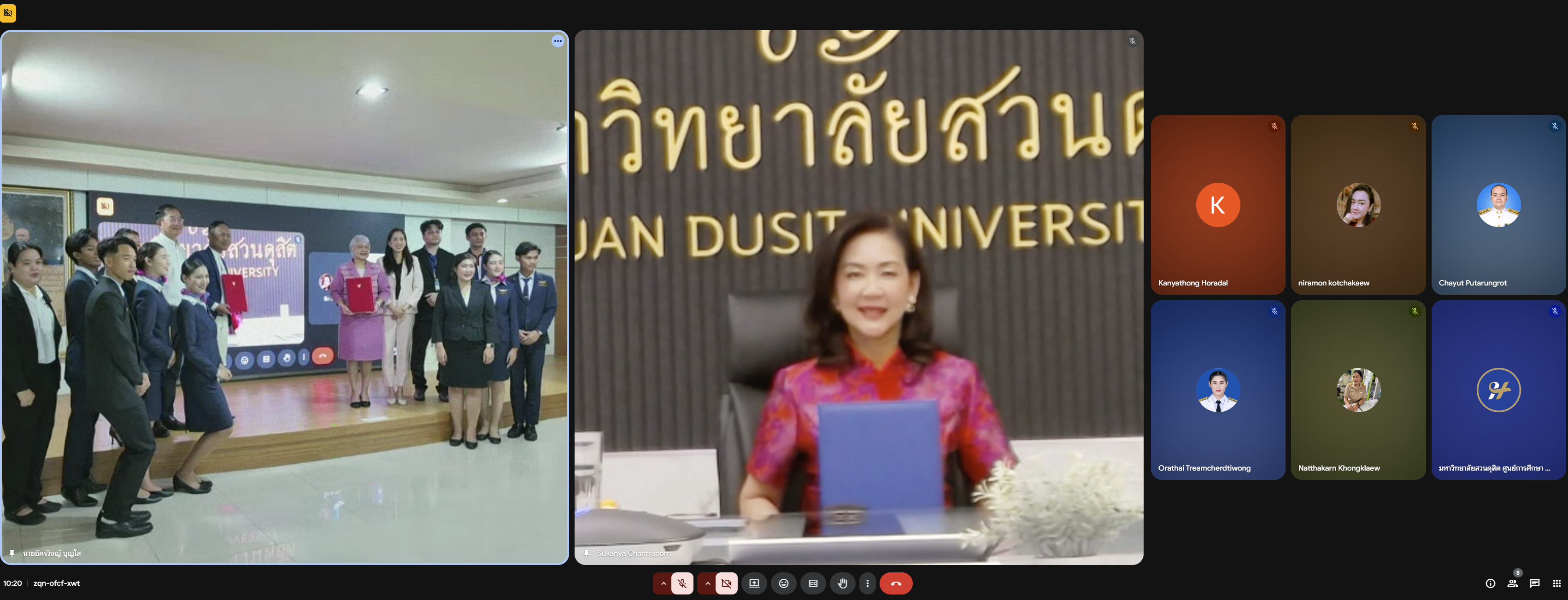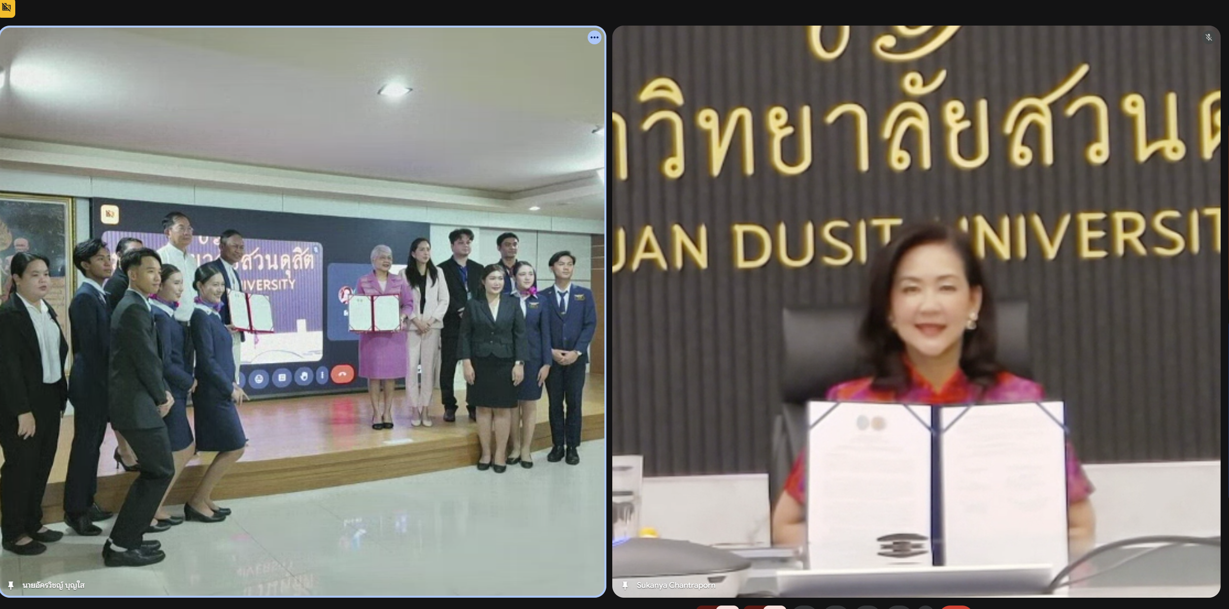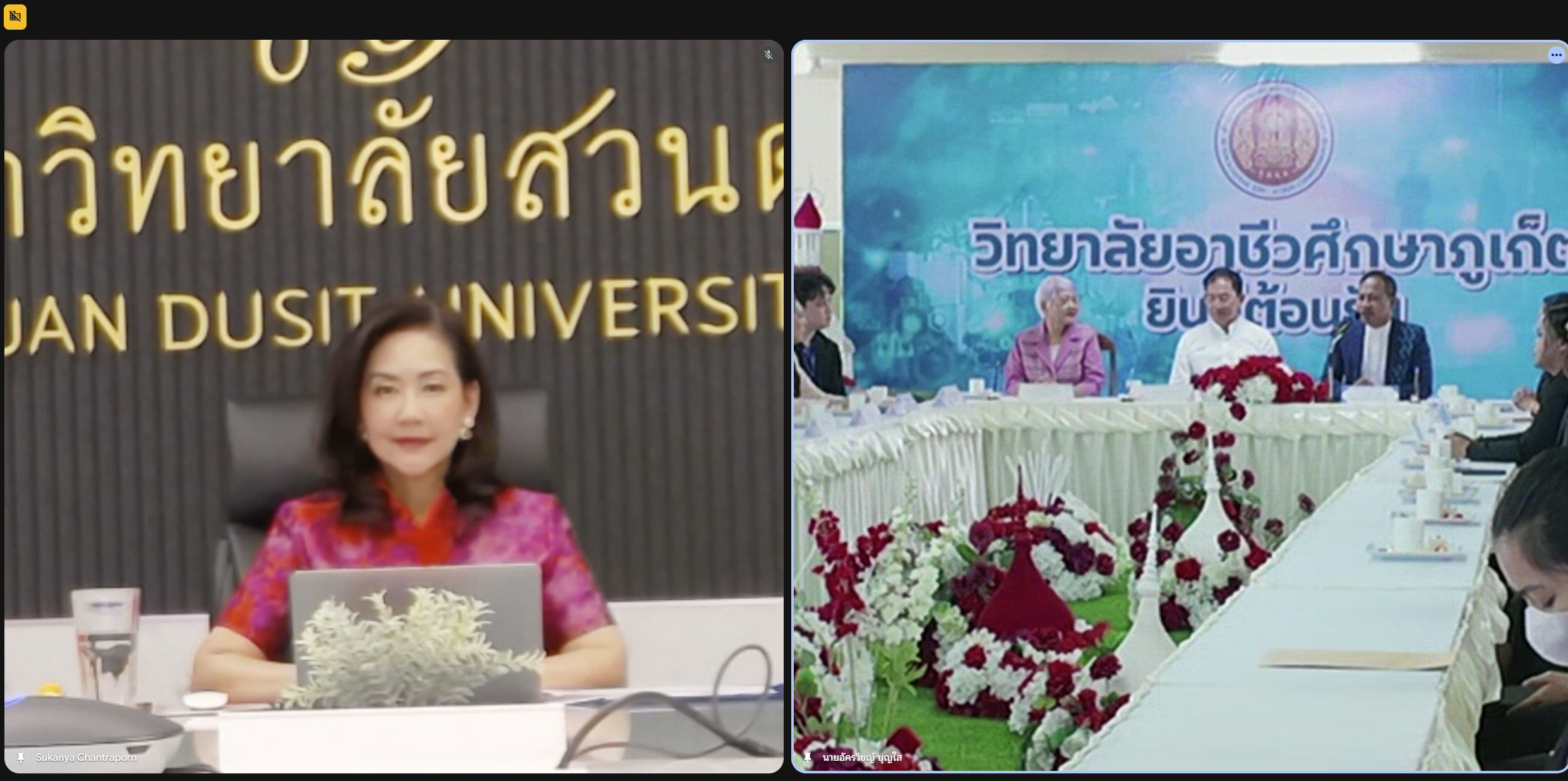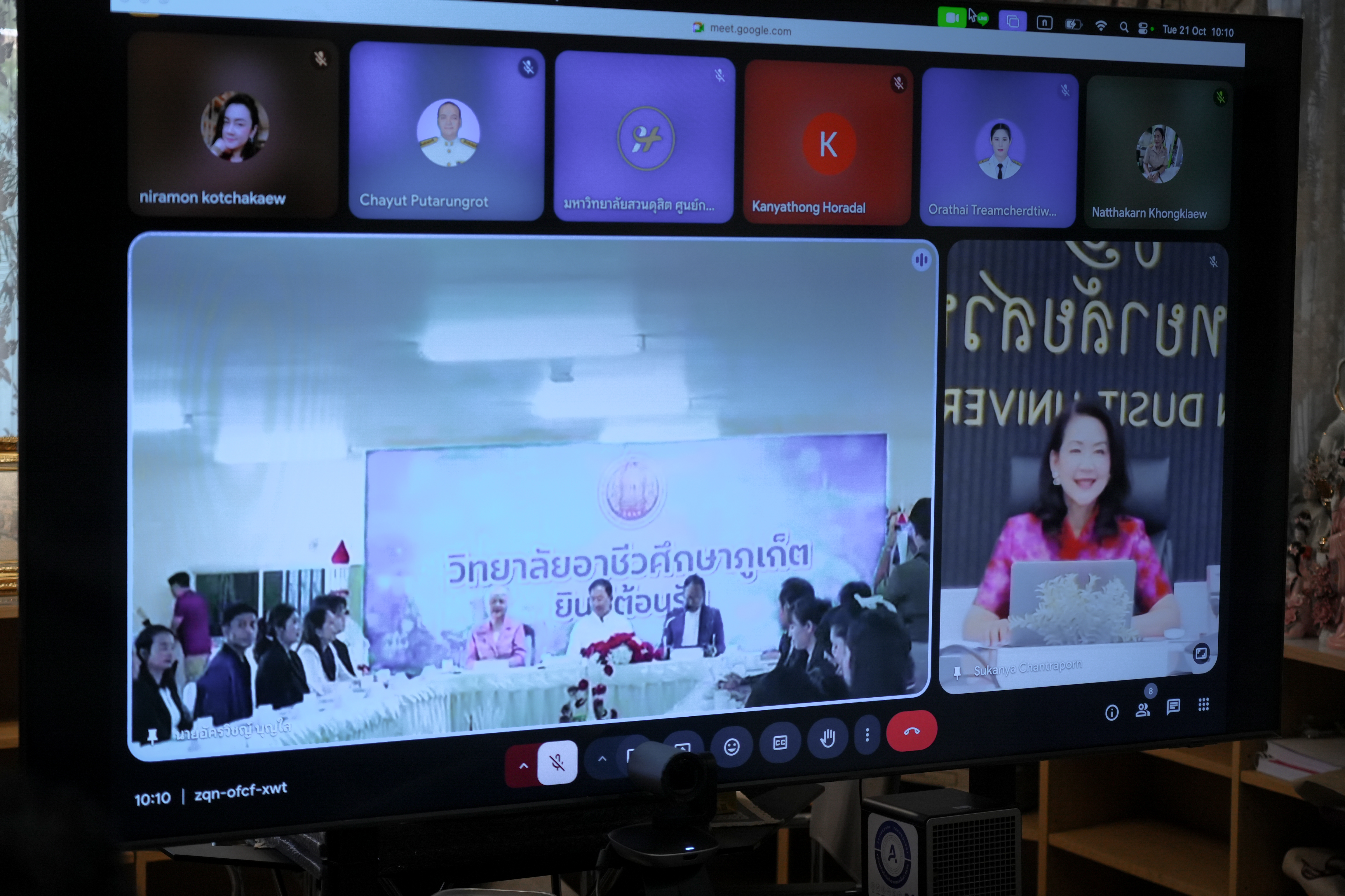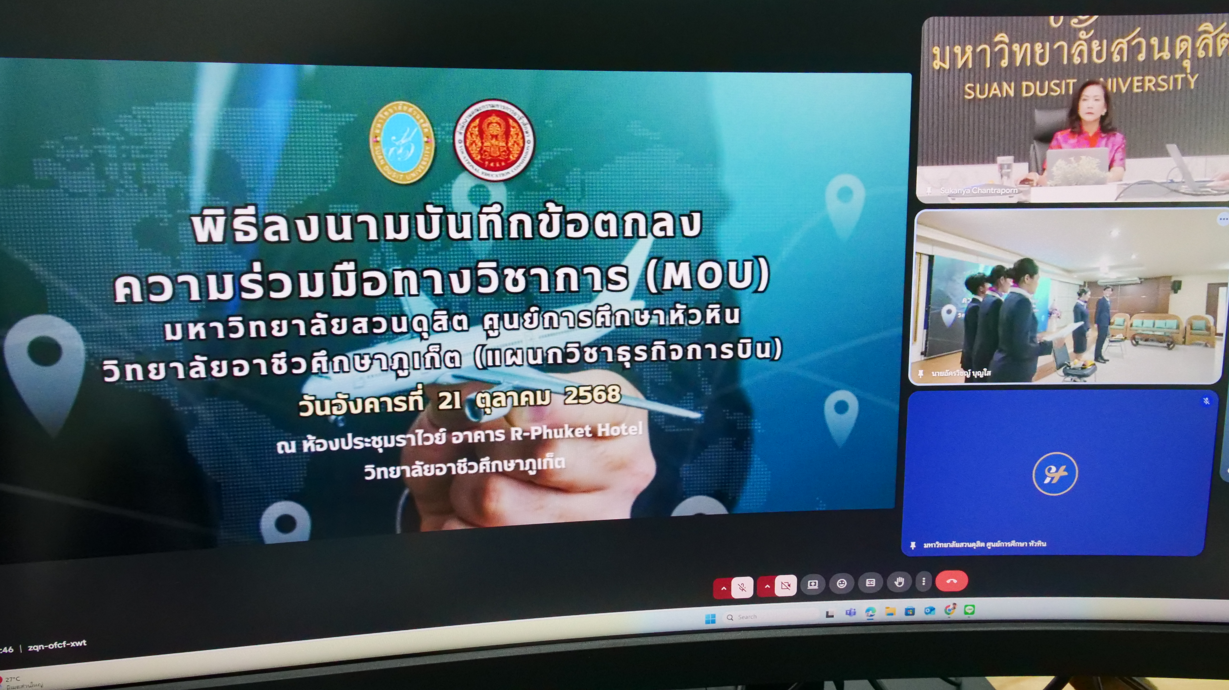 พิธีลงนามบันทึกข้อตกลงความร่วมมือทางวิชาการ (Memorandum of Understanding : MOU) ระหว่างมหาวิทยาลัยสวนดุสิต และ วิทยาลัยอาชีวศึกษาภูเก็ต โดยได้รับเกียรติจาก ผู้ช่วยศาสตราจารย์ ดร.พรชณิตว์ แก้วเนตร รองอธิการบดีฝ่ายวิชาการและกิจการต่างประเทศ มหาวิทยาลัยสวนดุสิต กล่าวเปิดงาน และร่วมลงนามบันทึกข้อตกลงความร่วมมือทางวิชาการ (MOU) พร้อมกับผู้บริหารและผู้แทนของสถาบันการศึกษา โดยมีผู้บริหาร คณาจารย์ บุคลากรและนักศึกษาทั้ง 2 สถาบันการศึกษาเข้าร่วมงานดังกล่าว ซึ่งจัดขึ้นเมื่อวันที่ 21 ตุลาคม 2568 เวลา 09.00-10.30 น. ณ ห้องประชุมราไวย์ อาชีวศึกษาภูเก็ต จังหวัดภูเก็ต และรูปแบบออนไลน์ผ่านระบบ Zoom