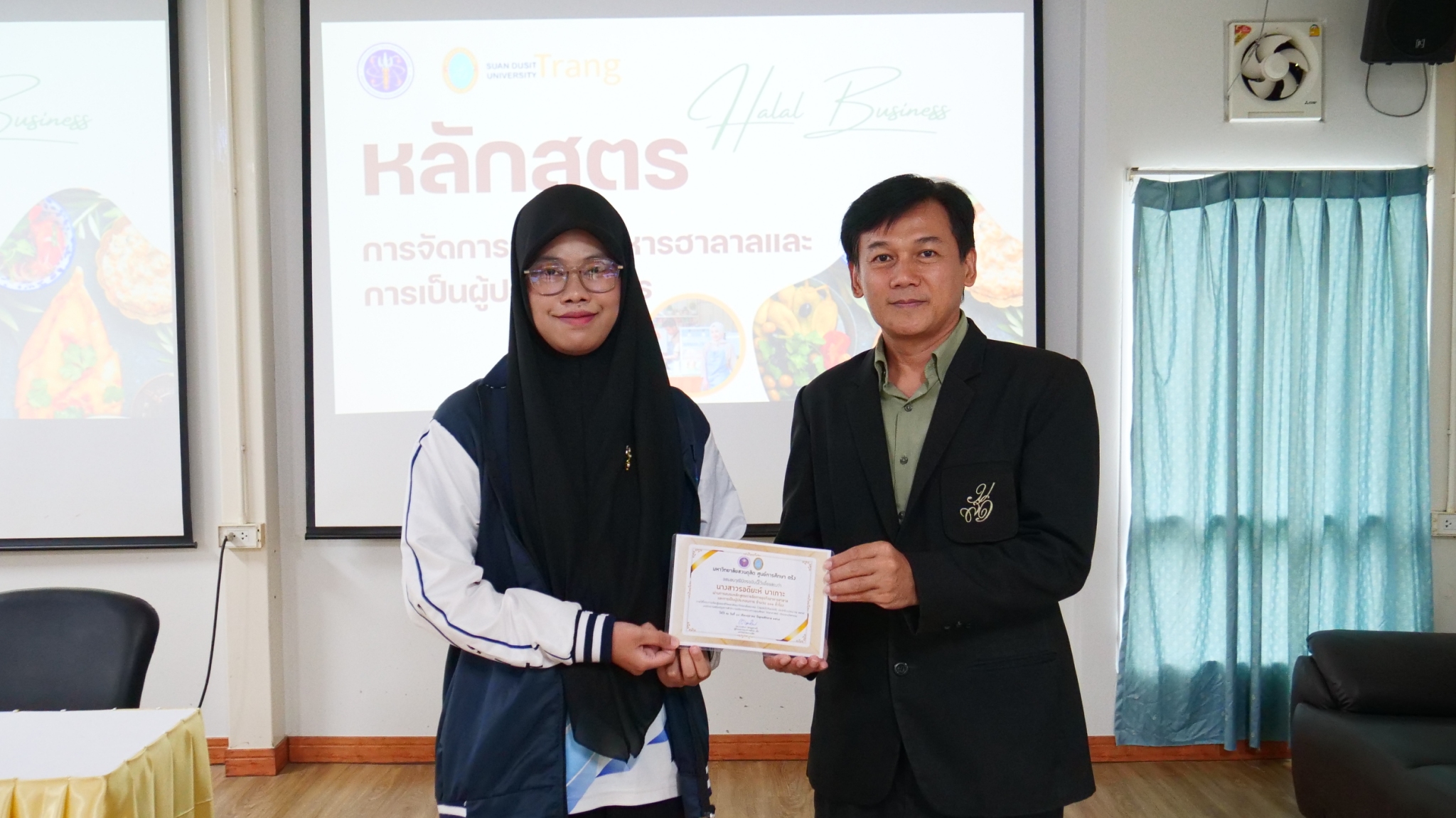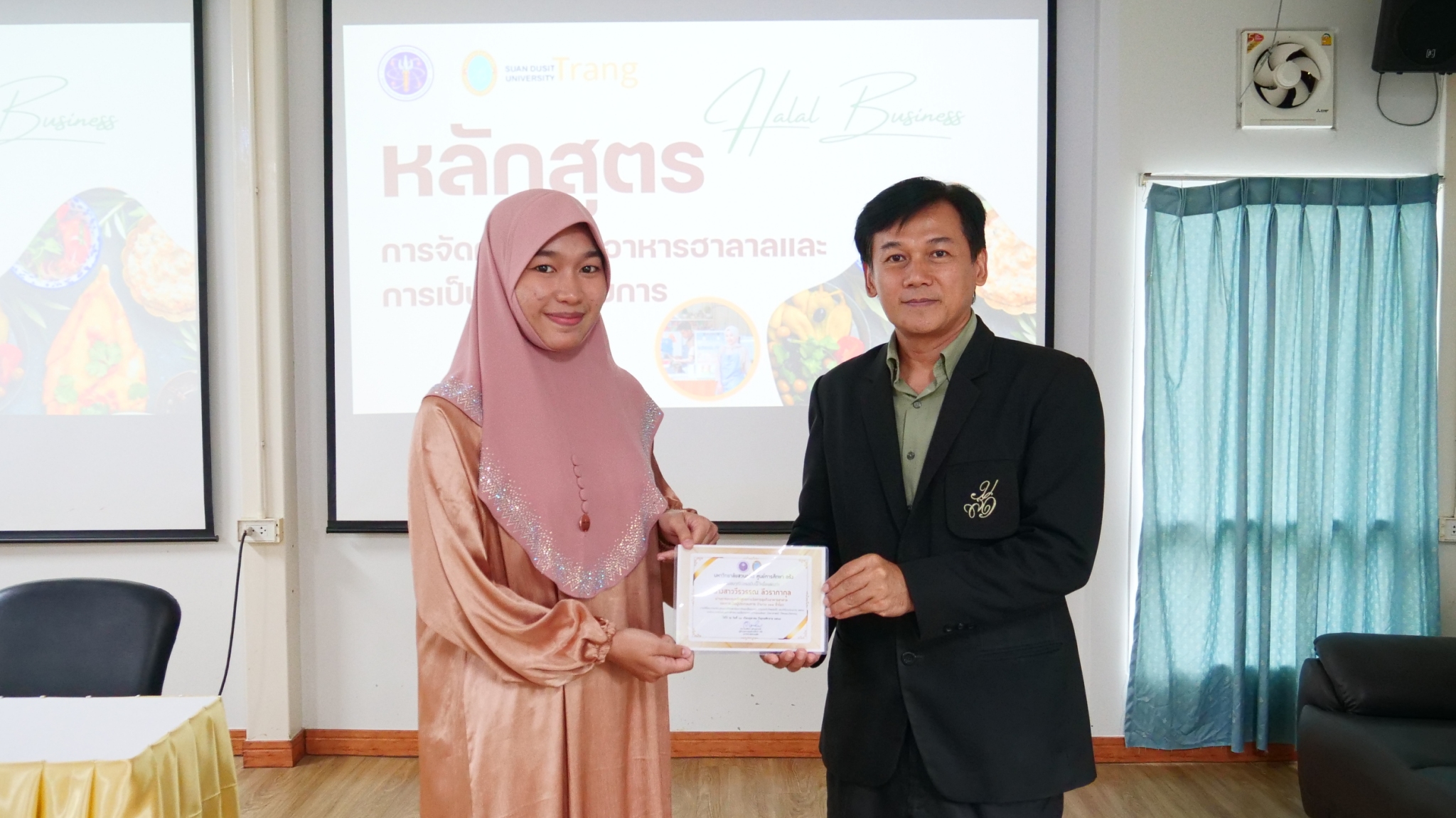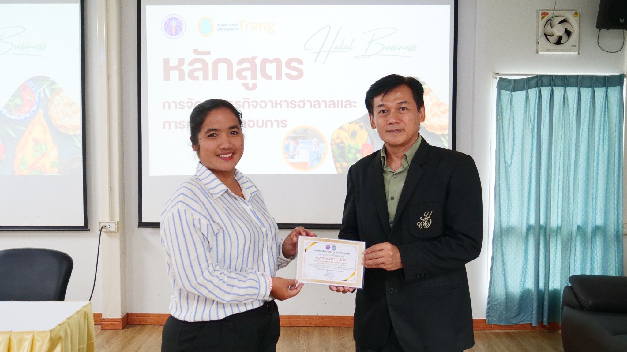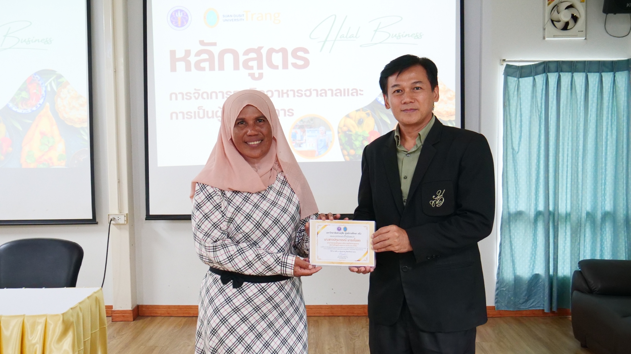มหาวิทยาลัยสวนดุสิต ศูนย์การศึกษา ตรัง จัดอบรมหลักสูตรการจัดการธุรกิจอาหารฮาลาล และการเป็นผู้ประกอบการ (ภาคปฏิบัติ 40 ชั่วโมง) ระหว่างวันที่ 6 – 10 ตุลาคม 2568 ที่ผ่านมา โดยเมื่อวันที่ 6 ตุลาคม 2568 ได้รับเกียรติจาก ดร.ทรงศักดา ชยานุเคราะห์ ผู้อำนวยการศูนย์การศึกษา ตรัง เป็นประธานในพิธีเปิดโครงการ และ ดร.นวลรัตน์ วัฒนา ผู้ช่วยผู้อำนวยการศูนย์การศึกษา ตรัง กล่าวต้อนรับผู้เข้าร่วมอบรม การจัดโครงการฯ มีวัตถุประสงค์ เพื่อพัฒนาศักยภาพบุคลากรของประเทศไทยให้มีคุณสมบัติตรงตามความต้องการของตลาดแรงงานในอุตสาหกรรมอาหารฮาลาล โดยกลุ่มเป้าหมาย จำนวน 50 คน ได้แก่ ผู้ประกอบการธุรกิจด้านอาหาร เช่น ธุรกิจร้านอาหารและเครื่องดื่ม ธุรกิจผลิตอาหาร นักศึกษา และประชาชนทั่วไปที่มีความสนใจ ทั้งนี้ ได้รับเกียรติอย่างสูงจากวิทยากรผู้เชี่ยวชาญทั้งภายในและภายนอกมหาวิทยาลัย และหน่วยงานความร่วมมือที่ให้ความอนุเคราะห์วิทยากร จากสำนักงานคณะกรรมการกลางอิสลามประจำจังหวัดตรัง และการศึกษาดูงานนอกสถานที่ ณ บริษัทผลิตภัณฑ์อาหารกว้างไพศาล จำกัด (มหาชน)