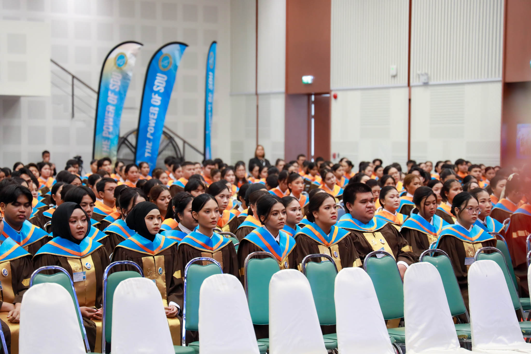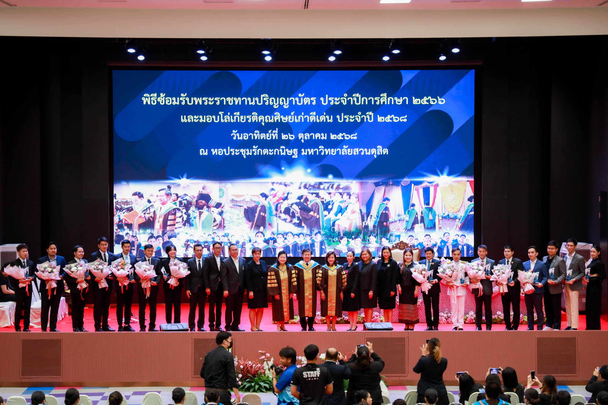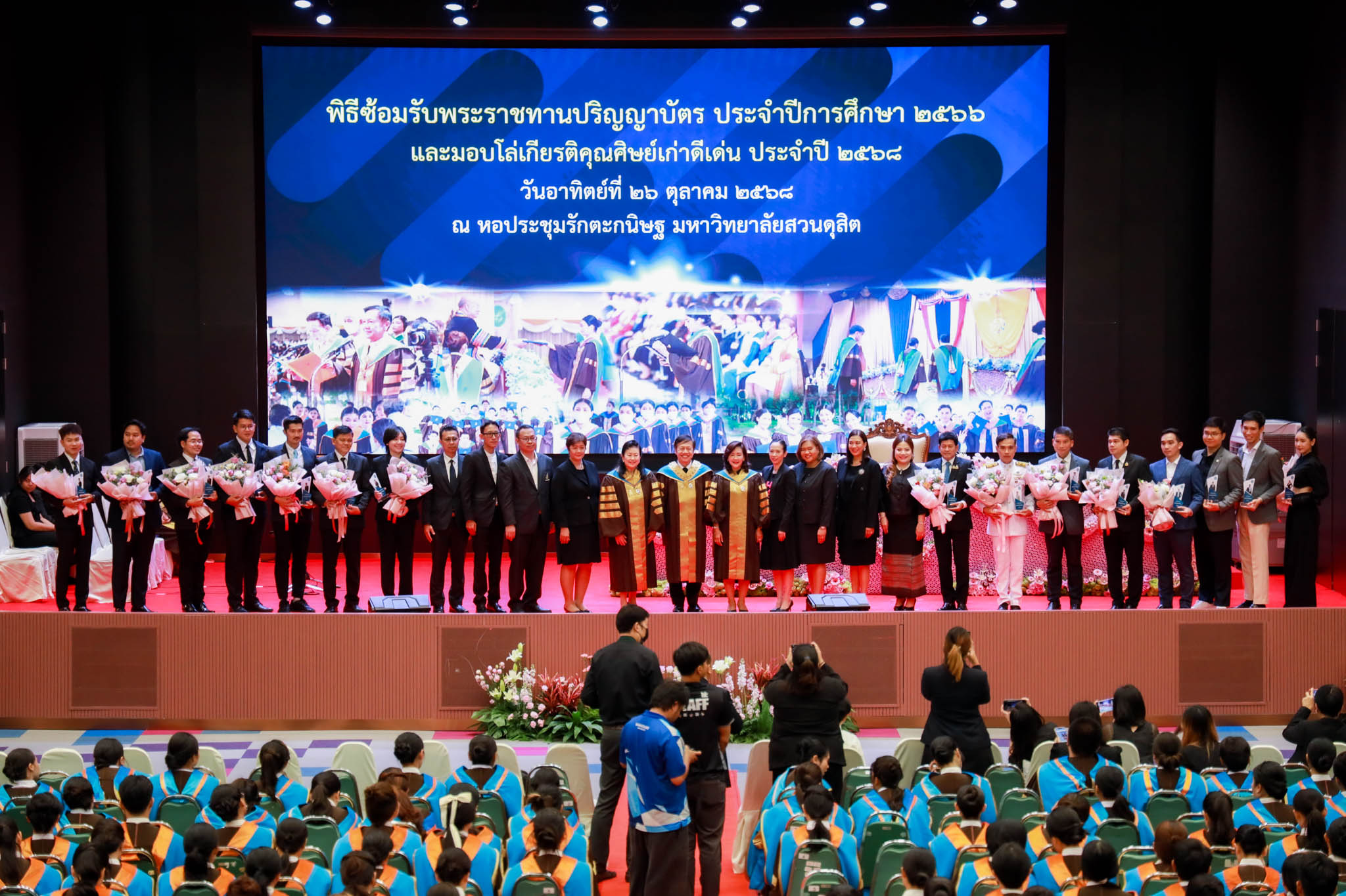 มหาวิทยาลัยสวนดุสิต จัดพิธีซ้อมใหญ่งานพิธีพระราชทานปริญญาบัตร ประจำปีการศึกษา 2566 และมอบโล่เกียรติคุณศิษย์เก่าดีเด่น ประจำปี 2568 โดยก่อนเริ่มพิธีการฝึกซ้อมผู้บริหาร คณาจารย์ บุคลากร นักศึกษา และบัณฑิตมหาวิทยาลัยสวนดุสิต ร่วมยืนสงบนิ่งเพื่อไว้อาลัย แด่สมเด็จพระนางเจ้าสิริกิติ์ พระบรมราชินีนาถ พระบรมราชชนนีพันปีหลวง จากนั้น โดยได้รับเกียรติจาก ผศ.ดร.พิทักษ์ จันทร์เจริญ อธิการบดีมหาวิทยาลัยสวนดุสิต กล่าวแสดงความยินดี และให้โอวาทแก่บัณฑิตมหาวิทยาลัยสวนดุสิต ในโอกาสที่สำเร็จการศึกษาและจะเข้ารับพระราชทานปริญญาบัตร ในวันศุกร์ที่ 31 ตุลาคม 2568 พร้อมกล่าวแสดงยินดีและมอบโล่เกียรติคุณศิษย์เก่าดีเด่น ประจำปี 2568 โดยจัดขึ้น ณ หอประชุมรักตะกนิษฐ มหาวิทยาลัยสวนดุสิต วันอาทิตย์ที่ 26 ตุลาคม 2568