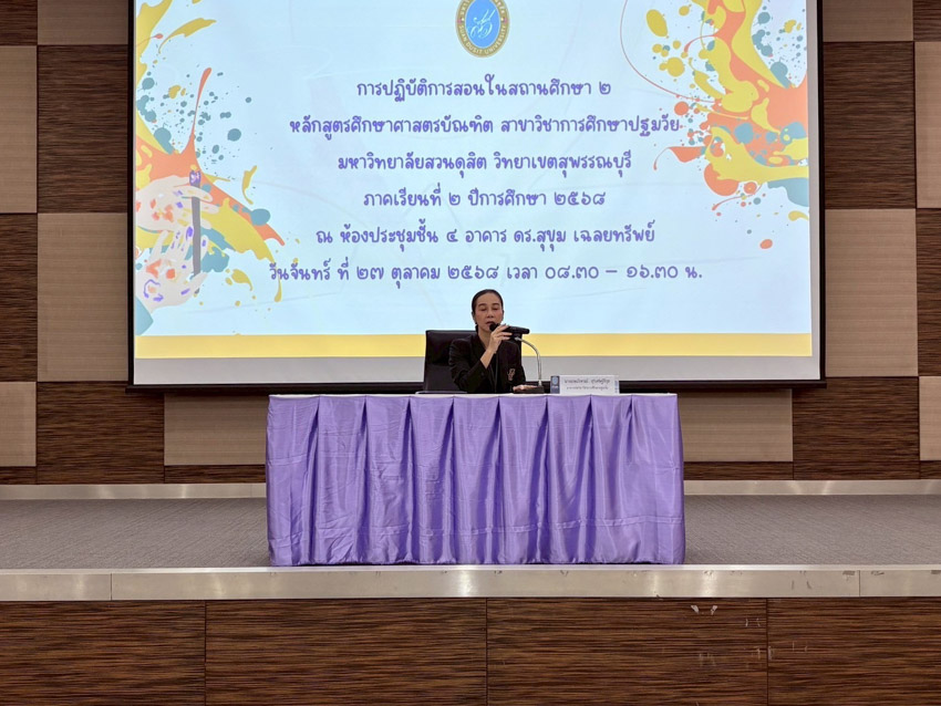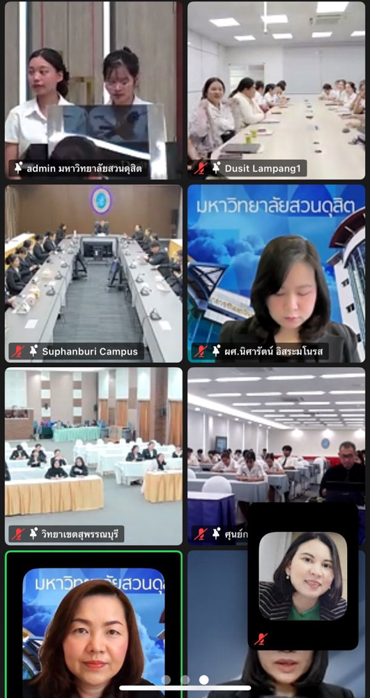หลักสูตรศึกษาศาสตรบัณฑิต สาขาวิชาการศึกษาปฐมวัย คณะครุศาสตร์ มหาวิทยาลัยสวนดุสิต วิทยาเขตสุพรรณบุรี นำโดย อาจารย์ เกษม์รดาฌ์ สุรเศษฐ์ธิกุล อาจารย์ผู้ประสานงานหลักสูตร นำคณาจารย์และนักศึกษาฯ เข้าร่วมกิจกรรม การปฏิบัติการสอนในสถานศึกษา 2 ภาคเรียนที่ 2/2568 จัดโดยคณะครุศาสตร์ มหาวิทยาลัยสวนดุสิต เเละได้รับเกียรติจาก ผู้ช่วยศาสตราจารย์ ดร.วีนัฐ สกุลหอม คณบดีคณะครุศาสตร์ มอบนโยบาย แนวทางการปฏิบัติงานและการพัฒนาตนเองในวิชาชีพครูปฐมวัยแก่นักศึกษา โดยวิทยาเขตสุพรรณบุรี เข้าร่วมกิจกรรมผ่านระบบออนไลน์ โปรแกรม Zoom Meeting ณ ห้องประชุม ชั้น 4 อาคาร ดร.สุขุม เฉลยทรัพย์ มหาวิทยาลัยสวนดุสิต วิทยาเขตสุพรรณบุรี