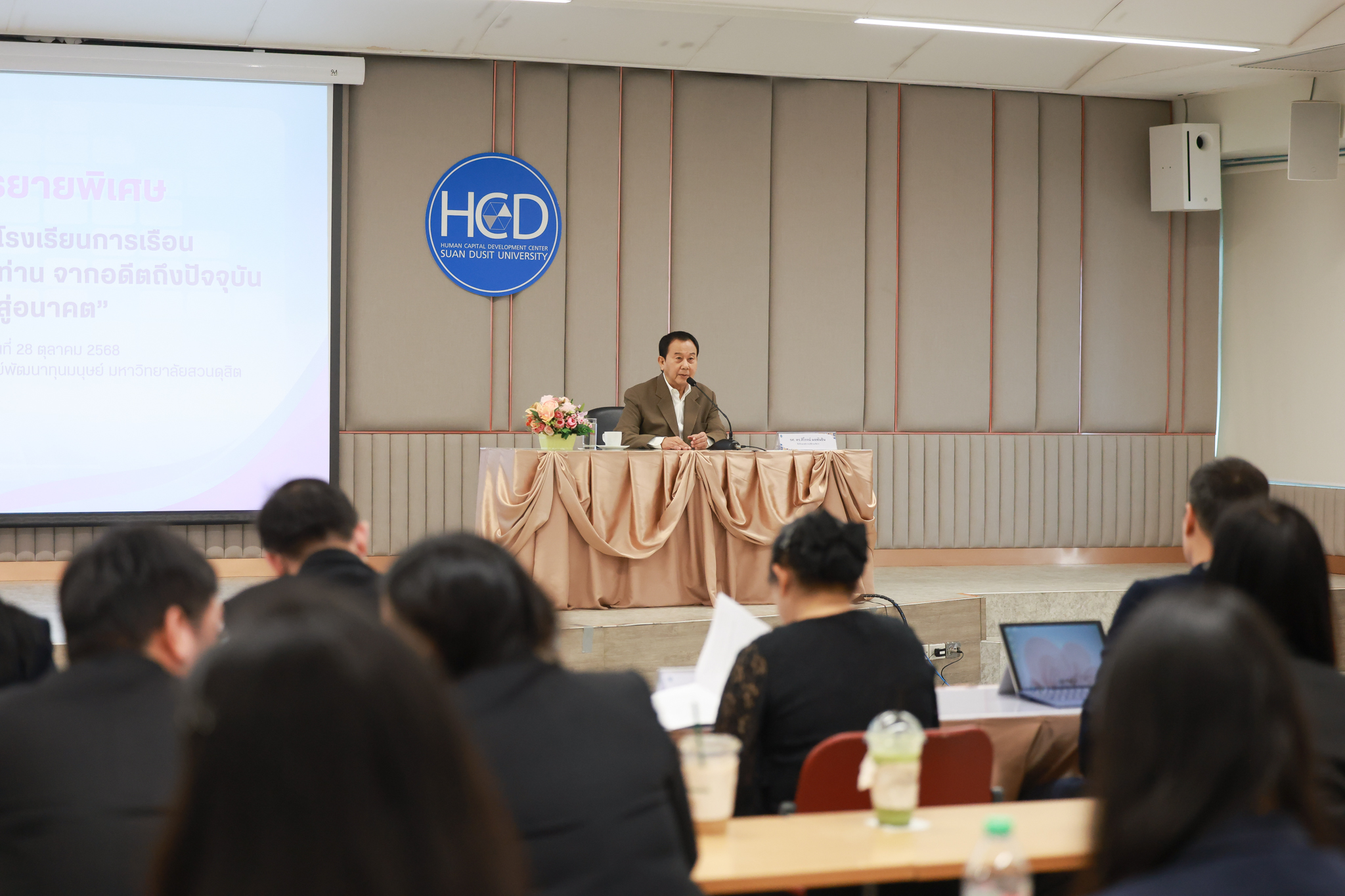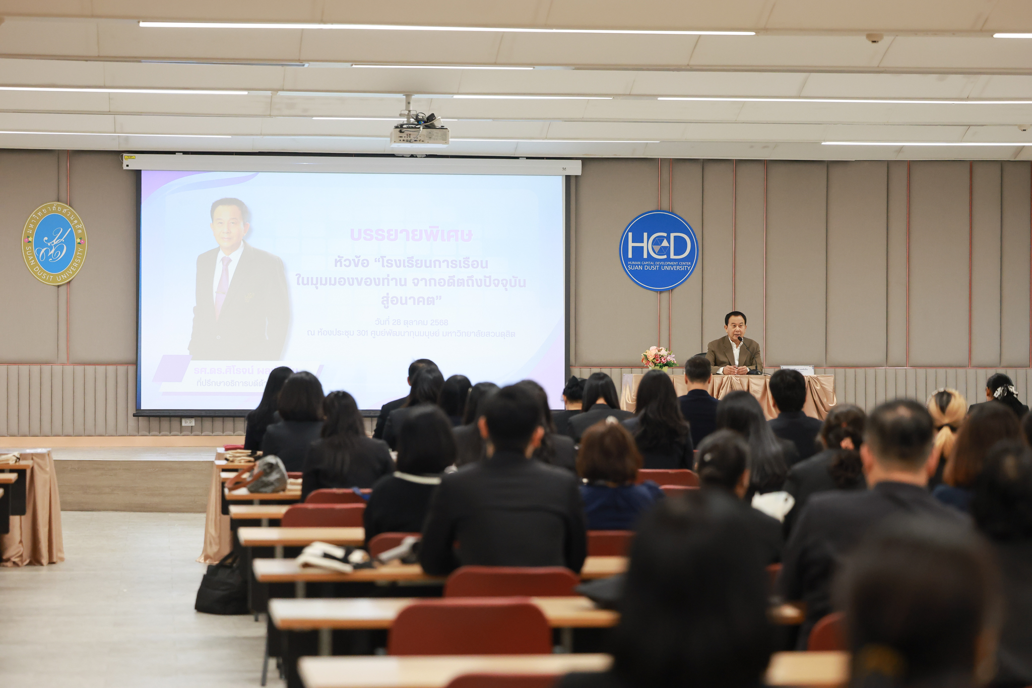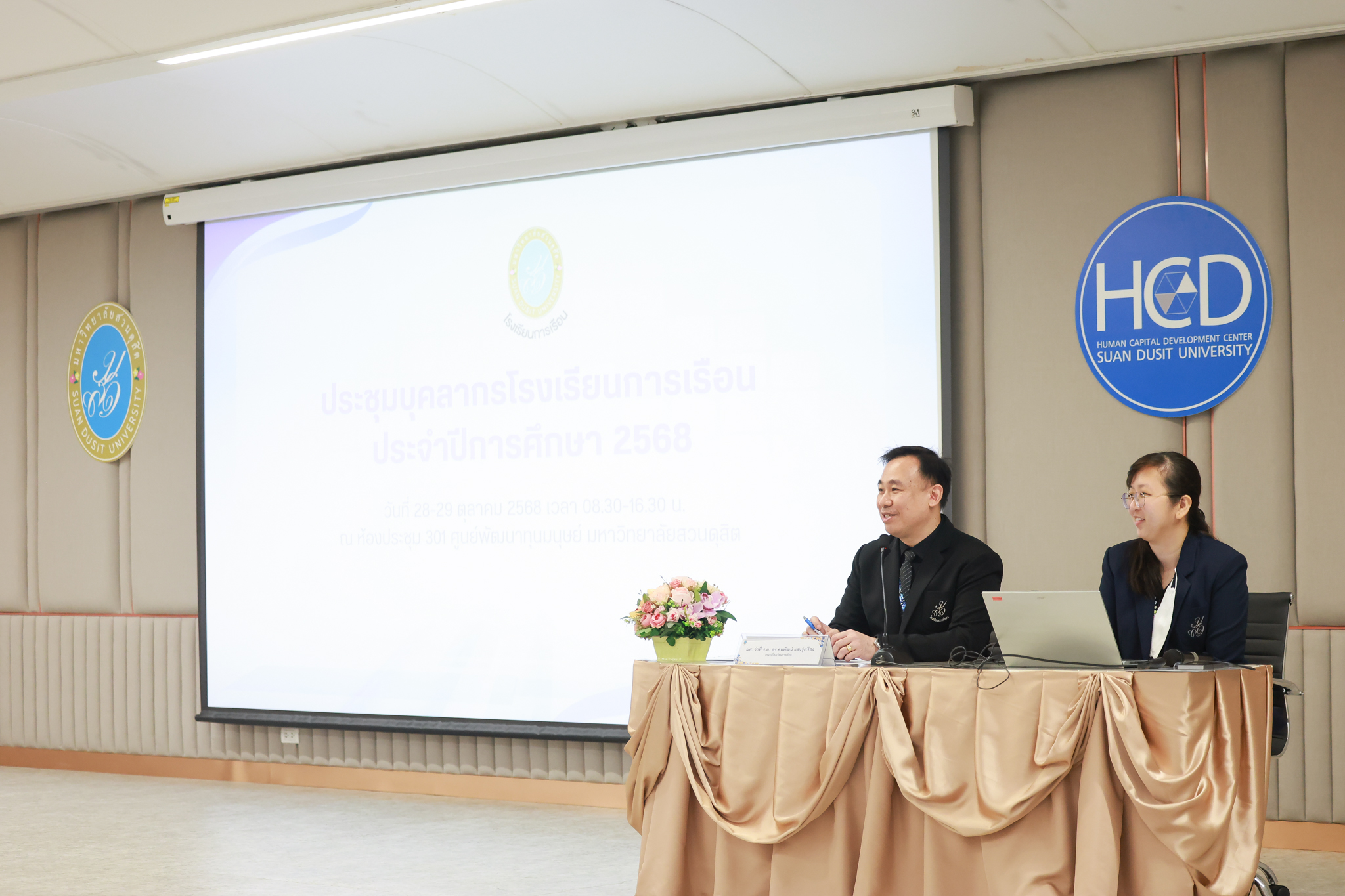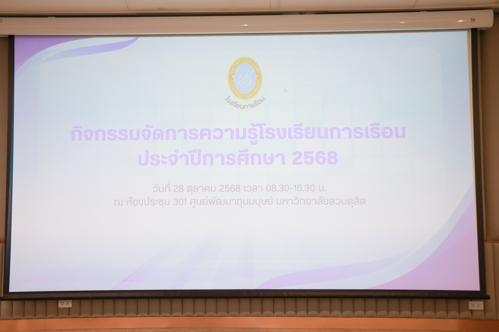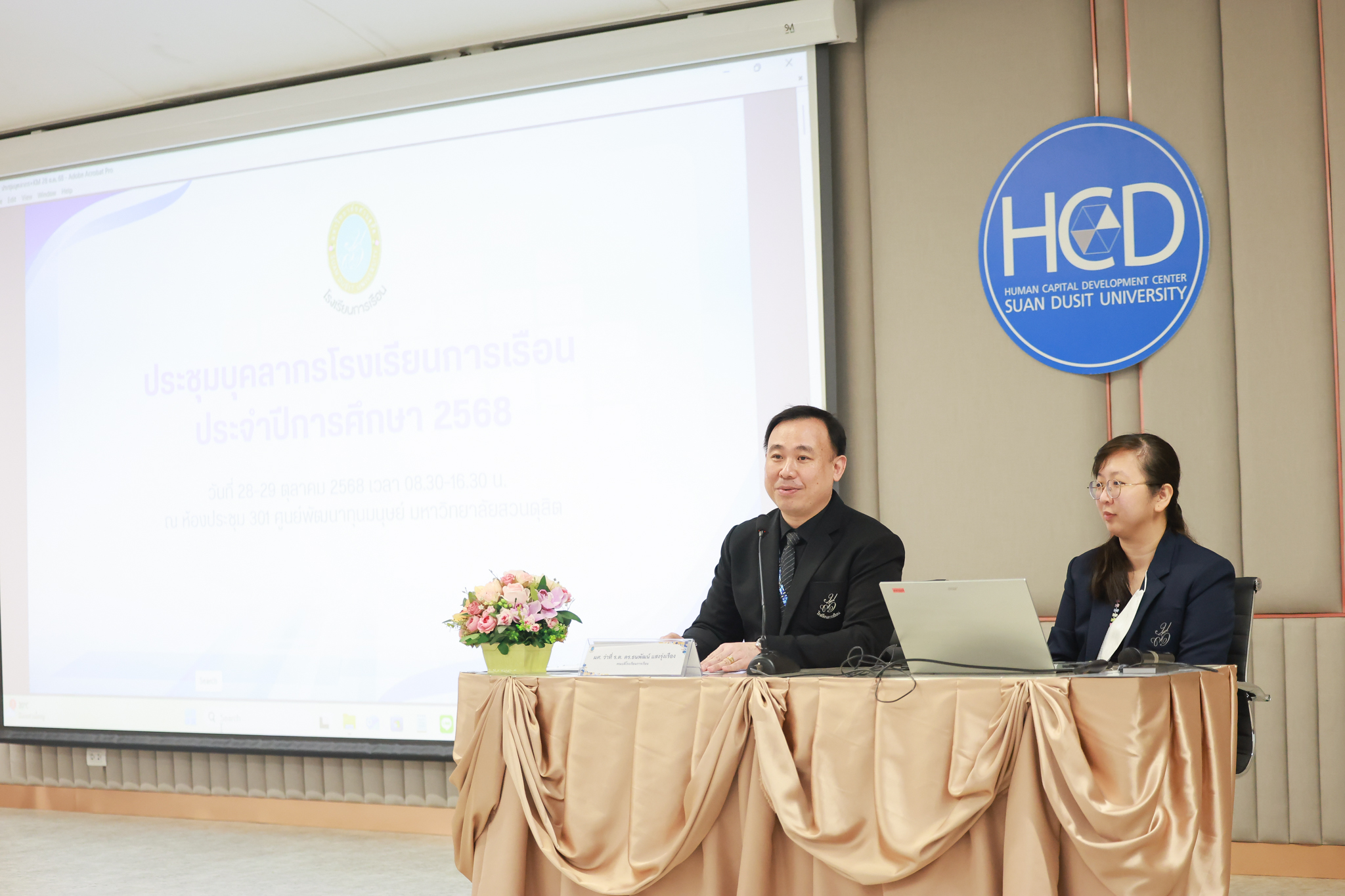 โรงเรียนการเรือน มหาวิทยาลัยสวนดุสิต จัดประชุมและกิจกรรมจัดการความรู้โรงเรียนการเรือน ประจำปีการศึกษา 2568 บุคลากรสายวิชาการและสายสนับสนุน โดยได้รับเกียรติจาก รศ.ดร.ศิโรจน์ ผลพันธิน ที่ปรึกษาอธิการบดีด้านบริหาร บรรยายพิเศษหัวข้อ โรงเรียนการเรือน ในมุมมองจากอดีตถึงปัจจุบัน สู่อนาคต กล่าววัตุประสงค์การจัดกิจกรรมและนำประชุมบุคลากรโรงเรียนการเรือนโดย ผศ.ว่าที่ ร.ต. ดร.ธนพัฒน์ แสงรุ่งเรือง คณบดีโรงเรียนการเรือน และทีมผู้บริหาร กิจกรรม KM ด้านการจัดการเรียนการสอน โดยประธานหลักสูตร และตัวแทนคณาจารย์ การบรรยายหัวข้อ “การดำรงตนในฐานะอาจารย์ที่ดี”โดย ผศ.ดร.นฤมล นันทรักษ์ ที่ปรึกษาโรงเรียนการเรือน และ บรรยาย “หลักสูตรกับ OBE และ AUN OA” และกิจกรรมแลกเปลี่ยนเรียนรู้ โดย อาจารย์ธิติมา แก้วมณี รองคณบดีโรงเรียนการเรือน ฝ่ายวิชาการและการวางแผน และ ผศ.ดร.สุภาภรณ์ ตั้งดำเนินสวัสดิ์ อาจารย์ประจำบัณฑิตวิทยาลัย เมื่อวันที่ 28 ตุลาคม 2568 ณ ห้องประชุม 301 ศูนย์พัฒนาทุนมนุษย์ มหาวิทยาลัยสวนดุสิต