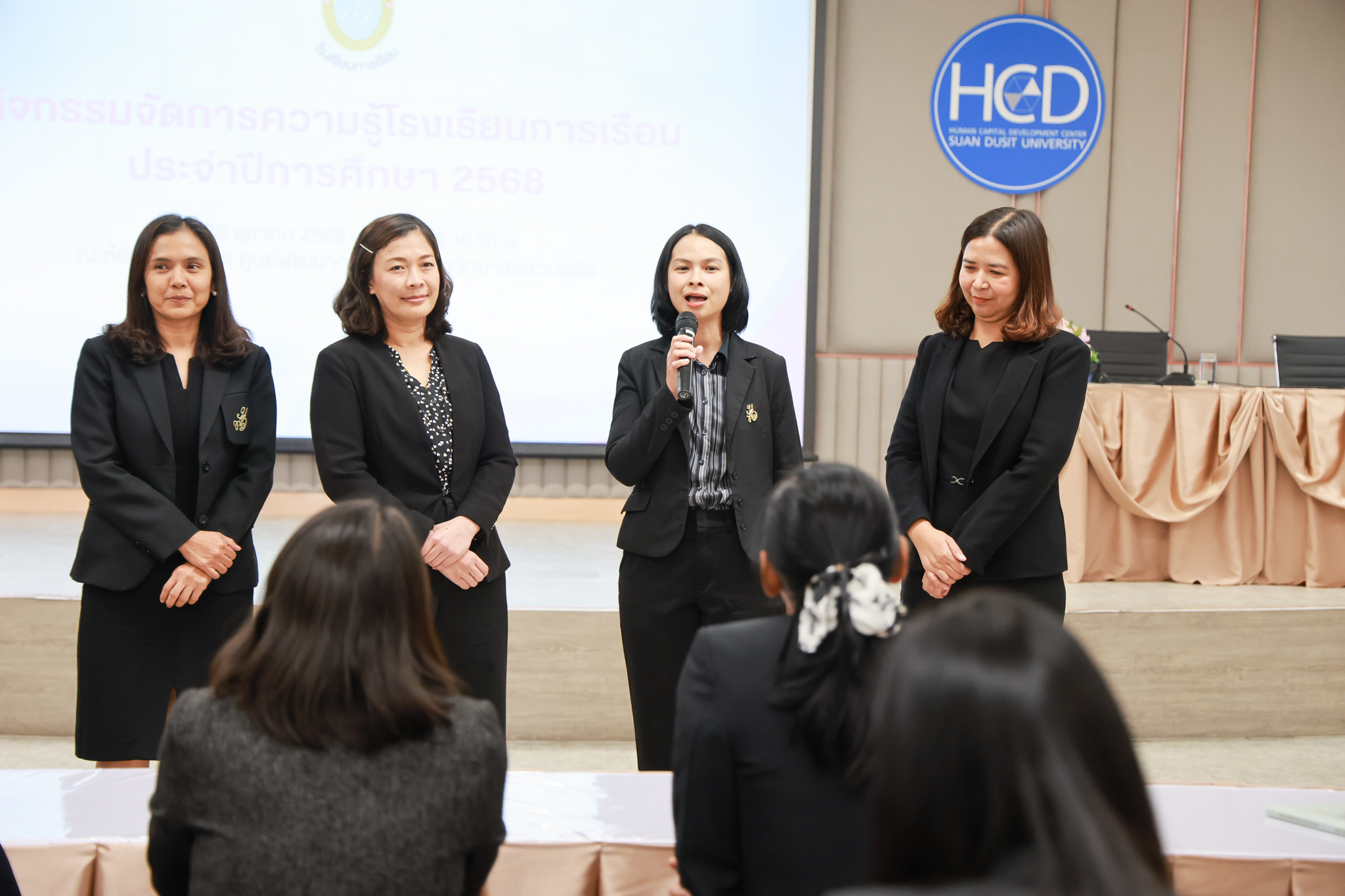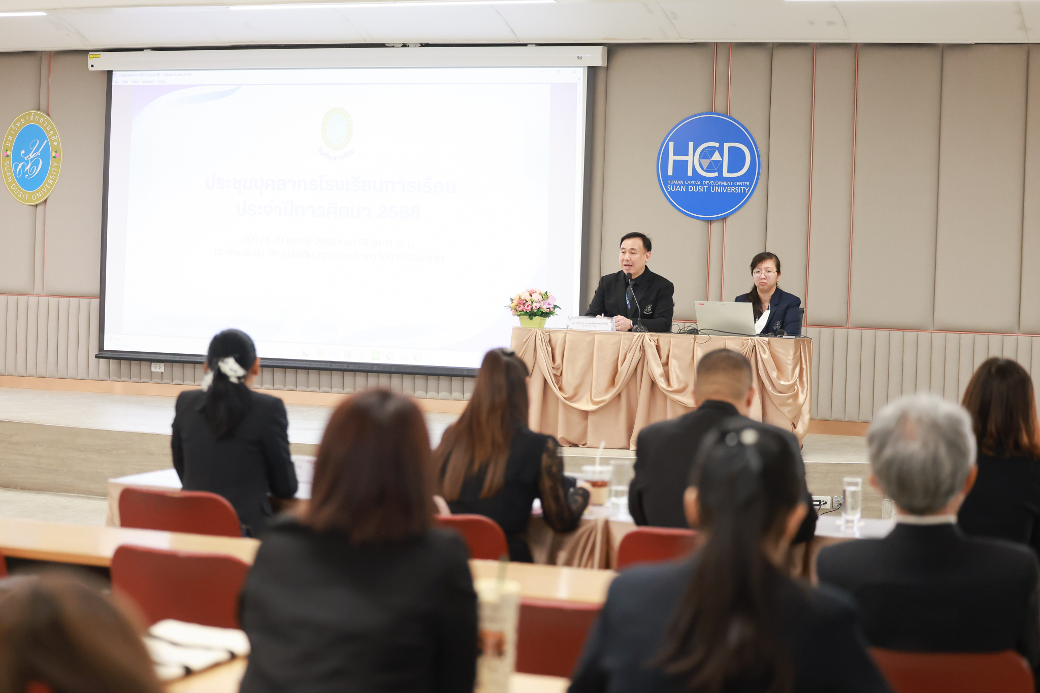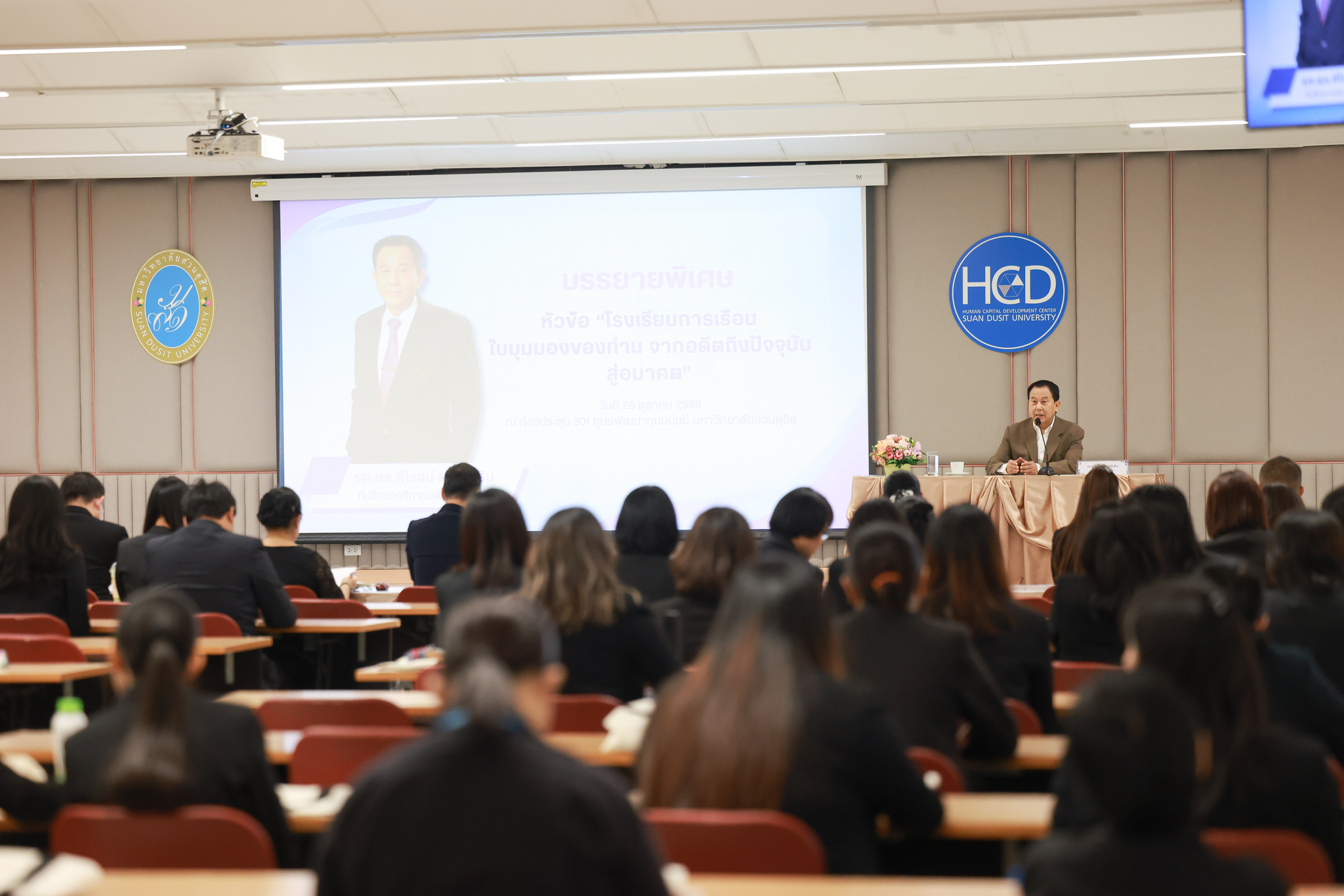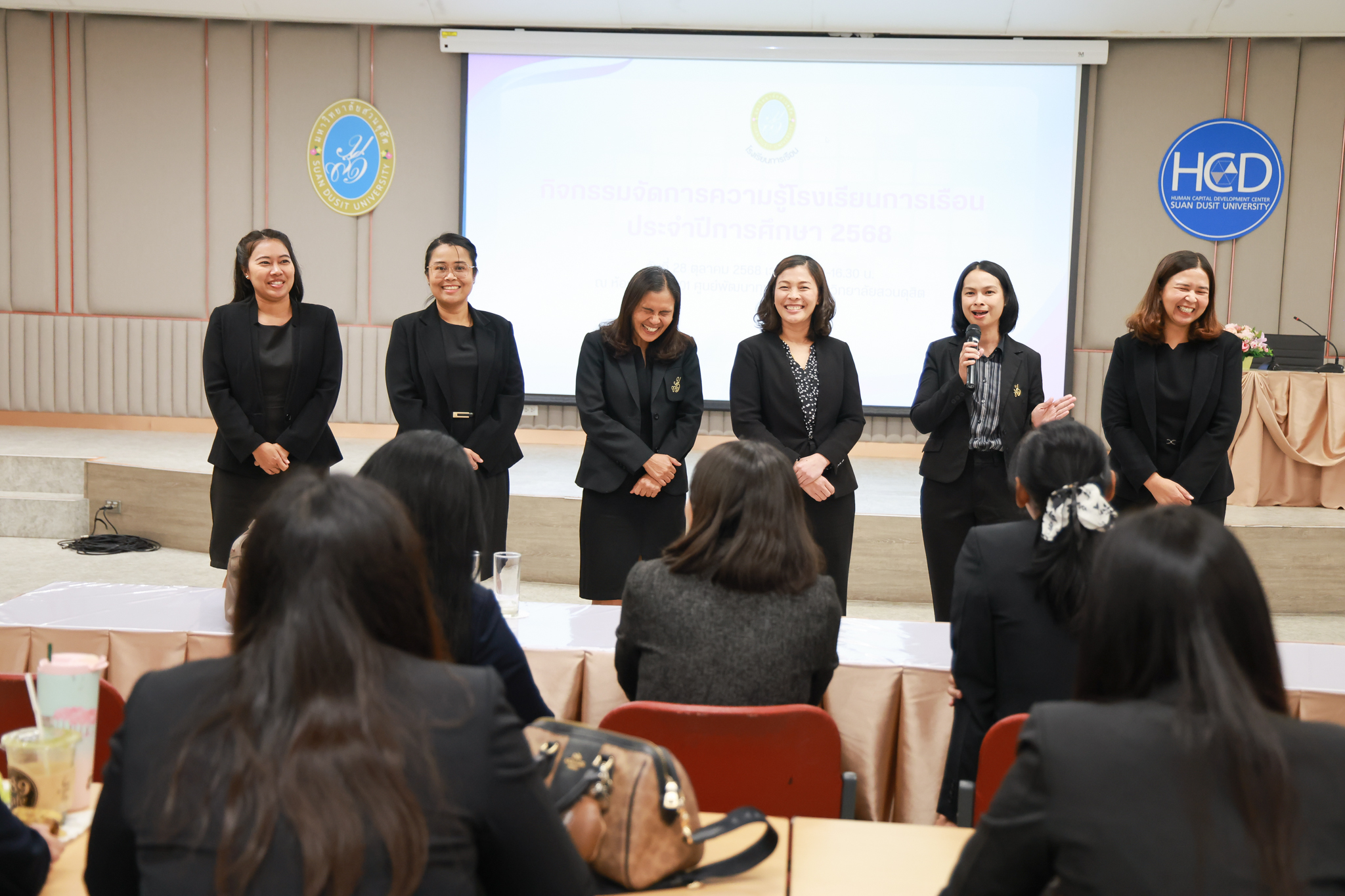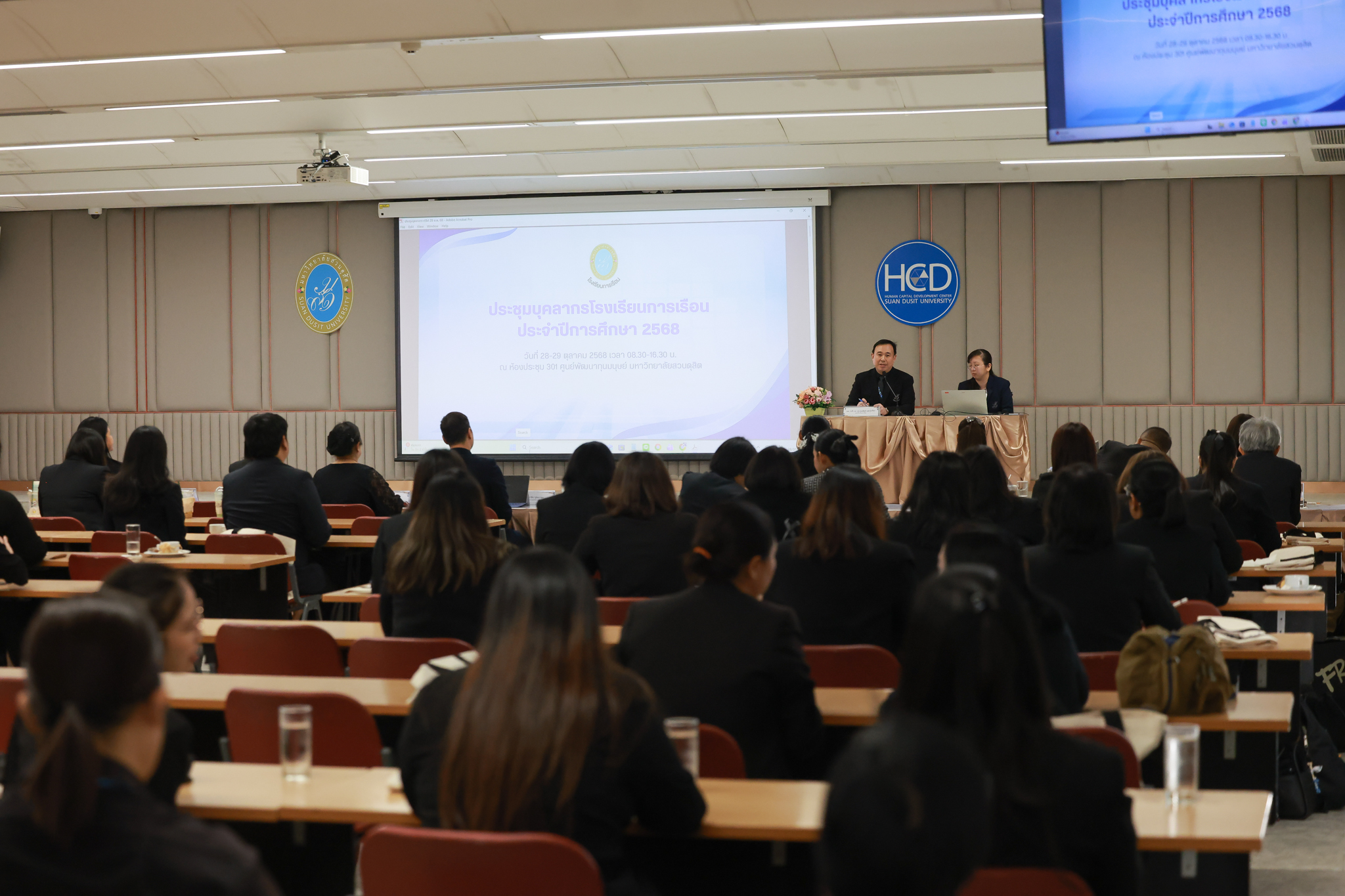 โรงเรียนการเรือน มหาวิทยาลัยสวนดุสิต จัดประชุมและกิจกรรมจัดการความรู้โรงเรียนการเรือน ประจำปีการศึกษา 2568 บุคลากรสายวิชาการและสายสนับสนุน โดยได้รับเกียรติจาก รศ.ดร.ศิโรจน์ ผลพันธิน ที่ปรึกษาอธิการบดีด้านบริหาร บรรยายพิเศษหัวข้อ โรงเรียนการเรือน ในมุมมองจากอดีตถึงปัจจุบัน สู่อนาคต กล่าววัตุประสงค์การจัดกิจกรรมและนำประชุมบุคลากรโรงเรียนการเรือนโดย ผศ.ว่าที่ ร.ต. ดร.ธนพัฒน์ แสงรุ่งเรือง คณบดีโรงเรียนการเรือน และทีมผู้บริหาร กิจกรรม KM ด้านการจัดการเรียนการสอน โดยประธานหลักสูตร และตัวแทนคณาจารย์ การบรรยายหัวข้อ “การดำรงตนในฐานะอาจารย์ที่ดี”โดย ผศ.ดร.นฤมล นันทรักษ์ ที่ปรึกษาโรงเรียนการเรือน และ บรรยาย “หลักสูตรกับ OBE และ AUN OA” และกิจกรรมแลกเปลี่ยนเรียนรู้ โดย อาจารย์ธิติมา แก้วมณี รองคณบดีโรงเรียนการเรือน ฝ่ายวิชาการและการวางแผน และ ผศ.ดร.สุภาภรณ์ ตั้งดำเนินสวัสดิ์ อาจารย์ประจำบัณฑิตวิทยาลัย เมื่อวันที่ 28 ตุลาคม 2568 ณ ห้องประชุม 301 ศูนย์พัฒนาทุนมนุษย์ มหาวิทยาลัยสวนดุสิต