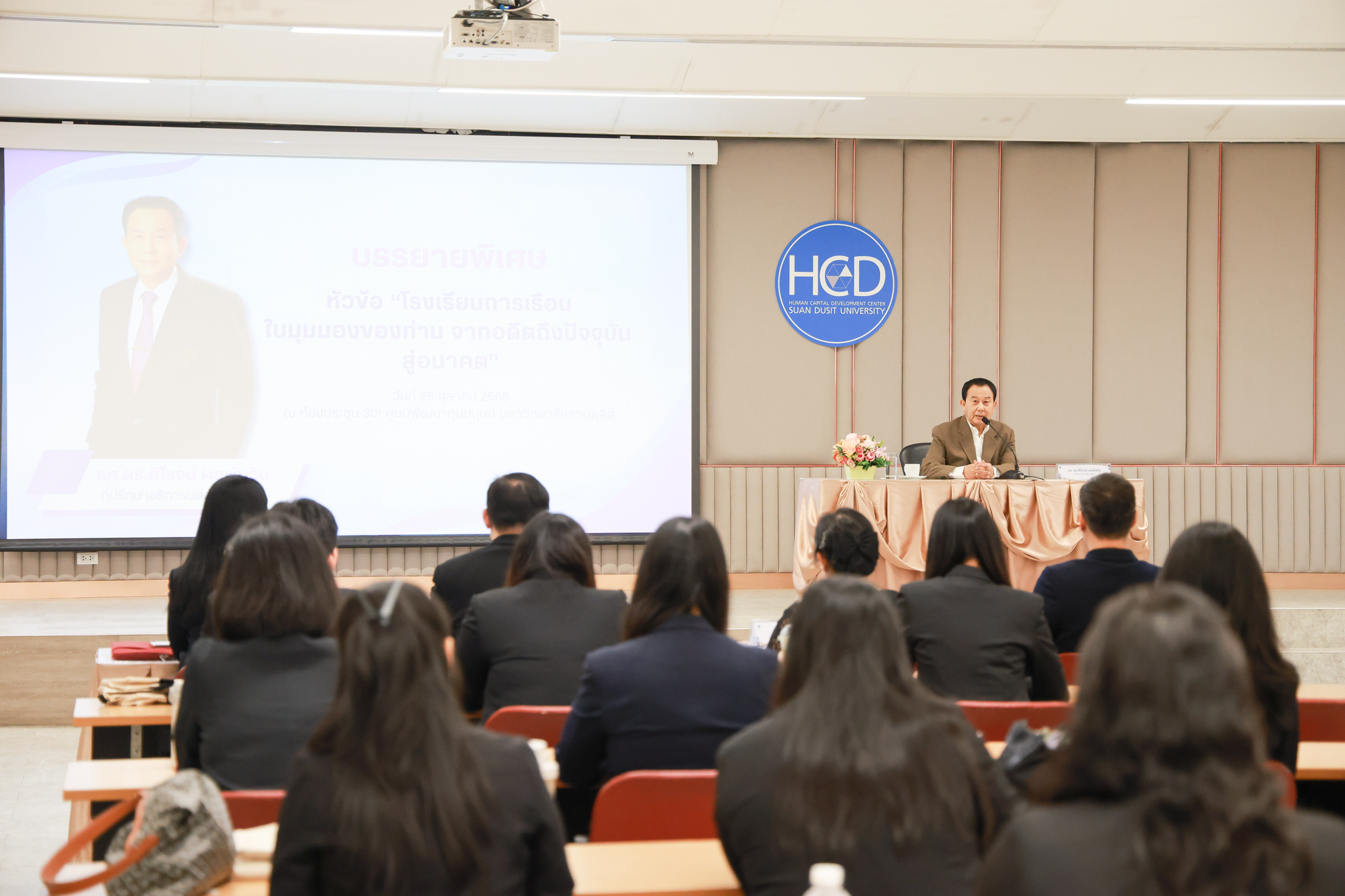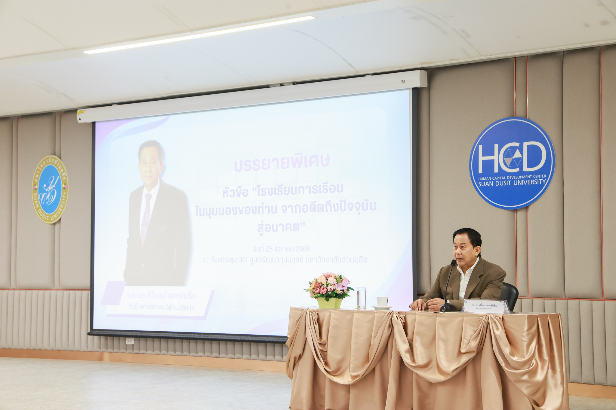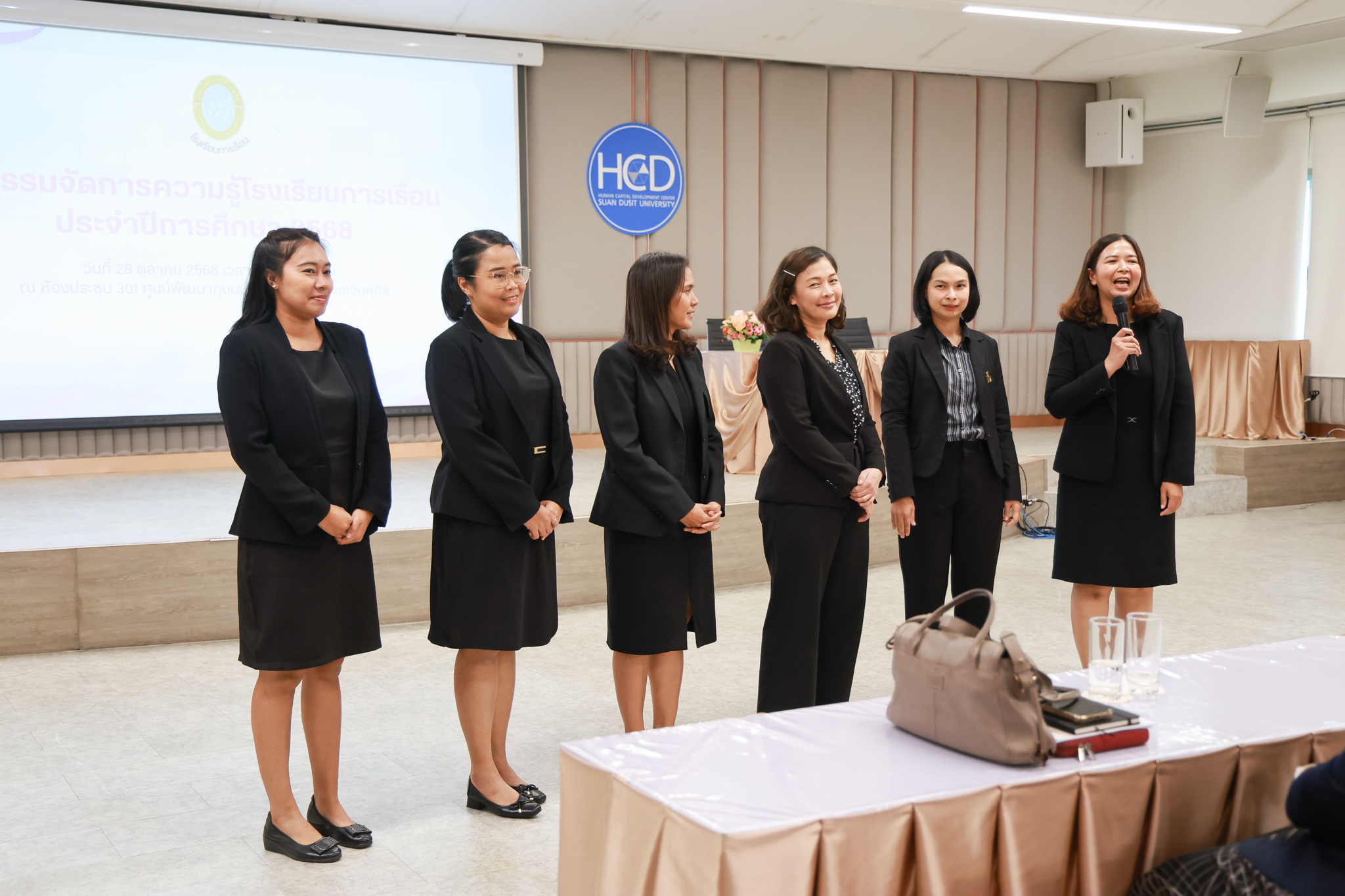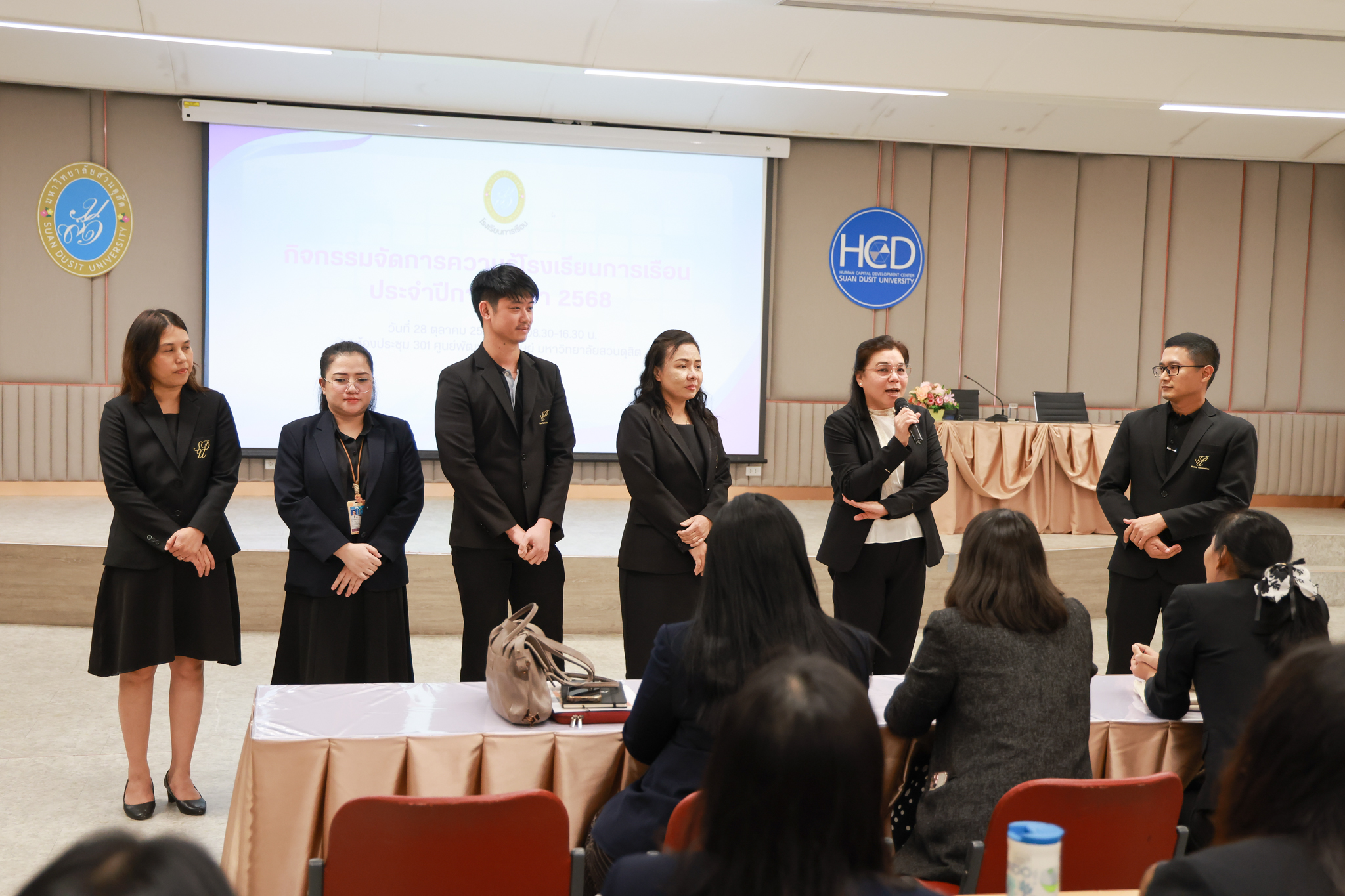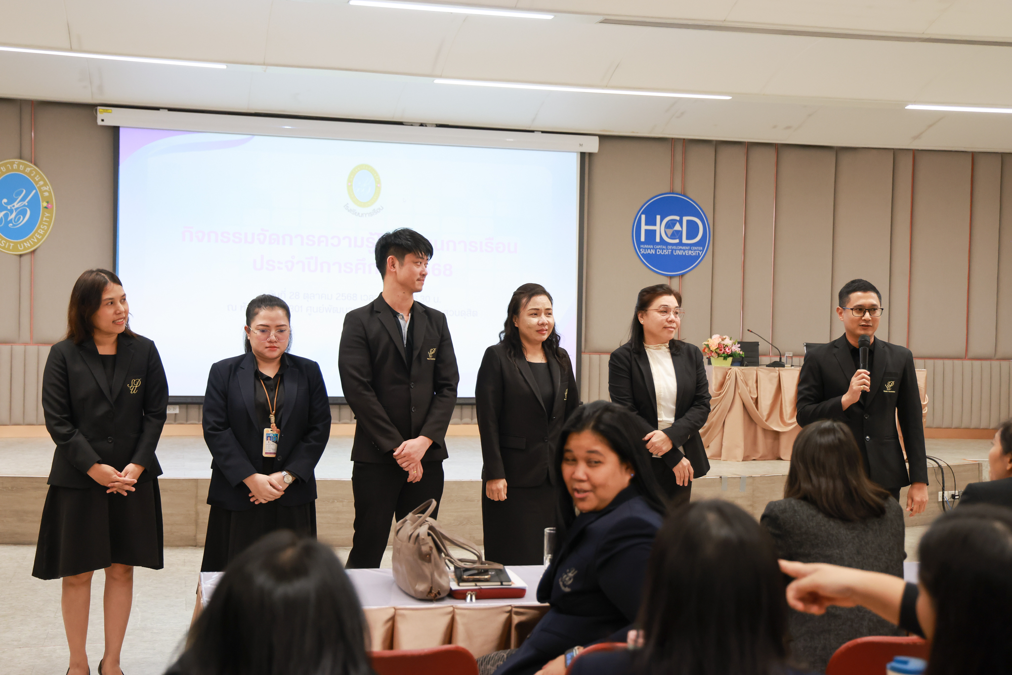 โรงเรียนการเรือน มหาวิทยาลัยสวนดุสิต จัดประชุมและกิจกรรมจัดการความรู้โรงเรียนการเรือน ประจำปีการศึกษา 2568 บุคลากรสายวิชาการและสายสนับสนุน โดยได้รับเกียรติจาก รศ.ดร.ศิโรจน์ ผลพันธิน ที่ปรึกษาอธิการบดีด้านบริหาร บรรยายพิเศษหัวข้อ โรงเรียนการเรือน ในมุมมองจากอดีตถึงปัจจุบัน สู่อนาคต กล่าววัตุประสงค์การจัดกิจกรรมและนำประชุมบุคลากรโรงเรียนการเรือนโดย ผศ.ว่าที่ ร.ต. ดร.ธนพัฒน์ แสงรุ่งเรือง คณบดีโรงเรียนการเรือน และทีมผู้บริหาร กิจกรรม KM ด้านการจัดการเรียนการสอน โดยประธานหลักสูตร และตัวแทนคณาจารย์ การบรรยายหัวข้อ “การดำรงตนในฐานะอาจารย์ที่ดี”โดย ผศ.ดร.นฤมล นันทรักษ์ ที่ปรึกษาโรงเรียนการเรือน และ บรรยาย “หลักสูตรกับ OBE และ AUN OA” และกิจกรรมแลกเปลี่ยนเรียนรู้ โดย อาจารย์ธิติมา แก้วมณี รองคณบดีโรงเรียนการเรือน ฝ่ายวิชาการและการวางแผน และ ผศ.ดร.สุภาภรณ์ ตั้งดำเนินสวัสดิ์ อาจารย์ประจำบัณฑิตวิทยาลัย เมื่อวันที่ 28 ตุลาคม 2568 ณ ห้องประชุม 301 ศูนย์พัฒนาทุนมนุษย์ มหาวิทยาลัยสวนดุสิต