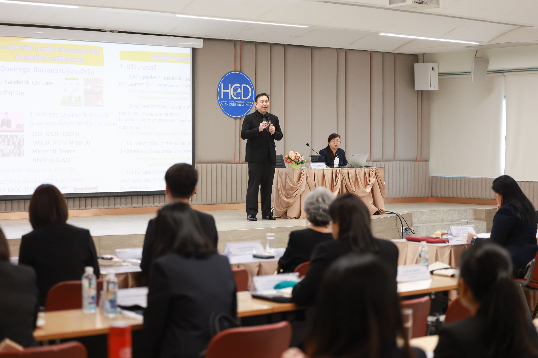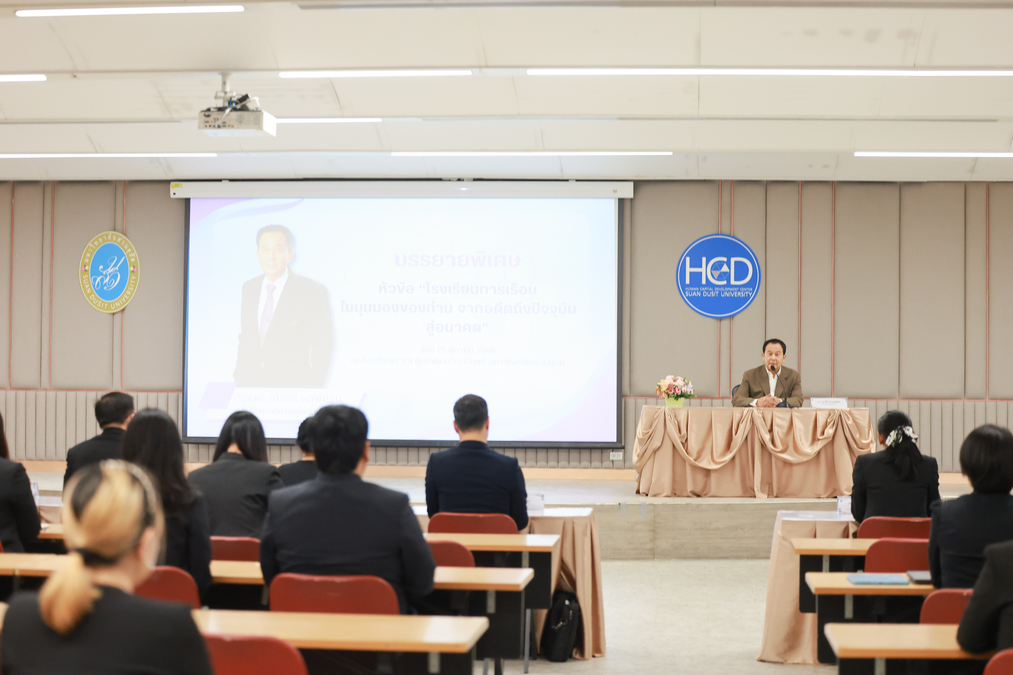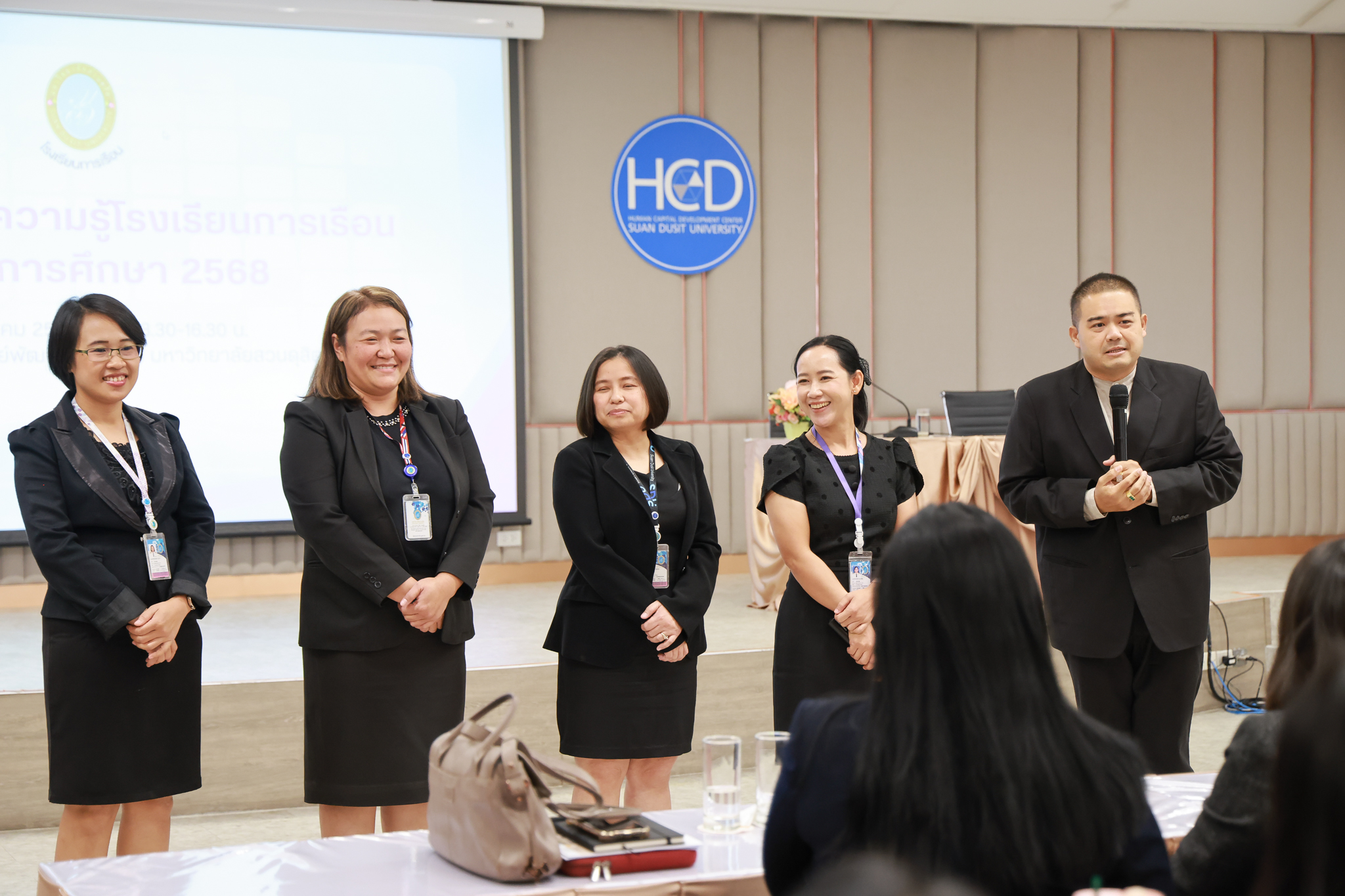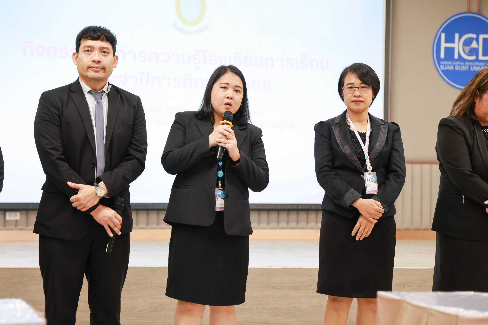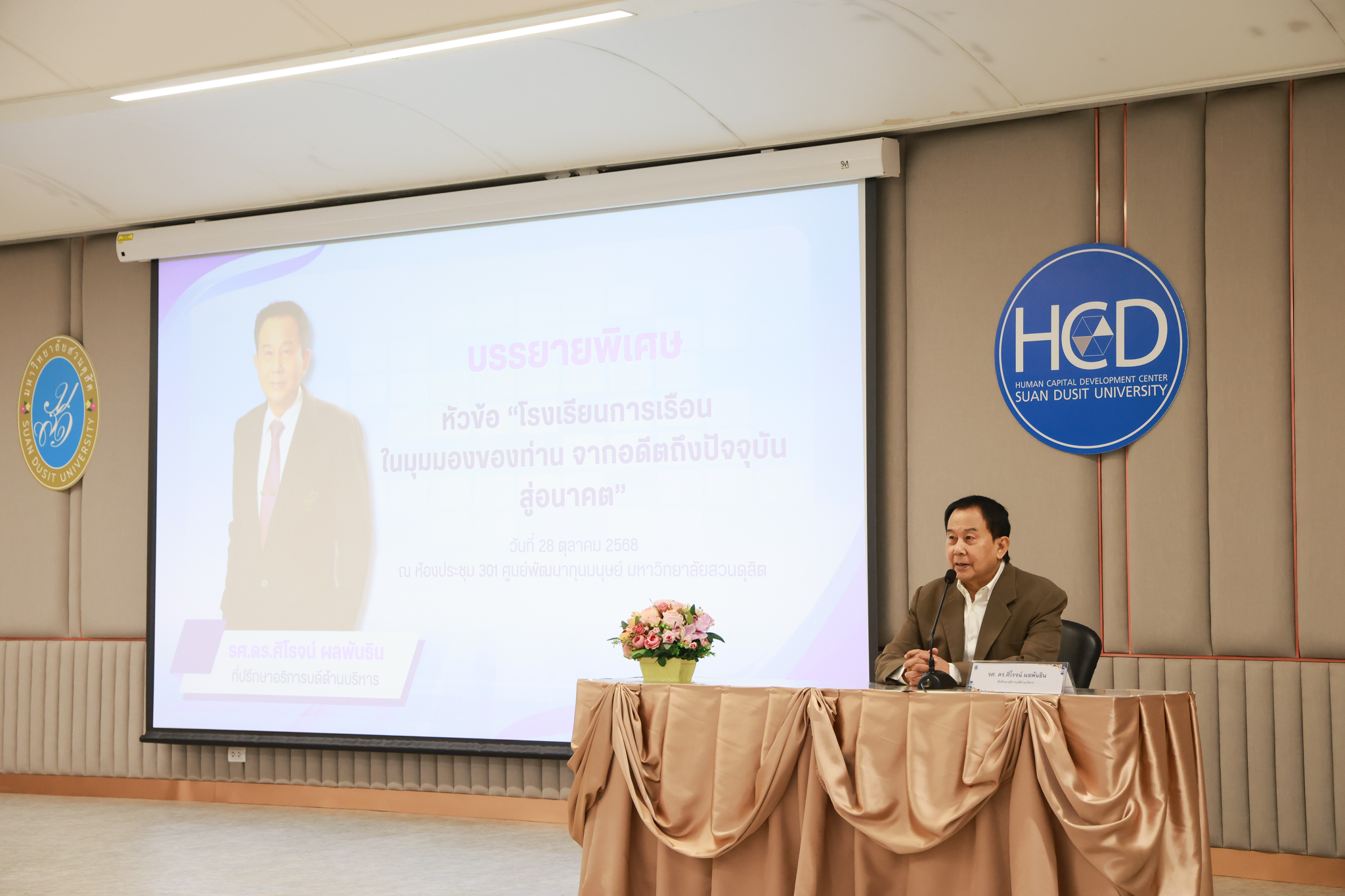 โรงเรียนการเรือน มหาวิทยาลัยสวนดุสิต จัดประชุมและกิจกรรมจัดการความรู้โรงเรียนการเรือน ประจำปีการศึกษา 2568 บุคลากรสายวิชาการและสายสนับสนุน โดยได้รับเกียรติจาก รศ.ดร.ศิโรจน์ ผลพันธิน ที่ปรึกษาอธิการบดีด้านบริหาร บรรยายพิเศษหัวข้อ โรงเรียนการเรือน ในมุมมองจากอดีตถึงปัจจุบัน สู่อนาคต กล่าววัตุประสงค์การจัดกิจกรรมและนำประชุมบุคลากรโรงเรียนการเรือนโดย ผศ.ว่าที่ ร.ต. ดร.ธนพัฒน์ แสงรุ่งเรือง คณบดีโรงเรียนการเรือน และทีมผู้บริหาร กิจกรรม KM ด้านการจัดการเรียนการสอน โดยประธานหลักสูตร และตัวแทนคณาจารย์ การบรรยายหัวข้อ “การดำรงตนในฐานะอาจารย์ที่ดี”โดย ผศ.ดร.นฤมล นันทรักษ์ ที่ปรึกษาโรงเรียนการเรือน และ บรรยาย “หลักสูตรกับ OBE และ AUN OA” และกิจกรรมแลกเปลี่ยนเรียนรู้ โดย อาจารย์ธิติมา แก้วมณี รองคณบดีโรงเรียนการเรือน ฝ่ายวิชาการและการวางแผน และ ผศ.ดร.สุภาภรณ์ ตั้งดำเนินสวัสดิ์ อาจารย์ประจำบัณฑิตวิทยาลัย เมื่อวันที่ 28 ตุลาคม 2568 ณ ห้องประชุม 301 ศูนย์พัฒนาทุนมนุษย์ มหาวิทยาลัยสวนดุสิต