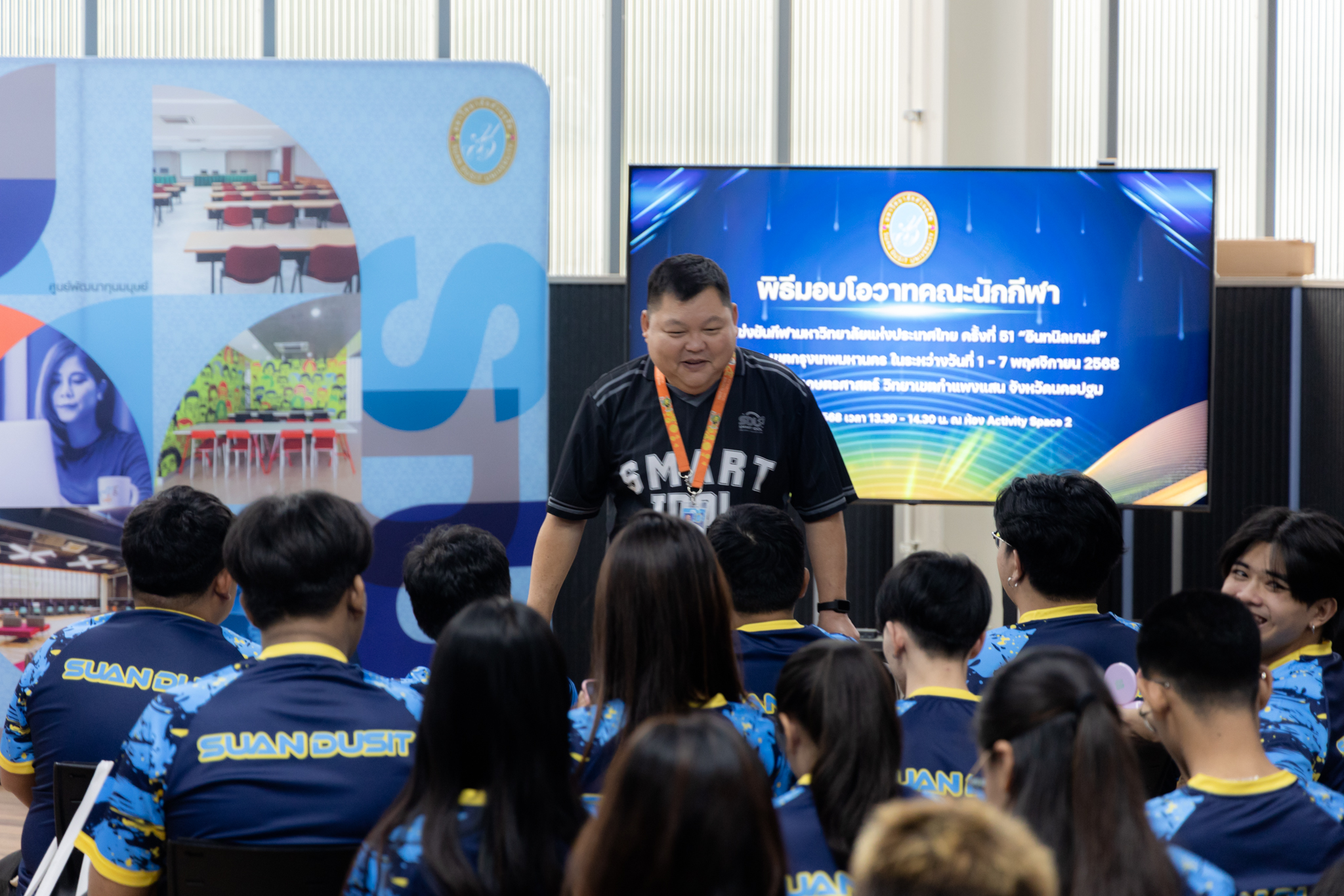 ผู้ช่วยศาสตราจารย์ ดร.พิทักษ์ จันทร์เจริญ อธิการบดี เป็นประธานในพิธีมอบโอวาทคณะนักกีฬามหาวิทยาลัยสวนดุสิต ในการแข่งขันกีฬามหาวิทยาลัยแห่งประเทศไทย ครั้งที่ ๕๑ “อินทนิลเกมส์” รอบคัดเลือก เขตกรุงเทพมหานคร ระหว่างวันที่ ๑-๗ พฤศจิกายน ๒๕๖๘ ณ มหาวิทยาลัยเกษตรศาสตร์ วิทยาเขตกำแพงแสน จังหวัดนครปฐม โดยมี รองศาสตราจารย์พัชรี สวนแก้ว รองอธิการบดีฝ่ายกิจการนักศึกษา และ ผู้ช่วยศาสตราจารย์ ดร.ธนากร ปักษา ผู้อำนวยการกองพัฒนานักศึกษา นำคณะนักกีฬา ประกอบด้วย ๓ ประเภทกีฬา ได้แก่ ฟุตซอล (ทีมชาย) บาสเกตบอล (ทีมชาย) และ วอลเลย์บอล (ทีมชาย-หญิง) ในวันที่ ๒๘ ตุลาคม ๒๕๖๘ ณ ห้อง Activity Space 2