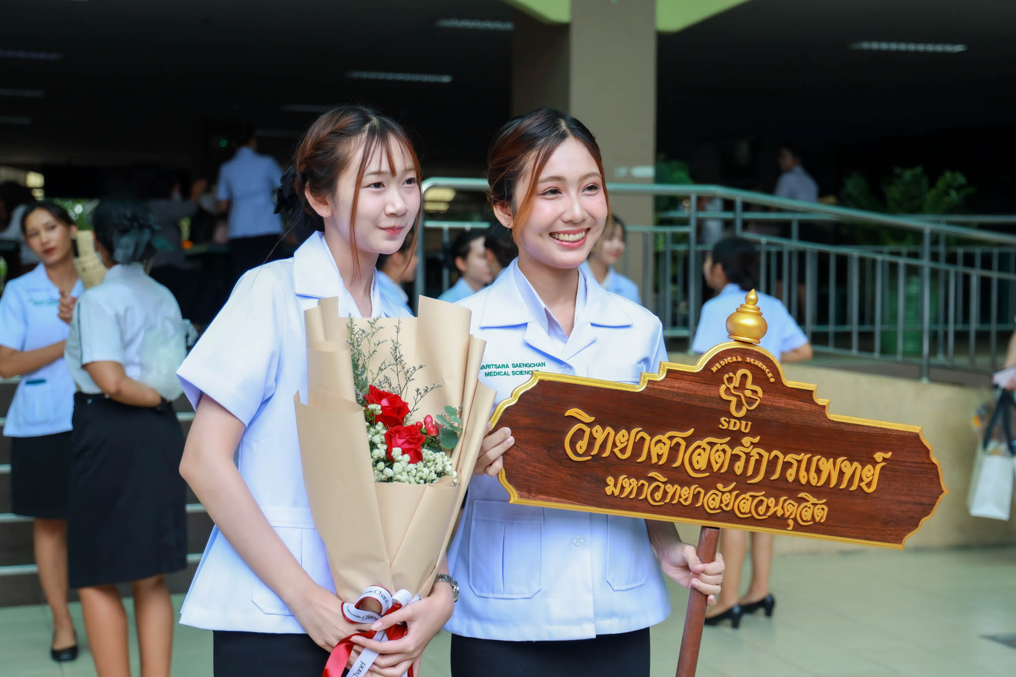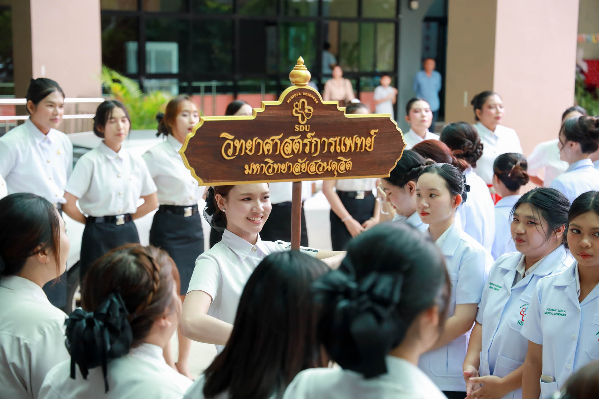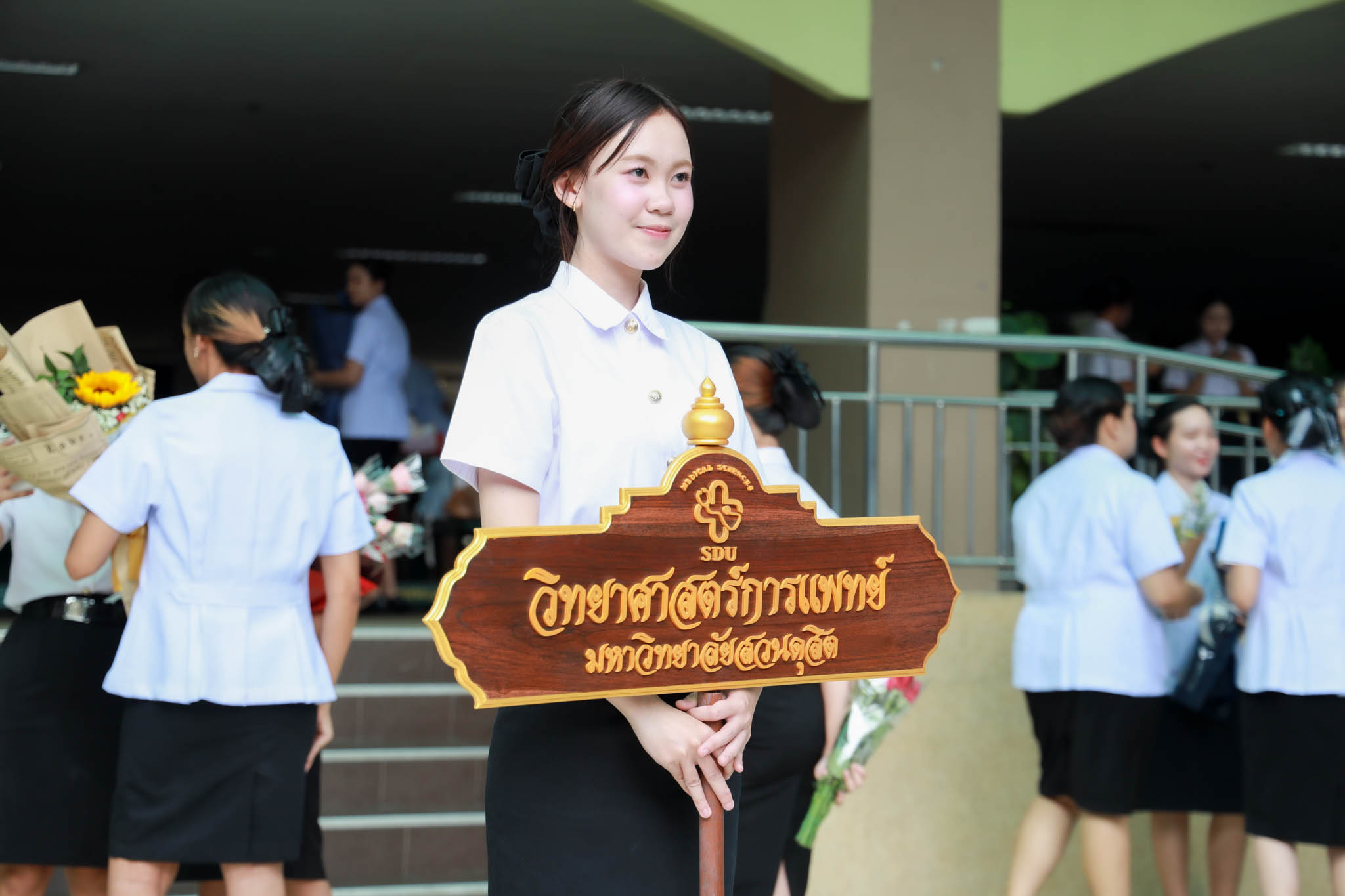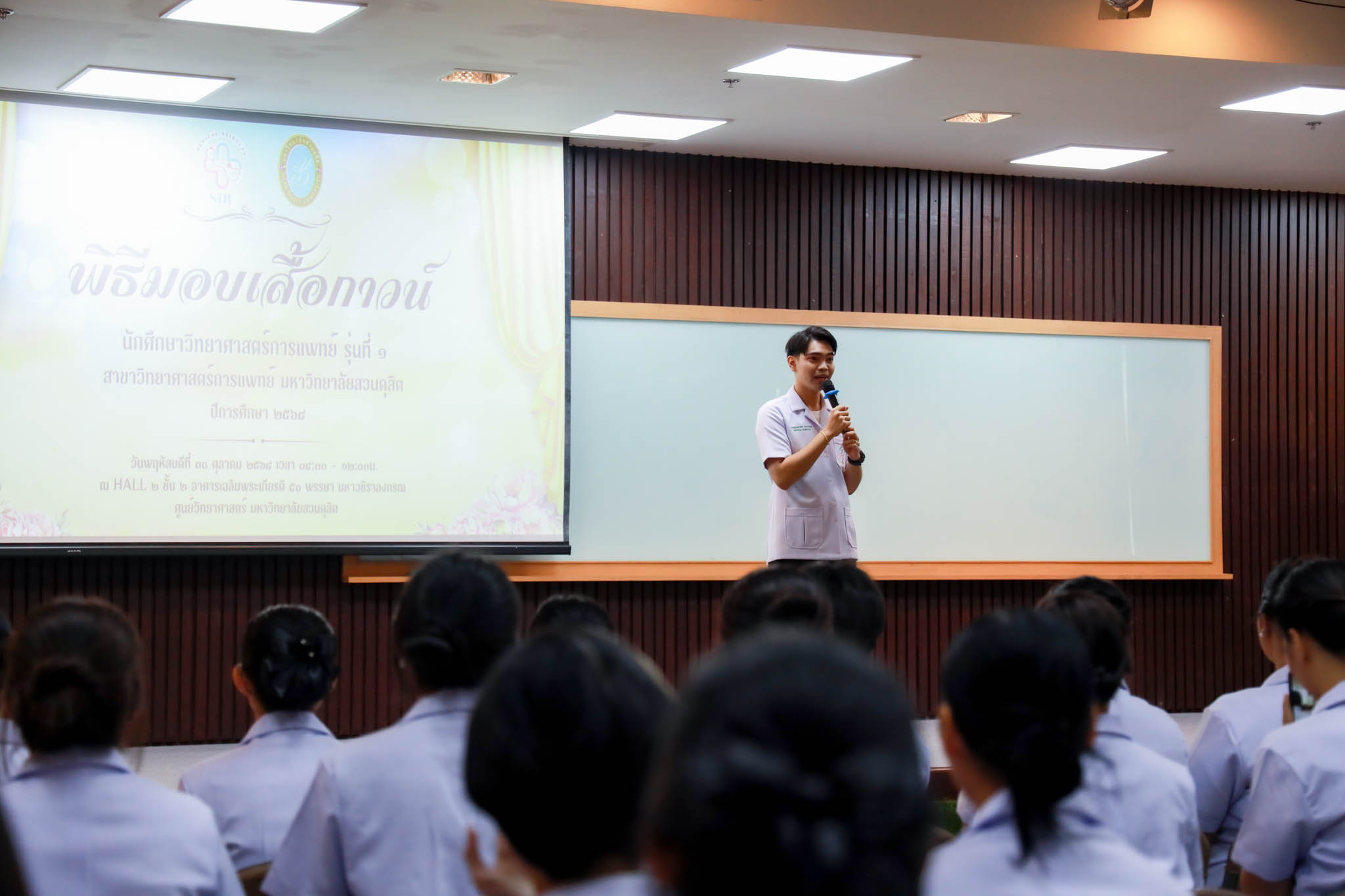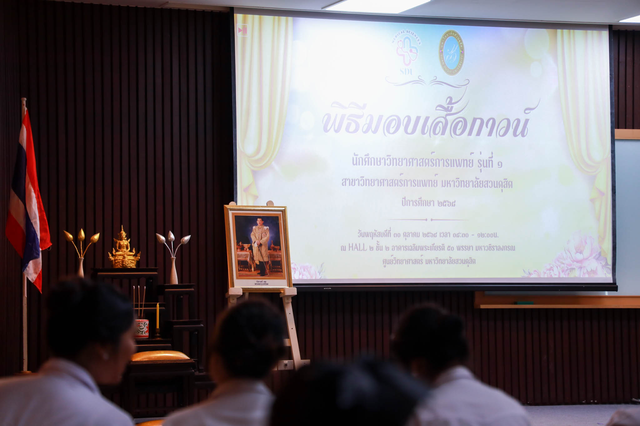 คณะวิทยาศาสตร์และเทคโนโลยี มหาวิทยาลัยสวนดุสิต จัดพิธีมอบเสื้อกาวน์ สำหรับนักศึกษาหลักสูตรวิทยาศาสตร์การแพทย์ แก่นักศึกษาชั้นปีที่ 2/2567 เมื่อวันที่ 30 ตุลาคม 2568 ณ Hall 2 ชั้น 2 อาคารเฉลิมพระเกียรติ 50 พรรษา มหาวชิราลงกรณ ศูนย์วิทยาศาสตร์ มหาวิทยาลัยสวนดุสิต โดยได้รับเกียรติจาก ผู้ช่วยศาสตราจารย์ ดร. ฐิตินาถ สุคนเขตร์ คณบดีคณะวิทยาศาสตร์และเทคโนโลยี เป็นประธานในพิธีและให้โอวาทแก่นักศึกษา ร่วมด้วย ผู้ช่วยศาสตราจารย์ ดร. ยุทธนา พิมพ์ทองงาม ประธานหลักสูตรวิทยาศาสตร์การแพทย์ และคณาจารย์ประจำหลักสูตรเข้าร่วมแสดงความยินดี พิธีดังกล่าวจัดขึ้นเพื่อแสดงถึงการก้าวเข้าสู่เส้นทางแห่งวิชาชีพด้านวิทยาศาสตร์การแพทย์อย่างภาคภูมิ และปลูกฝังจิตสำนึกแห่งความรับผิดชอบในวิชาชีพแก่นักศึกษา ภายในงานมีการกล่าวความรู้สึกโดยประธานรุ่น และการกล่าวคำปฏิญาณโดยรองประธานรุ่น เพื่อแสดงเจตนารมณ์แห่งความมุ่งมั่นในวิชาชีพ ก่อนปิดท้ายด้วยกิจกรรมรุ่นน้องบูมให้รุ่นพี่บริเวณหน้าตึกพยาบาล ท่ามกลางบรรยากาศอบอุ่นและเปี่ยมด้วยความภาคภูมิใจ