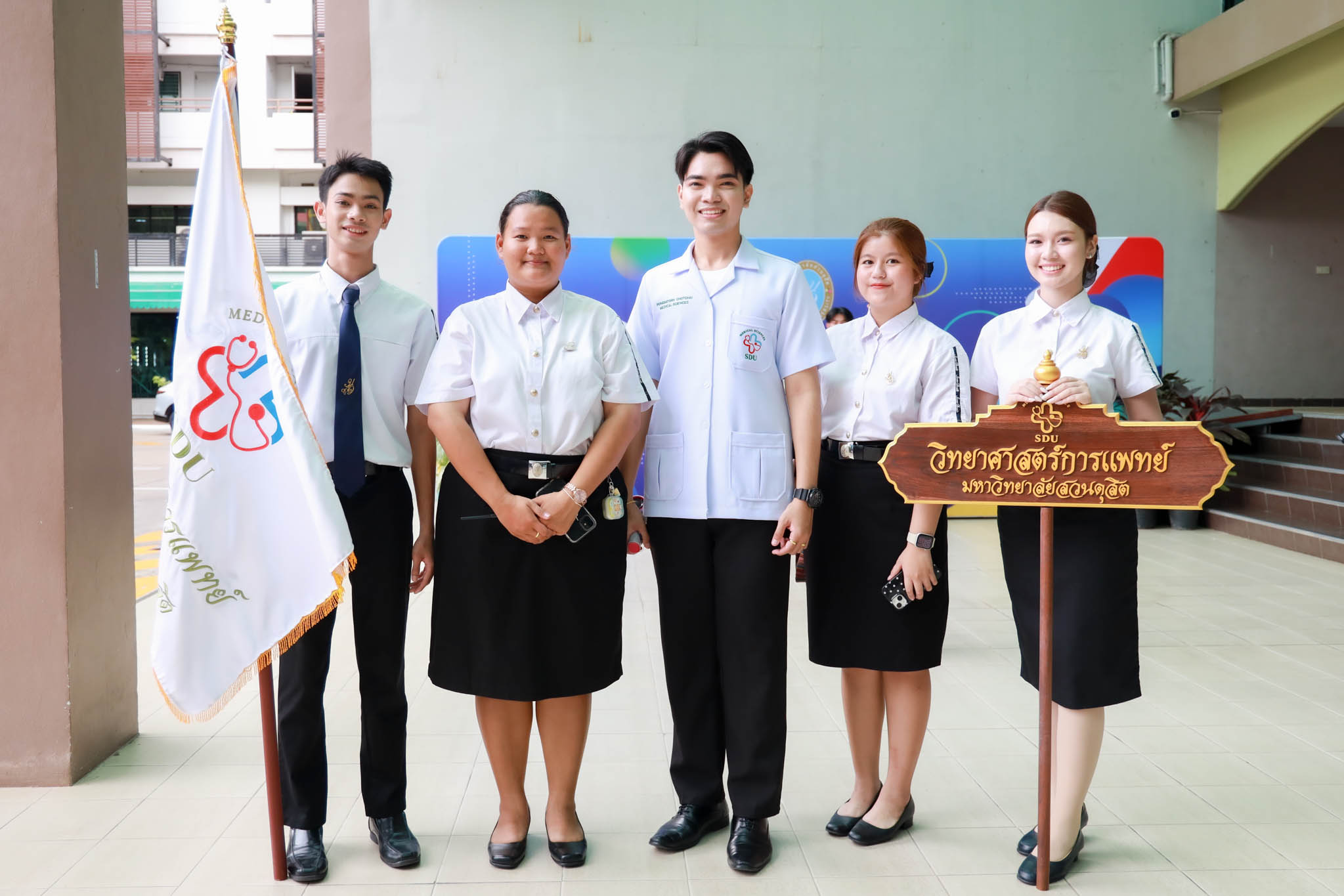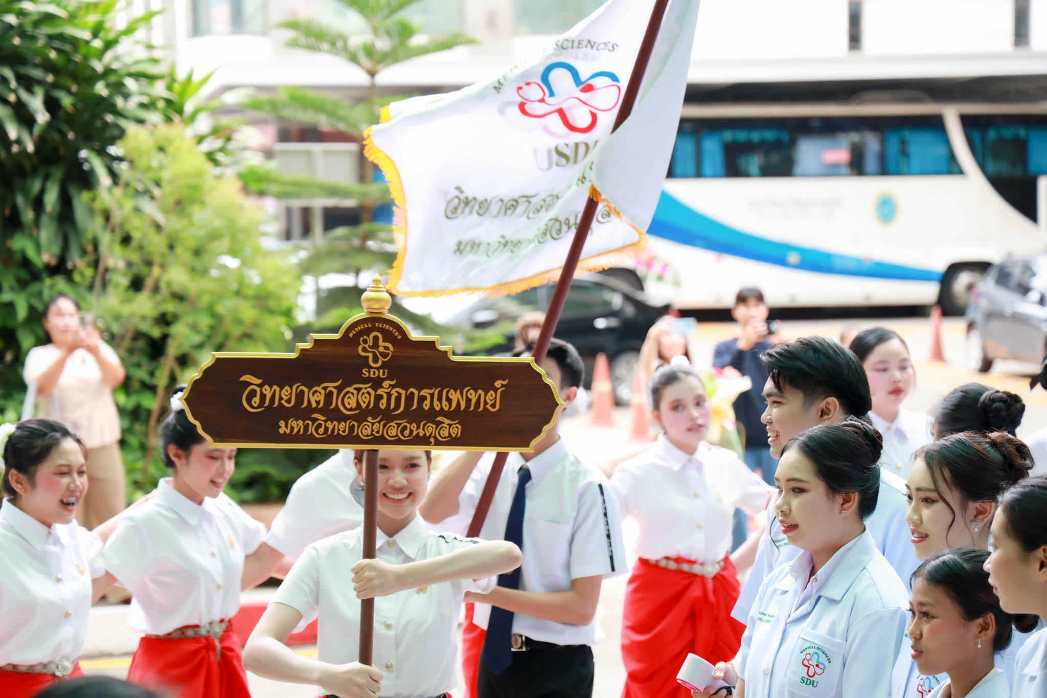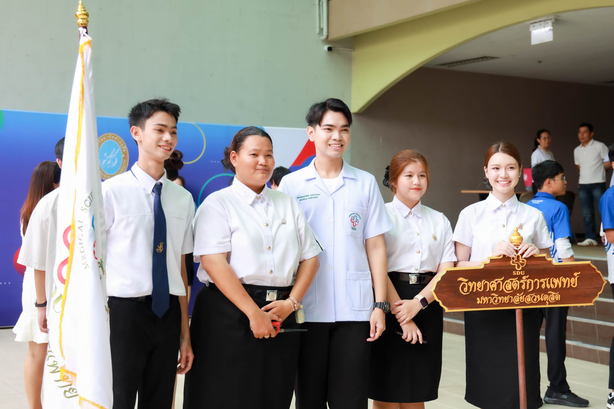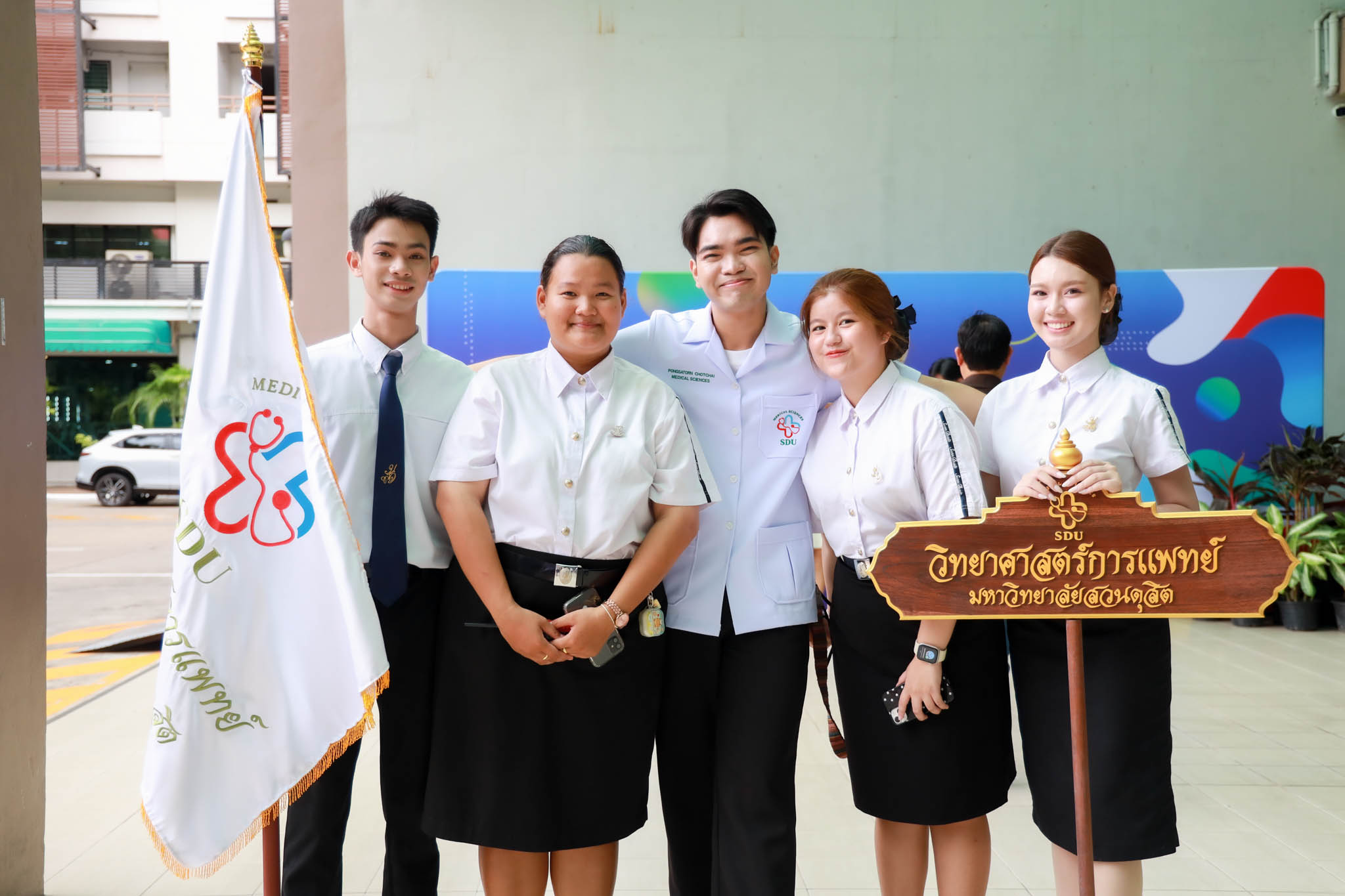 คณะวิทยาศาสตร์และเทคโนโลยี มหาวิทยาลัยสวนดุสิต จัดพิธีมอบเสื้อกาวน์ สำหรับนักศึกษาหลักสูตรวิทยาศาสตร์การแพทย์ แก่นักศึกษาชั้นปีที่ 2/2567 เมื่อวันที่ 30 ตุลาคม 2568 ณ Hall 2 ชั้น 2 อาคารเฉลิมพระเกียรติ 50 พรรษา มหาวชิราลงกรณ ศูนย์วิทยาศาสตร์ มหาวิทยาลัยสวนดุสิต โดยได้รับเกียรติจาก ผู้ช่วยศาสตราจารย์ ดร. ฐิตินาถ สุคนเขตร์ คณบดีคณะวิทยาศาสตร์และเทคโนโลยี เป็นประธานในพิธีและให้โอวาทแก่นักศึกษา ร่วมด้วย ผู้ช่วยศาสตราจารย์ ดร. ยุทธนา พิมพ์ทองงาม ประธานหลักสูตรวิทยาศาสตร์การแพทย์ และคณาจารย์ประจำหลักสูตรเข้าร่วมแสดงความยินดี พิธีดังกล่าวจัดขึ้นเพื่อแสดงถึงการก้าวเข้าสู่เส้นทางแห่งวิชาชีพด้านวิทยาศาสตร์การแพทย์อย่างภาคภูมิ และปลูกฝังจิตสำนึกแห่งความรับผิดชอบในวิชาชีพแก่นักศึกษา ภายในงานมีการกล่าวความรู้สึกโดยประธานรุ่น และการกล่าวคำปฏิญาณโดยรองประธานรุ่น เพื่อแสดงเจตนารมณ์แห่งความมุ่งมั่นในวิชาชีพ ก่อนปิดท้ายด้วยกิจกรรมรุ่นน้องบูมให้รุ่นพี่บริเวณหน้าตึกพยาบาล ท่ามกลางบรรยากาศอบอุ่นและเปี่ยมด้วยความภาคภูมิใจ