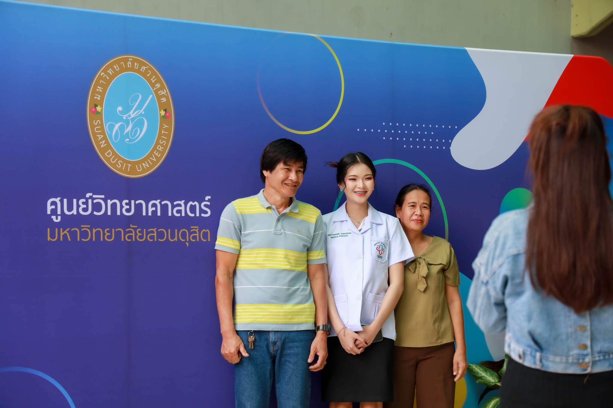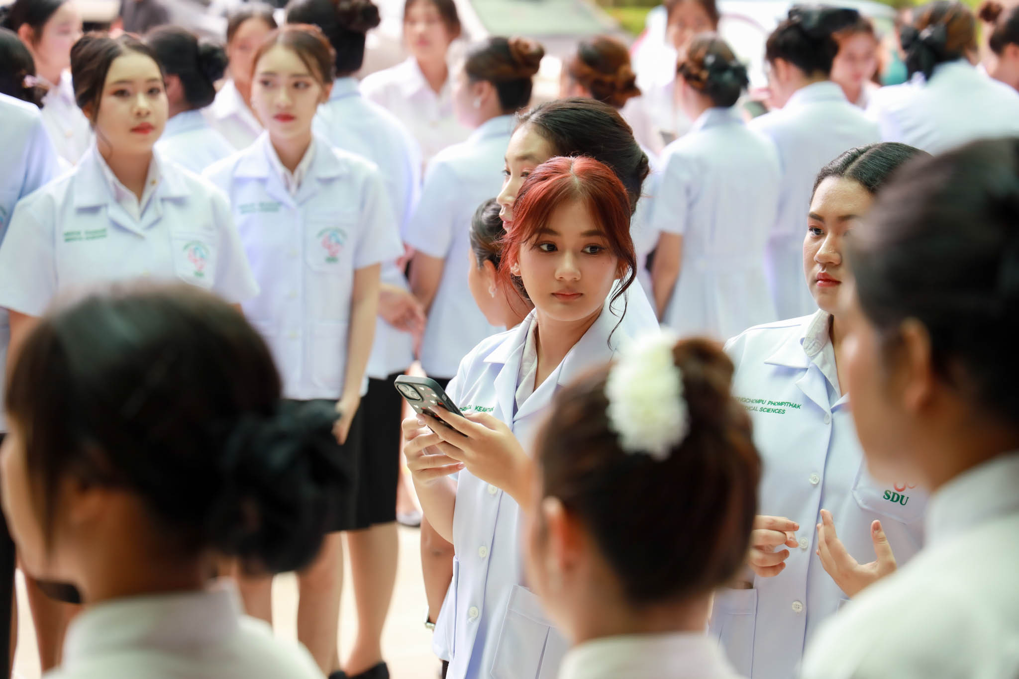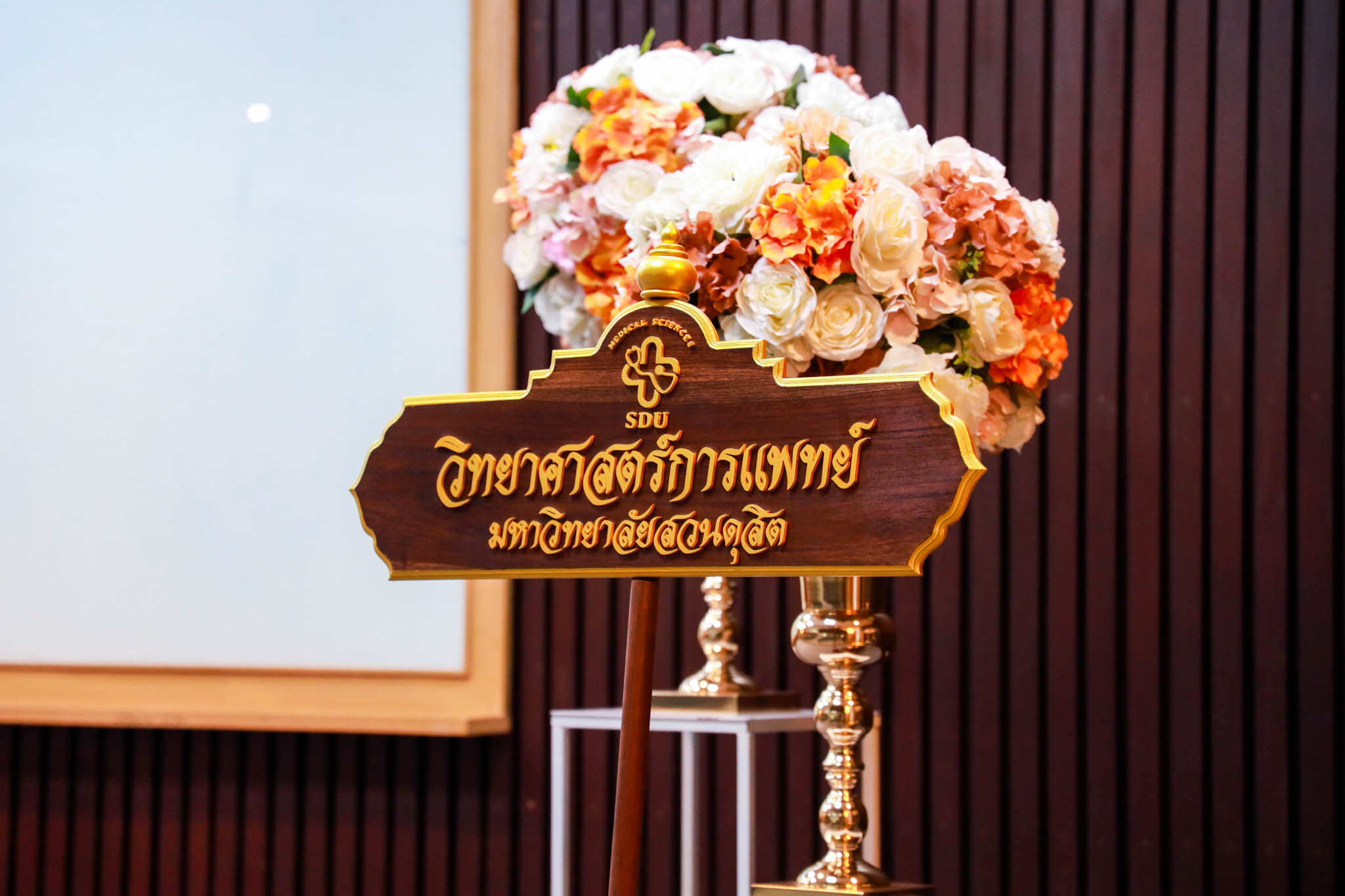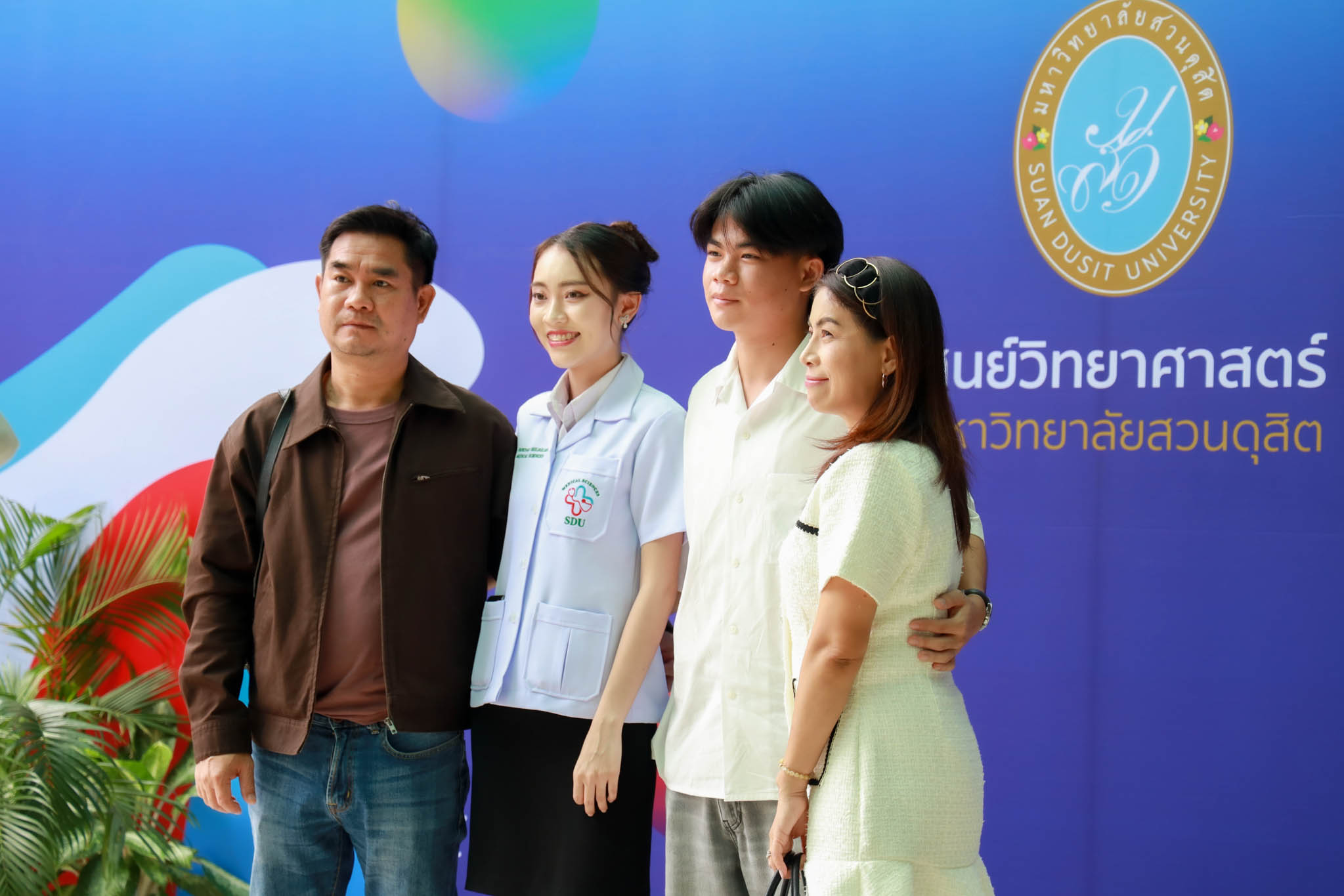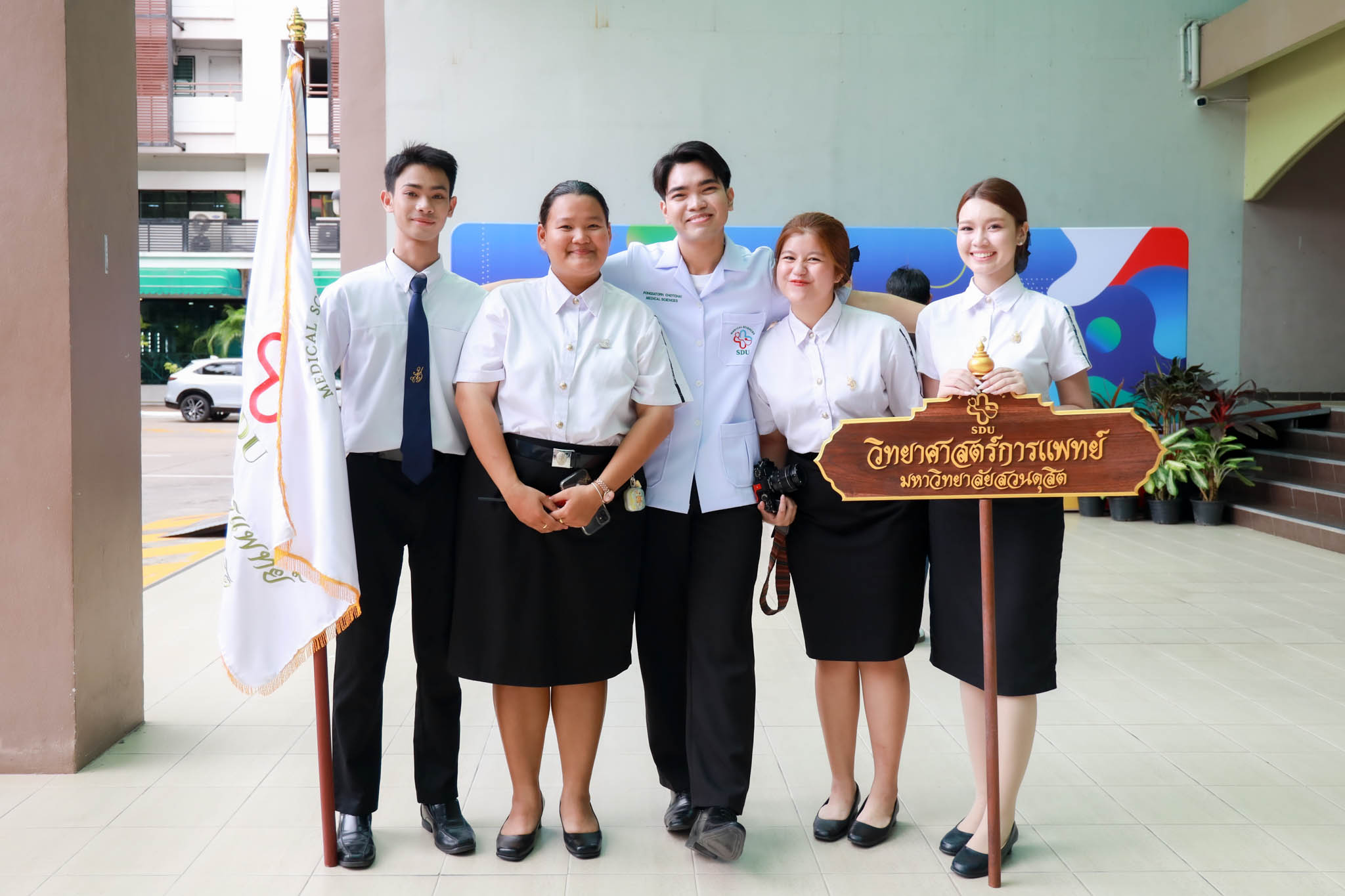 คณะวิทยาศาสตร์และเทคโนโลยี มหาวิทยาลัยสวนดุสิต จัดพิธีมอบเสื้อกาวน์ สำหรับนักศึกษาหลักสูตรวิทยาศาสตร์การแพทย์ แก่นักศึกษาชั้นปีที่ 2/2567 เมื่อวันที่ 30 ตุลาคม 2568 ณ Hall 2 ชั้น 2 อาคารเฉลิมพระเกียรติ 50 พรรษา มหาวชิราลงกรณ ศูนย์วิทยาศาสตร์ มหาวิทยาลัยสวนดุสิต โดยได้รับเกียรติจาก ผู้ช่วยศาสตราจารย์ ดร. ฐิตินาถ สุคนเขตร์ คณบดีคณะวิทยาศาสตร์และเทคโนโลยี เป็นประธานในพิธีและให้โอวาทแก่นักศึกษา ร่วมด้วย ผู้ช่วยศาสตราจารย์ ดร. ยุทธนา พิมพ์ทองงาม ประธานหลักสูตรวิทยาศาสตร์การแพทย์ และคณาจารย์ประจำหลักสูตรเข้าร่วมแสดงความยินดี พิธีดังกล่าวจัดขึ้นเพื่อแสดงถึงการก้าวเข้าสู่เส้นทางแห่งวิชาชีพด้านวิทยาศาสตร์การแพทย์อย่างภาคภูมิ และปลูกฝังจิตสำนึกแห่งความรับผิดชอบในวิชาชีพแก่นักศึกษา ภายในงานมีการกล่าวความรู้สึกโดยประธานรุ่น และการกล่าวคำปฏิญาณโดยรองประธานรุ่น เพื่อแสดงเจตนารมณ์แห่งความมุ่งมั่นในวิชาชีพ ก่อนปิดท้ายด้วยกิจกรรมรุ่นน้องบูมให้รุ่นพี่บริเวณหน้าตึกพยาบาล ท่ามกลางบรรยากาศอบอุ่นและเปี่ยมด้วยความภาคภูมิใจ