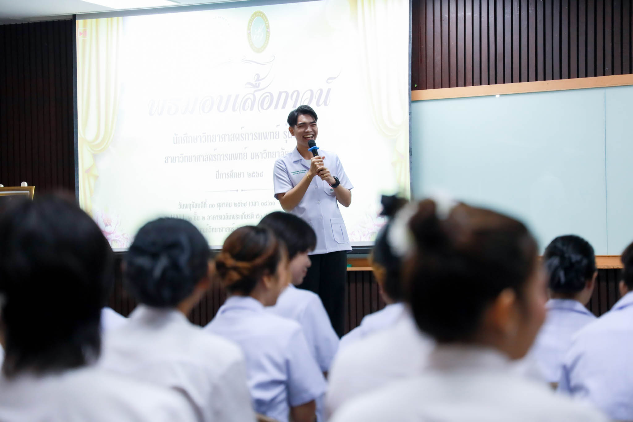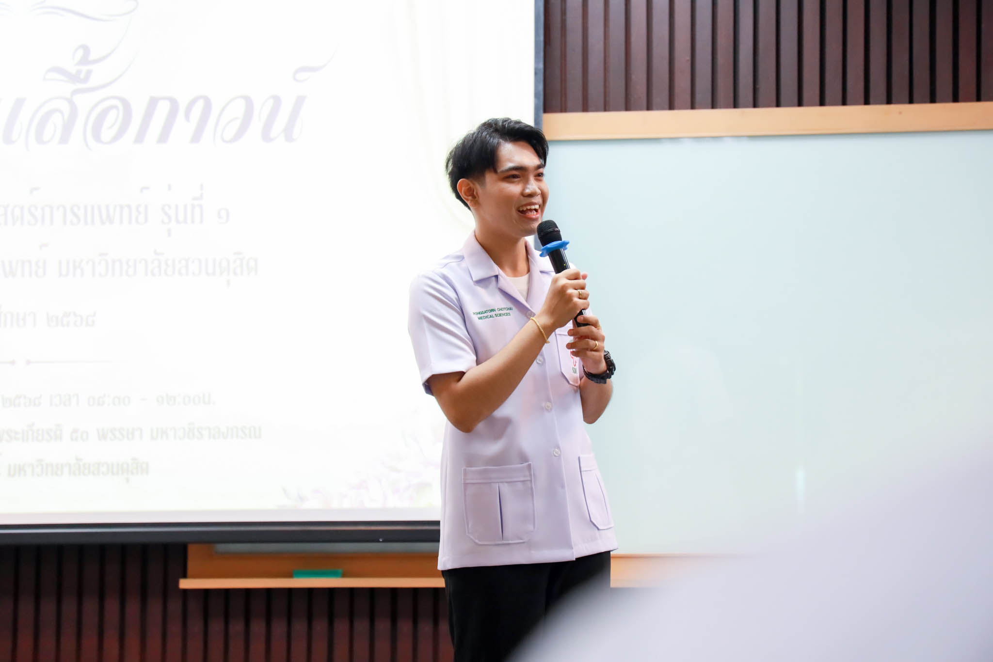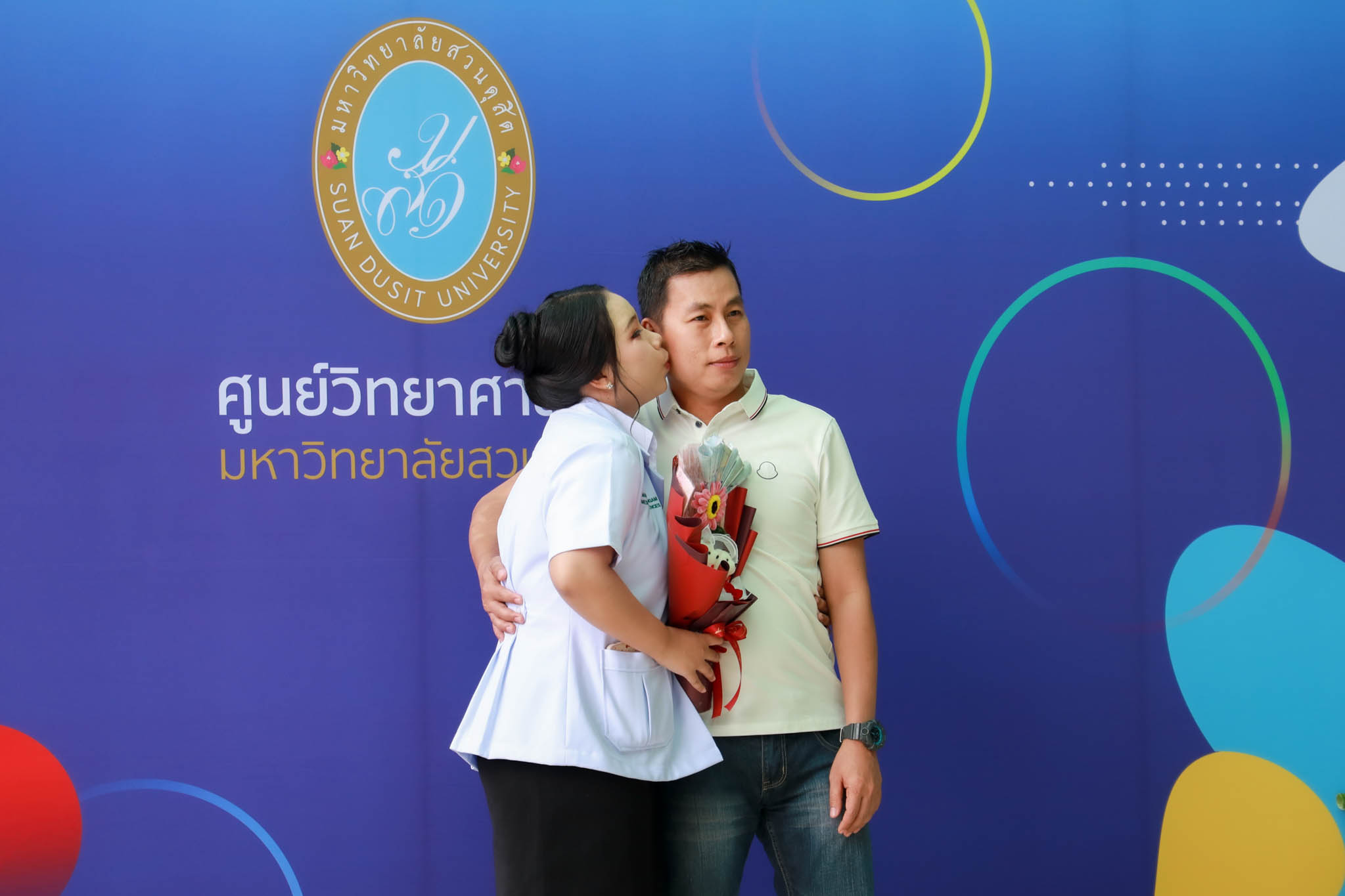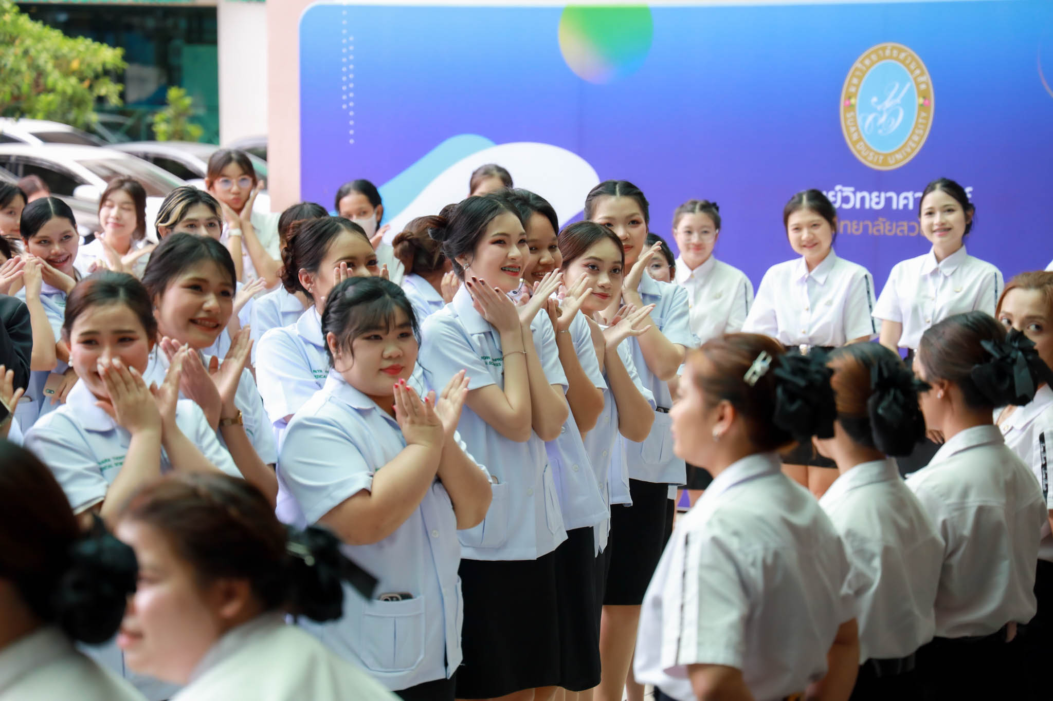 คณะวิทยาศาสตร์และเทคโนโลยี มหาวิทยาลัยสวนดุสิต จัดพิธีมอบเสื้อกาวน์ สำหรับนักศึกษาหลักสูตรวิทยาศาสตร์การแพทย์ แก่นักศึกษาชั้นปีที่ 2/2567 เมื่อวันที่ 30 ตุลาคม 2568 ณ Hall 2 ชั้น 2 อาคารเฉลิมพระเกียรติ 50 พรรษา มหาวชิราลงกรณ ศูนย์วิทยาศาสตร์ มหาวิทยาลัยสวนดุสิต โดยได้รับเกียรติจาก ผู้ช่วยศาสตราจารย์ ดร. ฐิตินาถ สุคนเขตร์ คณบดีคณะวิทยาศาสตร์และเทคโนโลยี เป็นประธานในพิธีและให้โอวาทแก่นักศึกษา ร่วมด้วย ผู้ช่วยศาสตราจารย์ ดร. ยุทธนา พิมพ์ทองงาม ประธานหลักสูตรวิทยาศาสตร์การแพทย์ และคณาจารย์ประจำหลักสูตรเข้าร่วมแสดงความยินดี พิธีดังกล่าวจัดขึ้นเพื่อแสดงถึงการก้าวเข้าสู่เส้นทางแห่งวิชาชีพด้านวิทยาศาสตร์การแพทย์อย่างภาคภูมิ และปลูกฝังจิตสำนึกแห่งความรับผิดชอบในวิชาชีพแก่นักศึกษา ภายในงานมีการกล่าวความรู้สึกโดยประธานรุ่น และการกล่าวคำปฏิญาณโดยรองประธานรุ่น เพื่อแสดงเจตนารมณ์แห่งความมุ่งมั่นในวิชาชีพ ก่อนปิดท้ายด้วยกิจกรรมรุ่นน้องบูมให้รุ่นพี่บริเวณหน้าตึกพยาบาล ท่ามกลางบรรยากาศอบอุ่นและเปี่ยมด้วยความภาคภูมิใจ