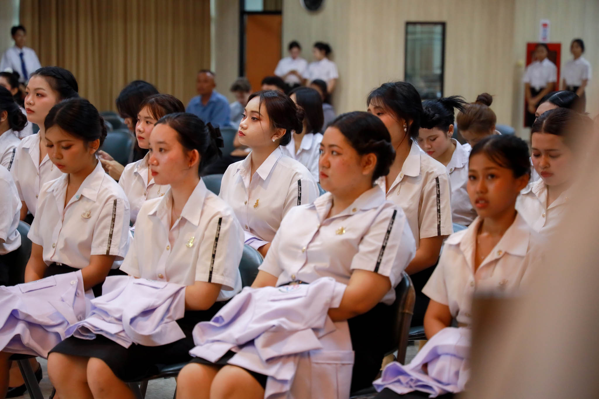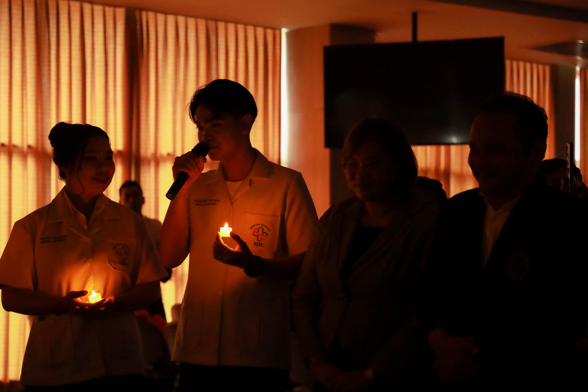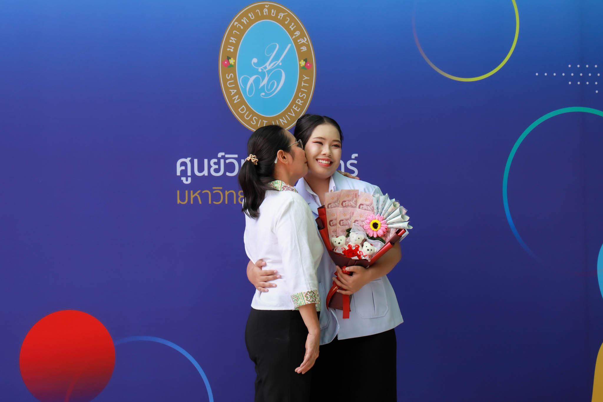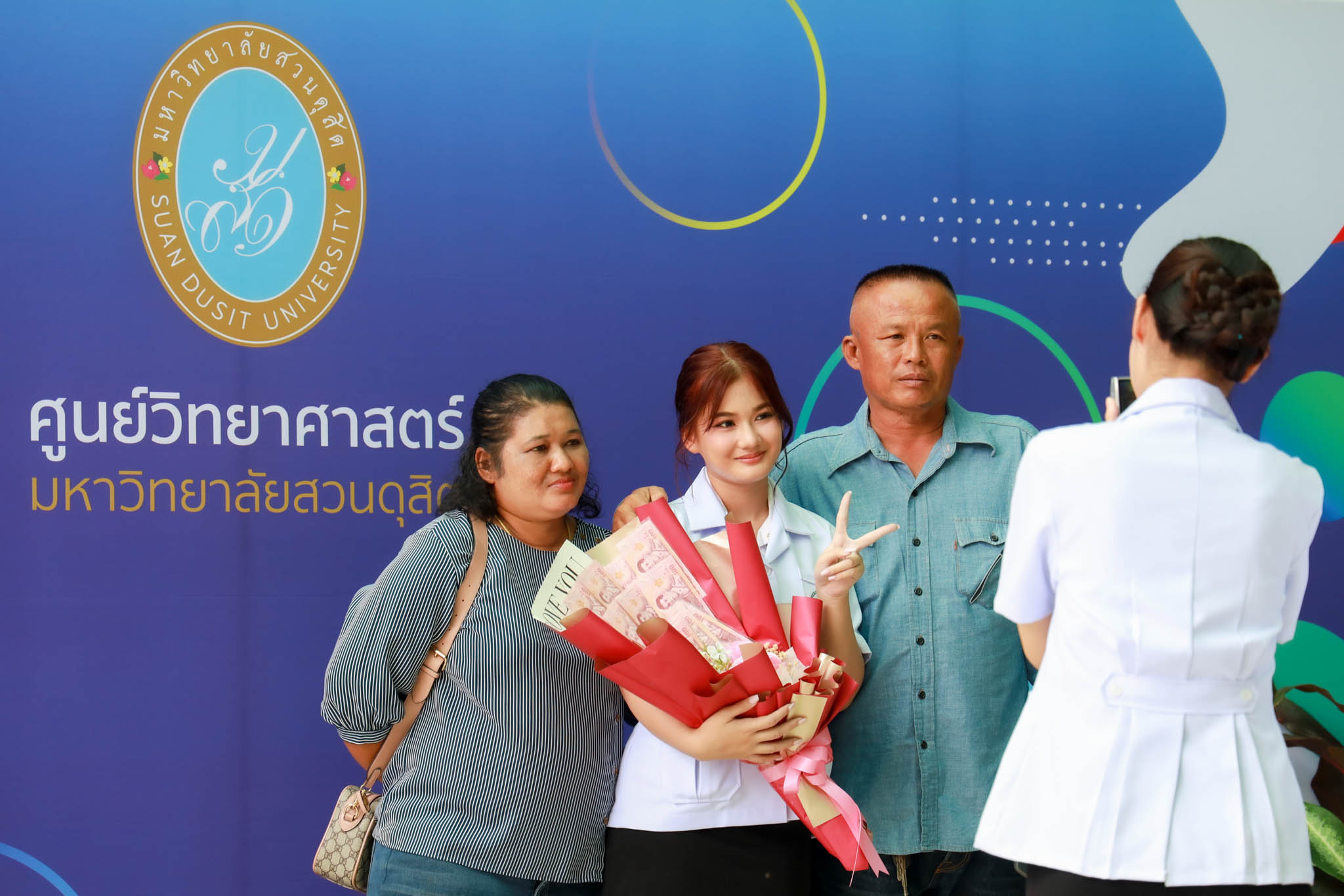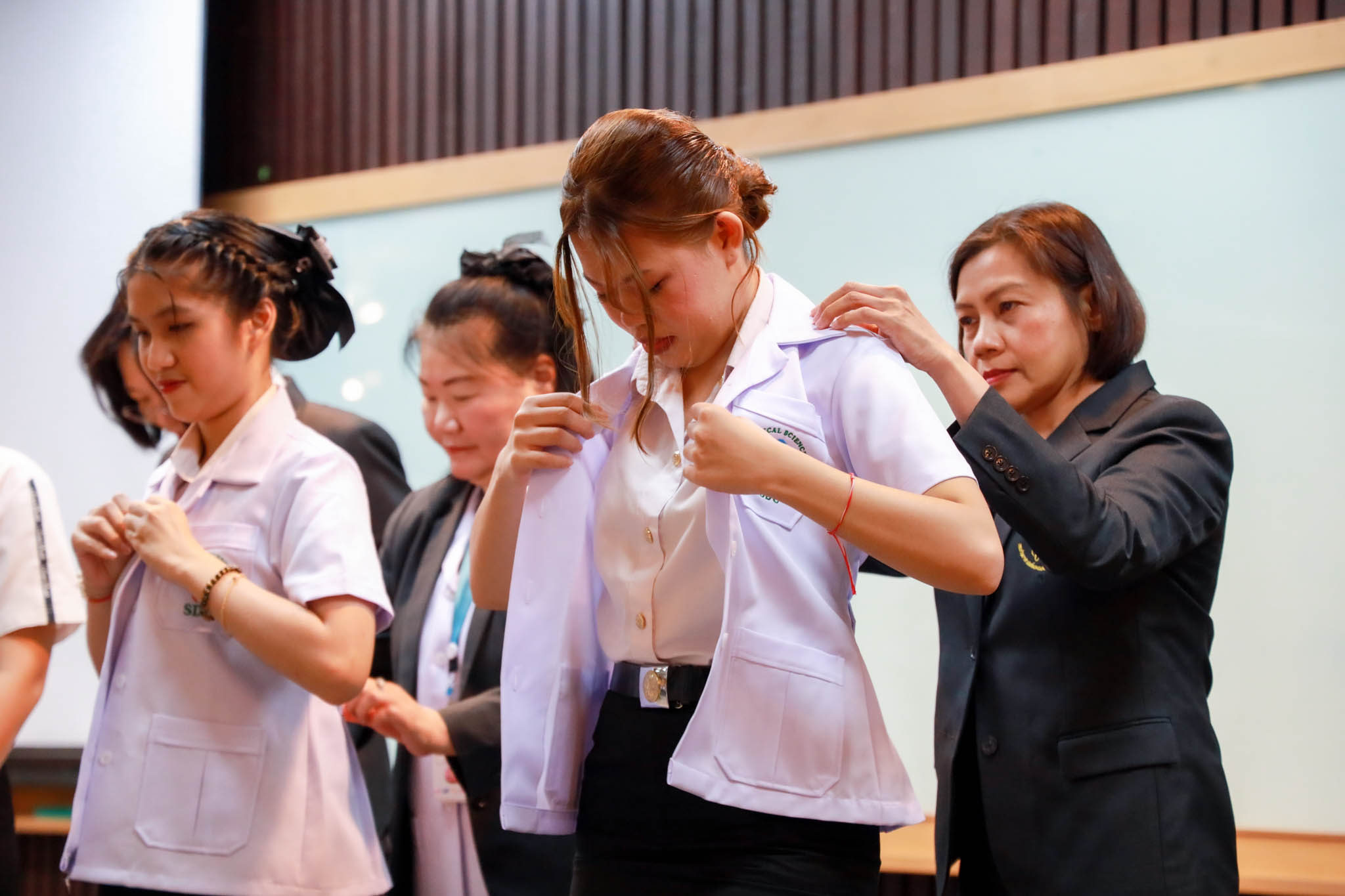 คณะวิทยาศาสตร์และเทคโนโลยี มหาวิทยาลัยสวนดุสิต จัดพิธีมอบเสื้อกาวน์ สำหรับนักศึกษาหลักสูตรวิทยาศาสตร์การแพทย์ แก่นักศึกษาชั้นปีที่ 2/2567 เมื่อวันที่ 30 ตุลาคม 2568 ณ Hall 2 ชั้น 2 อาคารเฉลิมพระเกียรติ 50 พรรษา มหาวชิราลงกรณ ศูนย์วิทยาศาสตร์ มหาวิทยาลัยสวนดุสิต โดยได้รับเกียรติจาก ผู้ช่วยศาสตราจารย์ ดร. ฐิตินาถ สุคนเขตร์ คณบดีคณะวิทยาศาสตร์และเทคโนโลยี เป็นประธานในพิธีและให้โอวาทแก่นักศึกษา ร่วมด้วย ผู้ช่วยศาสตราจารย์ ดร. ยุทธนา พิมพ์ทองงาม ประธานหลักสูตรวิทยาศาสตร์การแพทย์ และคณาจารย์ประจำหลักสูตรเข้าร่วมแสดงความยินดี พิธีดังกล่าวจัดขึ้นเพื่อแสดงถึงการก้าวเข้าสู่เส้นทางแห่งวิชาชีพด้านวิทยาศาสตร์การแพทย์อย่างภาคภูมิ และปลูกฝังจิตสำนึกแห่งความรับผิดชอบในวิชาชีพแก่นักศึกษา ภายในงานมีการกล่าวความรู้สึกโดยประธานรุ่น และการกล่าวคำปฏิญาณโดยรองประธานรุ่น เพื่อแสดงเจตนารมณ์แห่งความมุ่งมั่นในวิชาชีพ ก่อนปิดท้ายด้วยกิจกรรมรุ่นน้องบูมให้รุ่นพี่บริเวณหน้าตึกพยาบาล ท่ามกลางบรรยากาศอบอุ่นและเปี่ยมด้วยความภาคภูมิใจ