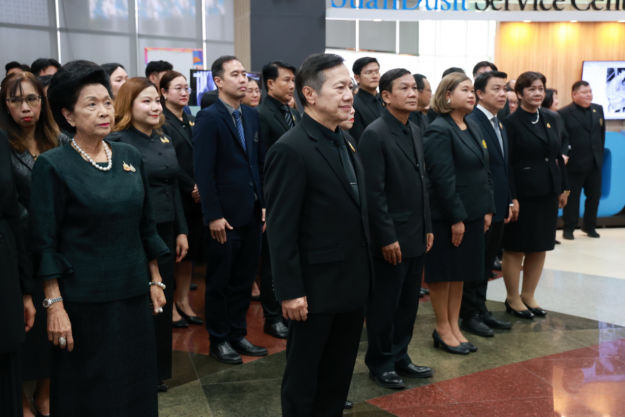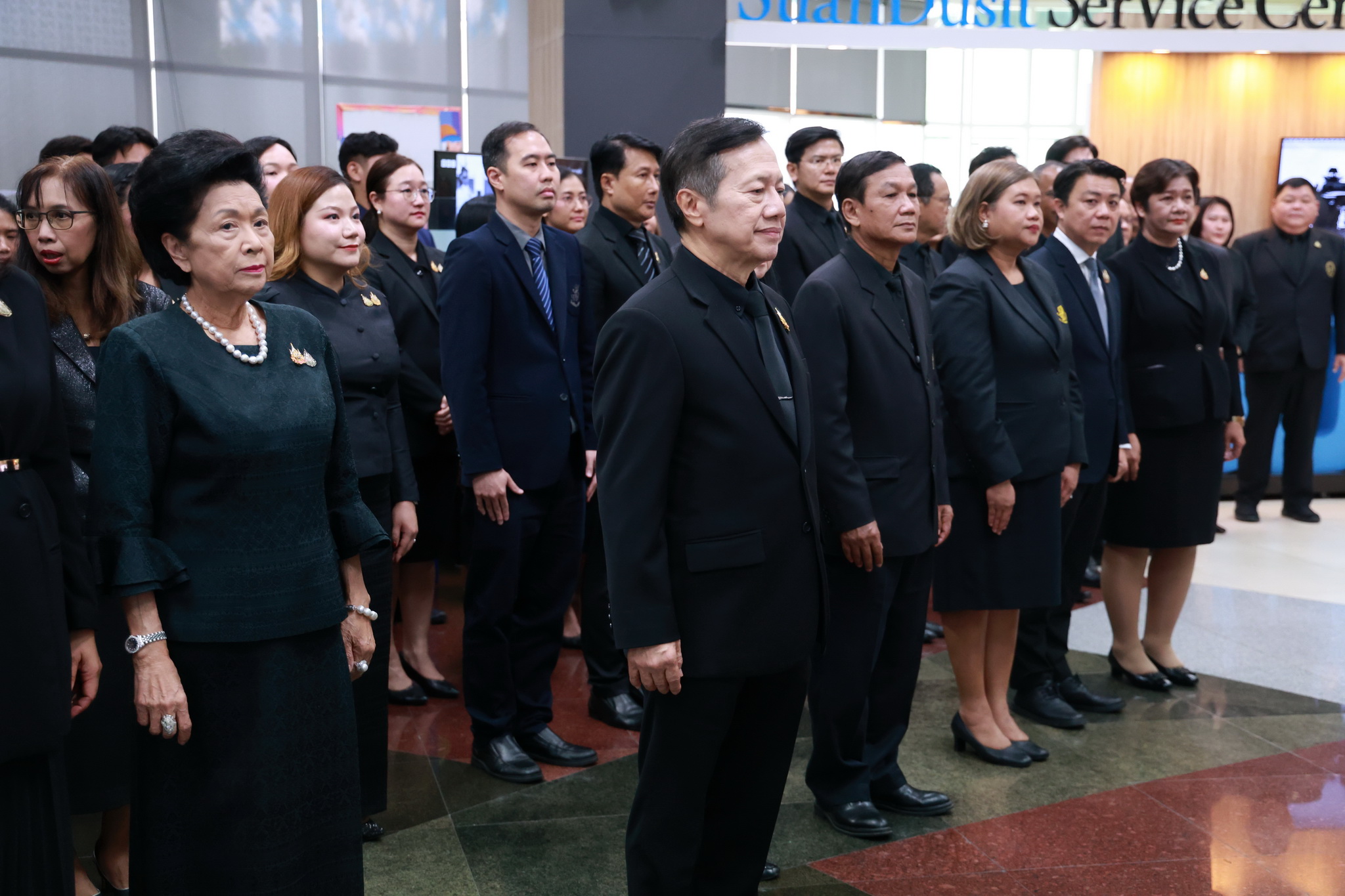 มหาวิทยาลัยสวนดุสิต จัดพิธีถวายความอาลัยและแสดงความจงรักภักดี น้อมรำลึกในพระมหากรุณาธิคุณอย่างหาที่สุดมิได้ต่อ สมเด็จพระนางเจ้าสิริกิติ์ พระบรมราชินีนาถ พระบรมราชชนนีพันปีหลวง โดย ผู้ช่วยศาสตราจารย์ ดร.พิทักษ์ จันทร์เจริญ อธิการบดีมหาวิทยาลัยสวนดุสิต เป็นประธานในพิธี พร้อมด้วย รองอธิการบดี คณบดี ผู้ช่วยอธิการบดี ผู้อำนวยการสถาบัน สำนัก กอง ศูนย์ หัวหน้างาน คณาจารย์ บุคลากร และนักศึกษา มหาวิทยาลัยสวนดุสิต คณะครูและนักเรียน โรงเรียนสาธิตละอออุทิศ เข้าร่วมพิธีถวายความอาลัย ณ ลานอเนกประสงค์ ชั้น 1 อาคารสำนักงานมหาวิทยาลัย มหาวิทยาลัยสวนดุสิต วันพฤหัสบดีที่ 30 ตุลาคม 2568