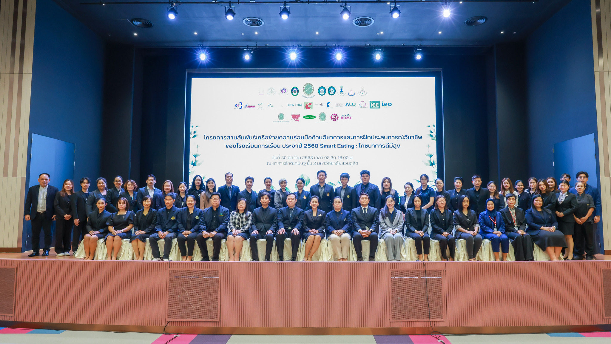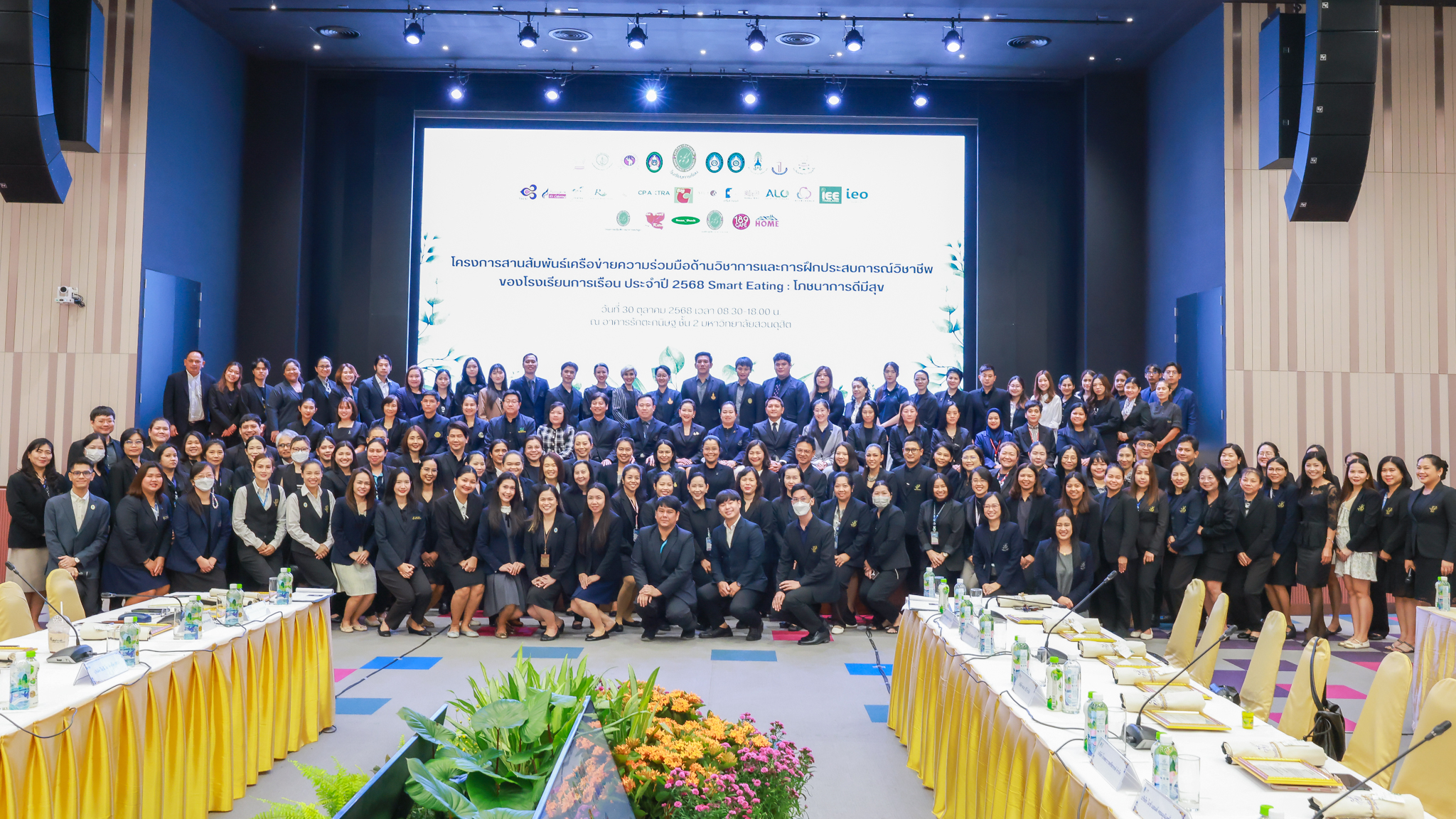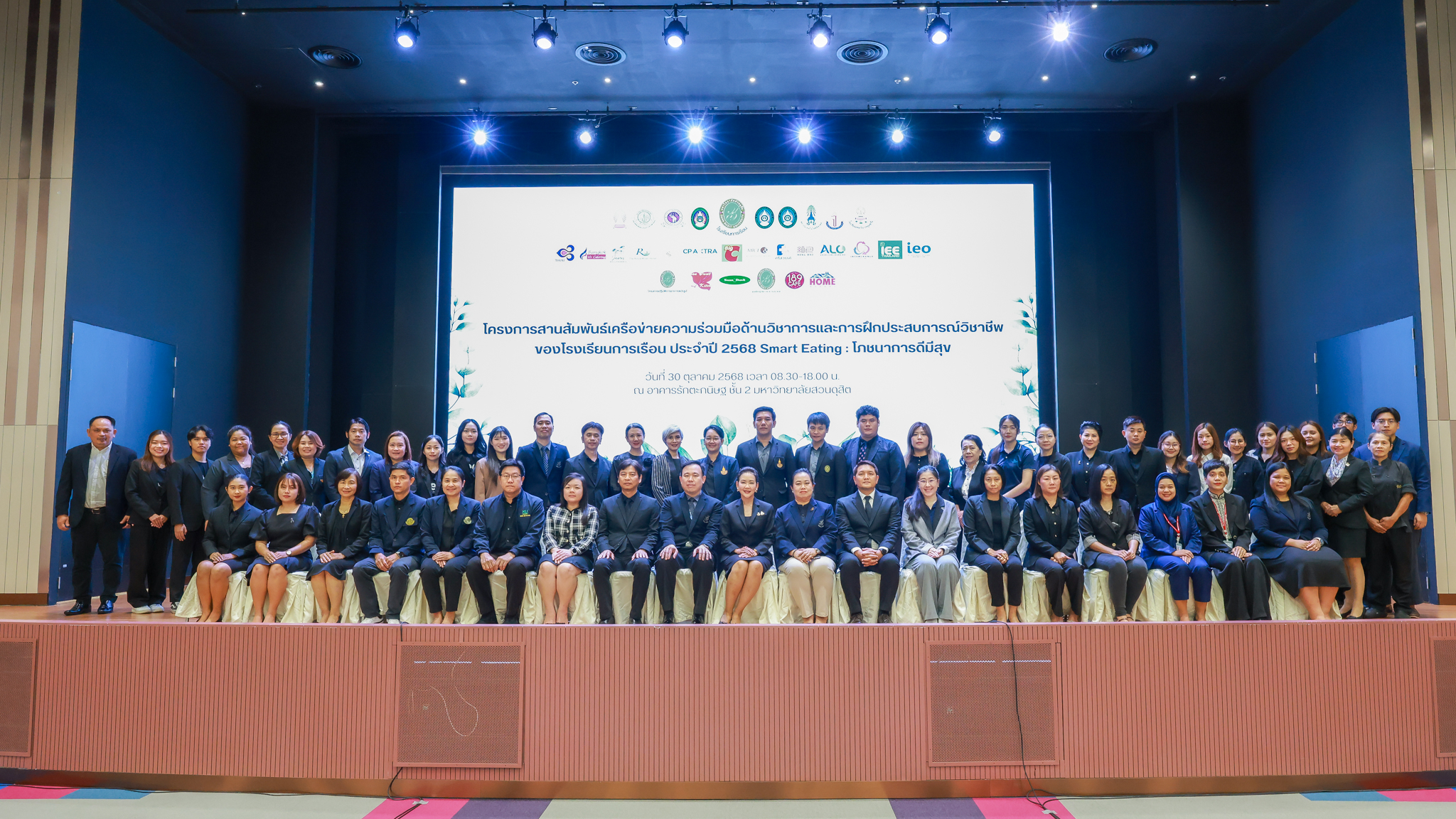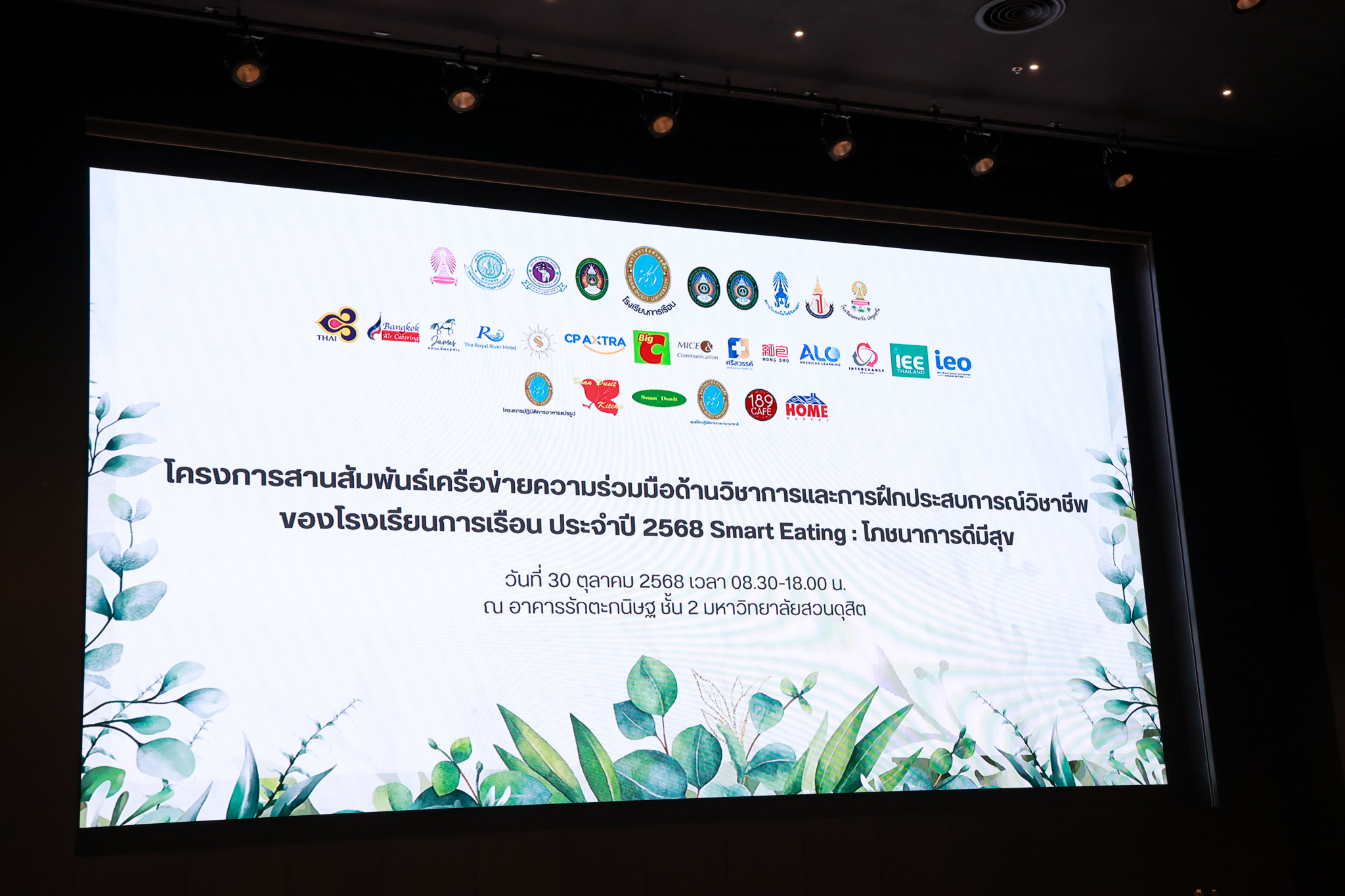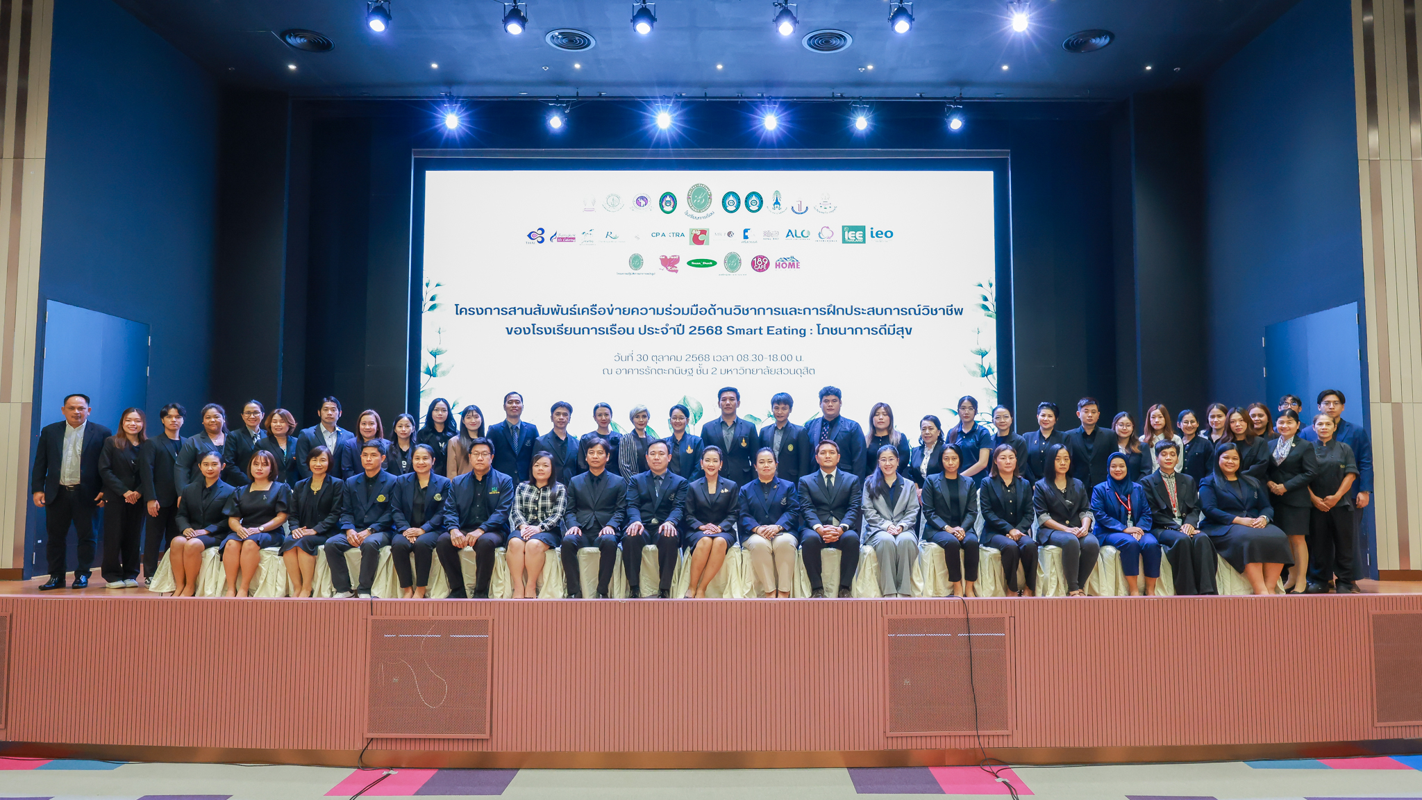 โรงเรียนการเรือน มหาวิทยาลัยสวนดุสิต จัดโครงการสานสัมพันธ์เครือข่ายความร่วมมือด้านวิชาการและการฝึกประสบการณ์วิชาชีพ โรงเรียนการเรือน ปี 2568 – Smart Eating: โภชนาการดีมีสุข โดยได้รับเกียรติจาก ผศ.ดร.พรชณิตว์ แก้วเนตร รองอธิการบดีฝ่ายวิชาการ และกิจการต่างประเทศ เป็นประธานในพิธีเปิดงาน ผศ.ว่าที่ ร.ต. ดร.ธนพัฒน์ แสงรุ่งเรือง คณบดีโรงเรียนการเรียน กล่าวรายงานวัตถุประสงค์การจัดโครงการและนำการประชุมแลกเปลี่ยนแนวทางในการประสานประโยชน์และพัฒนาความร่วมมือด้านวิชาการ และฝึกประสบการณ์วิชาชีพระหว่างโรงเรียนการเรียนและคู่ความร่วมมือ