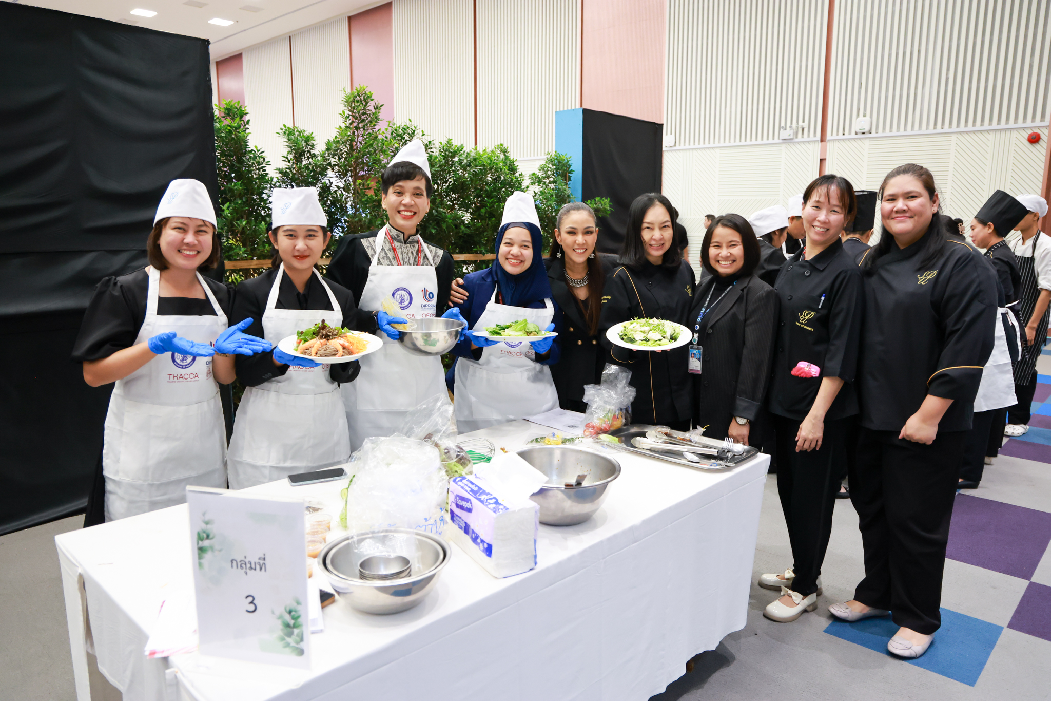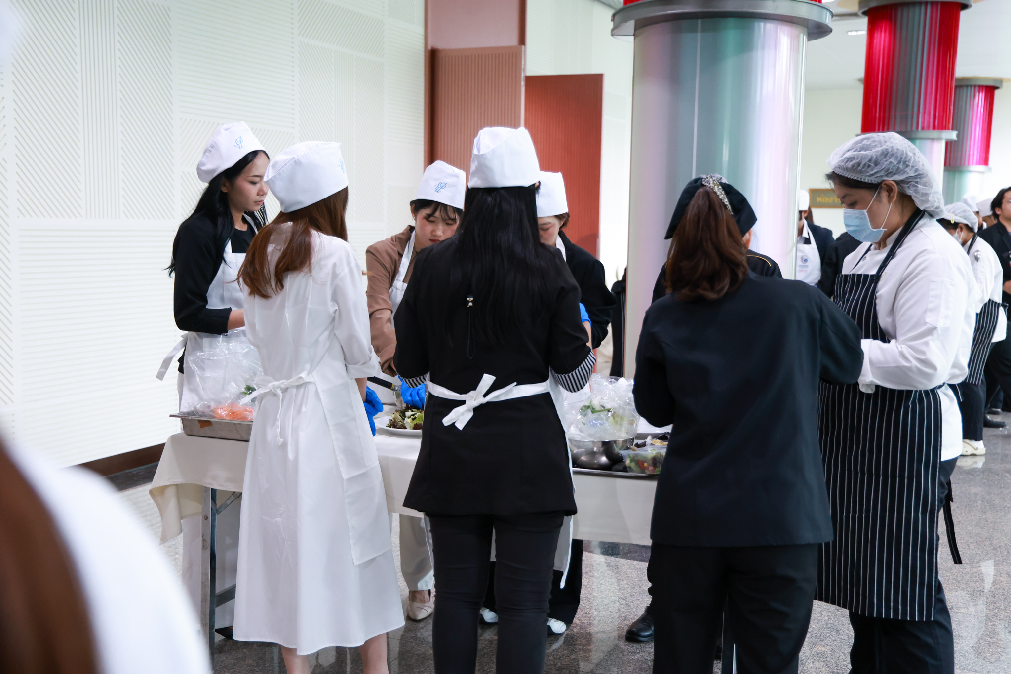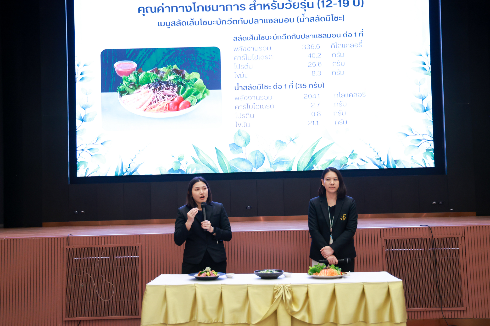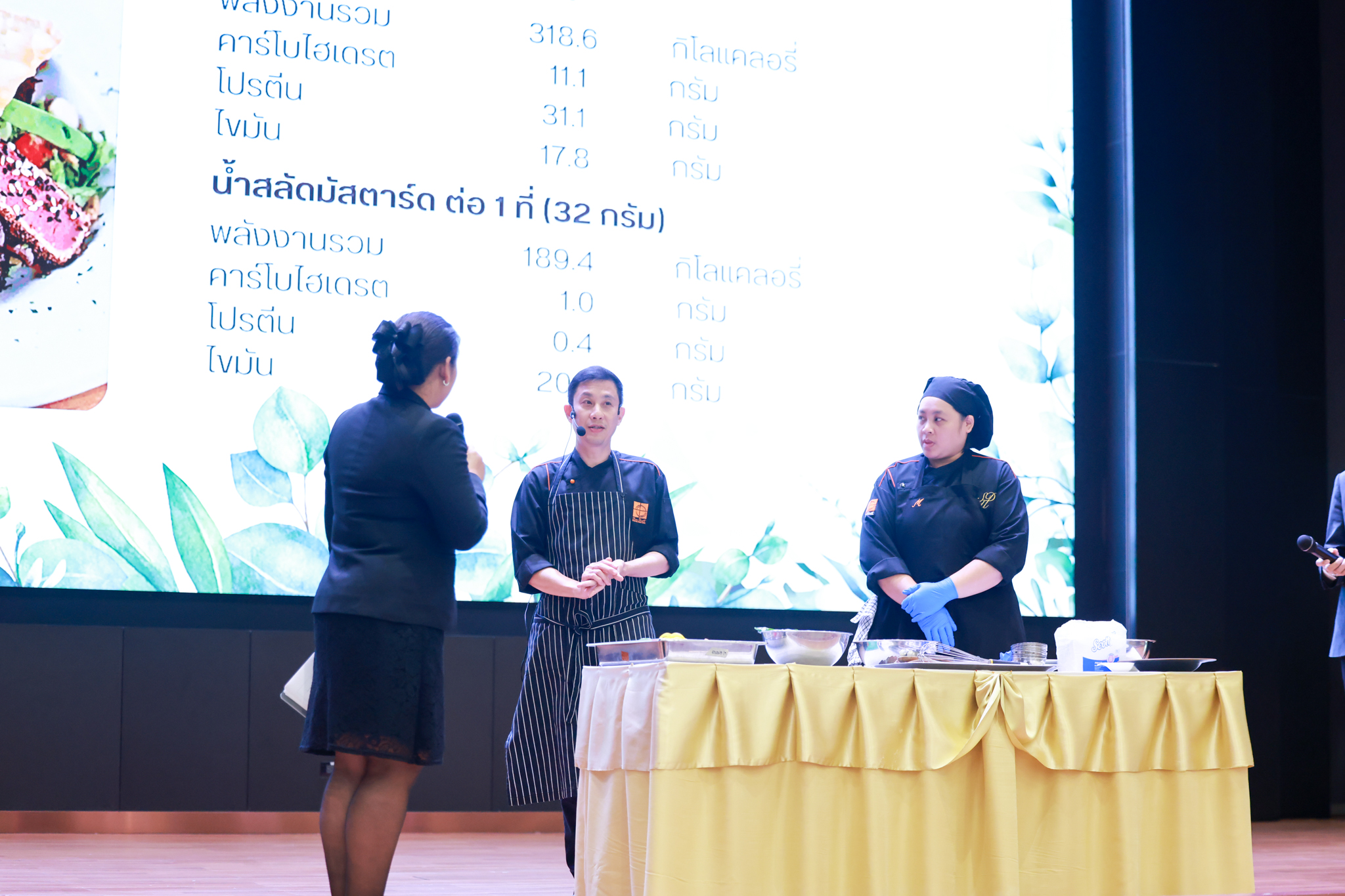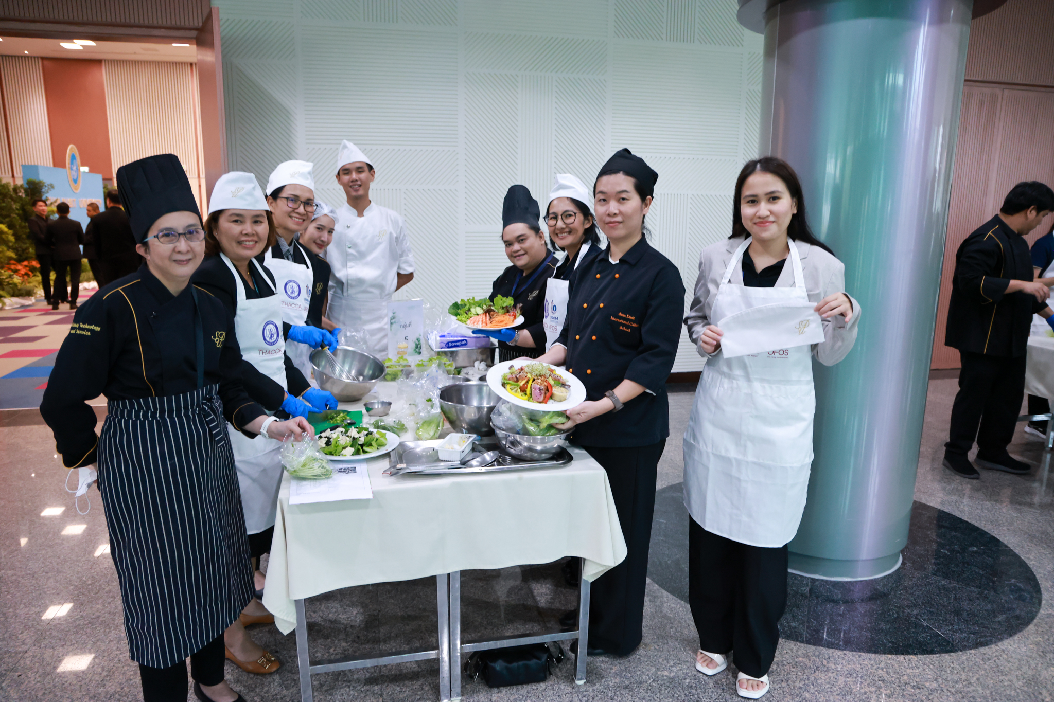 การอบรมเชิงปฏิบัติการอาหารแต่ละช่วงวัย จำนวน 3 รายการ ประกอบด้วย วัยรุ่น (ช่วงอายุ 12-19 ปี) สลัดเส้นโซบะบักวีดกับปลาแซลมอน น้ำสลัดครีมงาญี่ปุ่น วัยทำงาน (ช่วงอายุ 20-60 ปี) สลัดปลาทูน่าอาบูริ น้ำสลัดมิโซะมัสตาร์ดวัยผู้สูงอายุ (ช่วงอายุ 60 ปีขึ้นไป) สลัดเต้าหู้คินุญี่ปุ่น น้ำสลัดงาคั่วญี่ปุ่น โดย อ.จารึก ศรีอรุณ อ.ทัศเทพ อังกุราภินันท์ และ คุณธีรวรรณ ศรีทอง ศูนย์ฝึกปฏิบัติการอาหารนานาชาติ โรงเรียนการเรือน ในช่วงท้ายบรรยายสรุปการ Workshop ด้านโภชนาการ โดย รศ.ดร.ฐิตา ฟูเผ่า และ อาจารย์สุนิทรา ชัยภัย