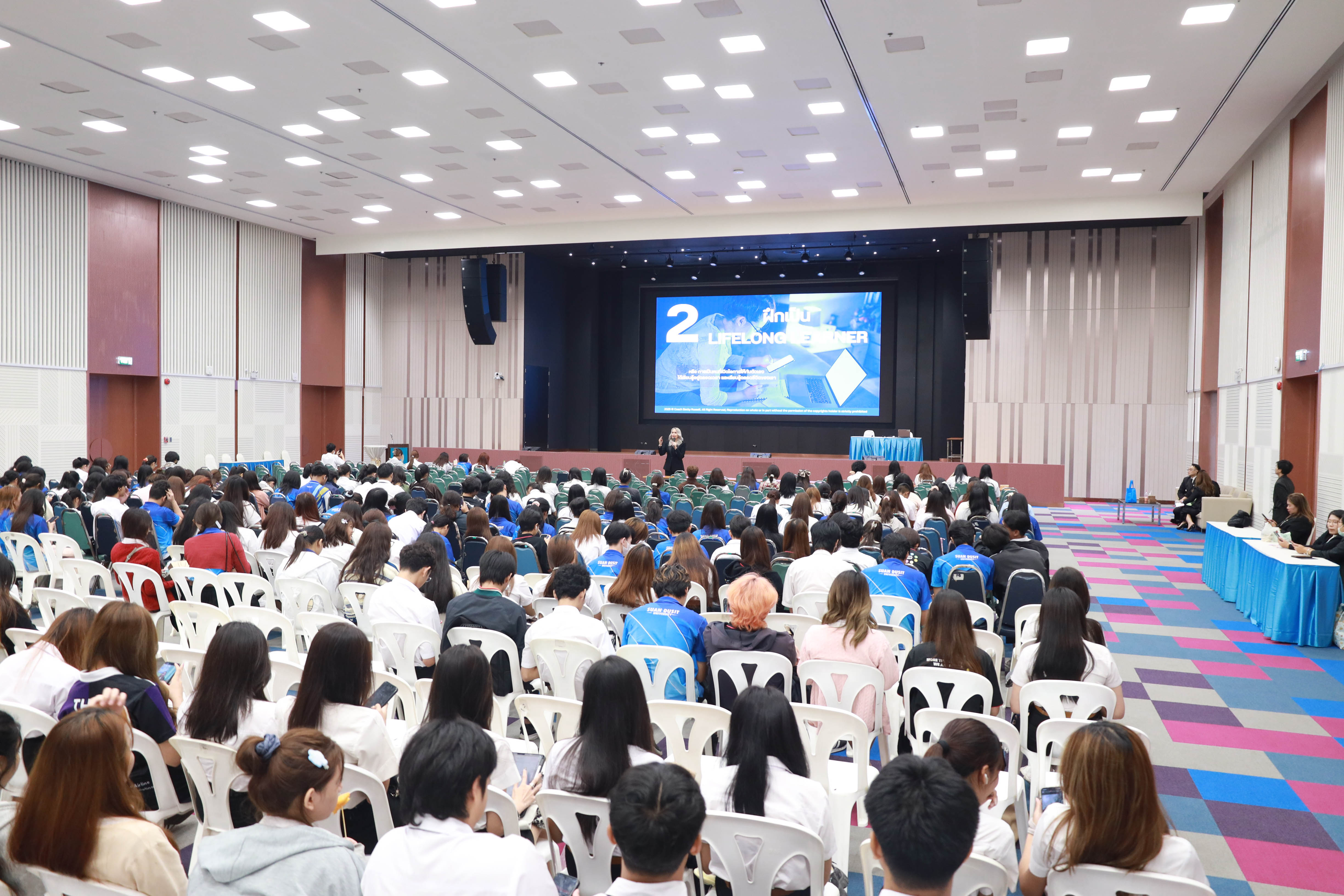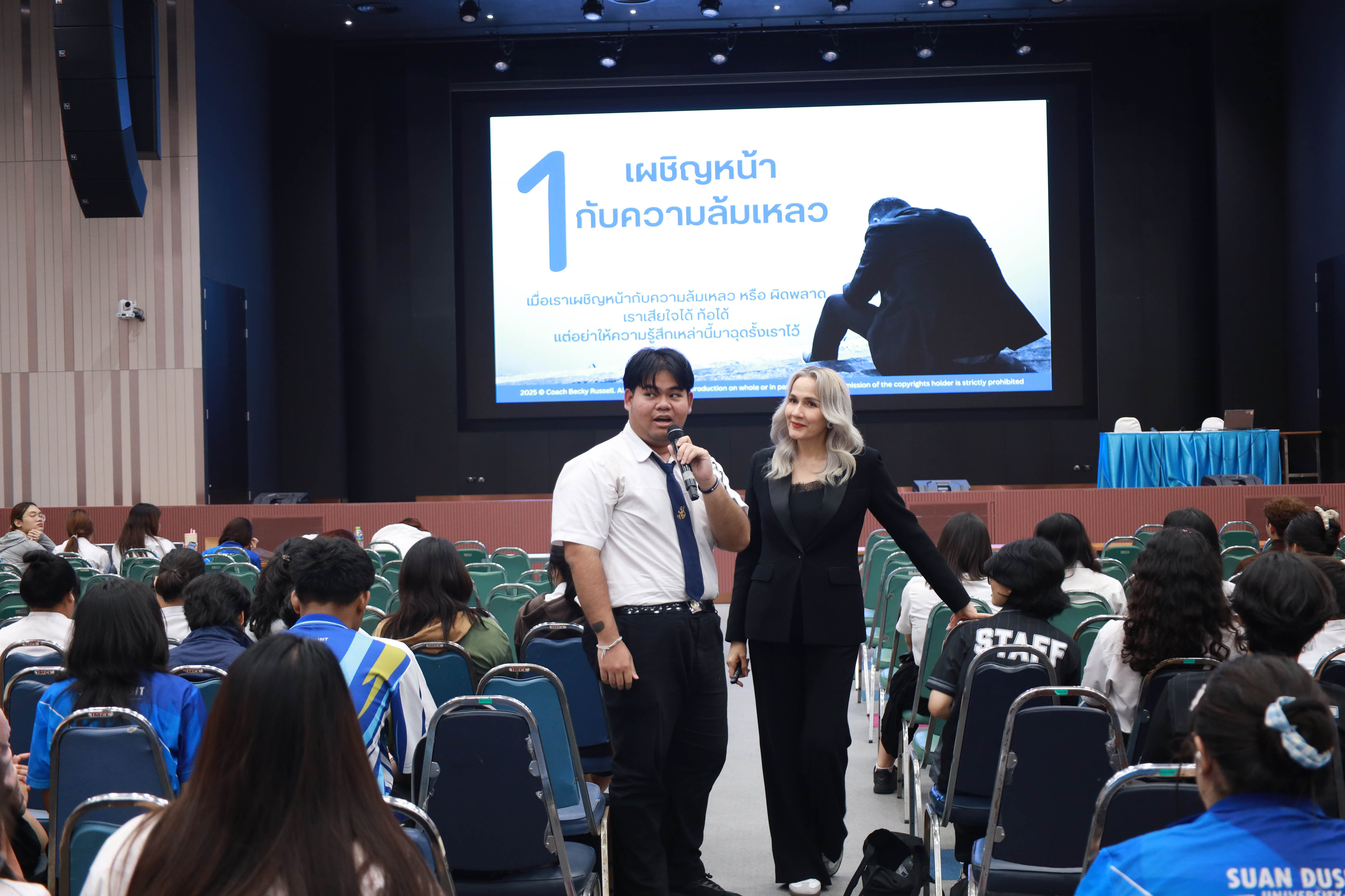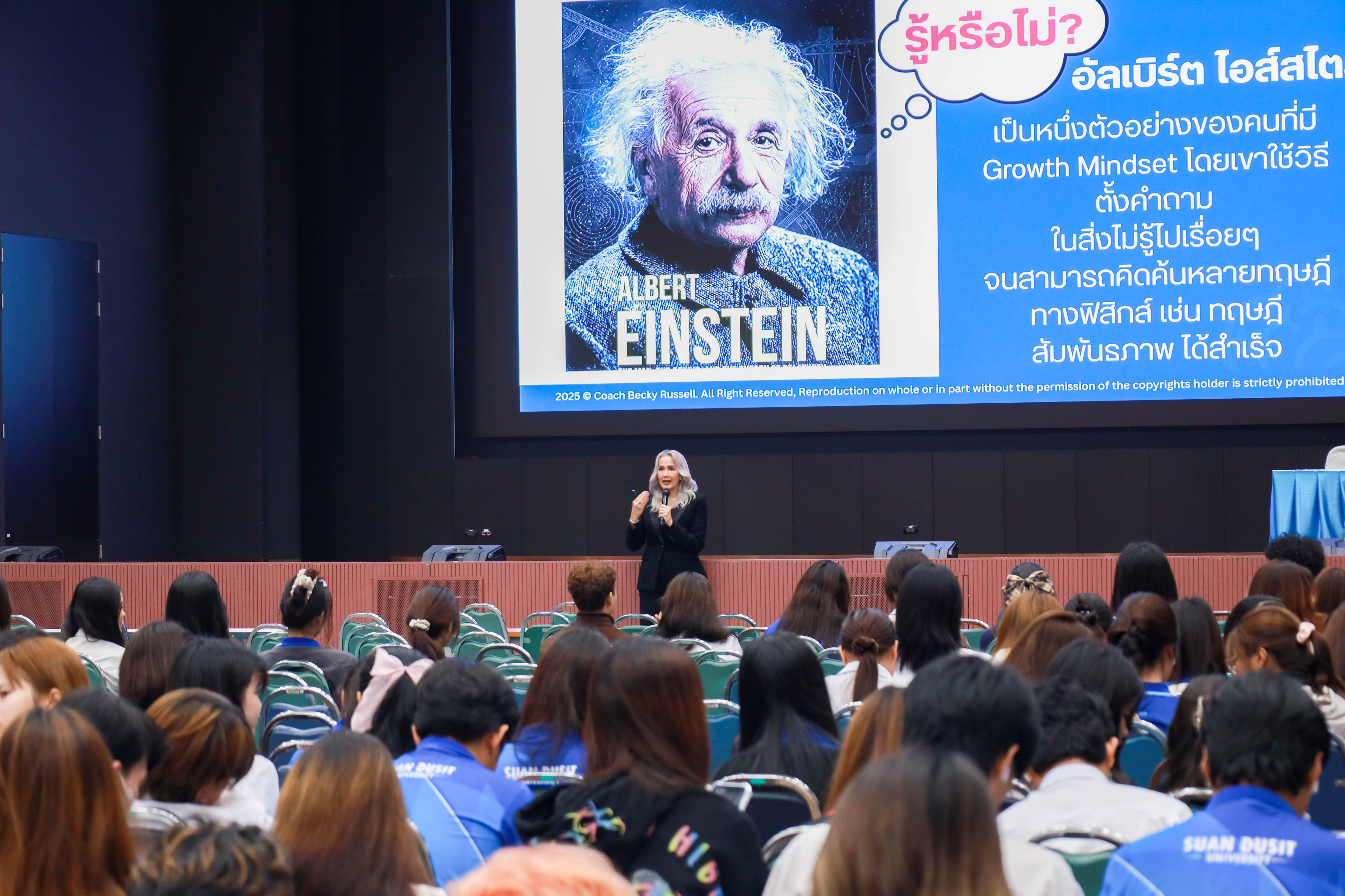 สำนักส่งเสริมวิชาการและงานทะเบียน จัดการเรียนการสอนเชิงประสบการณ์ รายวิชาความเป็นสวนดุสิต ครั้งที่ 2 ภาคเรียนที่ 2/2568 กลุ่มวันพฤหัสบดี ช่วงบ่าย เรื่อง SDU Signature โดยได้รับเกียรติจาก ดร.รมิดา รัสเซลล์ (Coach BECKY) เป็นวิทยากร บรรยายในหัวข้อ ก้าวแรกสู่ความสำเร็จ การพัฒนาจิตใจและบุคลิภาพ Triple B : Be Ready. Be You. Be Great. ใจพร้อม กายเป๊ะ ชีวิตปัง ณ หอประชุมรักตะกนิษฐ มหาวิทยาลัยสวนดุสิต วันพฤหัสบดีที่ 13 พฤศจิกายน 2568