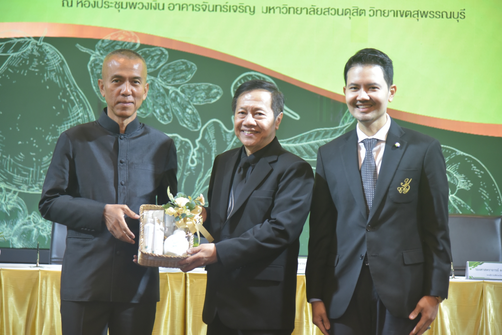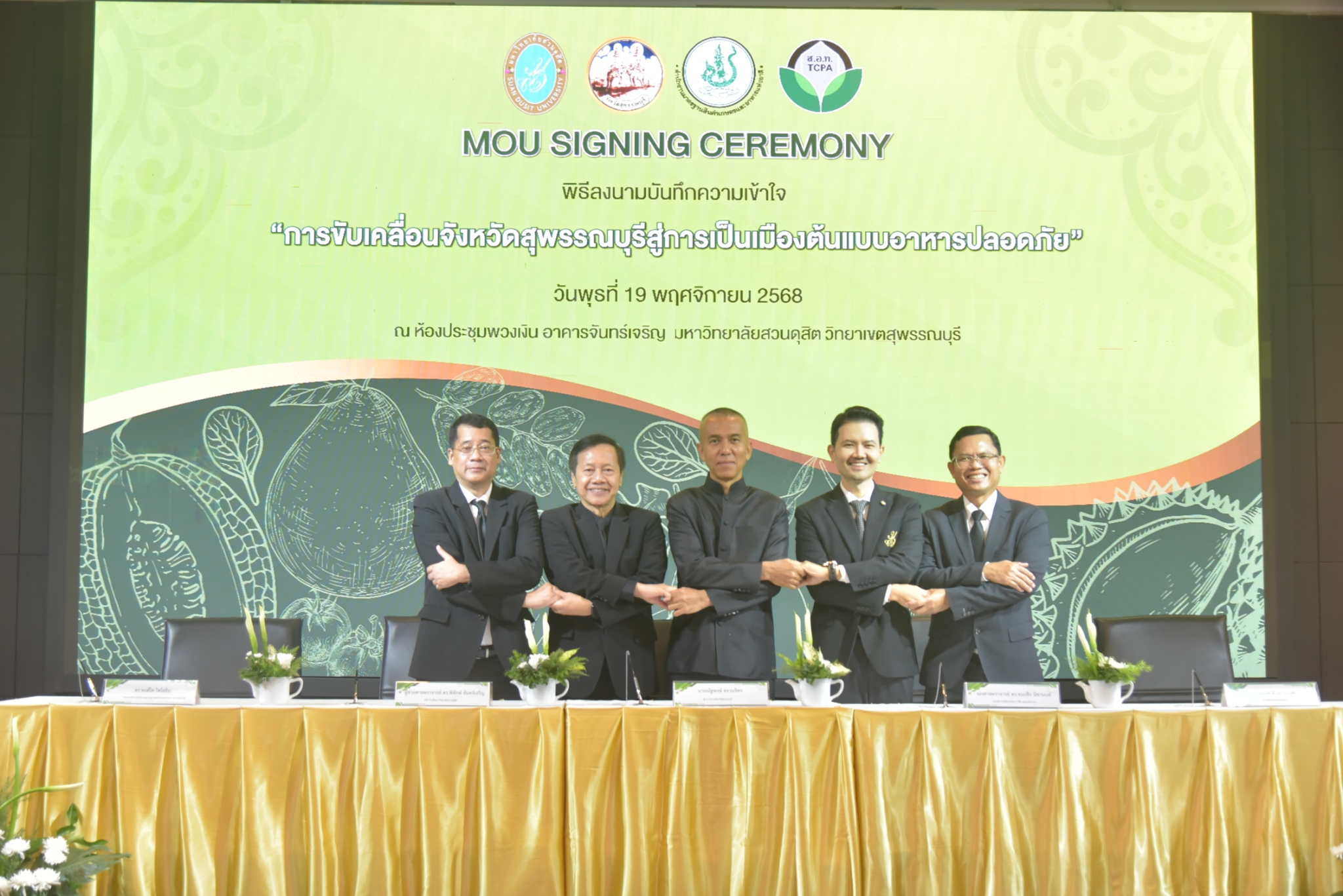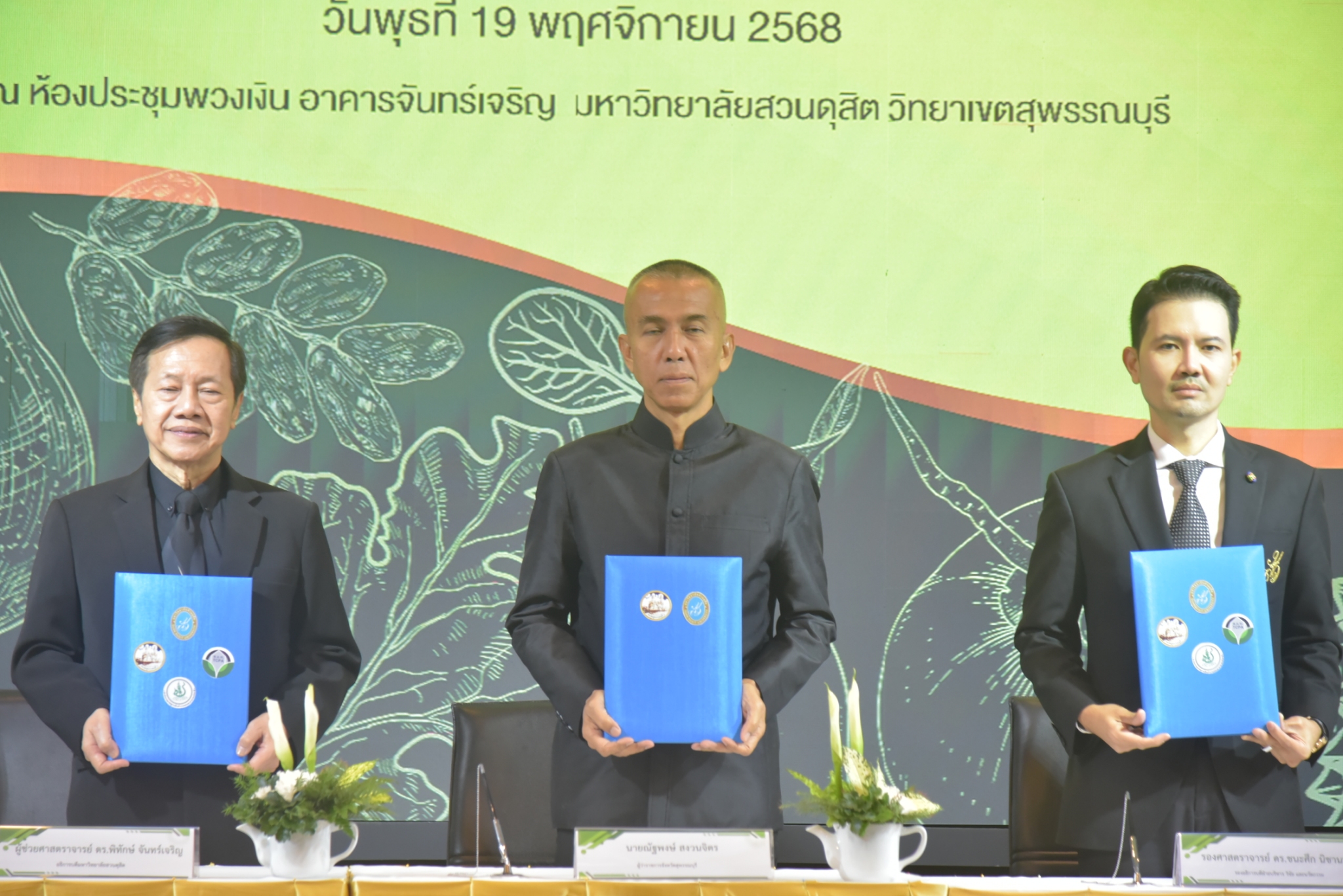 มหาวิทยาลัยสวนดุสิต วิทยาเขตสุพรรณบุรี นำโดย นางกัณณ์อลิน สุอังคะวาทิน ผู้อำนวยการสำนักงานวิทยาเขตสุพรรณบุรี และ นางสาวจุฑารัตน์ จิ๋วสง่า ผู้อำนวยการกองกลาง พร้อมบุคลากร ให้การต้อนรับ สำนักนวัตกรรมชุมชน มหาวิทยาลัยสวนดุสิต ในการจัดพิธีลงนามบันทึกความเข้าใจในการขับเคลื่อนจังหวัดสุพรรณบุรีสู่การเป็นเมืองต้นแบบอาหารปลอดภัย ระหว่างมหาวิทยาลัยสวนดุสิตกับสำนักงานมาตรฐานสินค้าเกษตรและอาหารแห่งชาติ สมาคมอารักขาพืชไทย และจังหวัดสุพรรณบุรี โดยได้รับเกียรติจาก นายณัฐพงษ์ สงวนจิตร ผู้ว่าราชการจังหวัดสุพรรณบุรี ดร.พงศ์ไท ไทโยธิน รองเลขาธิการ มกอช. นายสมศักดิ์ สมานวงศ์ นายกสมาคม อารักขาพืชไทย ผู้ช่วยศาสตราจารย์ ดร.พิทักษ์ จันทร์เจริญ อธิการบดี มหาวิทยาลัยสวนดุสิต และรองศาสตราจารย์ ดร.ชนะศึก นิชานนท์ รองอธิการบดีฝ่ายบริหารวิจัย และนวัตกรรม มหาวิทยาลัยสวนดุสิต ให้เกียรติเข้าร่วมลงในฐานะตัวแทนของหน่วยงาน โดยมีหัวหน้าส่วนราชการ ผู้บริหารมหาวิทยาลัย บุคลากร นักศึกษาและเกษตรกรให้ความสนใจเข้าร่วมเป็นจำนวนมาก นอกจากนี้ ภายในงานยังมีกิจกรรมการจัดแสดงบูธนิทรรศการสินค้าเกษตรและสินค้าแปรรูปที่ได้รับการรับรองมาตรฐานเกษตรปลอดภัย (GAP) และมาตรฐานแบรนด์น้องเหน่อของจังหวัดสุพรรณบุรี จำนวน 15 บูธ ตลอดจนกิจกรรมการเสวนาภายใต้โครงการ “การยกระดับห่วงโซ่คุณค่าปลาสลิดดอนกำยานเพื่อขับเคลื่อนเศรษฐกิจสร้างสรรค์” ในวันพุธที่ 19 พฤศจิกายน 2568  เวลา 09.00-15.00 น. ณ ห้องประชุมพวงเงิน ศูนย์ฝึกปฏิบัติการอาหารมุสลิม (อาคารจันทร์เจริญ) มหาวิทยาลัยสวนดุสิต วิทยาเขตสุพรรณบุรี