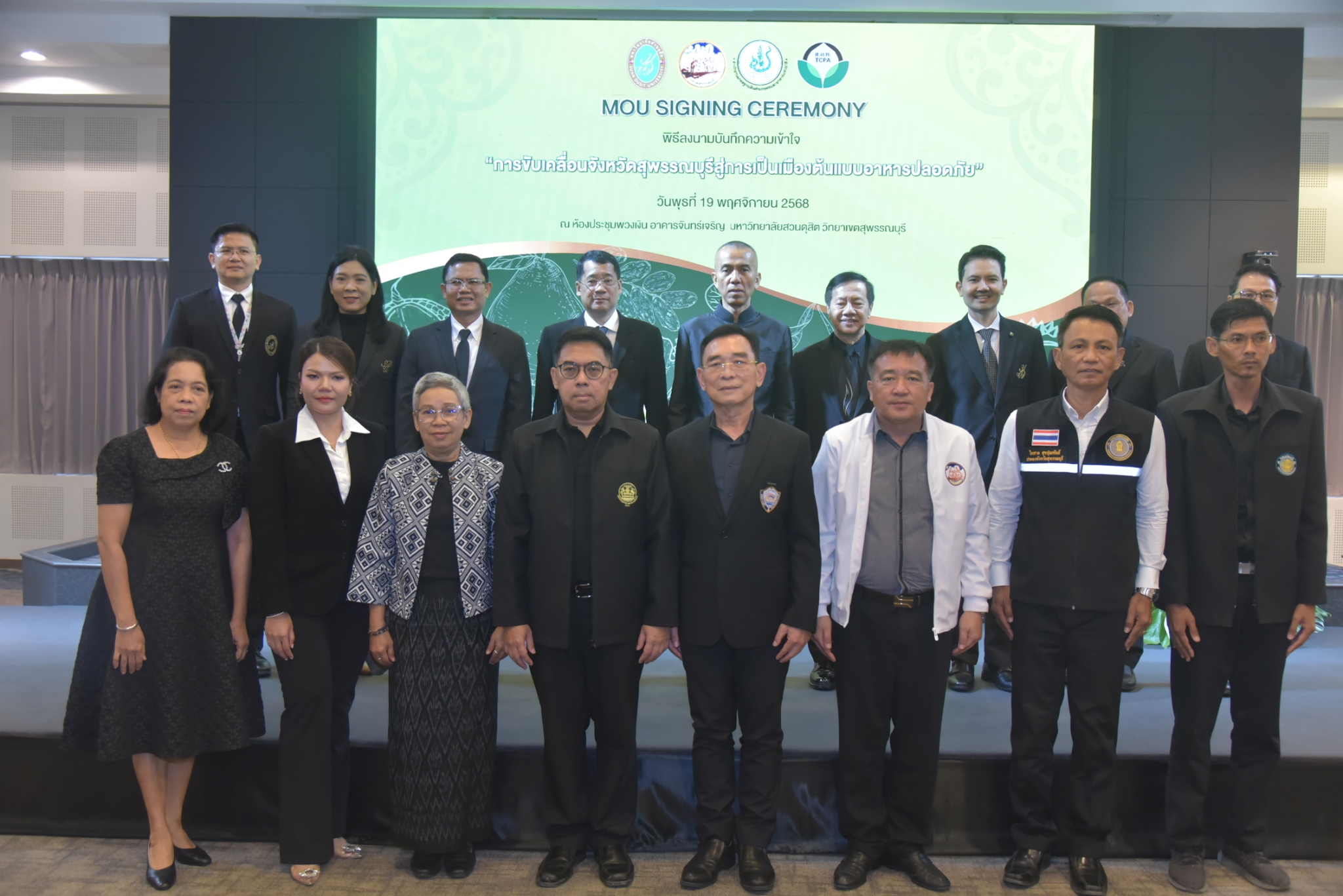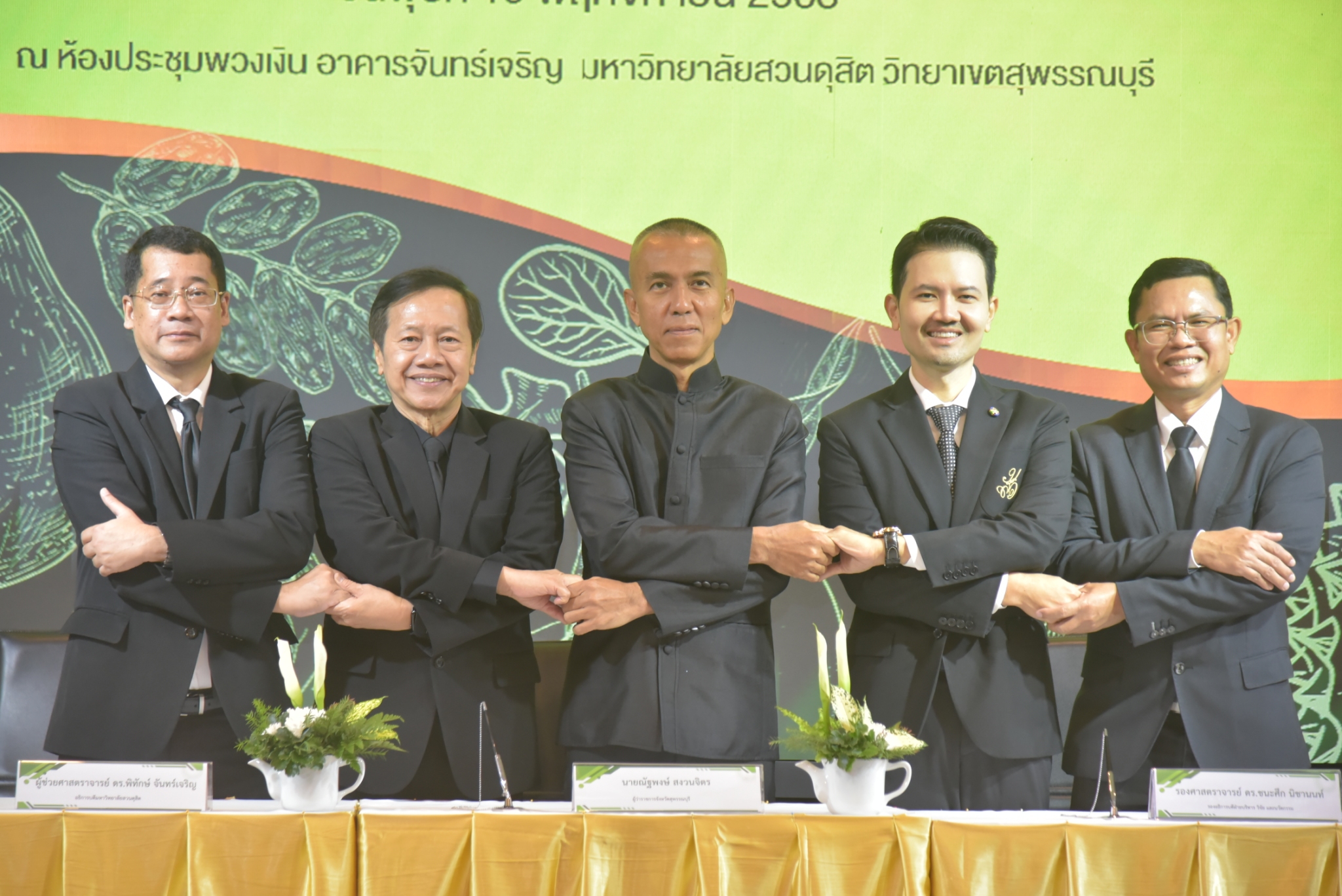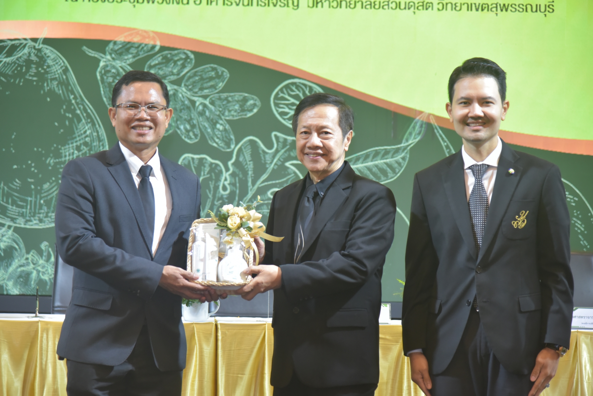 มหาวิทยาลัยสวนดุสิต วิทยาเขตสุพรรณบุรี นำโดย นางกัณณ์อลิน สุอังคะวาทิน ผู้อำนวยการสำนักงานวิทยาเขตสุพรรณบุรี และ นางสาวจุฑารัตน์ จิ๋วสง่า ผู้อำนวยการกองกลาง พร้อมบุคลากร ให้การต้อนรับ สำนักนวัตกรรมชุมชน มหาวิทยาลัยสวนดุสิต ในการจัดพิธีลงนามบันทึกความเข้าใจในการขับเคลื่อนจังหวัดสุพรรณบุรีสู่การเป็นเมืองต้นแบบอาหารปลอดภัย ระหว่างมหาวิทยาลัยสวนดุสิตกับสำนักงานมาตรฐานสินค้าเกษตรและอาหารแห่งชาติ สมาคมอารักขาพืชไทย และจังหวัดสุพรรณบุรี โดยได้รับเกียรติจาก นายณัฐพงษ์ สงวนจิตร ผู้ว่าราชการจังหวัดสุพรรณบุรี ดร.พงศ์ไท ไทโยธิน รองเลขาธิการ มกอช. นายสมศักดิ์ สมานวงศ์ นายกสมาคม อารักขาพืชไทย ผู้ช่วยศาสตราจารย์ ดร.พิทักษ์ จันทร์เจริญ อธิการบดี มหาวิทยาลัยสวนดุสิต และรองศาสตราจารย์ ดร.ชนะศึก นิชานนท์ รองอธิการบดีฝ่ายบริหารวิจัย และนวัตกรรม มหาวิทยาลัยสวนดุสิต ให้เกียรติเข้าร่วมลงในฐานะตัวแทนของหน่วยงาน โดยมีหัวหน้าส่วนราชการ ผู้บริหารมหาวิทยาลัย บุคลากร นักศึกษาและเกษตรกรให้ความสนใจเข้าร่วมเป็นจำนวนมาก นอกจากนี้ ภายในงานยังมีกิจกรรมการจัดแสดงบูธนิทรรศการสินค้าเกษตรและสินค้าแปรรูปที่ได้รับการรับรองมาตรฐานเกษตรปลอดภัย (GAP) และมาตรฐานแบรนด์น้องเหน่อของจังหวัดสุพรรณบุรี จำนวน 15 บูธ ตลอดจนกิจกรรมการเสวนาภายใต้โครงการ “การยกระดับห่วงโซ่คุณค่าปลาสลิดดอนกำยานเพื่อขับเคลื่อนเศรษฐกิจสร้างสรรค์” ในวันพุธที่ 19 พฤศจิกายน 2568  เวลา 09.00-15.00 น. ณ ห้องประชุมพวงเงิน ศูนย์ฝึกปฏิบัติการอาหารมุสลิม (อาคารจันทร์เจริญ) มหาวิทยาลัยสวนดุสิต วิทยาเขตสุพรรณบุรี