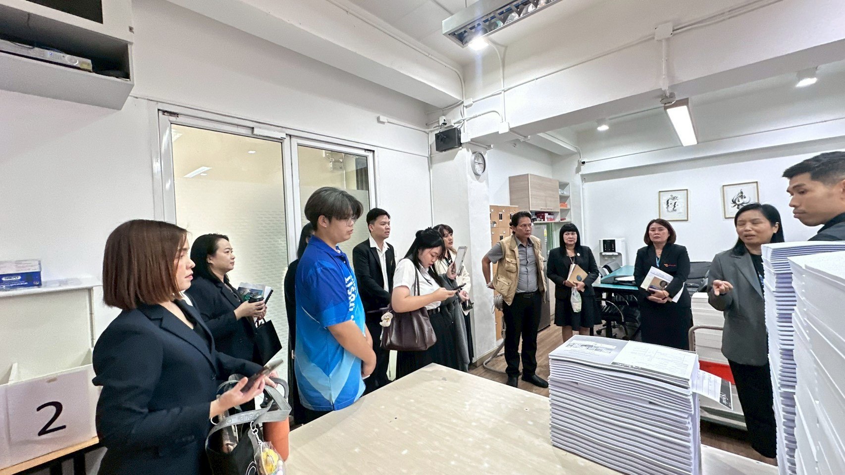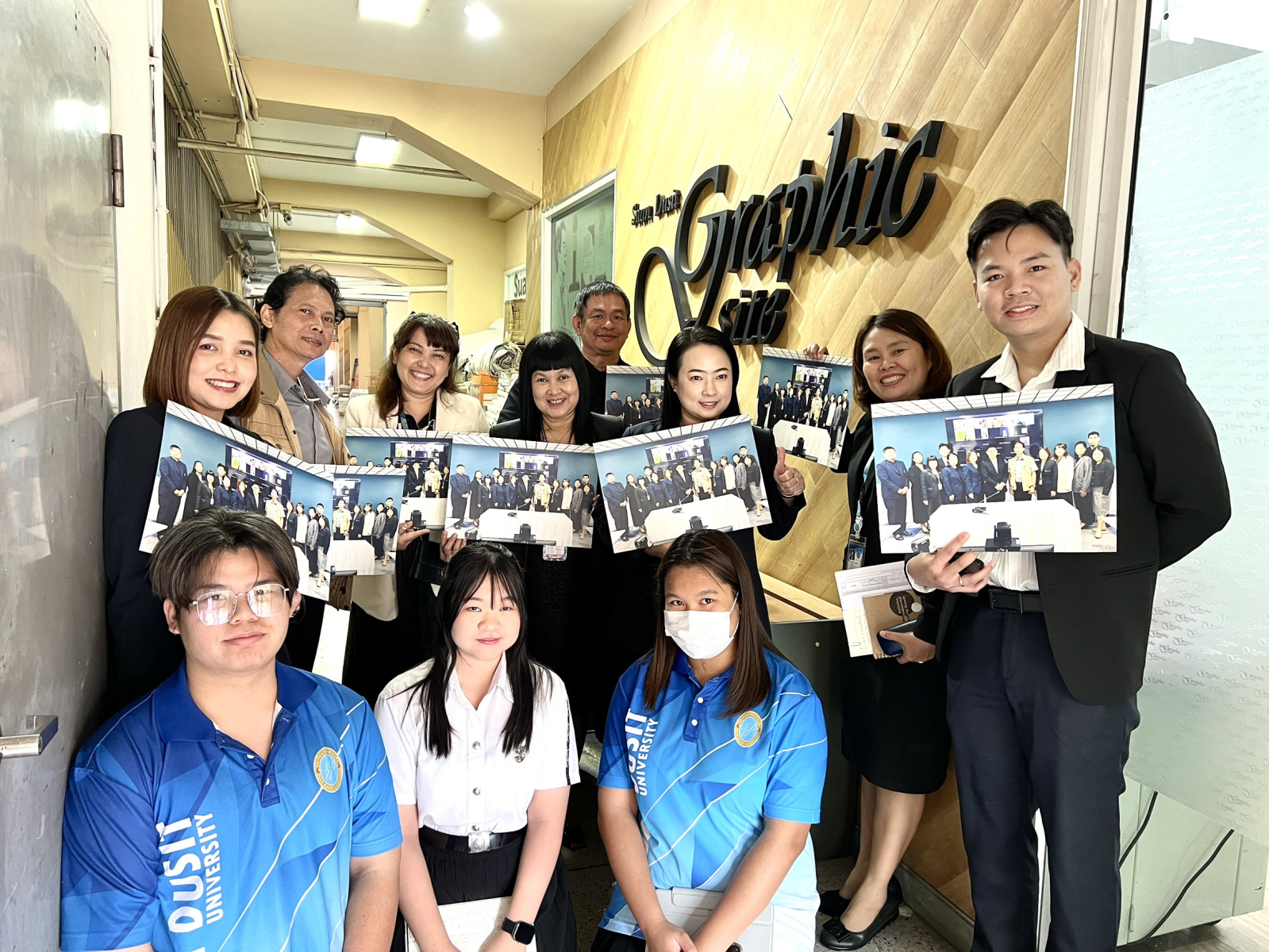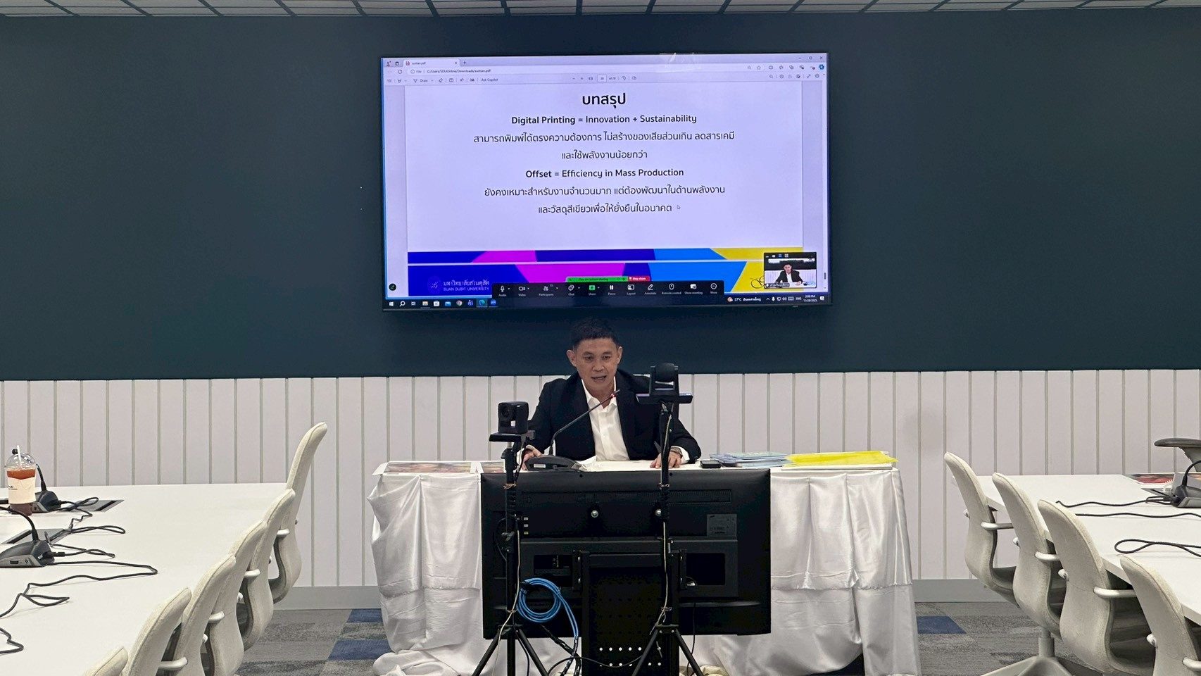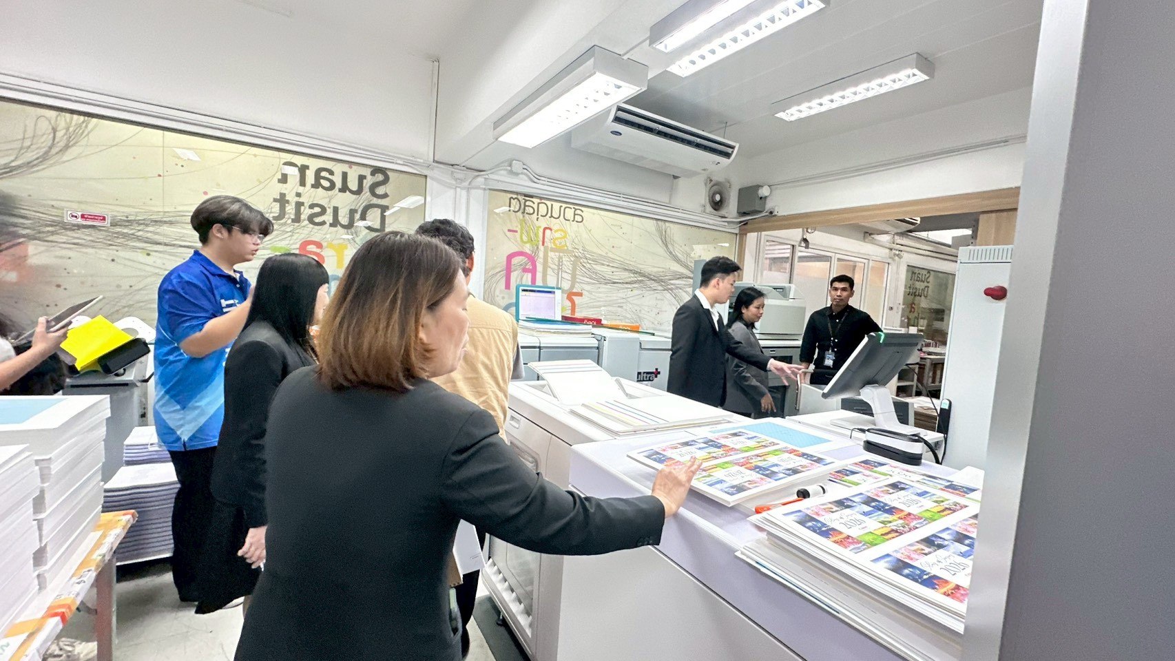 วันที่ 28 พฤศจิกายน 2568 เวลา 13.00 น. ณ ห้องประชุม The Library Cafe มหาวิทยาลัยสวนดุสิต ผู้ช่วยศาสตราจารย์ ดร.วิโรจน์ เทพบุตร ผู้อำนวยการศูนย์บริการสื่อและสิ่งพิมพ์กราฟฟิคไซท์ ได้ให้เกียรติบรรยายเกี่ยวกับ “ศูนย์บริการสื่อและสิ่งพิมพ์กราฟฟิคไซท์” ให้กับคณะทำงาน SDU SMART #2 ซึ่งเป็นกิจกรรม Onboarding ครั้งที่ 17: เรียนรู้งานสื่อและสิ่งพิมพ์ เพื่อให้คณะทำงาน SDU SMART #2 ได้รู้จักส่วนงาน/หน่วยงานต่างๆ ที่เป็นหลักของมหาวิทยาลัย เพื่อให้ทราบพันธกิจของส่วนงาน/หน่วยงาน และนำมาเป็นข้อมูลในการดำเนินงานพัฒนามหาวิทยาลัยตามที่ได้รับมอบหมาย ต่อไป และคณะทำงานได้เยี่ยมชมกระบวนการทำงานของศูนย์บริการสื่อและสิ่งพิมพ์กราฟฟิคไซท์ อย่างไกล้ชิด