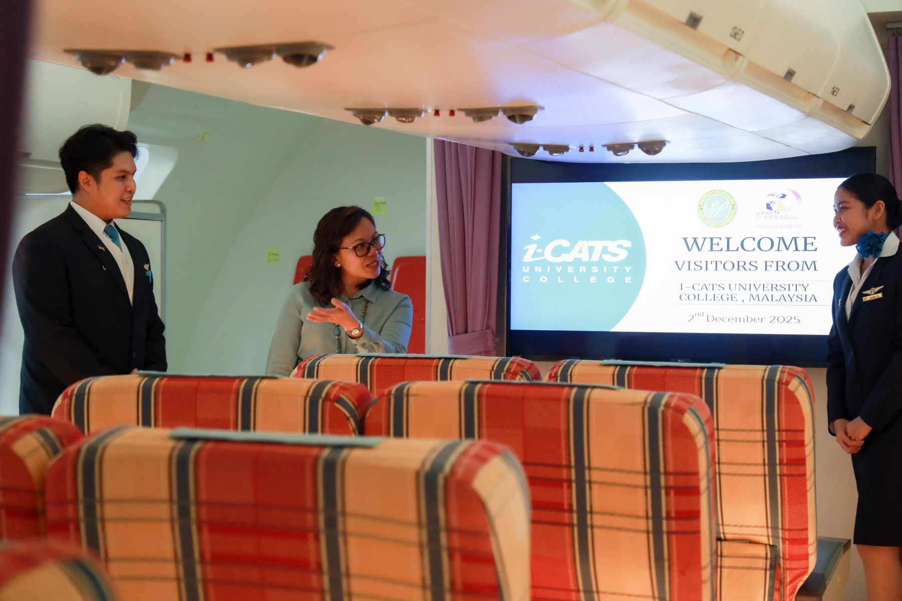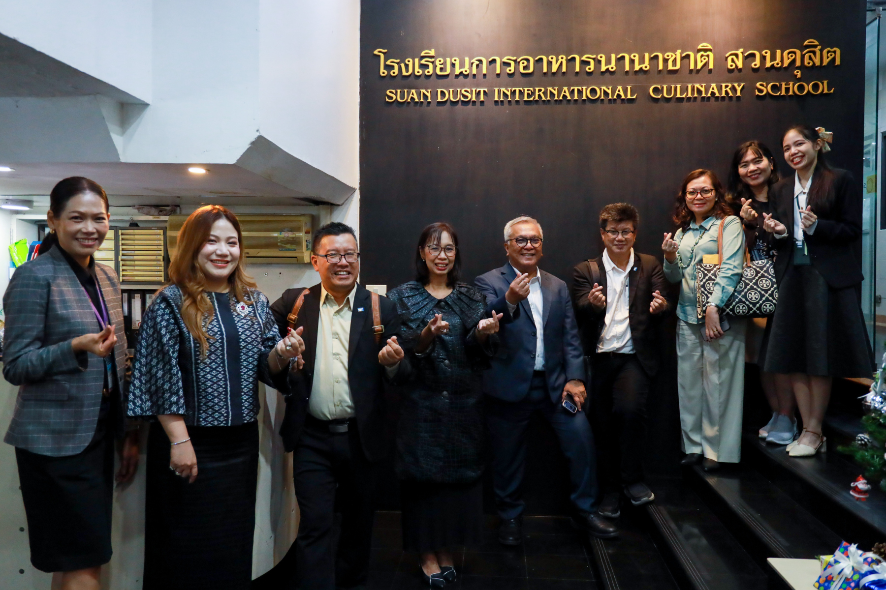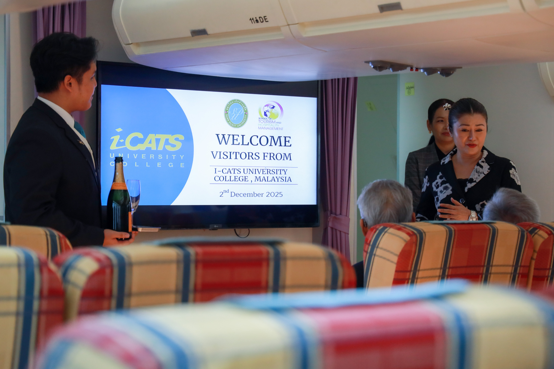 ผู้ช่วยศาสตราจารย์ ดร.พิมพ์มาดา วิชาศิลป์ คณบดีโรงเรียนการท่องเที่ยวและการบริการ กล่าวต้อนรับคณะศึกษาดูงานจาก I-CATS University College ประเทศมาเลเซีย โดยมีวัตถุประสงค์เพื่อพูดคุยและหารือข้อตกลงทางวิชาการ ณ ห้องประชุมลำพอง 2 ทั้งนี้ มีการเยี่ยมชมโรงแรมสวนดุสิต เพลส ห้องปฏิบัติการจำลองบนเครื่องบิน (Mock – up) ศูนย์ฝึกปฏิบัติการอาหารนานาชาติ (Suan Dusit International Culinary Center) และ Home Bakery มหาวิทยาลัยสวนดุสิต ในวันที่ 2 ธันวาคม 2568
