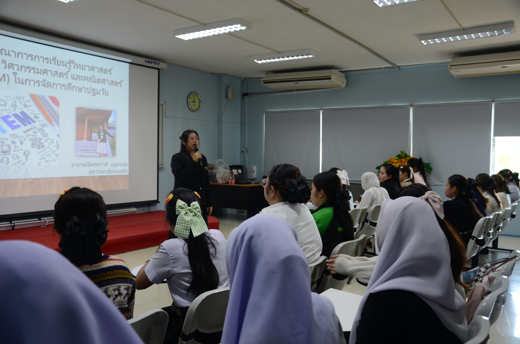 มหาวิทยาลัยสวนดุสิต ศูนย์การศึกษา นครนายก หลักสูตรศึกษาศาสตรบัณฑิต สาขาวิชาการศึกษาปฐมวัย อาจารย์ฉัตรทราวดี บุญถนอม ได้รับเชิญเป็นวิทยากรในการอบรม เรื่อง “คุณธรรม จริยธรรม และความเป็นพลเมืองดี ด้านการรักชาติ ศาสนา พระมหากษัตริย์” ให้นักศึกษาชั้นปีที่ 1 จำนวน 100 คน และเรื่อง “การบูรณาการการเรียนรู้วิทยาศาสตร์ เทคโนโลยีวิศวกรรมศาสตร์ และคณิตศาสตร์ (STEM) ในการจัดการศึกษาปฐมวัย” นักศึกษาชั้นปีที่ 3 จำนวน 50 คน ในวันที่ 1 ธันวาคม 2568 เวลา 09.00 – 16.00 น. ณ ห้องประชุม 19101 คณะศึกษาศาสตร์ มหาวิทยาลัยกรุงเทพธนบุรี