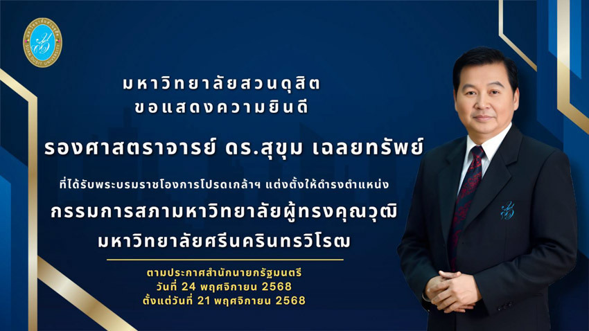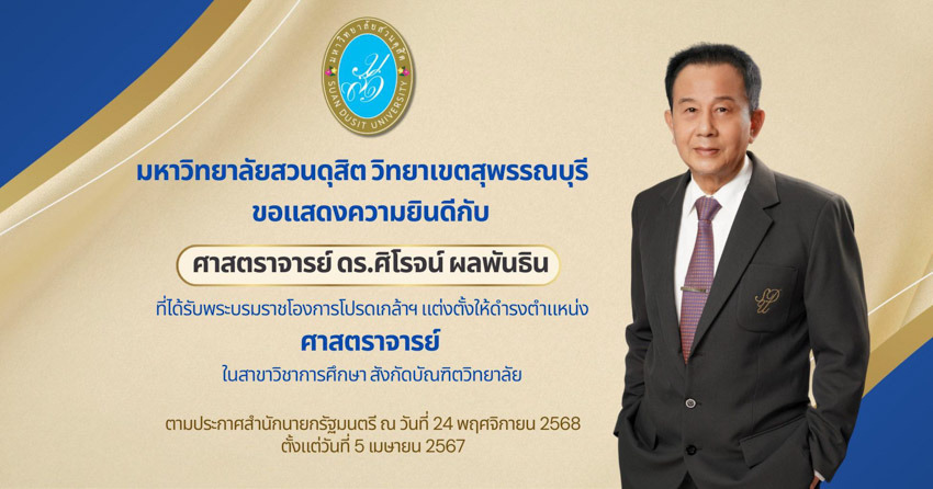 มหาวิทยาลัยสวนดุสิต วิทยาเขตสุพรรณบุรี นำโดย ดร.วรานี เวสสุนทรเทพ รองอธิการบดีฝ่ายวิทยาเขตสุพรรณบุรี พร้อมคณะผู้บริหารและบุคลากรฯ ร่วมแสดงความยินดีกับ ศาสตราจารย์ ดร.ศิโรจน์ ผลพันธิน ในโอกาสที่ได้รับพระบรมราชโองการโปรดเกล้าฯ แต่งตั้งให้ดำรงตำแหน่ง “ศาสตราจารย์” สาขาวิชาการศึกษา สังกัดบัณฑิตวิทยาลัย ตามประกาศสำนักนายกรัฐมนตรี ณ วันที่ 24 พฤศจิกายน 2568 และ รองศาสตราจารย์ ดร.สุขุม เฉลยทรัพย์ ในโอกาสที่ได้รับพระบรมราชโองการโปรดเกล้าฯ แต่งตั้งให้ดำรงตำแหน่ง “กรรมการสภามหาวิทยาลัยผู้ทรงคุณวุฒิ มหาวิทยาลัยศรีนครินทรวิโรฒ” ตามประกาศสำนักนายกรัฐมนตรี ณ วันที่ 24 พฤศจิกายน 2568