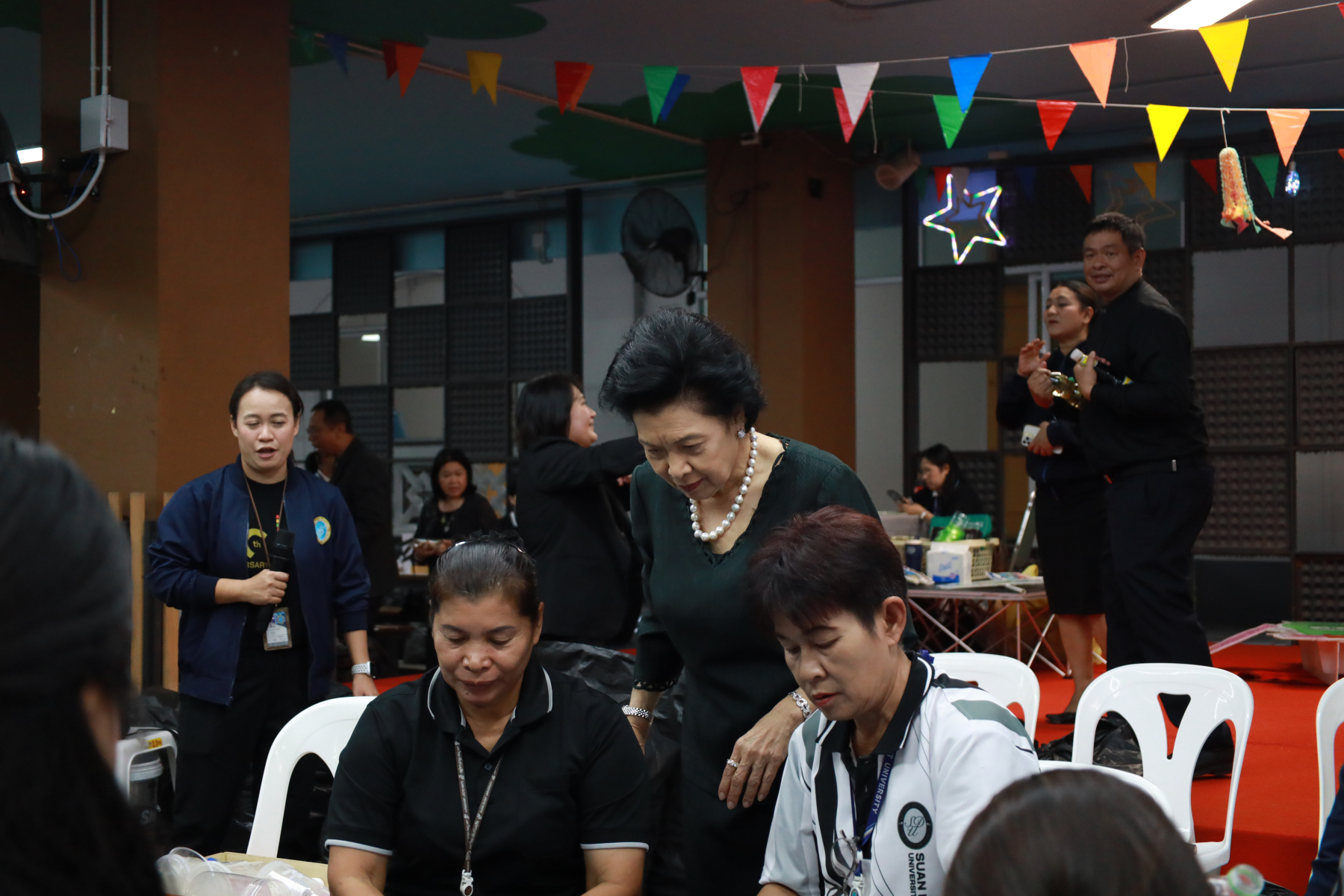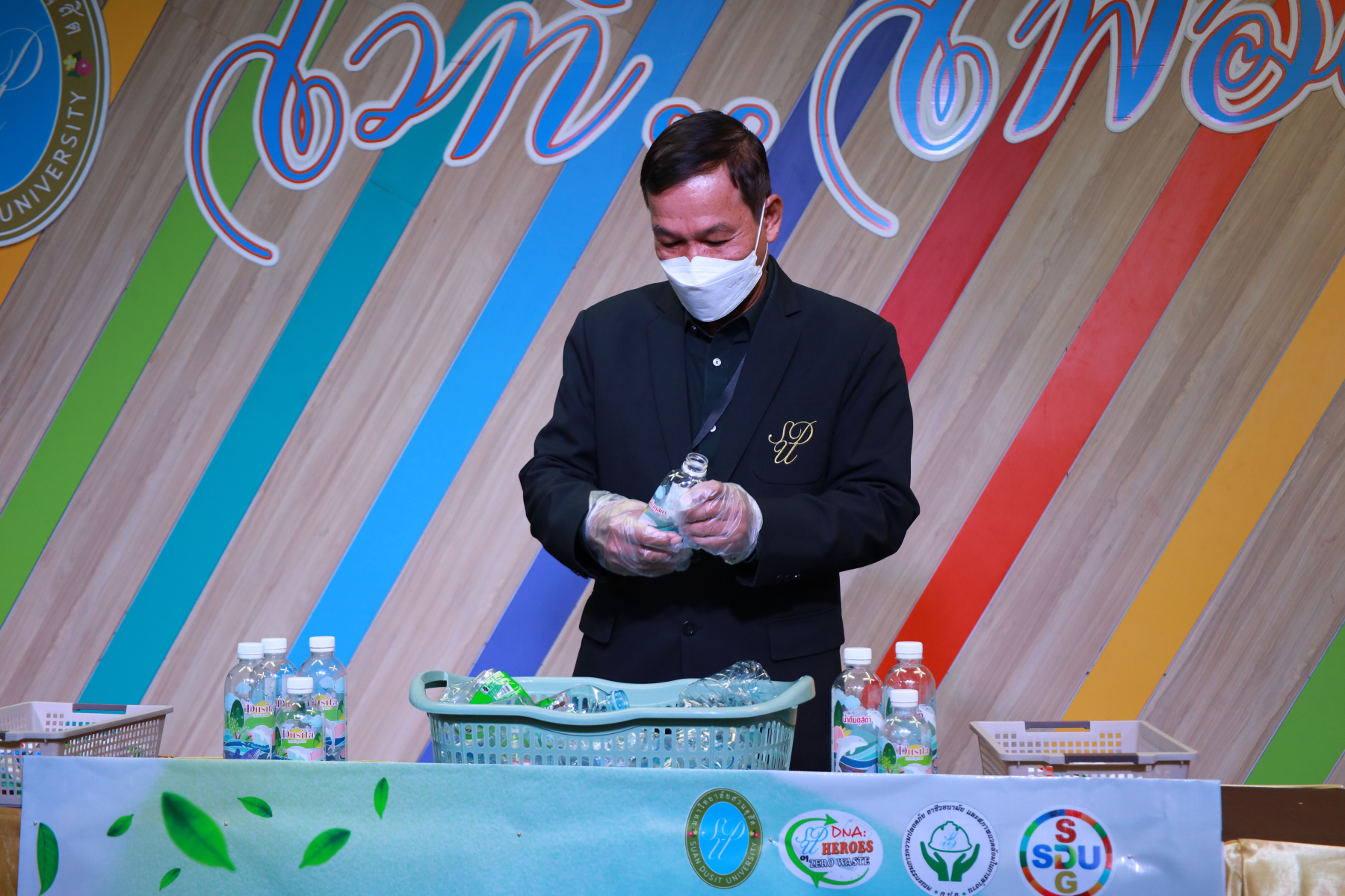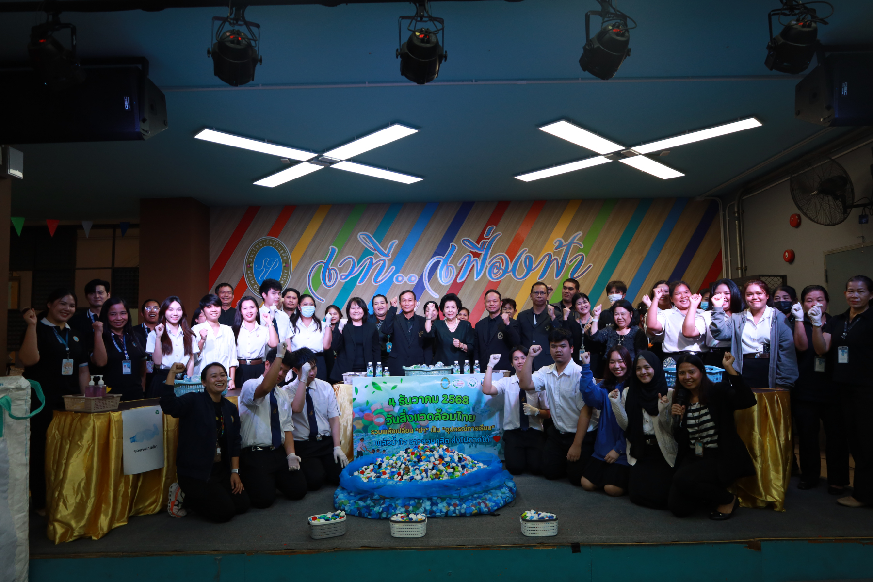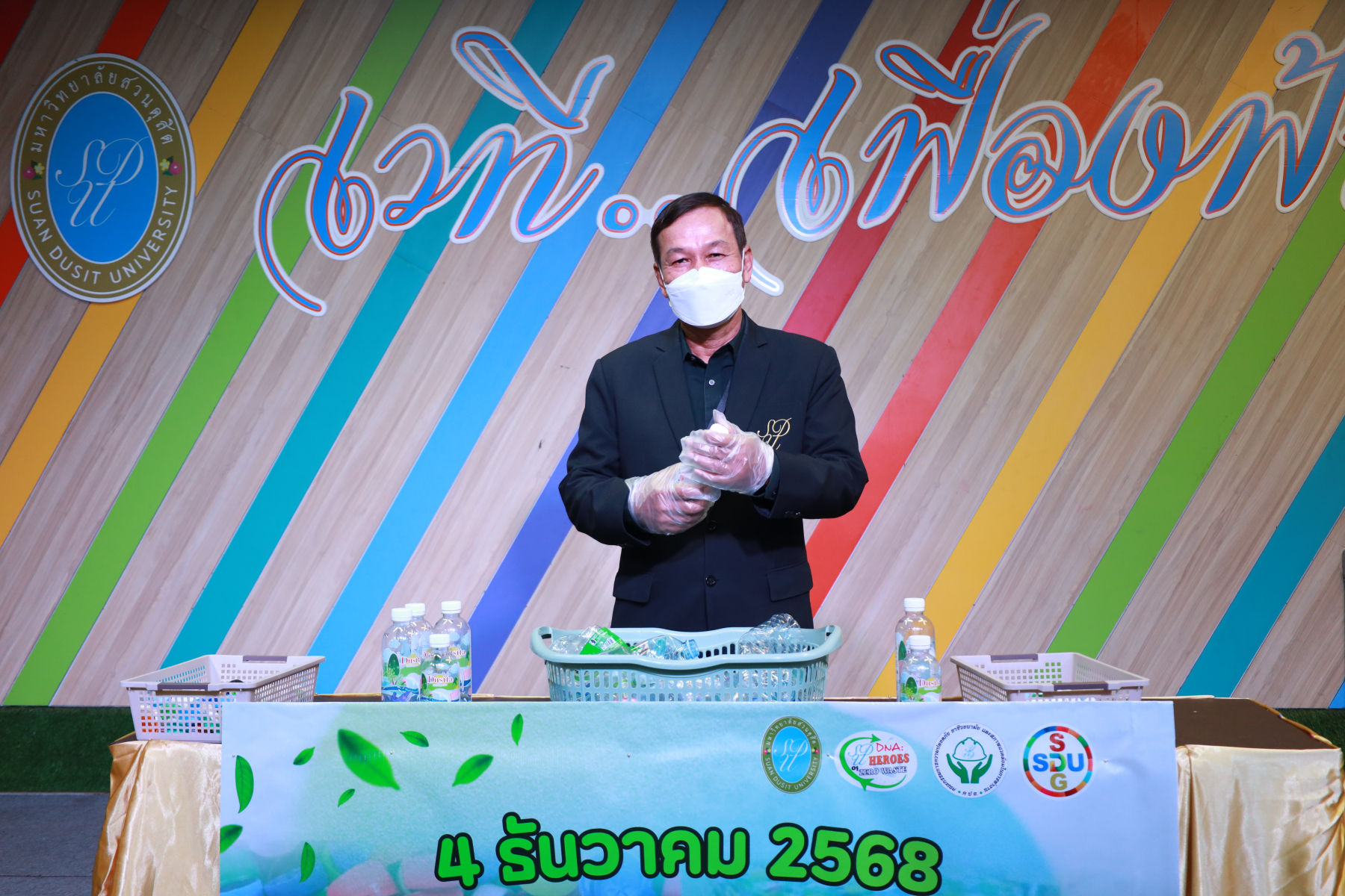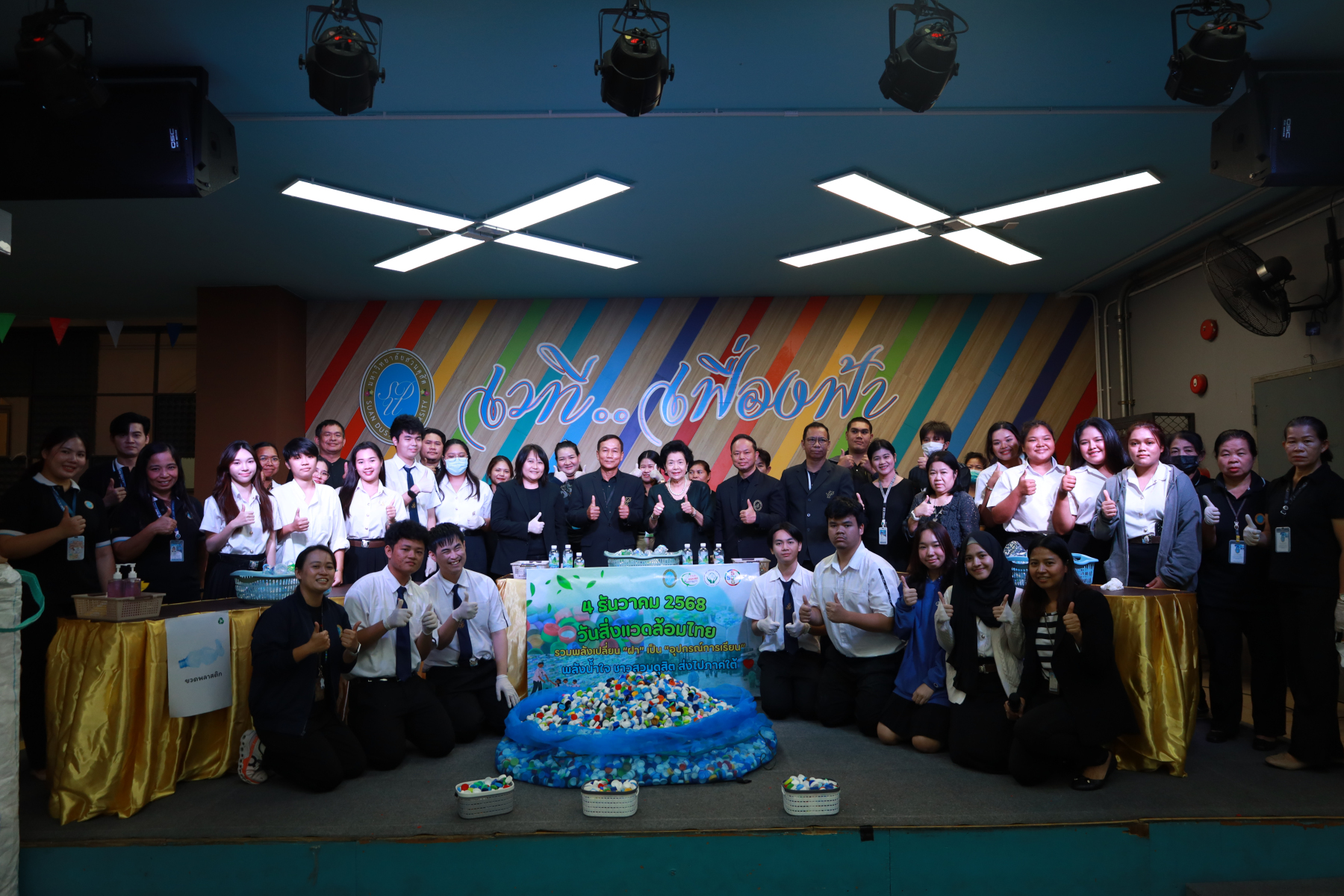 ศูนย์สิ่งแวดล้อม คณะวิทยาศาสตร์และเทคโนโลยี ร่วมกับกองอาคารและสถานที่ จัดกิจกรรมเนื่องในวันสิ่งแวดล้อมไทย (4 ธันวาคม) ซึ่งกระทรวงทรัพยากรธรรมชาติและสิ่งแวดล้อมได้ประกาศประเด็นรณรงค์ประจำปี เน้นการลดขยะพลาสติกตั้งแต่ต้นทางและส่งเสริมการใช้ทรัพยากรอย่างคุ้มค่า มหาวิทยาลัยสวนดุสิตจึงร่วมขับเคลื่อนตามแนวคิดดังกล่าว ด้วยการจัดกิจกรรม “ร่วมเปลี่ยนฝาเป็นอุปกรณ์การเรียน ส่งต่อกำลังใจสู่ภาคใต้” ภายใต้แนวคิด “รวมพลังเปลี่ยน ‘ฝา’ เป็น ‘อุปกรณ์การเรียน’” เพื่อส่งต่อความช่วยเหลือและกำลังใจให้แก่น้อง ๆ ในพื้นที่ภาคใต้ที่ได้รับผลกระทบจากอุทกภัย กิจกรรมครั้งนี้เป็นส่วนหนึ่งของโครงการ Plastic Bank Plus โดยเปิดรับบริจาคฝาขวดพลาสติกจากบุคลากร นักศึกษา และผู้สนใจมีส่วนร่วมในการคัดแยกขวดและฝาพลาสติกเพื่อนำมาบริจาค ส่งต่อเข้าสู่กระบวนการแปรรูปเป็นชุดโต๊ะ–เก้าอี้นักเรียนสำหรับมอบให้โรงเรียนที่ประสบภัยน้ำท่วมและต้องการฟื้นฟูพื้นที่การเรียนรู้ ภายในกิจกรรม ได้รับเกียรติจากรองศาสตราจารย์ ดร.สวงค์ บุญปลูก รองอธิการบดีฝ่ายเทคโนโลยีสารสนเทศ และรองศาสตราจารย์ พัชรี สวนแก้ว รองอธิการบดีฝ่ายกิจการนักศึกษา เข้าร่วมกิจกรรมส่งต่อฝาพลาสติก โดยบรรยากาศภายในงานเป็นไปอย่างอบอุ่น เต็มเปี่ยมด้วยพลังแห่งความร่วมมือของชาวสวนดุสิต ที่ร่วมกัน “แยกขวด แยกฝา” เพื่อสร้างคุณค่าใหม่ให้วัสดุเหลือใช้ อันนำไปสู่การสนับสนุนการศึกษาและบรรเทาความเดือดร้อนของน้อง ๆ ผู้ประสบภัยในภาคใต้ได้อย่างเป็นรูปธรรม กิจกรรมดังกล่าวจัดขึ้นเมื่อวันที่ 3 ธันวาคม 2568 ณ บริเวณ Co-Working Space อาคาร 32 มหาวิทยาลัยสวนดุสิต