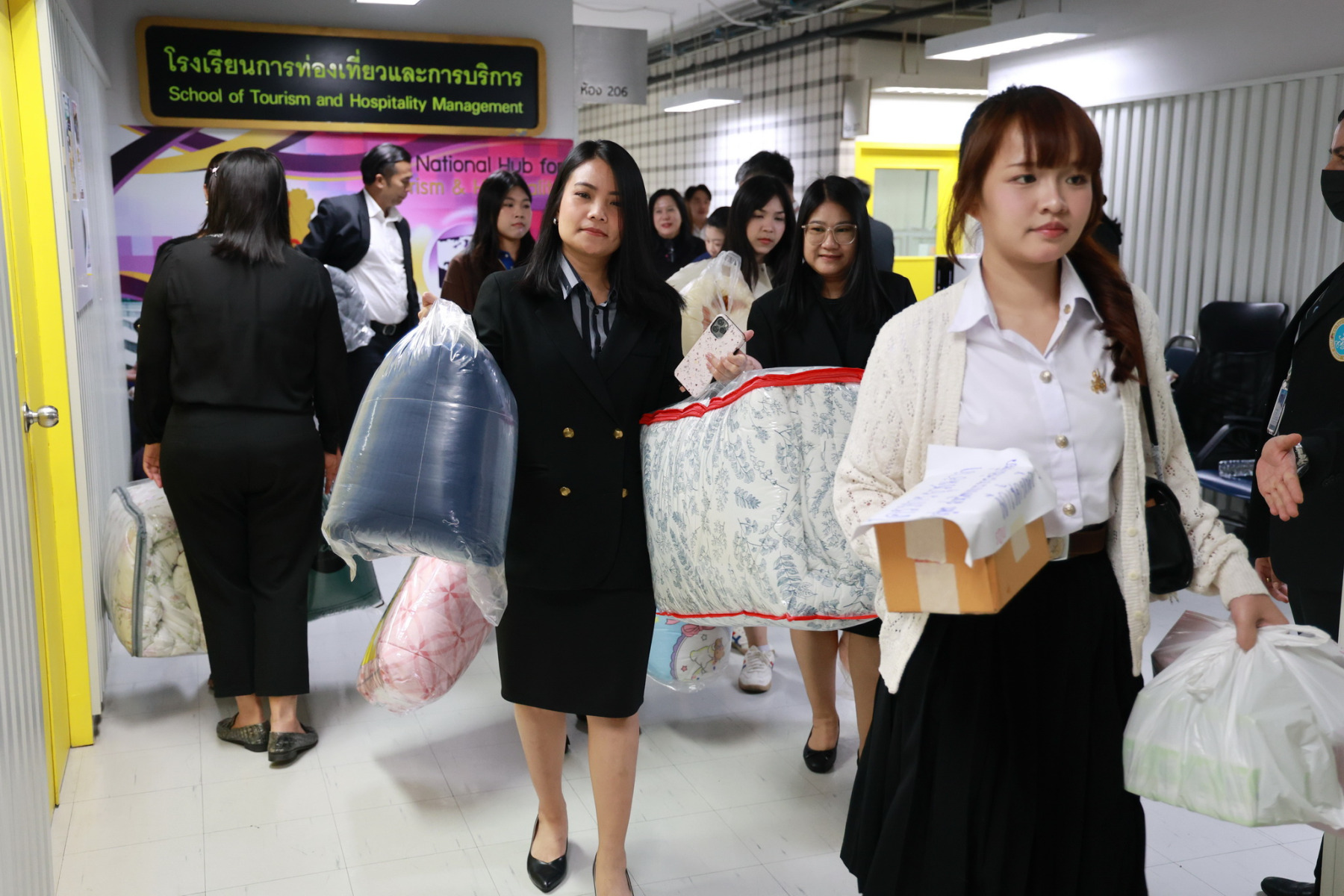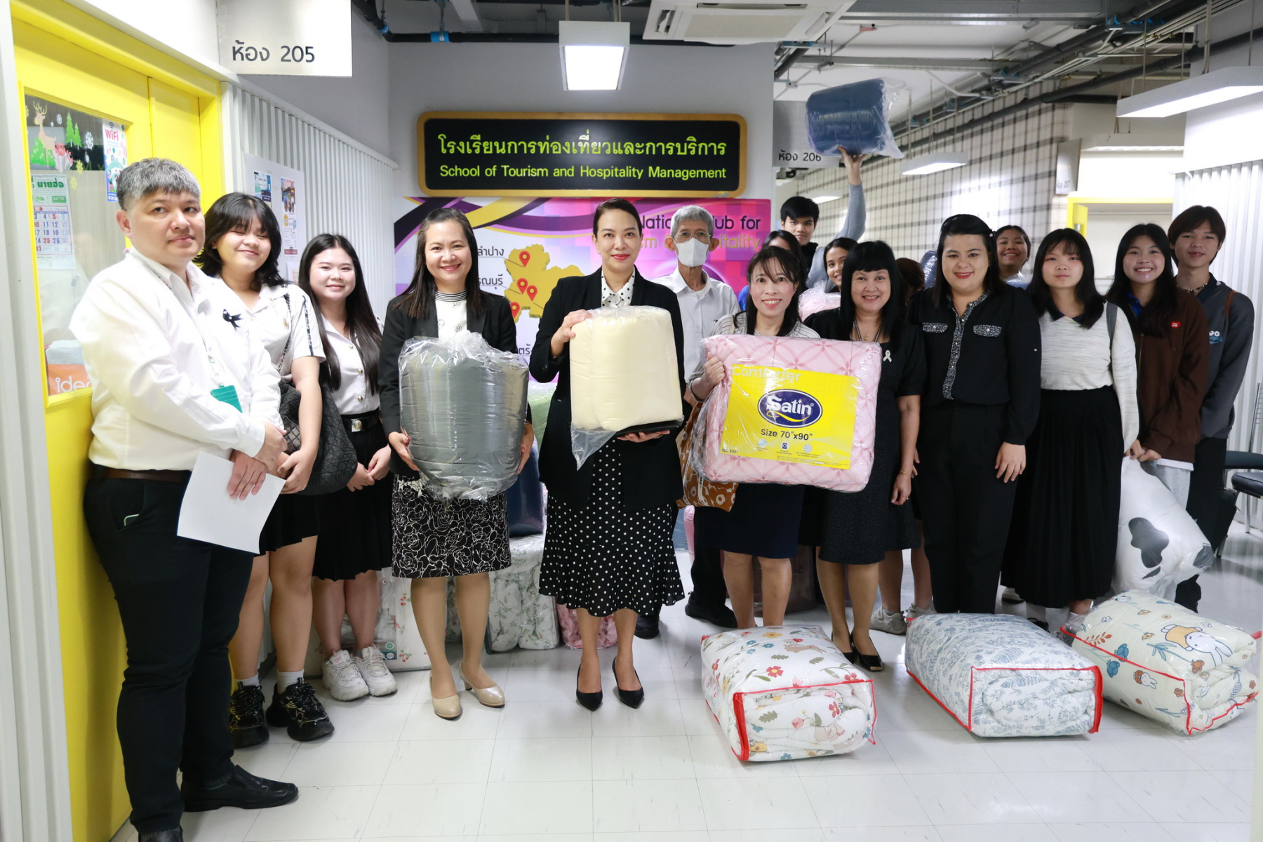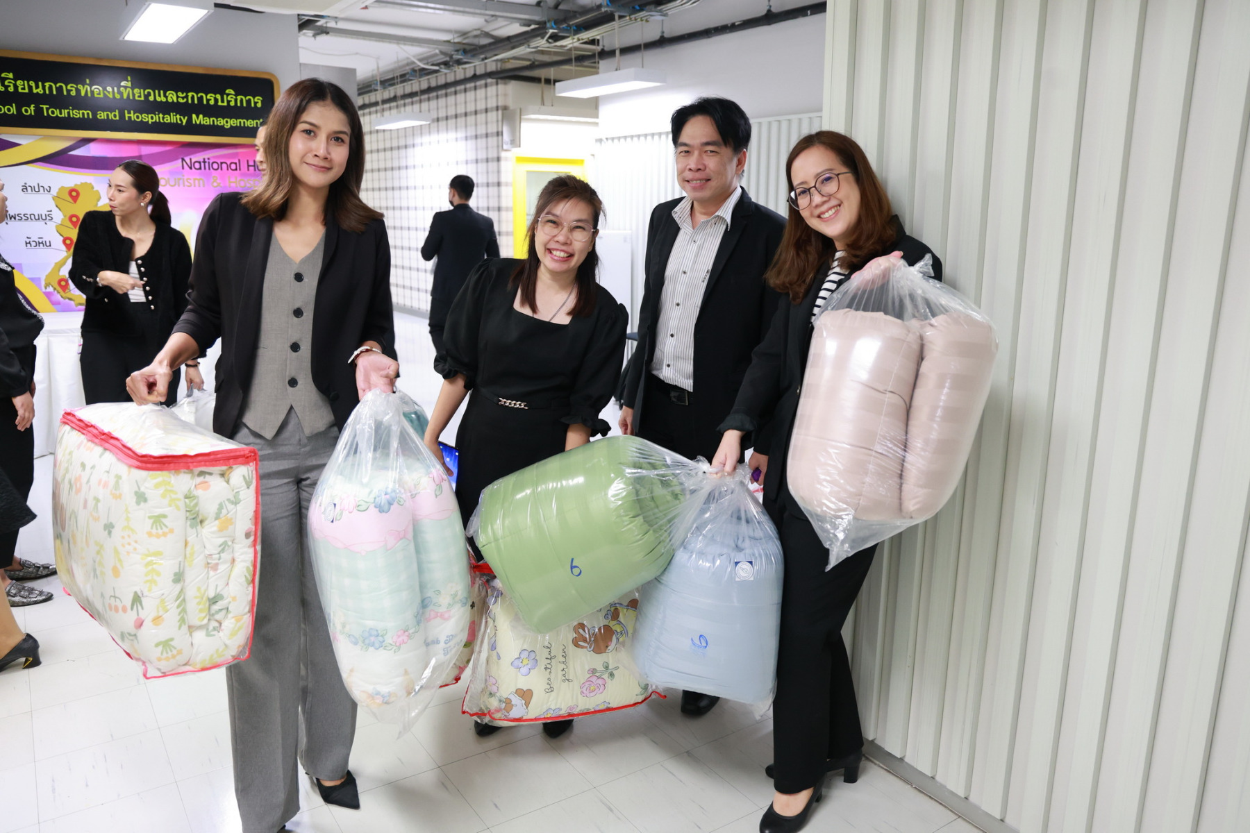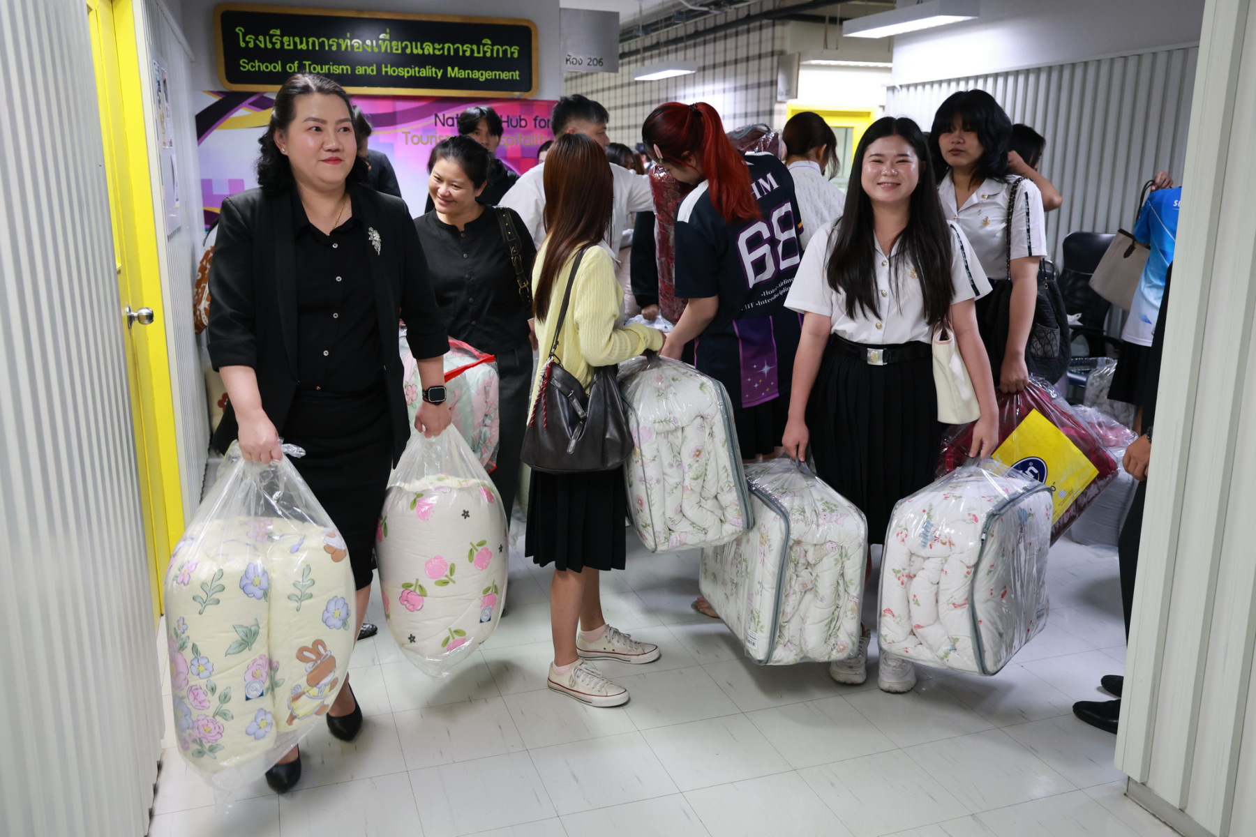 ผู้ช่วยศาสตราจารย์ ดร.พิมพ์มาดา วิชาศิลป์ คณบดีโรงเรียนการท่องเที่ยวและการบริการ เป็นตัวแทนมอบผ้าห่มอุ่นใจ เพื่อพี่น้องผู้ประสบอุทกภัยภาคใต้ ซึ่งร่วมกับ กาชาดจังหวัดนครนายก สภากาชาดไทย ณ หน้าอาคาร 2 ลานชั้น 1 วันที่ 4 ธันวาคม 2568