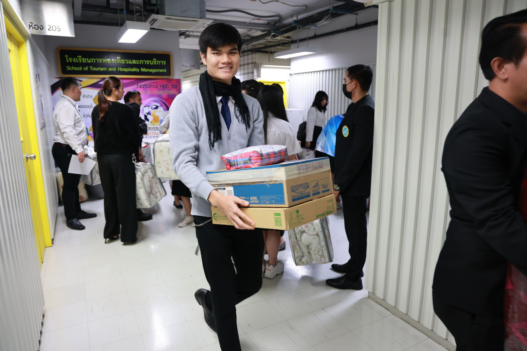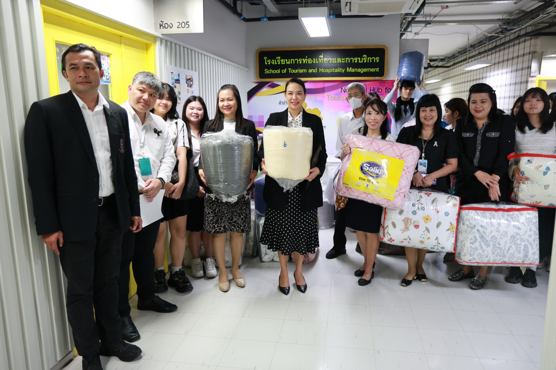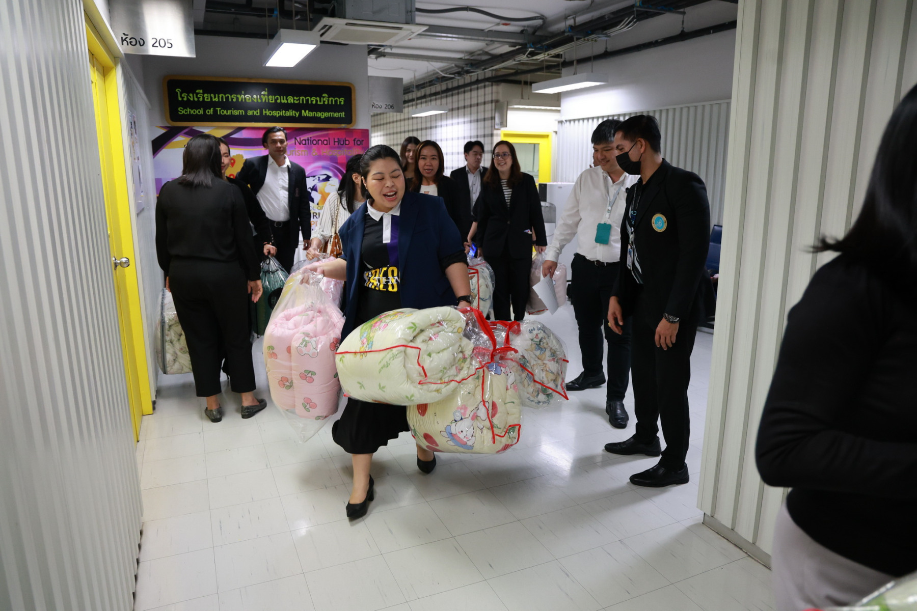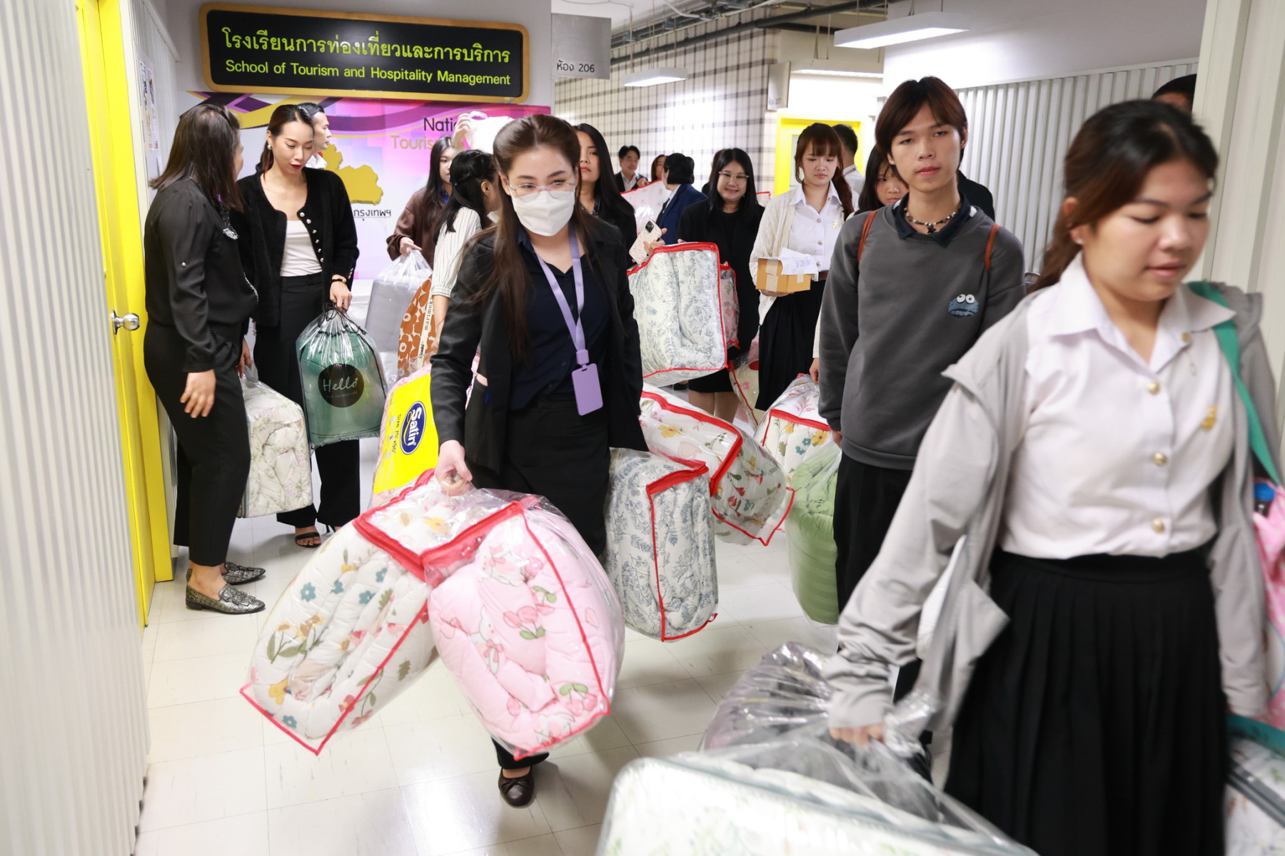 ผู้ช่วยศาสตราจารย์ ดร.พิมพ์มาดา วิชาศิลป์ คณบดีโรงเรียนการท่องเที่ยวและการบริการ เป็นตัวแทนมอบผ้าห่มอุ่นใจ เพื่อพี่น้องผู้ประสบอุทกภัยภาคใต้ ซึ่งร่วมกับ กาชาดจังหวัดนครนายก สภากาชาดไทย ณ หน้าอาคาร 2 ลานชั้น 1 วันที่ 4 ธันวาคม 2568