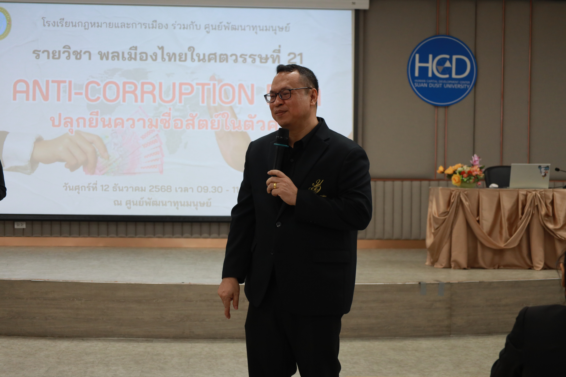 ศูนย์พัฒนาทุนมนุษย์ และโรงเรียนกฎหมายและการเมือง ร่วมกับ สำนักส่งเสริมวิชาการและงานทะเบียน จัดโครงการจัดการเรียนการสอนเชิงประสบการณ์ รายวิชาพลเมืองไทยในศตวรรษที่ 21 โดยได้รับเกียรติจากสำนักงาน ป.ป.ท. สำนักงานคณะกรรมการป้องกันและปราบปรามการทุจริตในภาครัฐ มาบรรยายหัวข้อ ANTI-CORRUPTION DNA ปลุกยีนความซื่อสัตย์ในตัวคุณ ณ ห้อง 301 อาคาร ดร.ศิโรจน์ ผลพันธิน 2 วันที่ 12 ธันวาคม 2568
