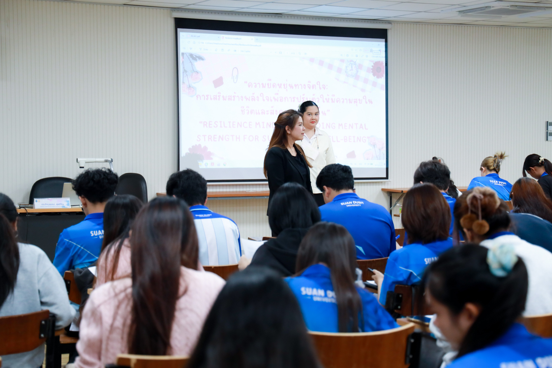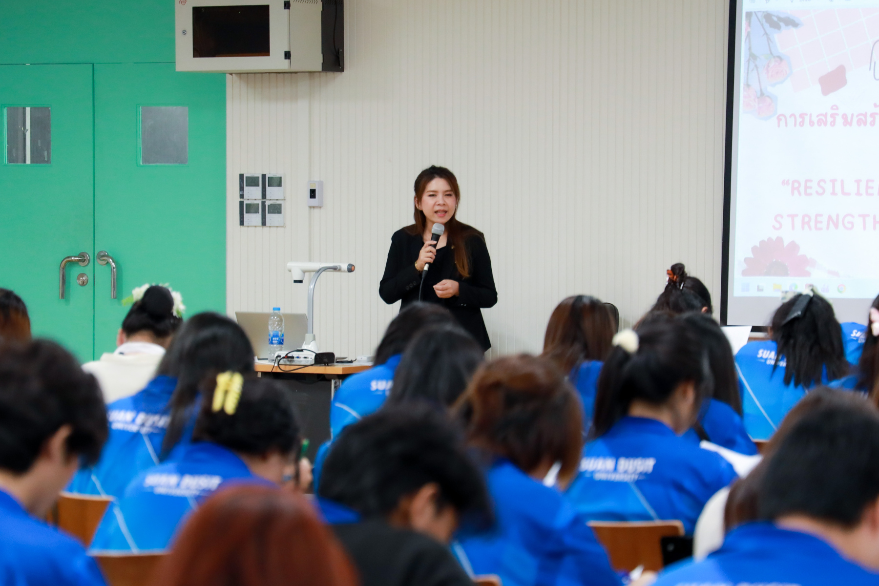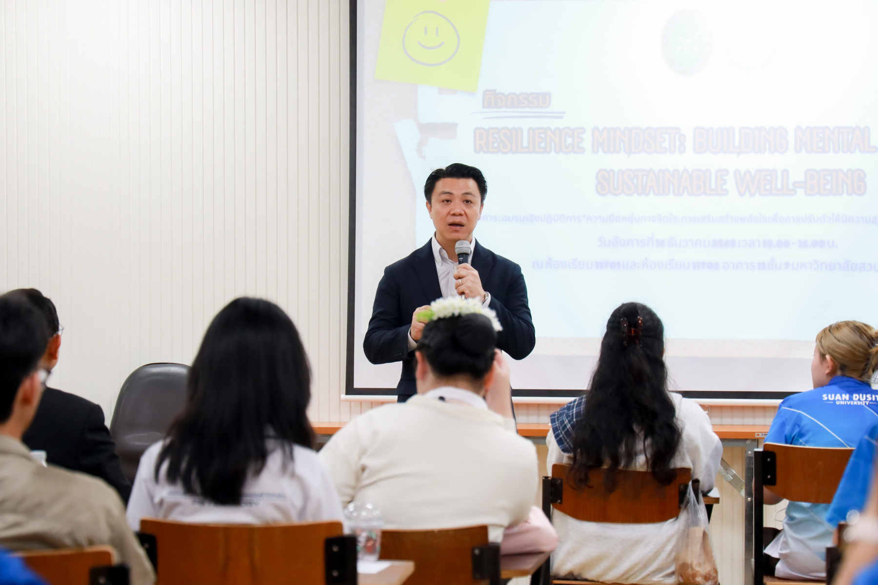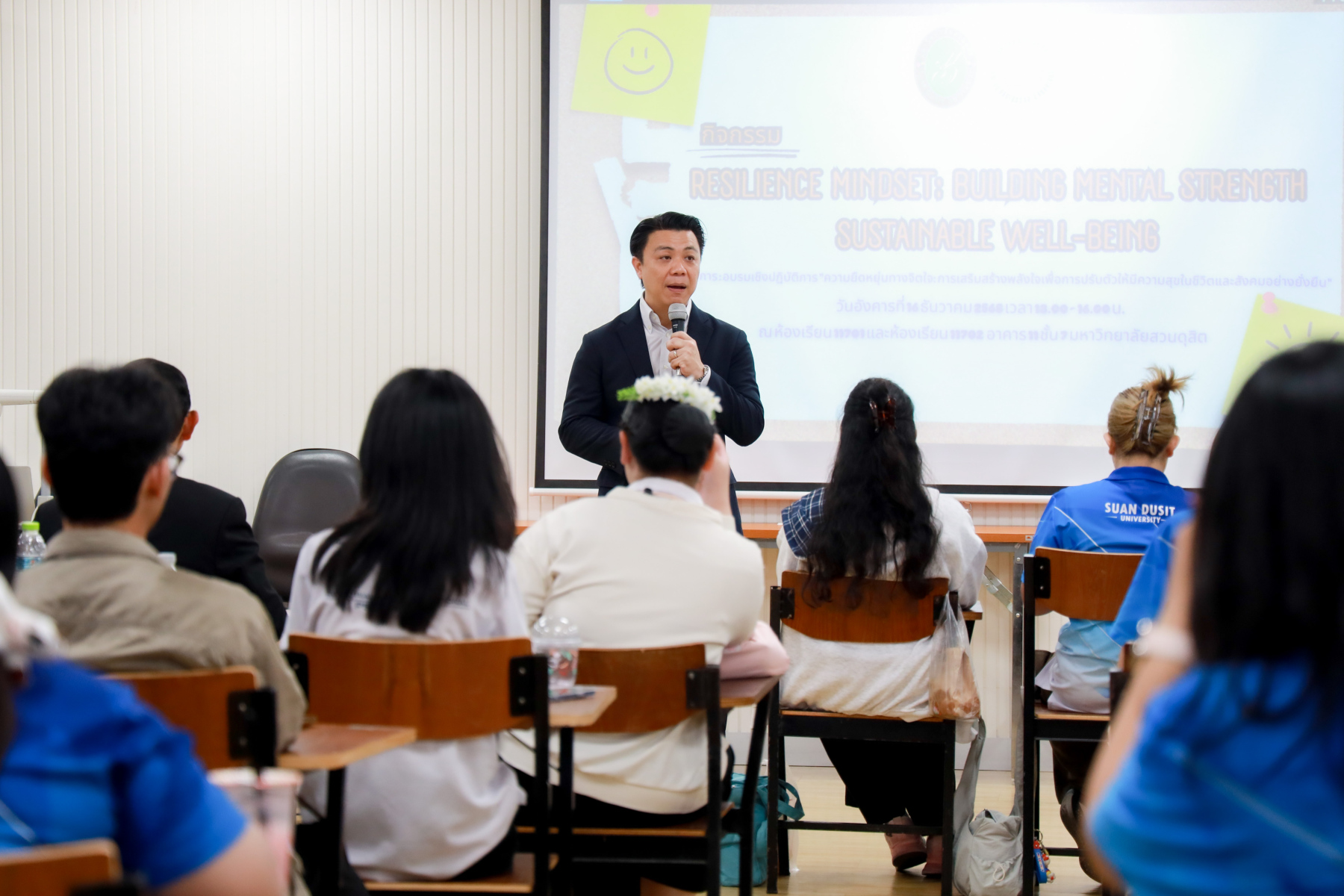 รองศาสตราจารย์ ดร. ยุทธพงษ์ ลีลากิจไพศาล คณบดีคณะมนุษยศาสตร์และสังคมศาสตร์ เป็นผู้กล่าวเปิดงานอบรมเชิงปฏิบัติการ “ความยืดหยุ่นทางจิตใจ: การเสริมสร้างพลังใจเพื่อการปรับตัวให้มีความสุขในชีวิตและสังคมอย่างยั่งยืน” “Resilience Mindset: Building Mental Strength for Sustainable Well-Being” โดยได้รับเกียรติจาก ดร.ภัทรวรรธน์ สุขยิรัญ นักจิตวิทยาคลินิกชำนาญการพิเศษ โรงพยาบาลศรีธัญญา เป็นวิทยากรบรรยายแบบมีส่วนร่วม และ คุณศุกภนิตย์ พลไพรินทร์ พยาบาลจิตเวชวิชาชีพระดับเชี่ยวชาญ เป็นวิทยากรในกิจกรรมการพัฒนาทักษะ ในหัวข้อ “ความยืดหยุ่นทางจิตใจ: การเสริมสร้างพลังใจเพื่อการปรับตัวให้มีความสุขในชีวิตและสังคมอย่างยั่งยืน” เมื่อวันที่ 16 ธันวาคม 2568 ณ ห้องเรียน 11701 และ 11702 ชั้น 7 อาคาร 11 มหาวิทยาลัยสวนดุสิต