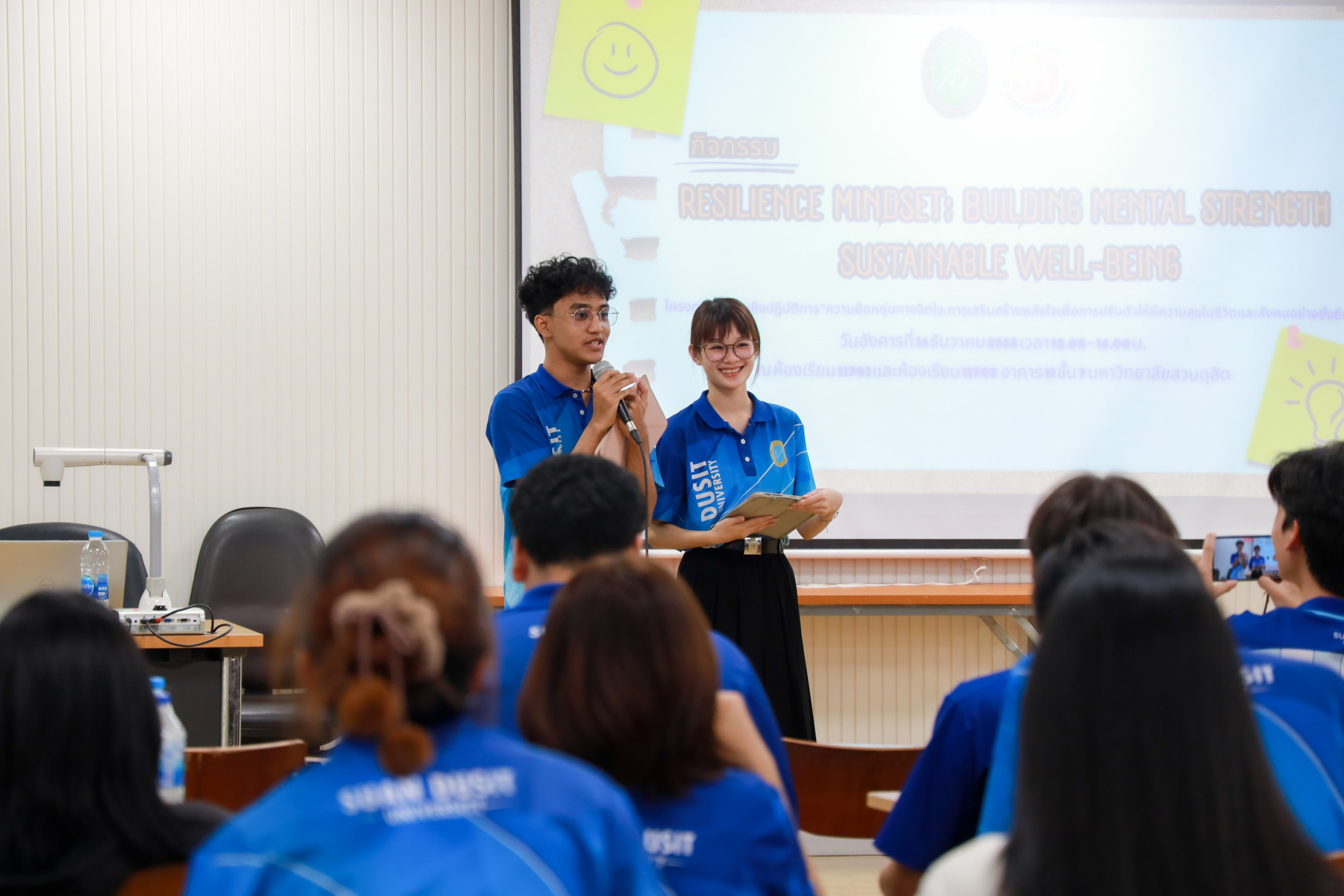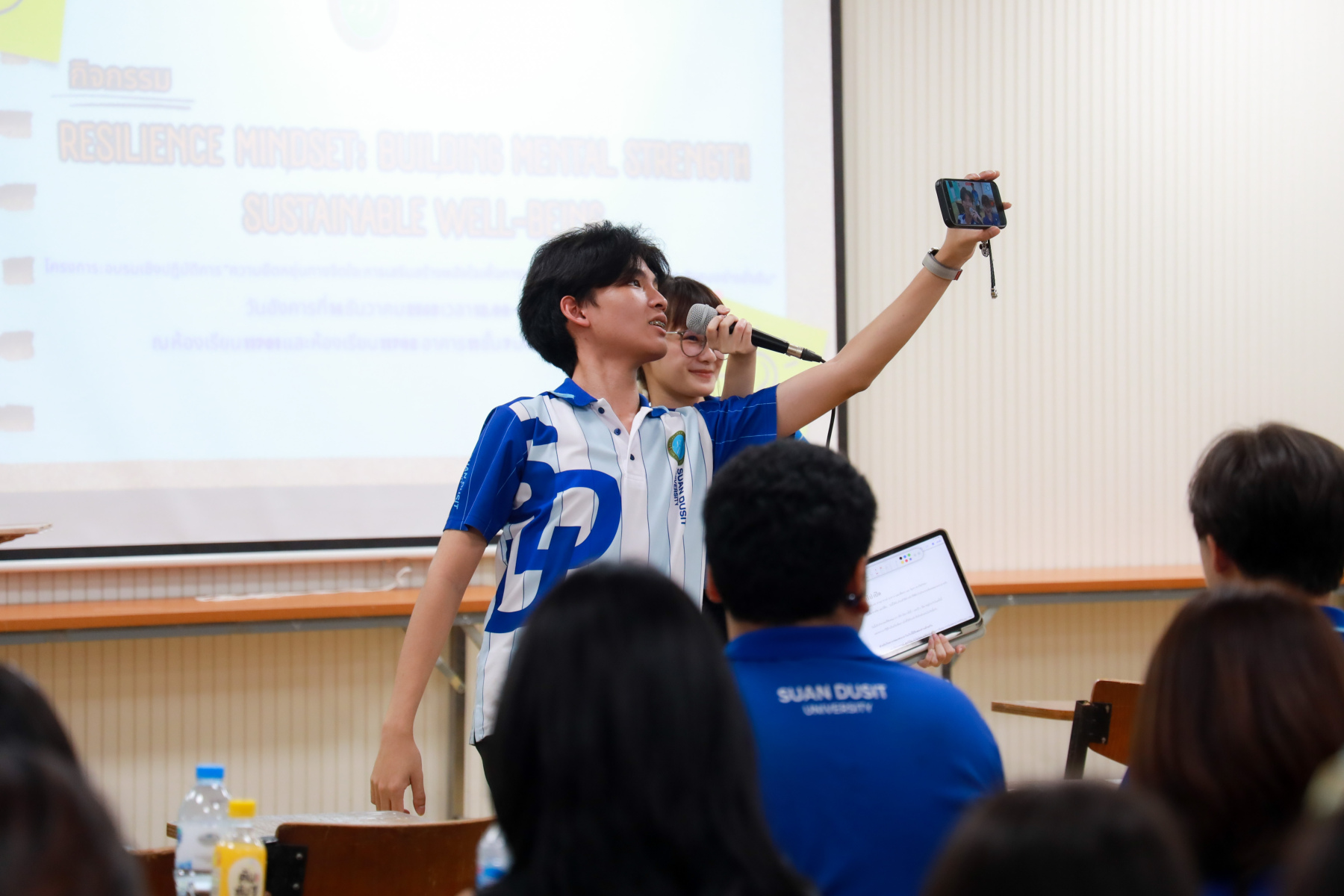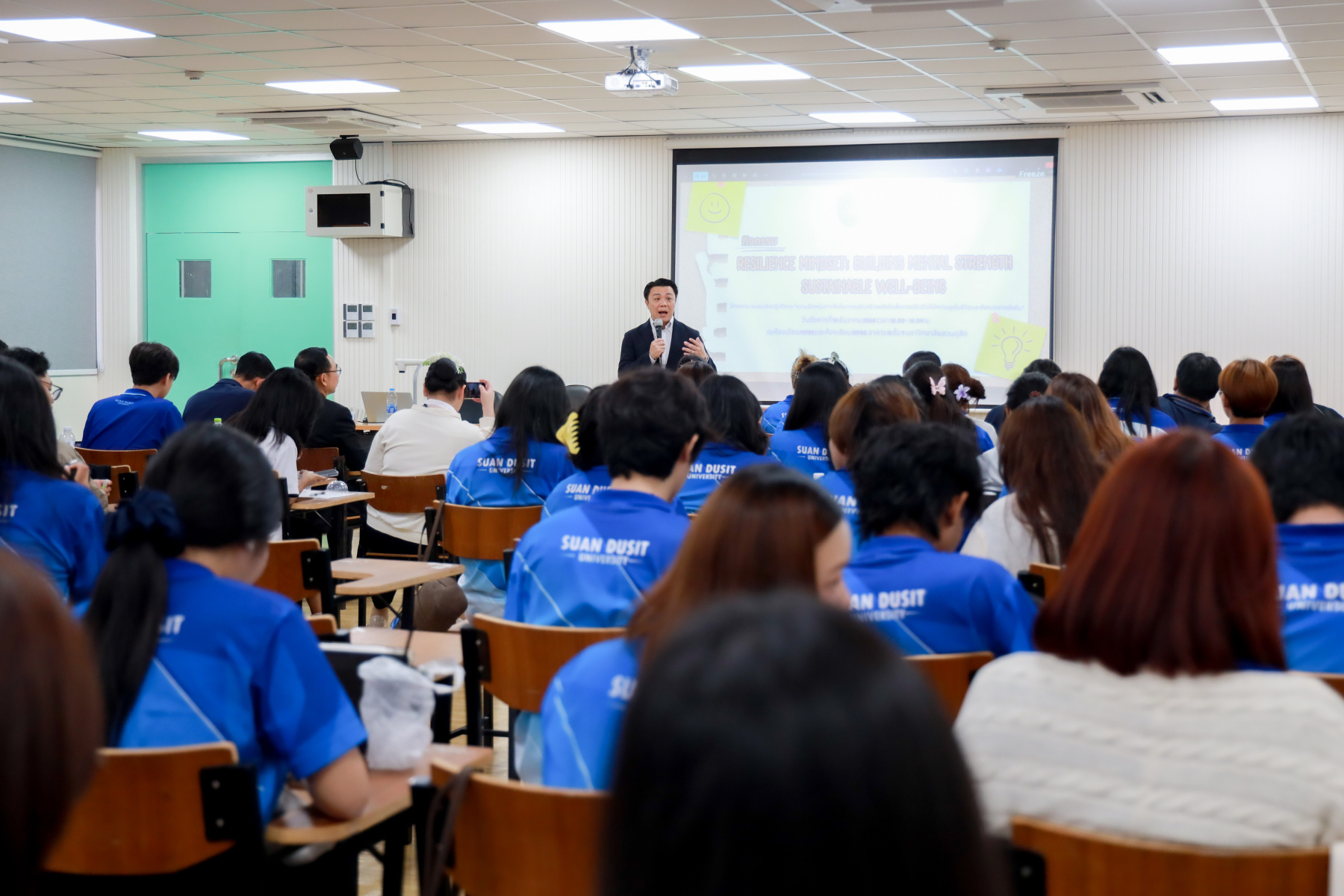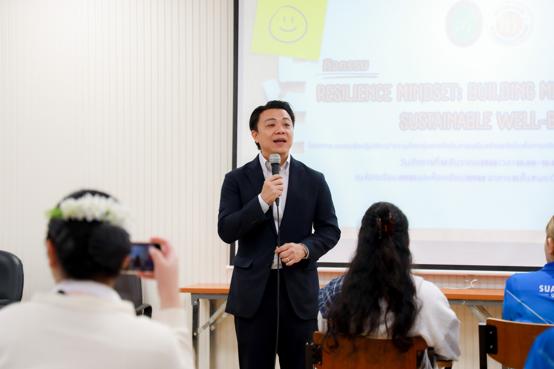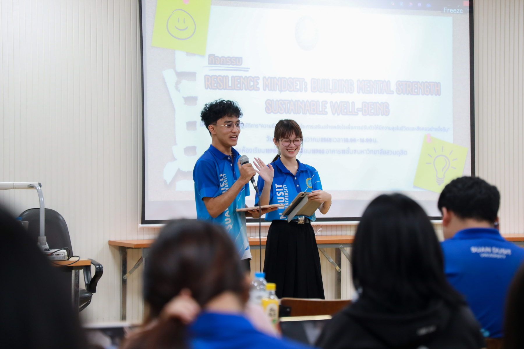 รองศาสตราจารย์ ดร. ยุทธพงษ์ ลีลากิจไพศาล คณบดีคณะมนุษยศาสตร์และสังคมศาสตร์ เป็นผู้กล่าวเปิดงานอบรมเชิงปฏิบัติการ “ความยืดหยุ่นทางจิตใจ: การเสริมสร้างพลังใจเพื่อการปรับตัวให้มีความสุขในชีวิตและสังคมอย่างยั่งยืน” “Resilience Mindset: Building Mental Strength for Sustainable Well-Being” โดยได้รับเกียรติจาก ดร.ภัทรวรรธน์ สุขยิรัญ นักจิตวิทยาคลินิกชำนาญการพิเศษ โรงพยาบาลศรีธัญญา เป็นวิทยากรบรรยายแบบมีส่วนร่วม และ คุณศุกภนิตย์ พลไพรินทร์ พยาบาลจิตเวชวิชาชีพระดับเชี่ยวชาญ เป็นวิทยากรในกิจกรรมการพัฒนาทักษะ ในหัวข้อ “ความยืดหยุ่นทางจิตใจ: การเสริมสร้างพลังใจเพื่อการปรับตัวให้มีความสุขในชีวิตและสังคมอย่างยั่งยืน” เมื่อวันที่ 16 ธันวาคม 2568 ณ ห้องเรียน 11701 และ 11702 ชั้น 7 อาคาร 11 มหาวิทยาลัยสวนดุสิต