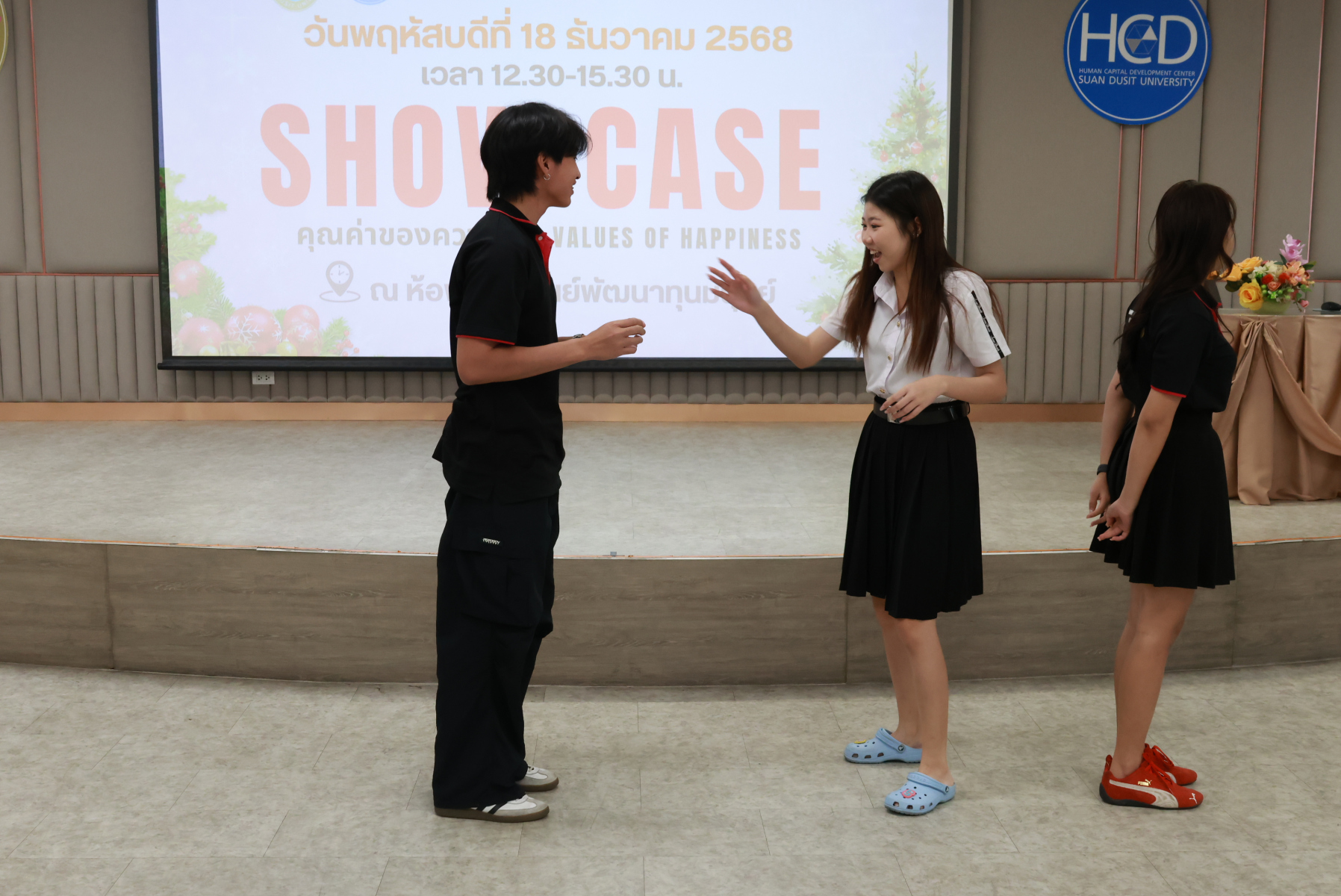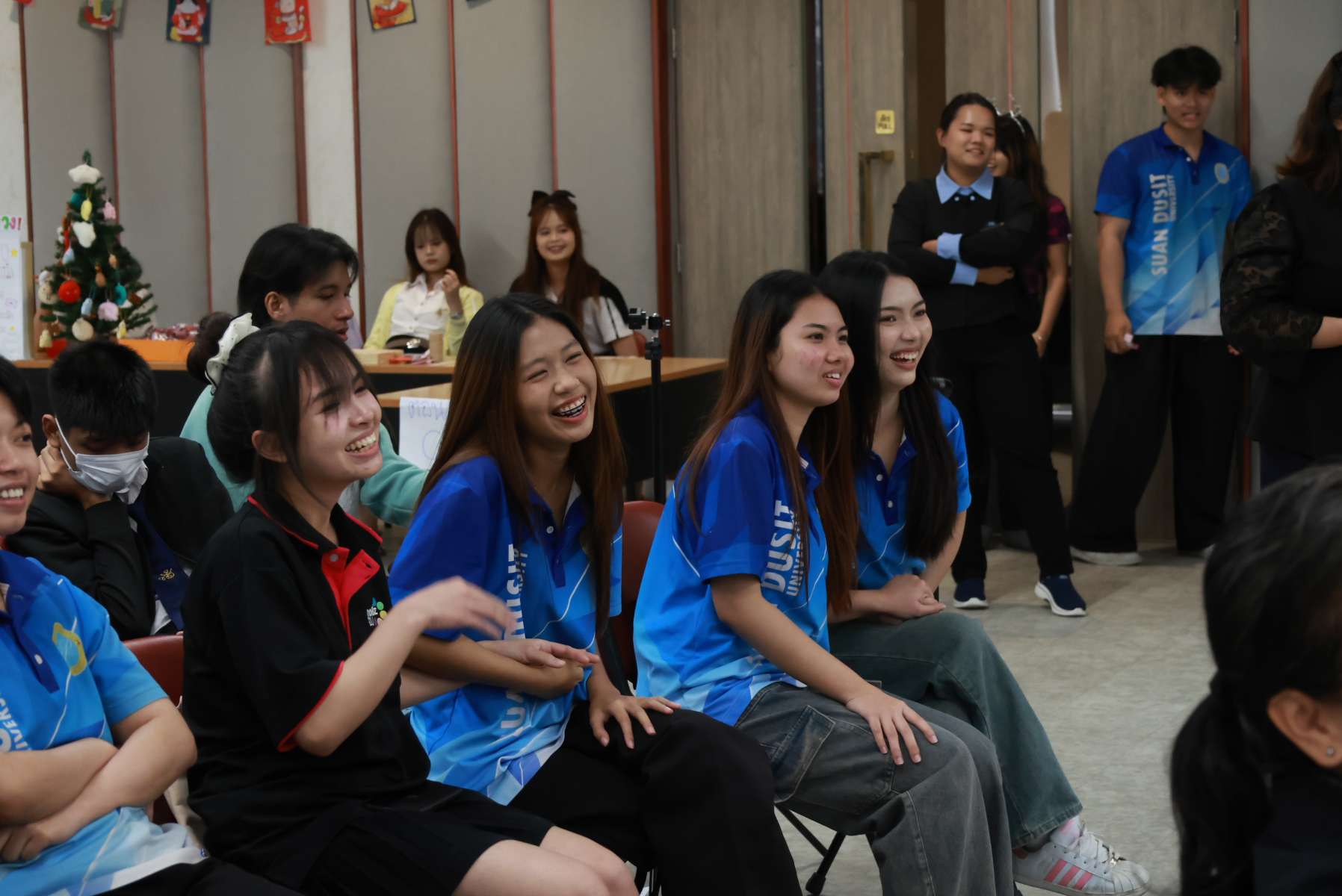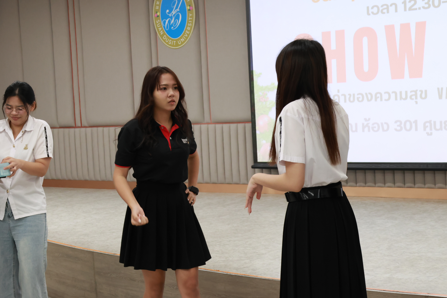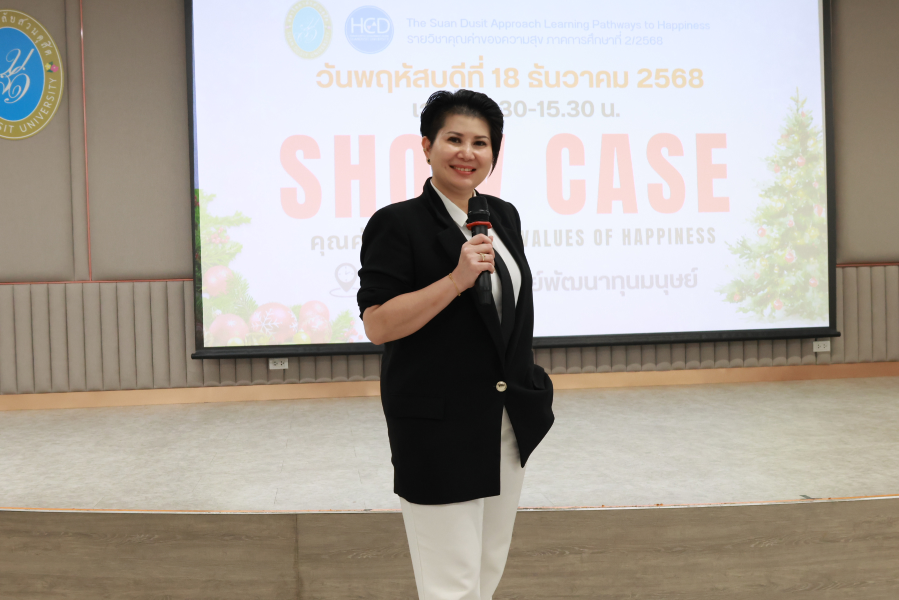 ศูนย์พัฒนาทุนมนุษย์ ร่วมกับ สำนักส่งเสริมวิชาการและงานทะเบียน มหาวิทยาลัยสวนดุสิต จัดกิจกรรมการเรียนการสอนเชิงประสบการณ์ในรายวิชา “คุณค่าของความสุข” ครั้งที่ 7 กลุ่มวันพฤหัสบดี กิจกรรม Show Case (ปิดคอร์ส) ภายใต้ธีม “Happy Freshy University”  เมื่อวันที่ 18 ธันวาคม 2568 ณ อาคาร ดร.ศิโรจน์ ผลพันธิน โดยมี  ผศ.ดร.ณัฐกฤตา ฟลอเรนไทน์ ผศ.กัญญกานต์ เสถียรสุคนธ์ และ ผศ.ดร. บุญญลักษม์ ตำนานจิตร อาจารย์ผู้สอนและควบคุมการจัดกิจกรรม   และได้รับเกียรติจาก นางสาวนันท์ธิญา ศฤงค์สวัสดิ์  ผู้อำนวยการศูนย์พัฒนาทุนมนุษย์  ผู้สนับสนุนในการบริหารจัดการรายวิชา“คุณค่าของความสุข” ให้การต้อนรับและดูแลภาพรวมอย่างใกล้ชิด กิจกรรมครั้งนี้เป็นการรวบรวมองค์ความรู้ตลอดภาคการศึกษา มาถ่ายทอดผ่านรูปแบบ “The Suan Dusit Approach: Learning Pathways to Happiness” โดยเน้นให้นักศึกษาเป็นศูนย์กลางในการสร้างสรรค์กิจกรรมเพื่อสะท้อนผลลัพธ์การเรียนรู้ (Learning Outcomes) อาทิ กิจกรรมใบ้คำสุภาษิตไทย และการพับกระดาษแบบญี่ปุ่น (Origami) การส่งต่อพลังบวก โดย การเขียนการ์ดอวยพรปีใหม่  / เขียนคำอวยพรส่งต่อความสุข  และกิจกรรมนันทนาการ  “โยนห่วงรับโชค” ฯลฯ หัวใจสำคัญของการเรียนรู้ในครั้งนี้ คือ แนวคิด “5F” (Field: Fulfilled Fun For Feeling Fine) ซึ่งมุ่งเน้นการเติมเต็มความสนุกเพื่อสร้างความรู้สึกที่ดี ช่วยให้นักศึกษาค้นพบความหมายของความสุขในแบบฉบับของตนเอง พร้อมทั้งพัฒนาทักษะการทำงานร่วมกับผู้อื่น (Soft Skills) ที่สามารถนำไปใช้ได้จริงในชีวิตประจำวันได้ “เพราะความสุขคือวิชาที่เราต้องใช้ไปตลอดชีวิต การเรียนรู้ที่แท้จริงจึงไม่ได้อยู่แค่ในตำรา”