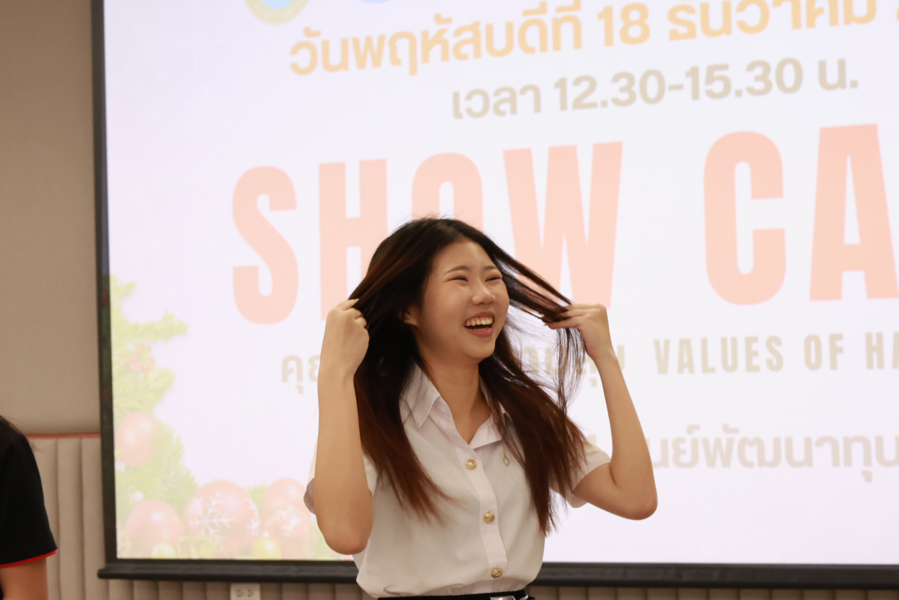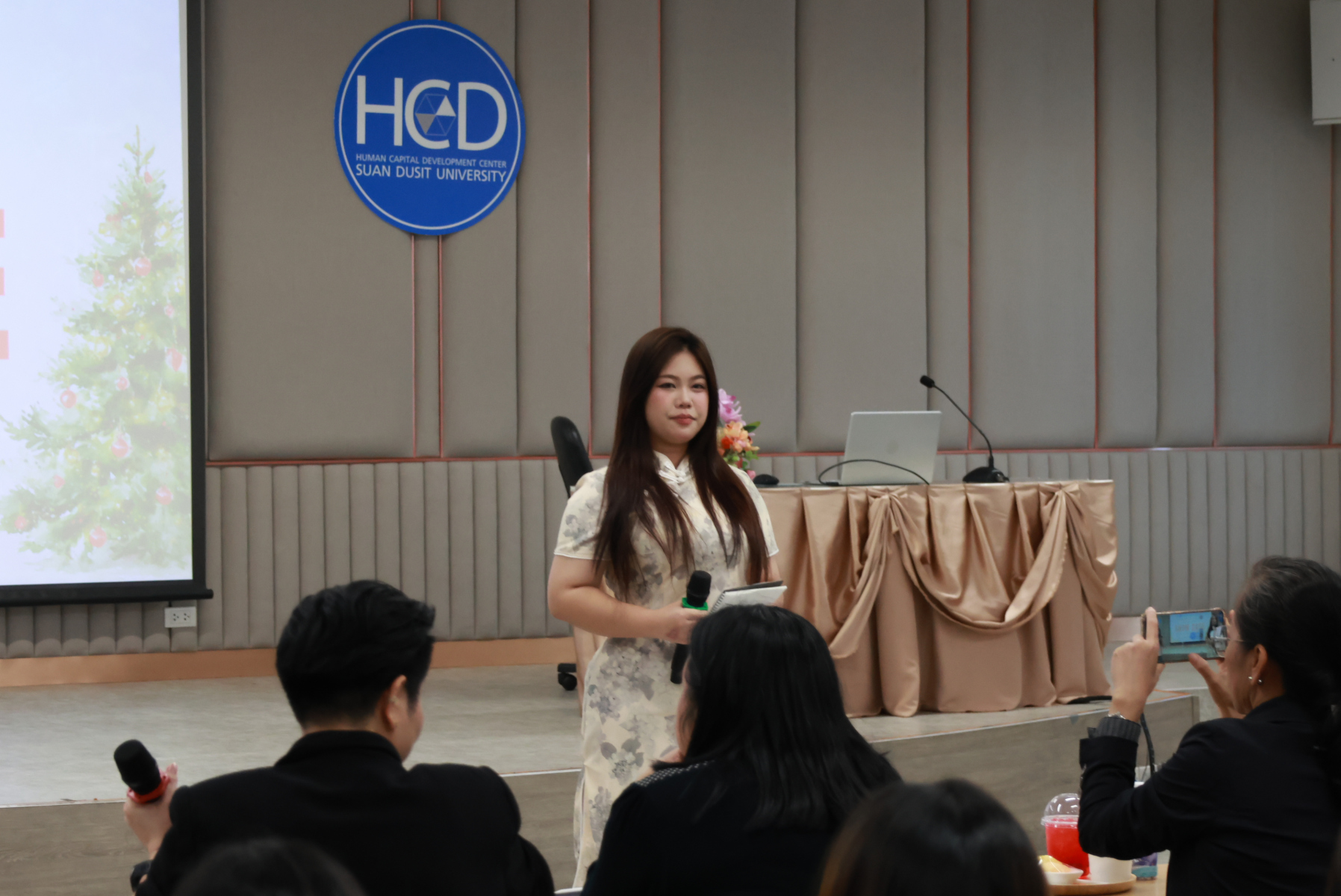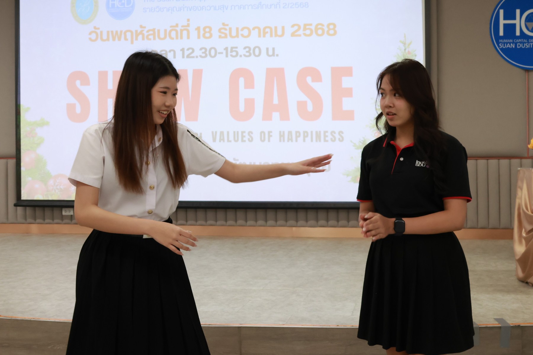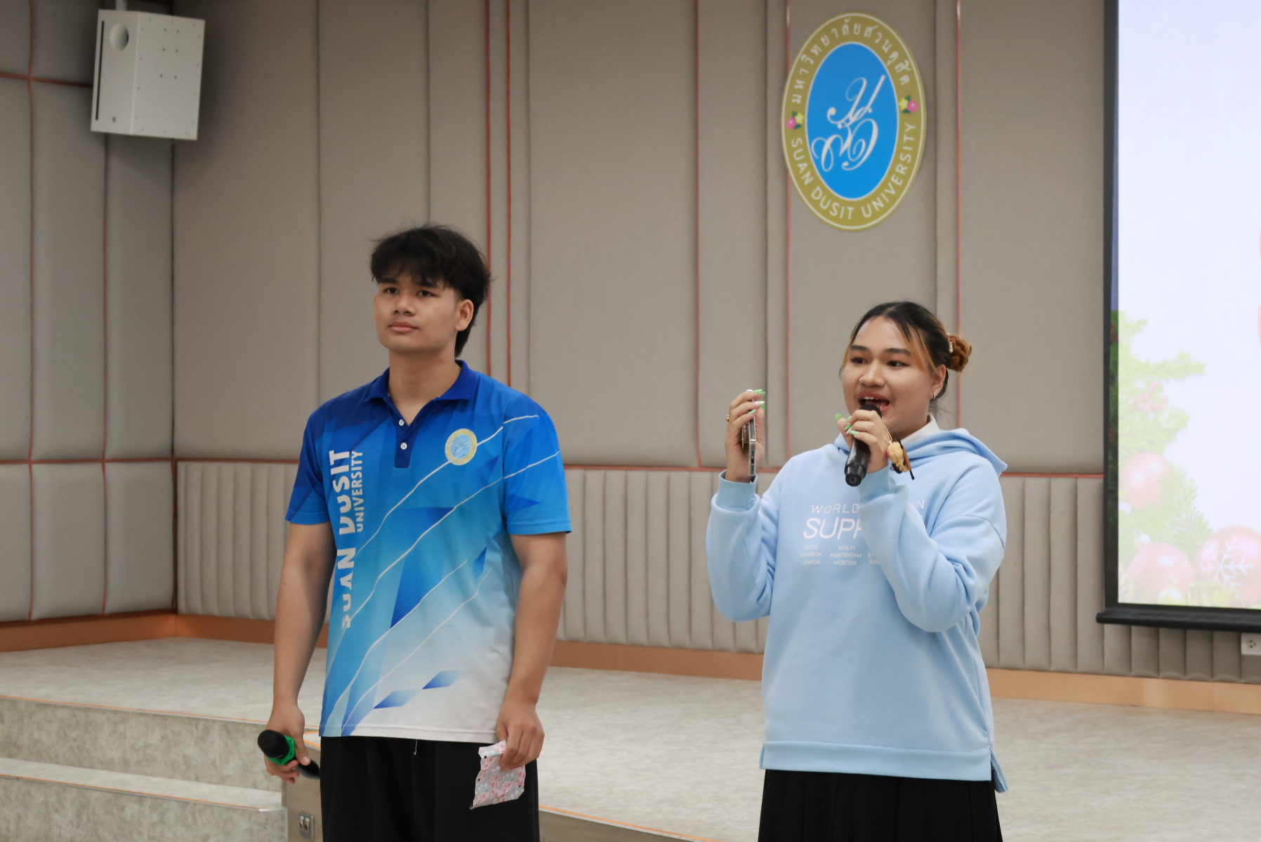 ศูนย์พัฒนาทุนมนุษย์ ร่วมกับ สำนักส่งเสริมวิชาการและงานทะเบียน มหาวิทยาลัยสวนดุสิต จัดกิจกรรมการเรียนการสอนเชิงประสบการณ์ในรายวิชา “คุณค่าของความสุข” ครั้งที่ 7 กลุ่มวันพฤหัสบดี กิจกรรม Show Case (ปิดคอร์ส) ภายใต้ธีม “Happy Freshy University”  เมื่อวันที่ 18 ธันวาคม 2568 ณ อาคาร ดร.ศิโรจน์ ผลพันธิน โดยมี  ผศ.ดร.ณัฐกฤตา ฟลอเรนไทน์ ผศ.กัญญกานต์ เสถียรสุคนธ์ และ ผศ.ดร. บุญญลักษม์ ตำนานจิตร อาจารย์ผู้สอนและควบคุมการจัดกิจกรรม   และได้รับเกียรติจาก นางสาวนันท์ธิญา ศฤงค์สวัสดิ์  ผู้อำนวยการศูนย์พัฒนาทุนมนุษย์  ผู้สนับสนุนในการบริหารจัดการรายวิชา“คุณค่าของความสุข” ให้การต้อนรับและดูแลภาพรวมอย่างใกล้ชิด กิจกรรมครั้งนี้เป็นการรวบรวมองค์ความรู้ตลอดภาคการศึกษา มาถ่ายทอดผ่านรูปแบบ “The Suan Dusit Approach: Learning Pathways to Happiness” โดยเน้นให้นักศึกษาเป็นศูนย์กลางในการสร้างสรรค์กิจกรรมเพื่อสะท้อนผลลัพธ์การเรียนรู้ (Learning Outcomes) อาทิ กิจกรรมใบ้คำสุภาษิตไทย และการพับกระดาษแบบญี่ปุ่น (Origami) การส่งต่อพลังบวก โดย การเขียนการ์ดอวยพรปีใหม่  / เขียนคำอวยพรส่งต่อความสุข  และกิจกรรมนันทนาการ  “โยนห่วงรับโชค” ฯลฯ หัวใจสำคัญของการเรียนรู้ในครั้งนี้ คือ แนวคิด “5F” (Field: Fulfilled Fun For Feeling Fine) ซึ่งมุ่งเน้นการเติมเต็มความสนุกเพื่อสร้างความรู้สึกที่ดี ช่วยให้นักศึกษาค้นพบความหมายของความสุขในแบบฉบับของตนเอง พร้อมทั้งพัฒนาทักษะการทำงานร่วมกับผู้อื่น (Soft Skills) ที่สามารถนำไปใช้ได้จริงในชีวิตประจำวันได้ “เพราะความสุขคือวิชาที่เราต้องใช้ไปตลอดชีวิต การเรียนรู้ที่แท้จริงจึงไม่ได้อยู่แค่ในตำรา”