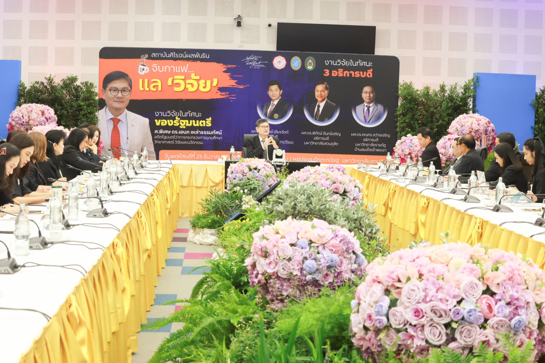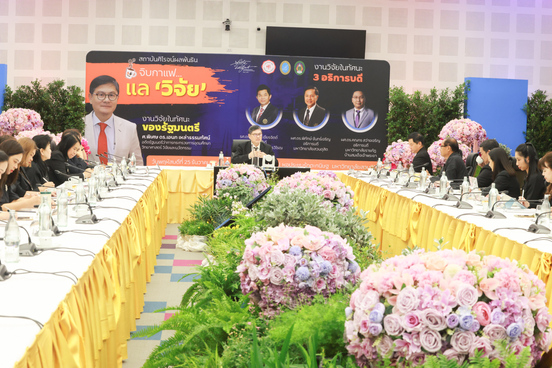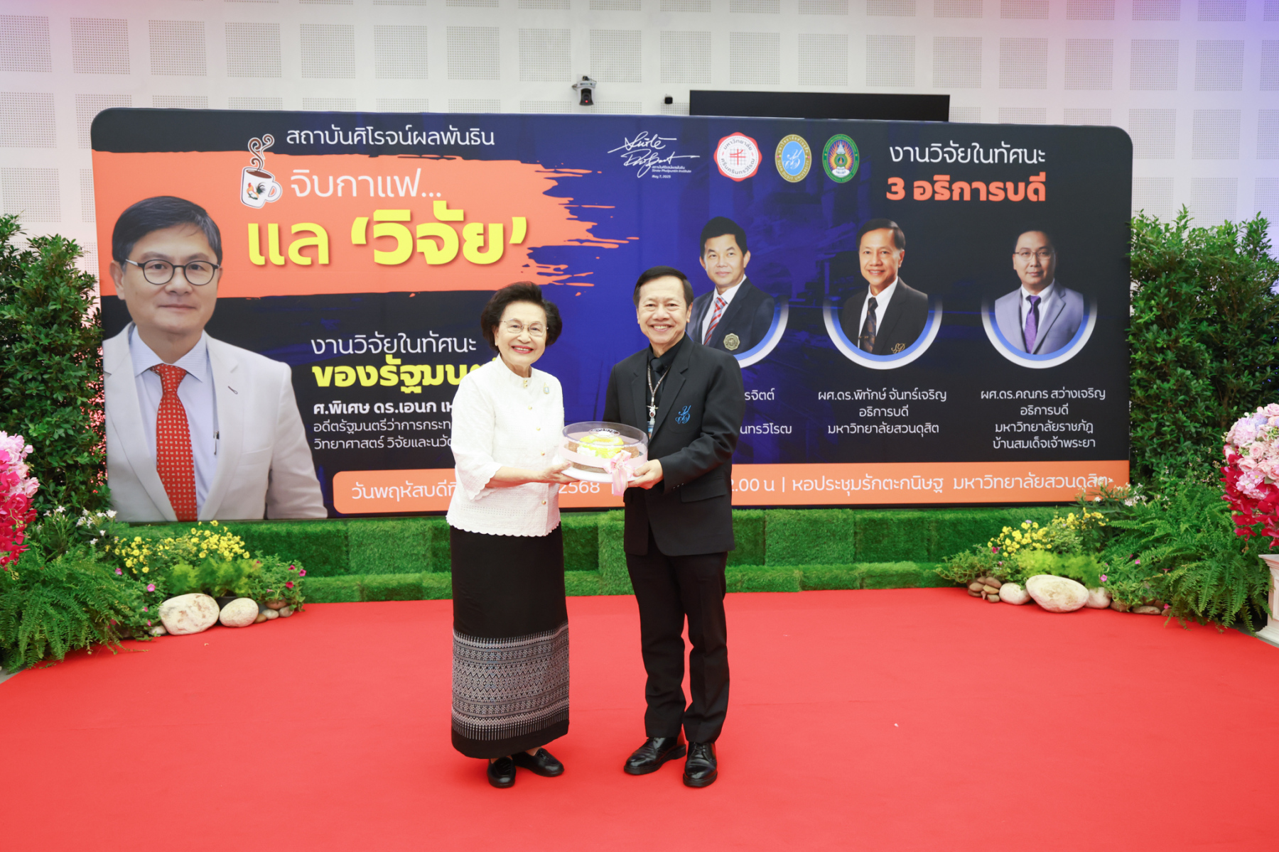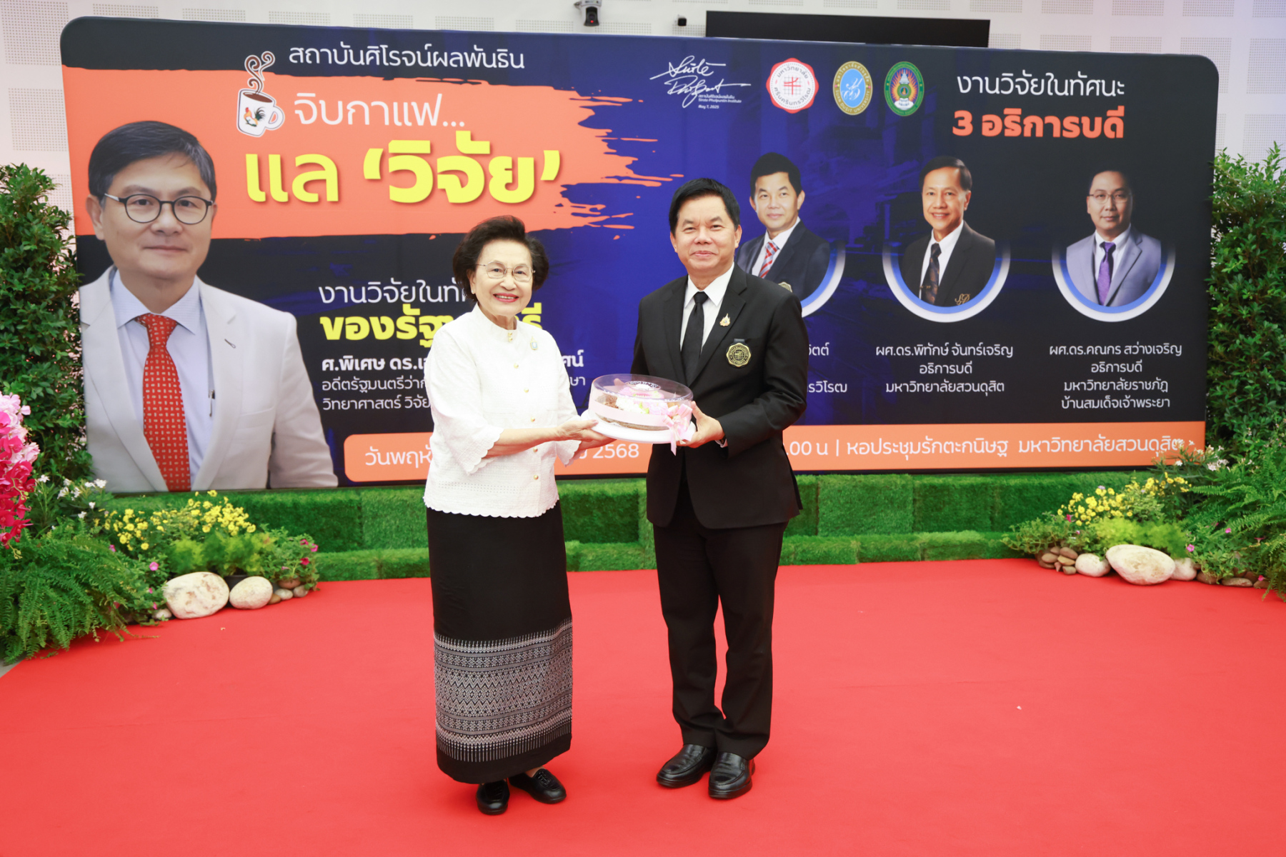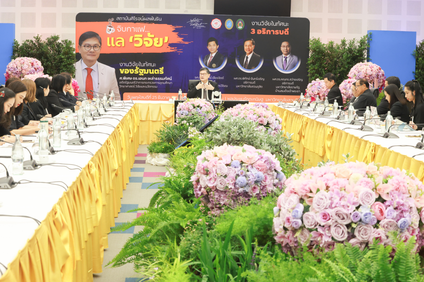 สถาบันศิโรจน์ผลพันธิน มหาวิทยาลัยสวนดุสิต จัดกิจกรรมส่งท้ายปี จิบกาแฟ… แล “วิจัย” กับ ศ.พิเศษ ดร.เอนก เหล่าธรรมทัศน์ และ 3 อธิการบดี The Researcher’s Identity “ตัวตนคนทำวิจัย” โดยได้รับเกียรติจาก ศ.พิเศษ ดร.เอนก เหล่าธรรมทัศน์ อดีตรัฐมนตรีว่าการกระทรวงการอุดมศึกษา วิทยาศาสตร์ วิจัยและนวัตกรรม บรรยายหัวข้อ : งานวิจัย หัวข้อ : ในทัศนะของรัฐมนตรี รศ.ดร.ชลวิทย์ เจียรจิตต์ อธิการบดีมหาวิทยาลัยศรีนครินทรวิโรฒ ผศ.ดร.พิทักษ์ จันทร์เจริญ อธิการบดีมหาวิทยาลัยสวนดุสิต ผศ.ดร.คณกร สว่างเจริญ อธิการบดีมหาวิทยาลัยราชภัฎบ้านสมเด็จเจ้าพระยา บรรยายในหัวข้อ งานวิจัยในทัศนะ 3 อธิการบดี โดยรายได้สมทบทุนการศึกษา เมื่อวันพฤหัสบดีที่ 25 ธันวาคม 2568 ณ หอประชุมรักตะกนิษฐ มหาวิทยาลัยสวนดุสิต