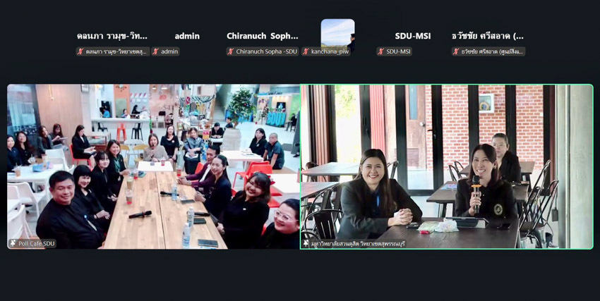 มหาวิทยาลัยสวนดุสิต วิทยาเขตสุพรรณบุรี เข้าร่วมกิจกรรม คุยสบายๆ … Life สาระ ครั้งที่ 406 หัวข้อ : SDU SMART#2 : โปรเจกต์ปังๆ กับพลังสมาร์ท 2 พบกับ 1. ดร.พัสสนันท์ แย้มฉ่ำไพร 2. นายอำนวย วงศ์ประทุม 3. ผู้ช่วยศาสตราจารย์ ดร.ปริศนา มัชฌิมา 4. อาจารน์ สาติยา มิ่งวงศ์ 5. อาจารย์ ดร.นวลศรี สงสม 6. อาจารย์ ศุภิสรา ทองจรูญ 7. ผู้ช่วยศาสตราจารย์ มานะ เอี่ยมบัว 8. นางอรทัย โกกิลกนิษฐ 9. นางสาวทิชากร เพ็งพุฒ 10. อาจารย์ พรพิมล นามวงศ์ ผู้จัดการ : ผู้ช่วยศาสตราจารย์ ดร.ศุภศิริ บุญประเวศ คณะทำงาน : นางสาวสุวิมล แมตสอง (ผู้อำนวยการกองบริหารงานบุคคล) และ นางสาวนันท์ทิญา ศฤงสวัสดิ์ (ผู้อำนวยการพัฒนาศูนย์ทุนมนุษย์) โดยวิทยาเขต เข้าร่วมกิจกรรมผ่านระบบ Online โปรแกรม Zoom Meeting เมื่อวันพฤหัสบดีที่ 25 ธันวาคม 2568 เวลา 15.30-16.30 น. ณ อาคารศูนย์การเรียนรู้ระบบใหม่โดยใช้เทคโนโลยีเป็นสื่อ (SDU Library) ชั้น 1 โซนกลาง มหาวิทยาลัยสวนดุสิต วิทยาเขตสุพรรณบุรี